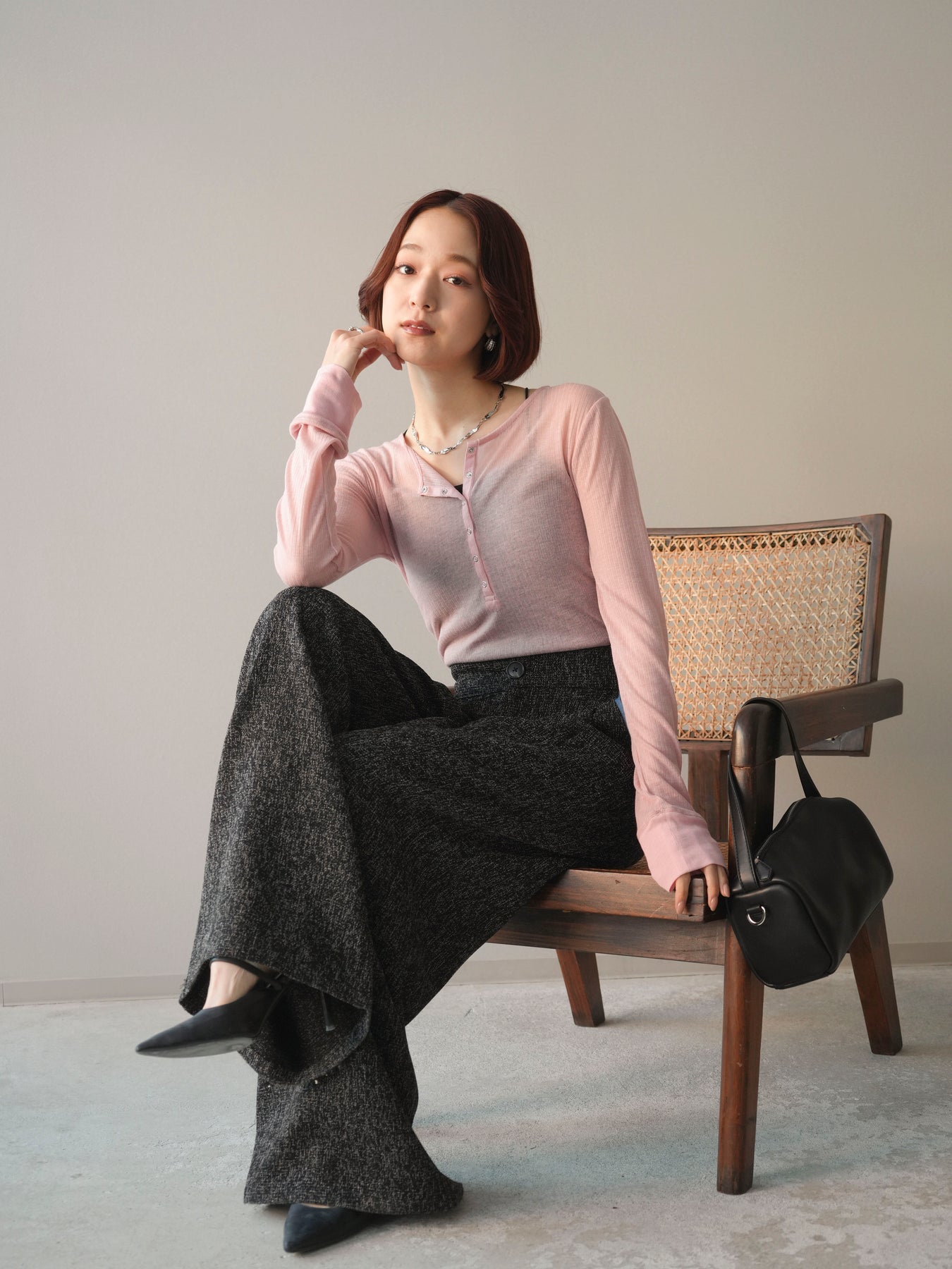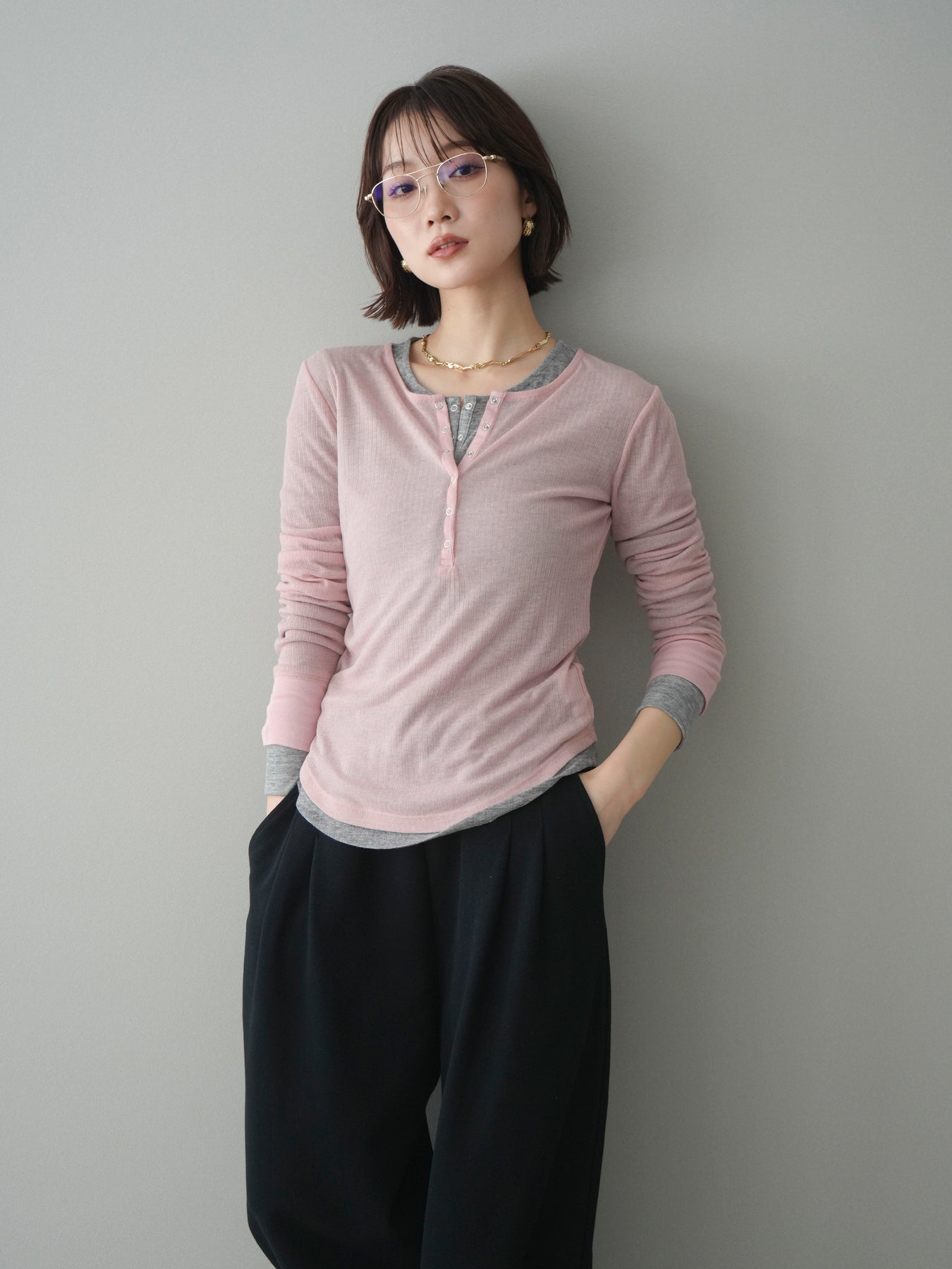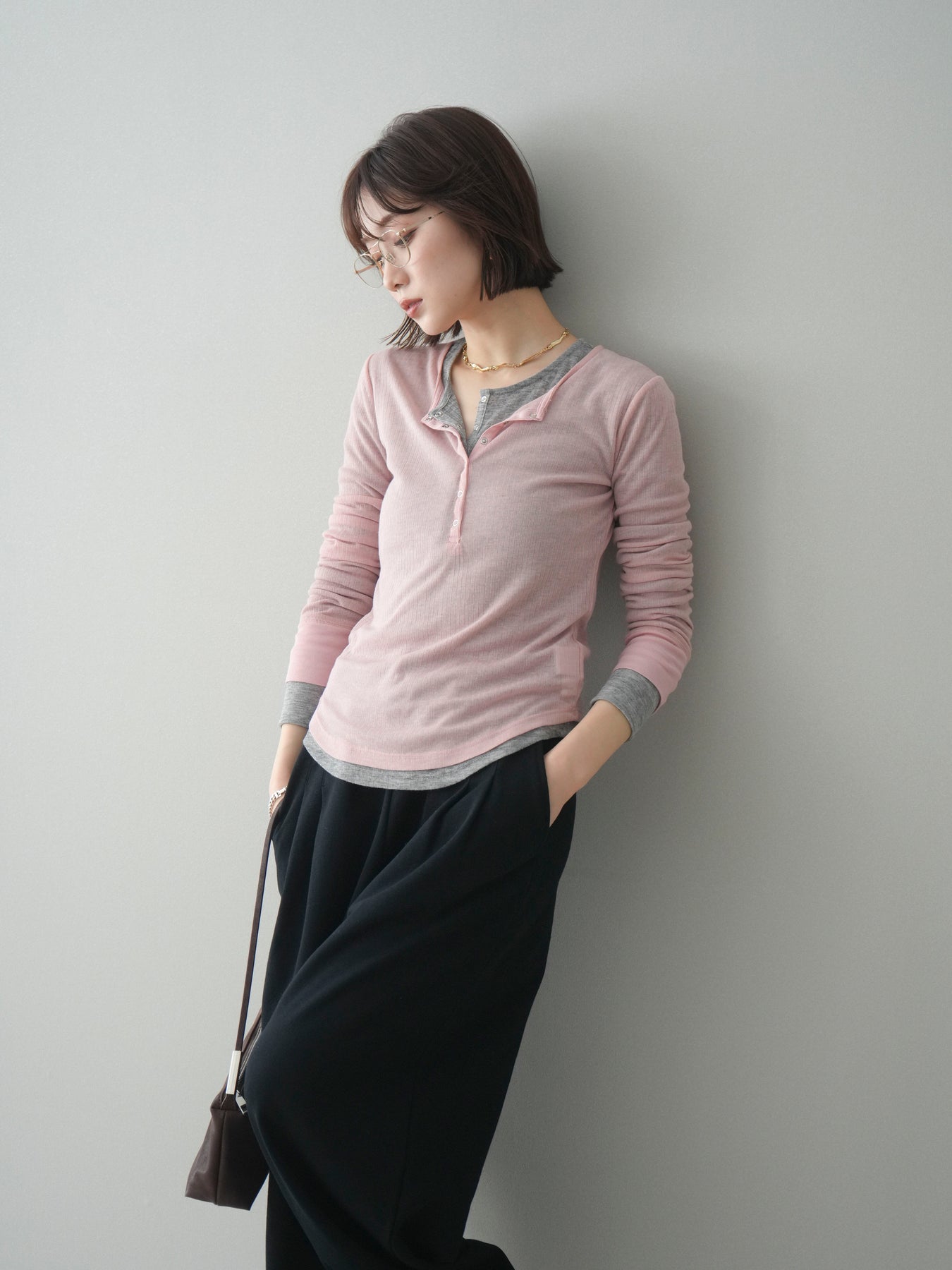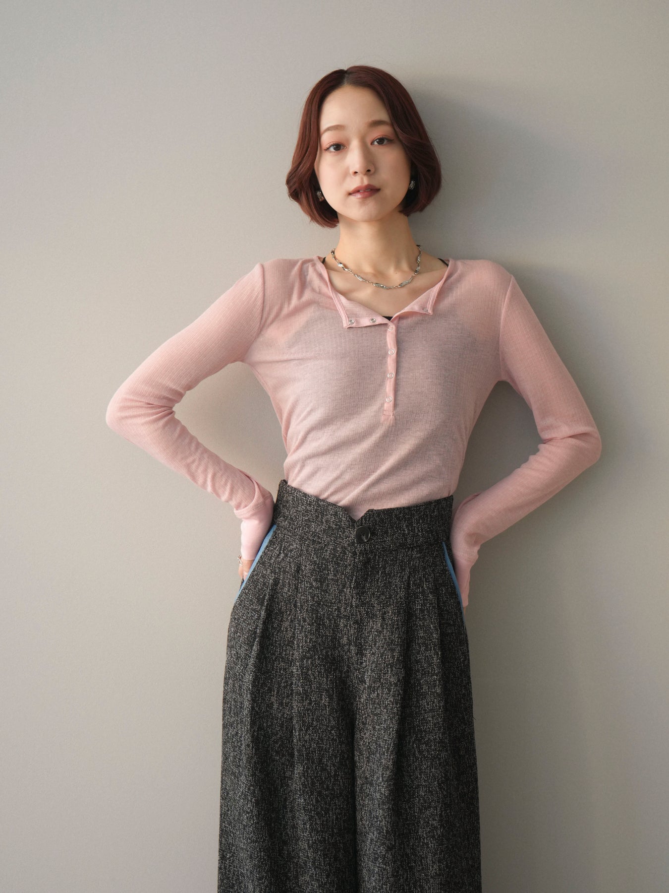 程よい透け感のあるシアーリブ素材を使用し、軽やかで抜け感のある印象に仕上げたヘンリーネックロンT。縦ラインを強調するリブ編みがすっきりとしたシルエットを演出し、フロントのヘンリーネックデザインがさりげないアクセントに。柔らかな着心地でレイヤードもしやすく、一枚着としてはもちろん、ジャケットやベストのインナーとしても活躍します。デイリーからきれいめまで幅広いスタイリングに取り入れやすい一着です。 ※ボトムス、キャミソール(インナー)以外の商品は一律でインナーは付属していません。