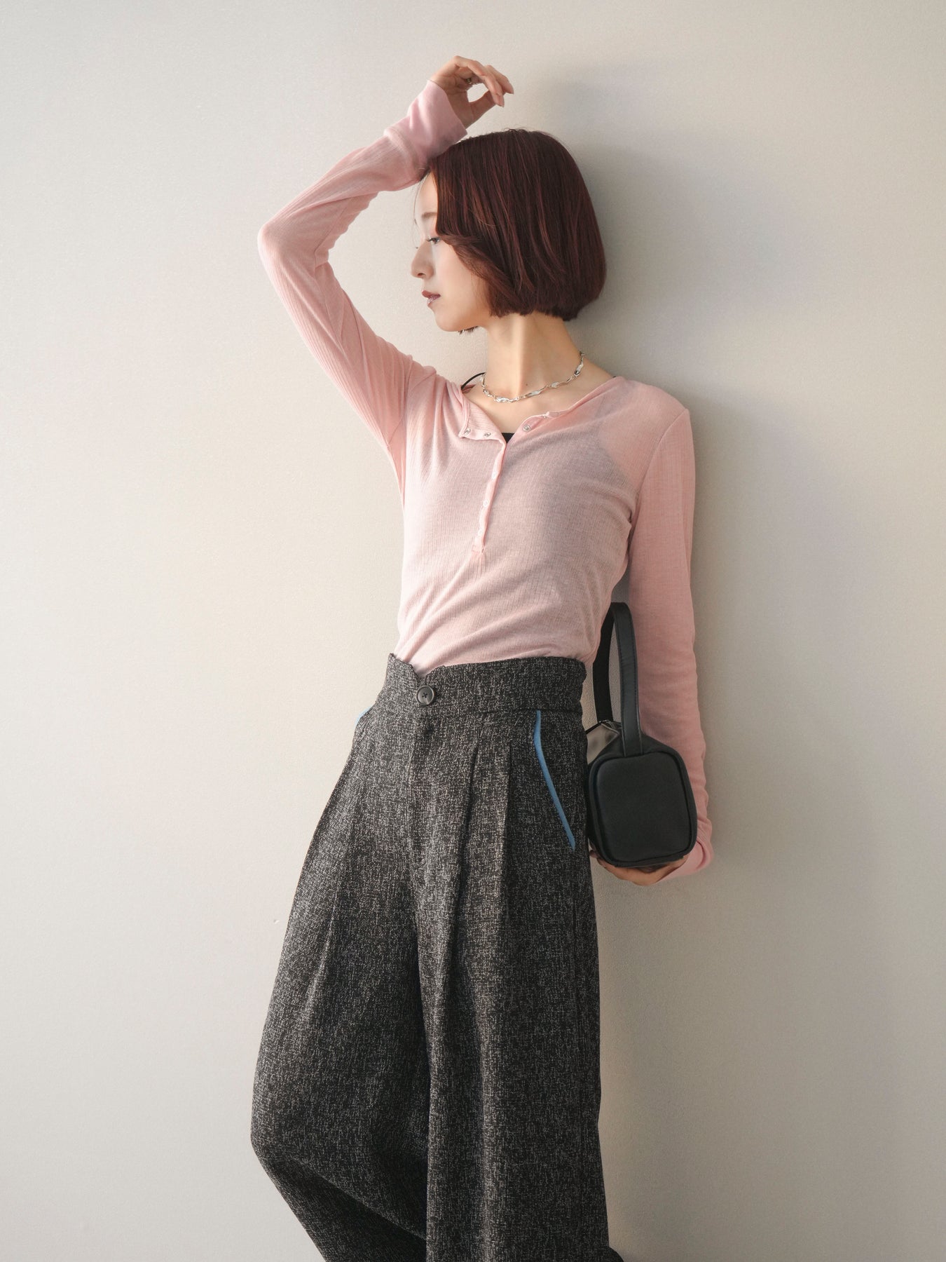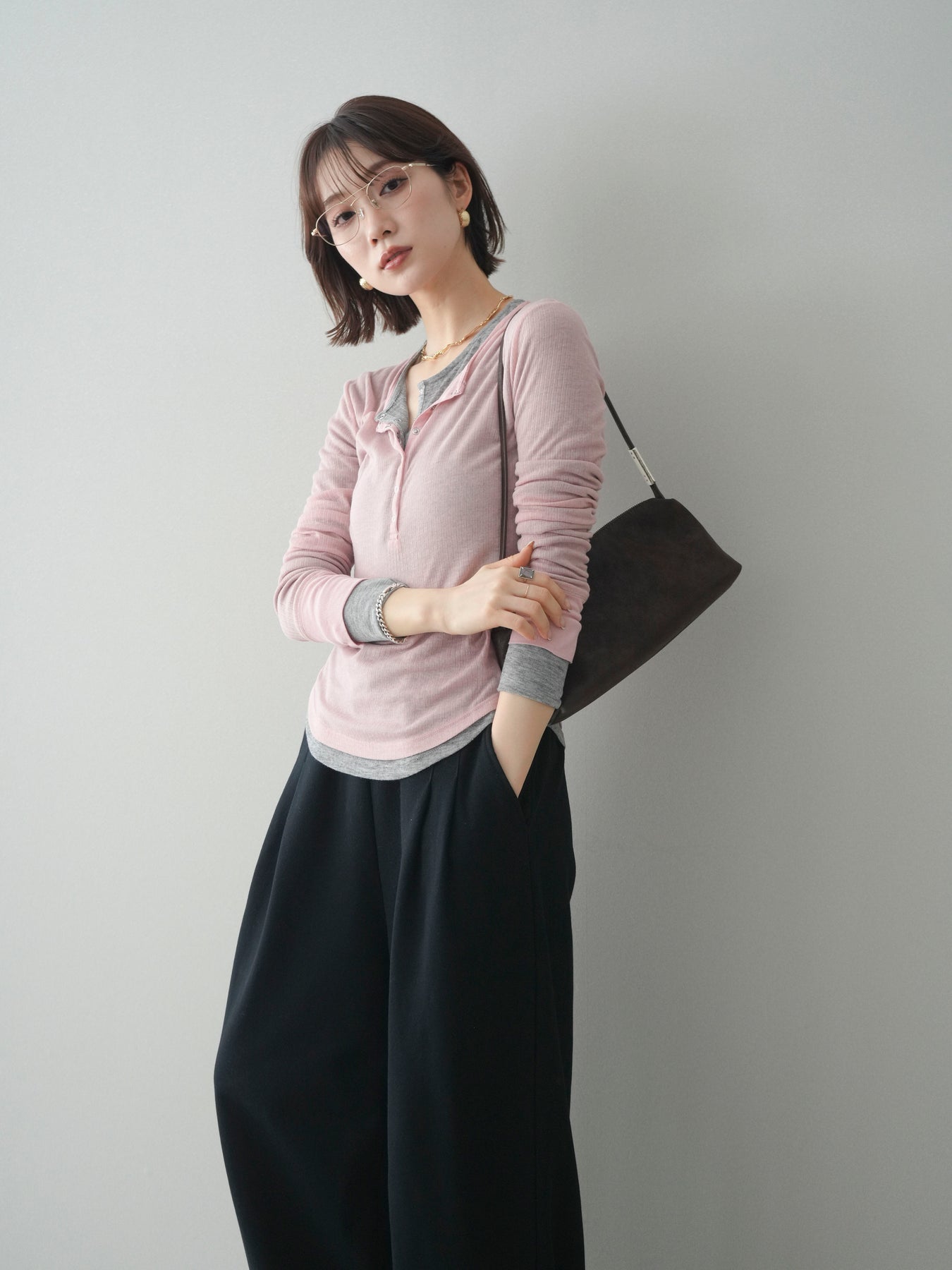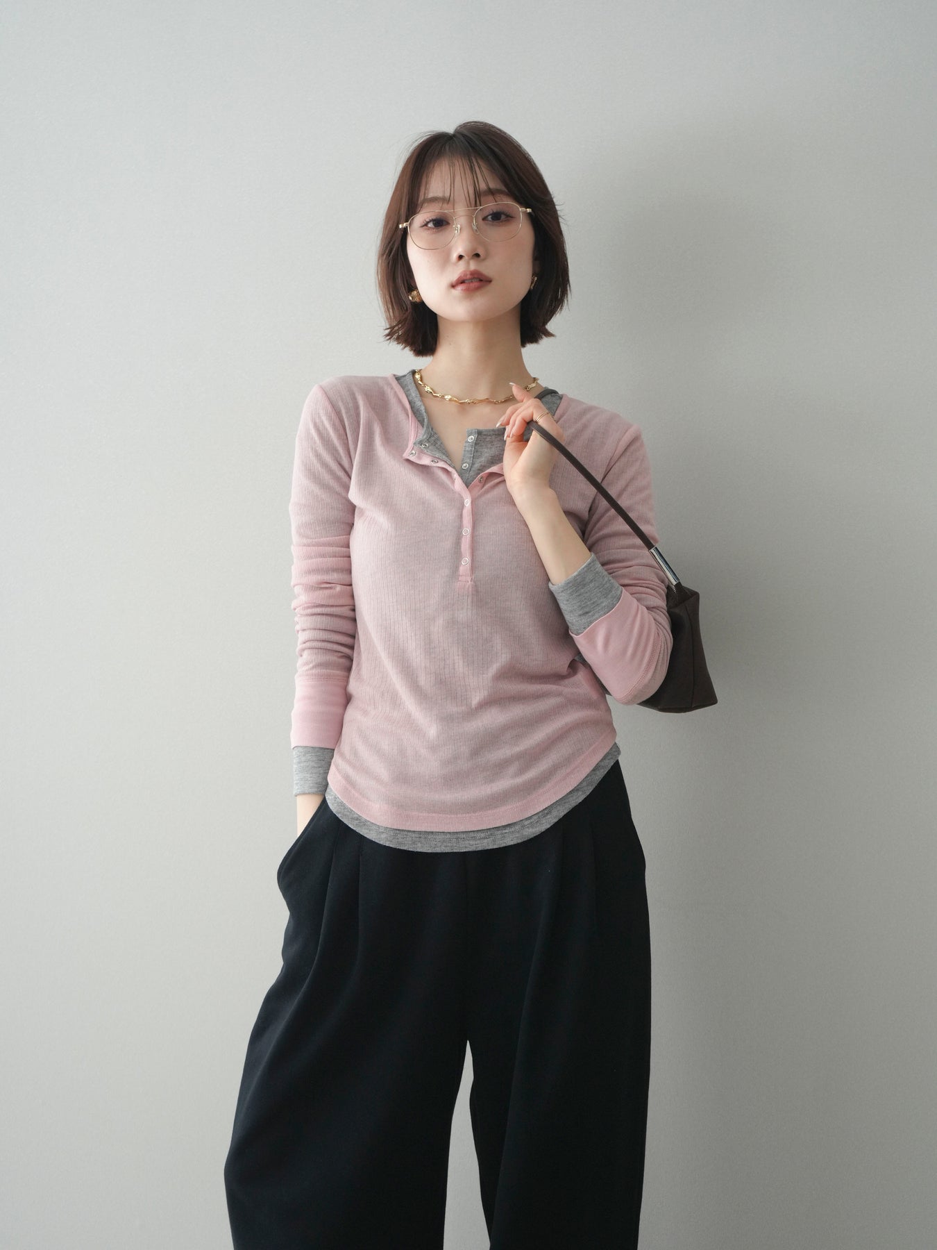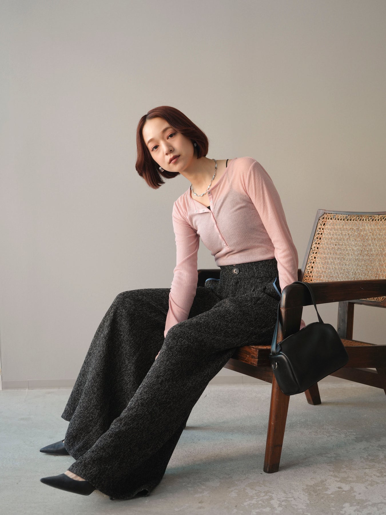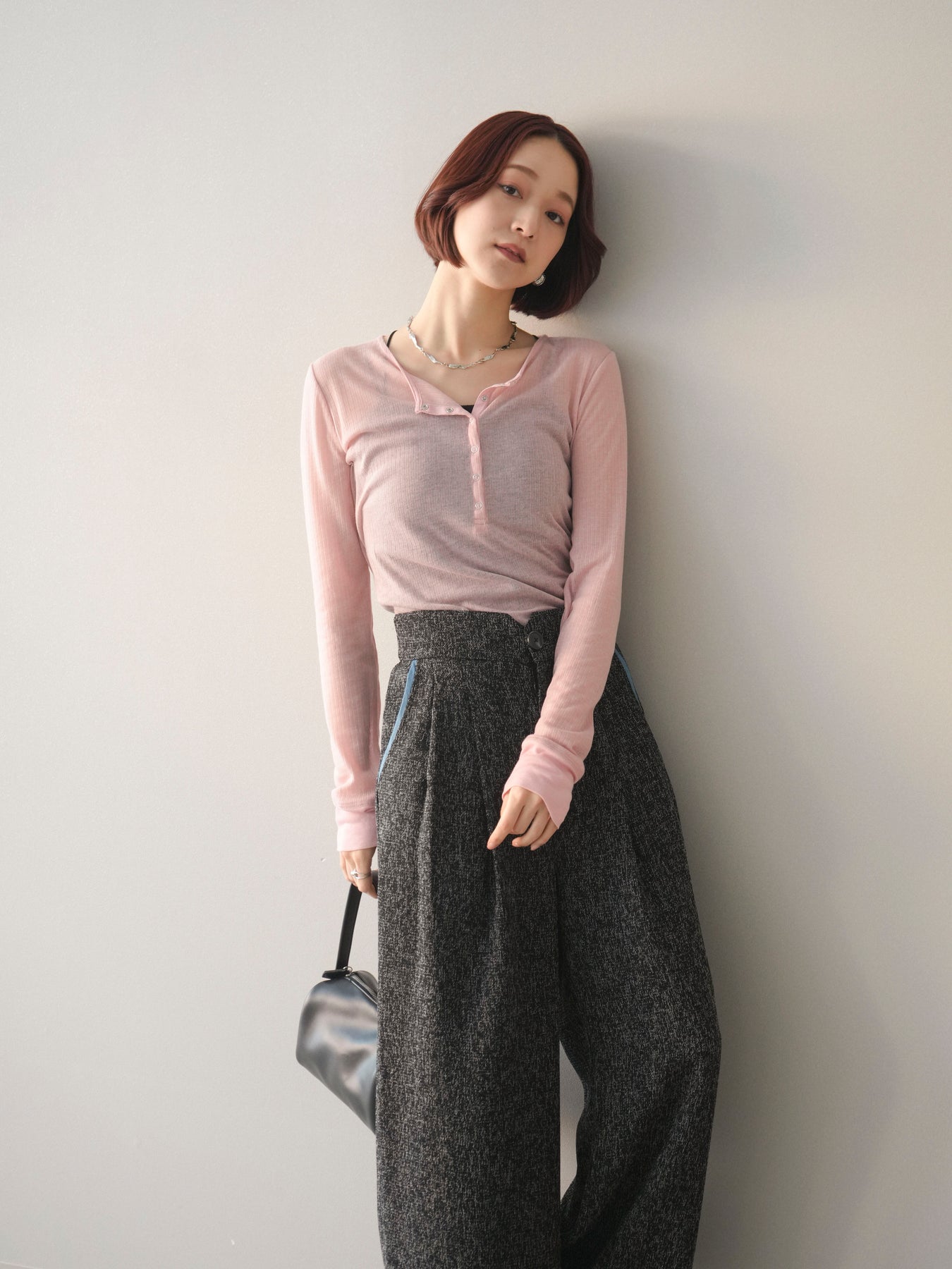 程よい透け感のあるシアーリブ素材を使用し、軽やかで抜け感のある印象に仕上げたヘンリーネックロンT。縦ラインを強調するリブ編みがすっきりとしたシルエットを演出し、フロントのヘンリーネックデザインがさりげないアクセントに。柔らかな着心地でレイヤードもしやすく、一枚着としてはもちろん、ジャケットやベストのインナーとしても活躍します。デイリーからきれいめまで幅広いスタイリングに取り入れやすい一着です。 ※ボトムス、キャミソール(インナー)以外の商品は一律でインナーは付属していません。