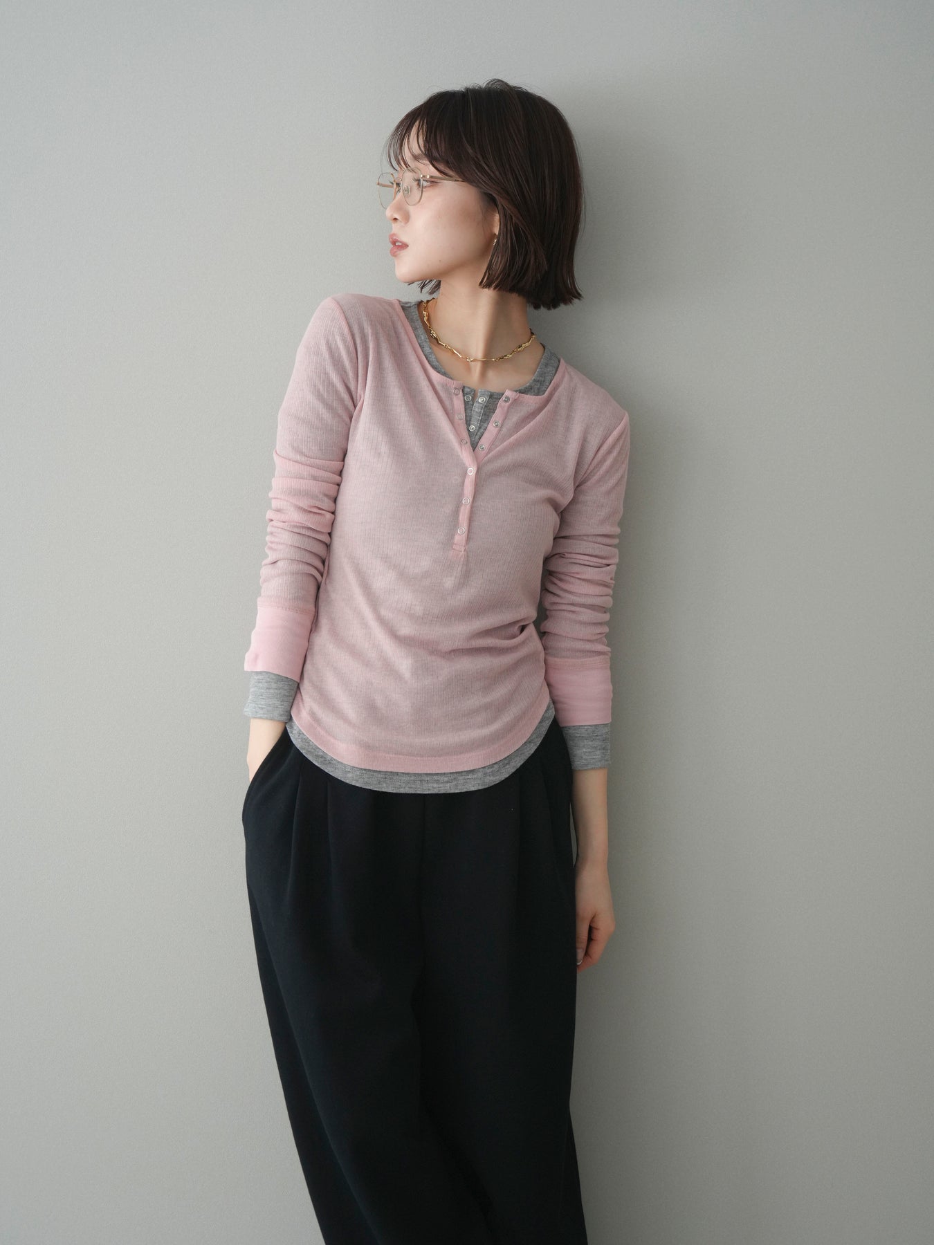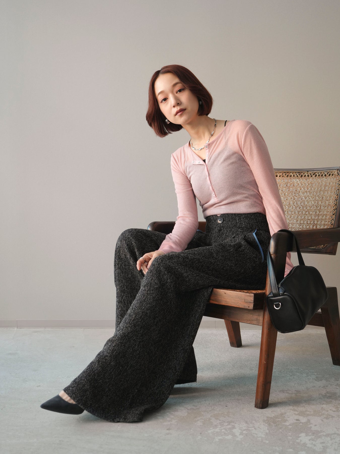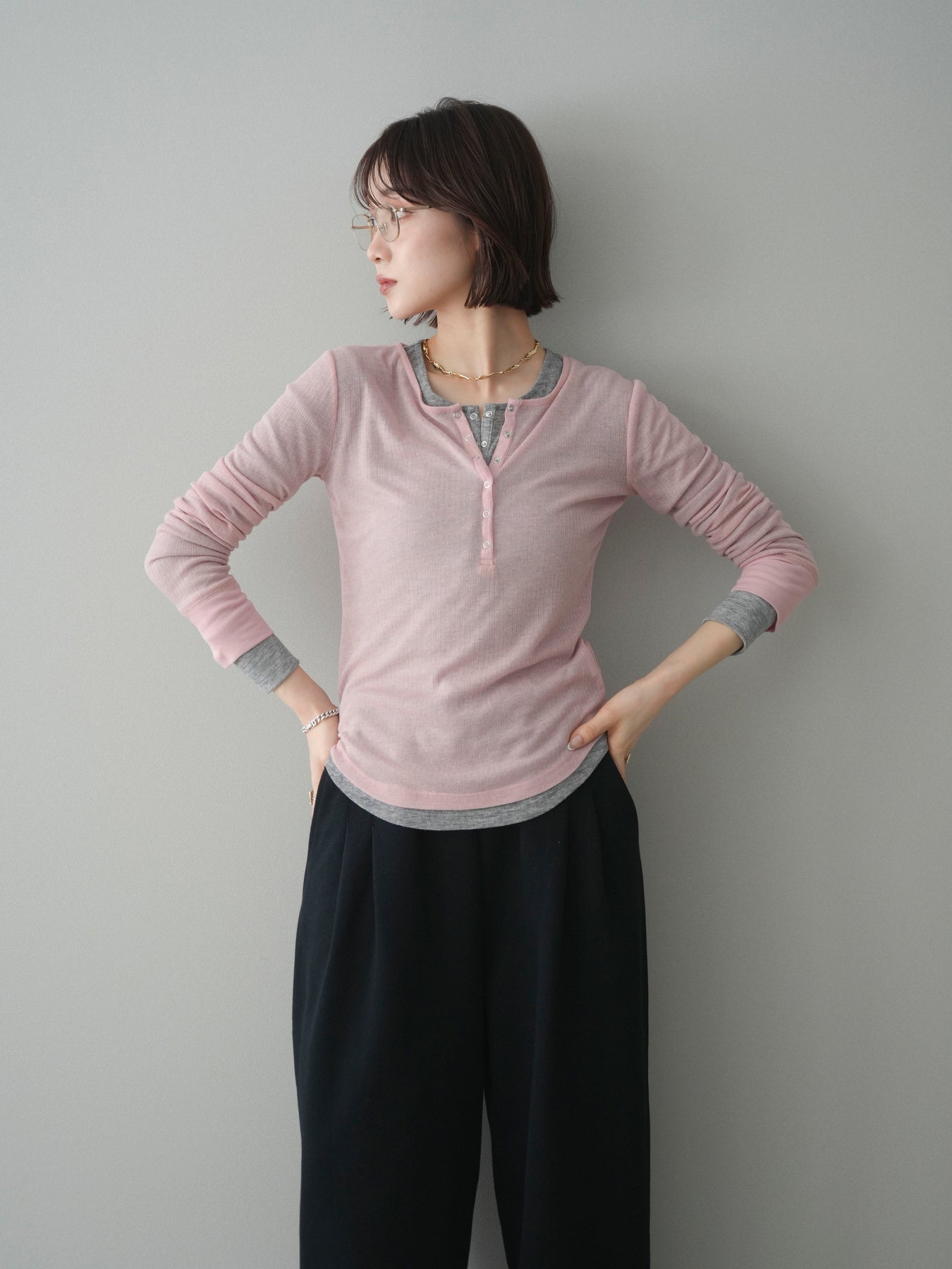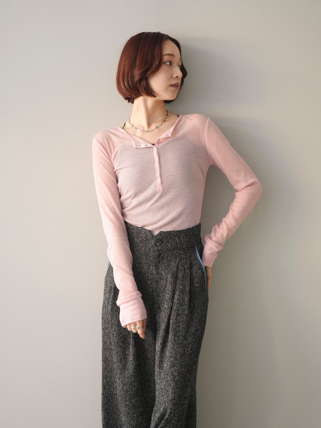 程よい透け感のあるシアーリブ素材を使用し、軽やかで抜け感のある印象に仕上げたヘンリーネックロンT。縦ラインを強調するリブ編みがすっきりとしたシルエットを演出し、フロントのヘンリーネックデザインがさりげないアクセントに。柔らかな着心地でレイヤードもしやすく、一枚着としてはもちろん、ジャケットやベストのインナーとしても活躍します。デイリーからきれいめまで幅広いスタイリングに取り入れやすい一着です。 ※ボトムス、キャミソール(インナー)以外の商品は一律でインナーは付属していません。