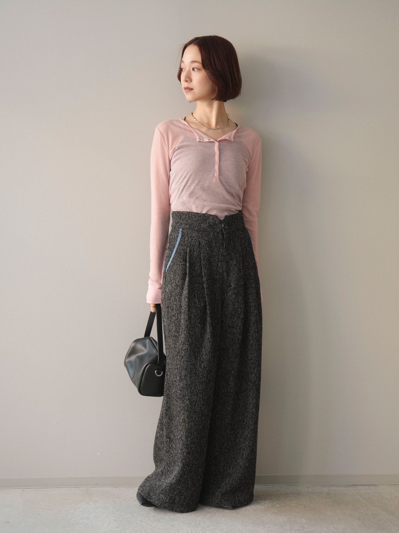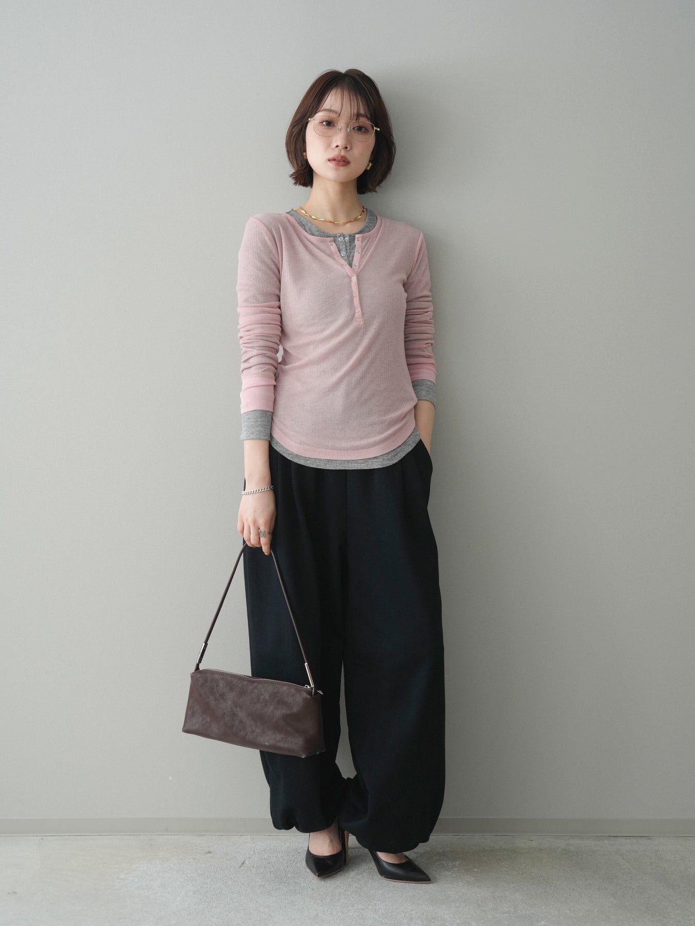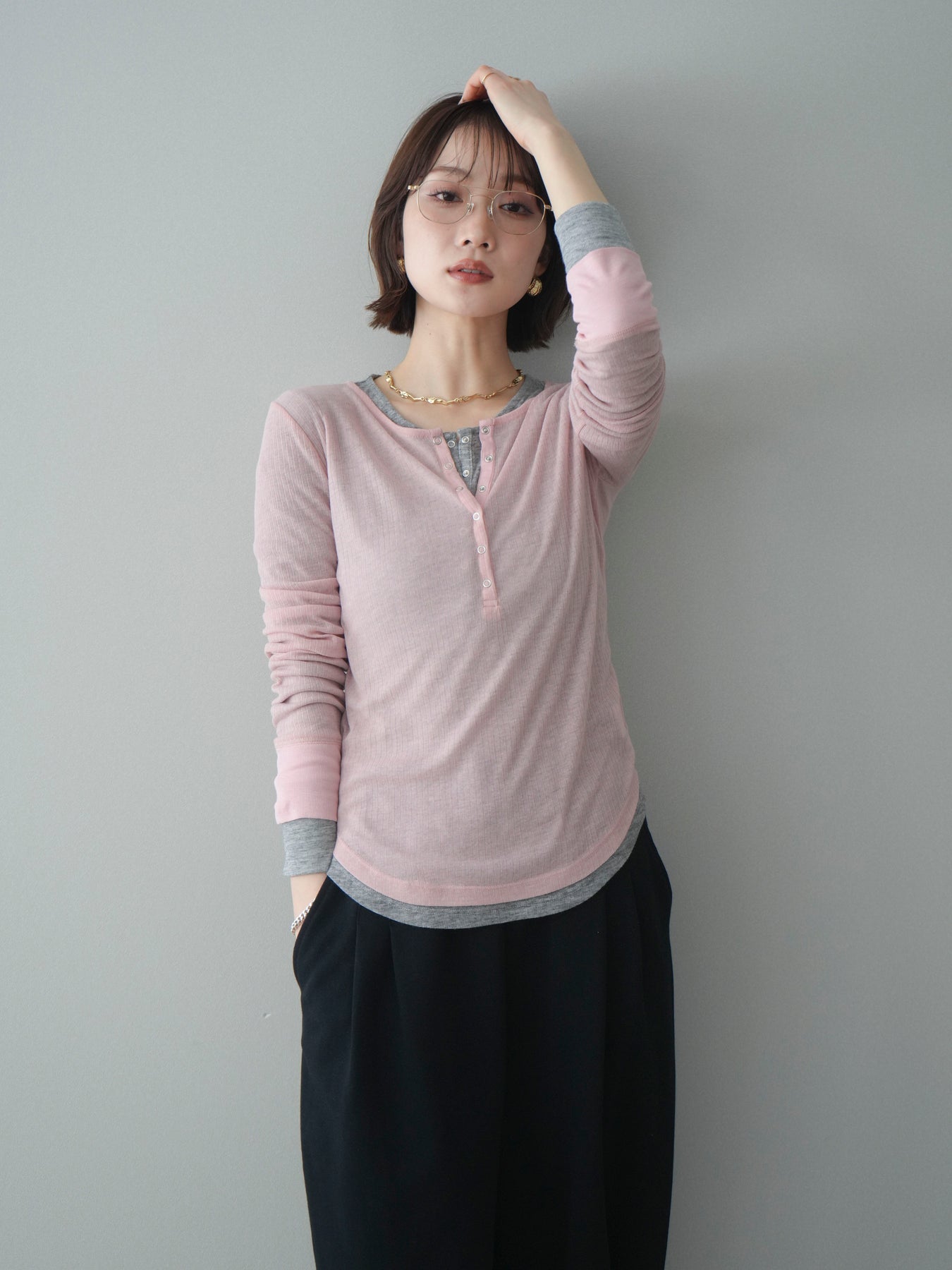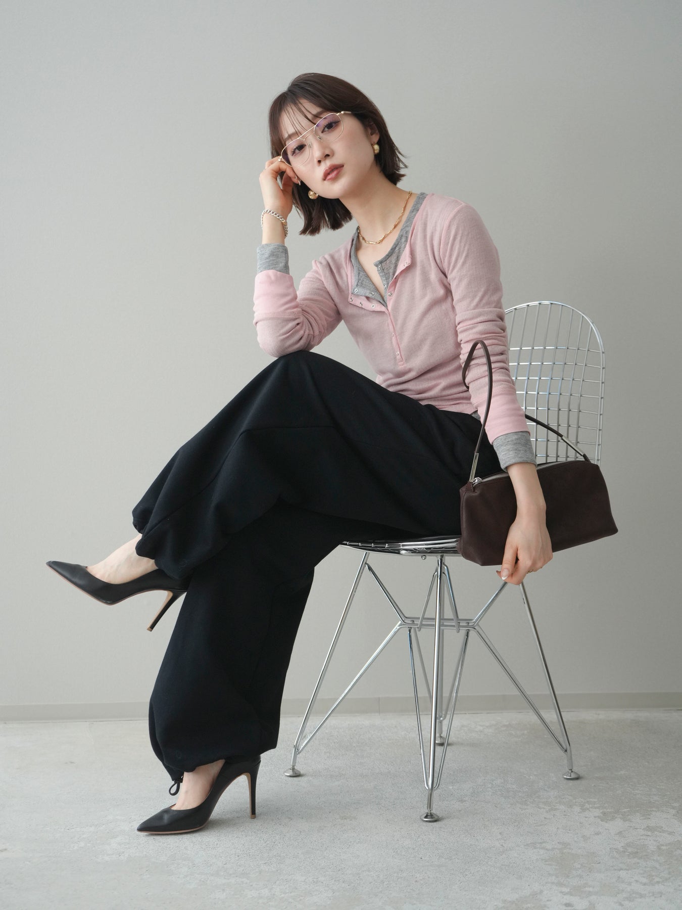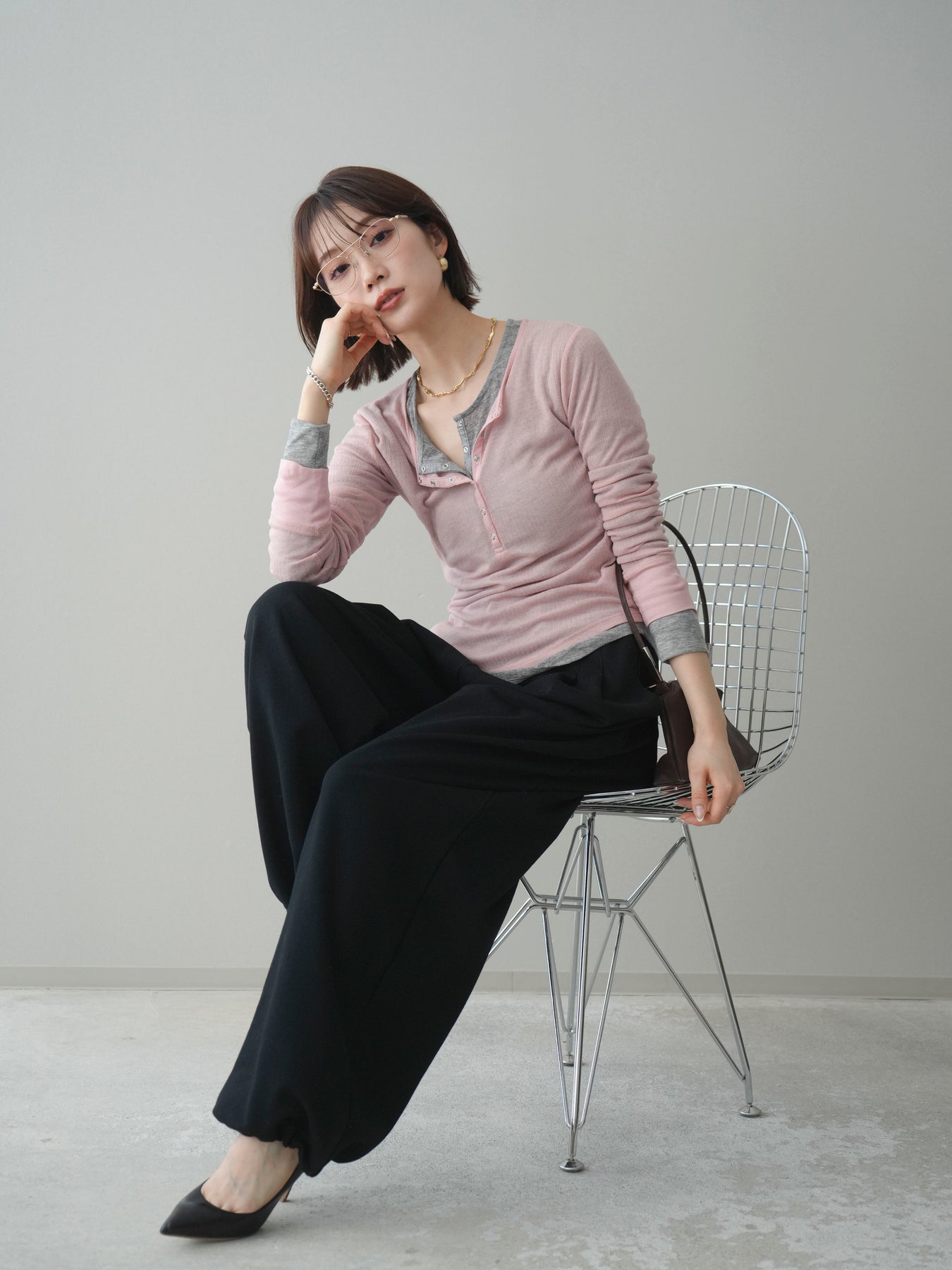程よい透け感のあるシアーリブ素材を使用し、軽やかで抜け感のある印象に仕上げたヘンリーネックロンT。縦ラインを強調するリブ編みがすっきりとしたシルエットを演出し、フロントのヘンリーネックデザインがさりげないアクセントに。柔らかな着心地でレイヤードもしやすく、一枚着としてはもちろん、ジャケットやベストのインナーとしても活躍します。デイリーからきれいめまで幅広いスタイリングに取り入れやすい一着です。 ※ボトムス、キャミソール(インナー)以外の商品は一律でインナーは付属していません。
