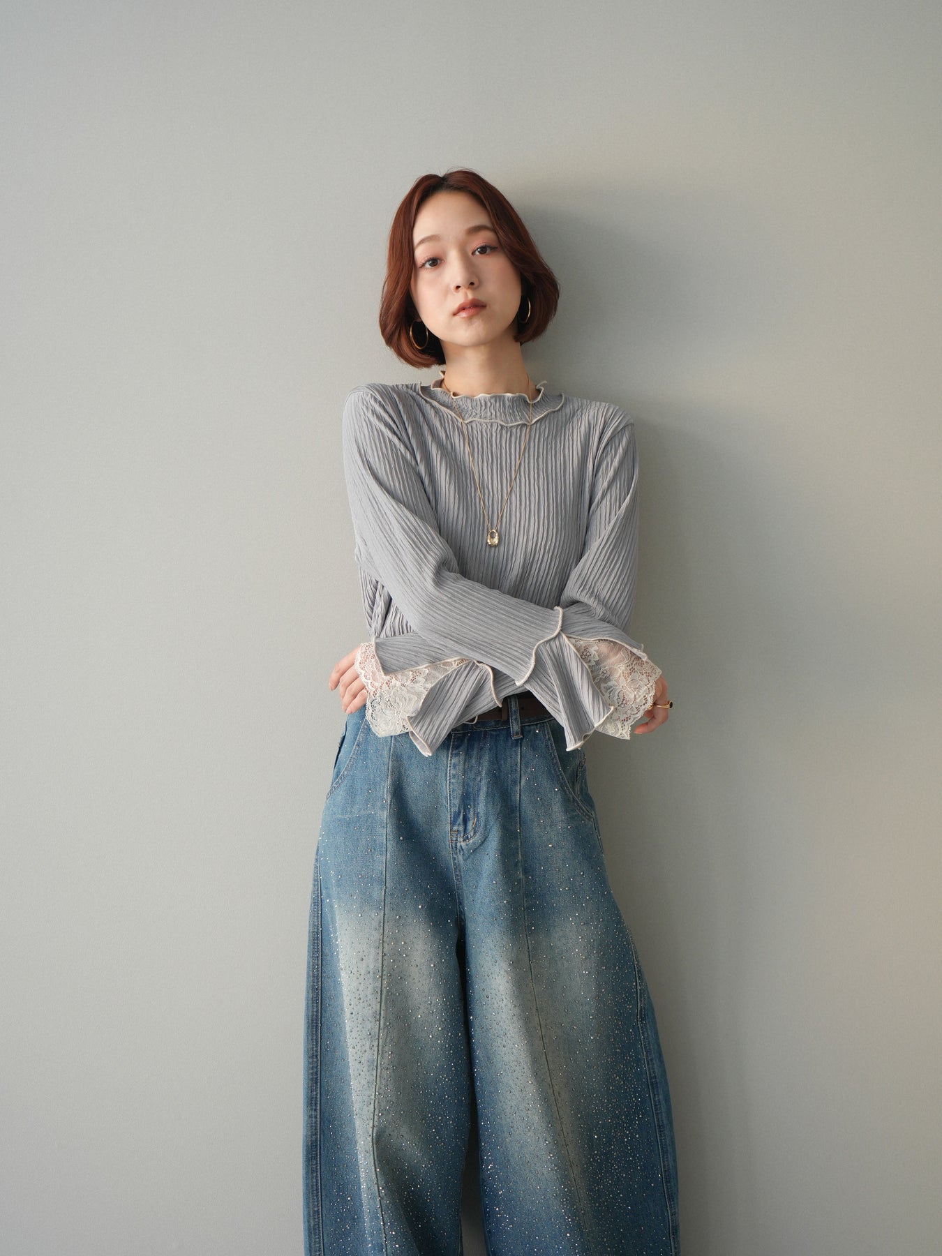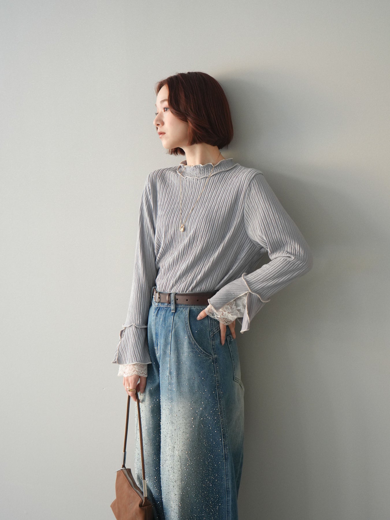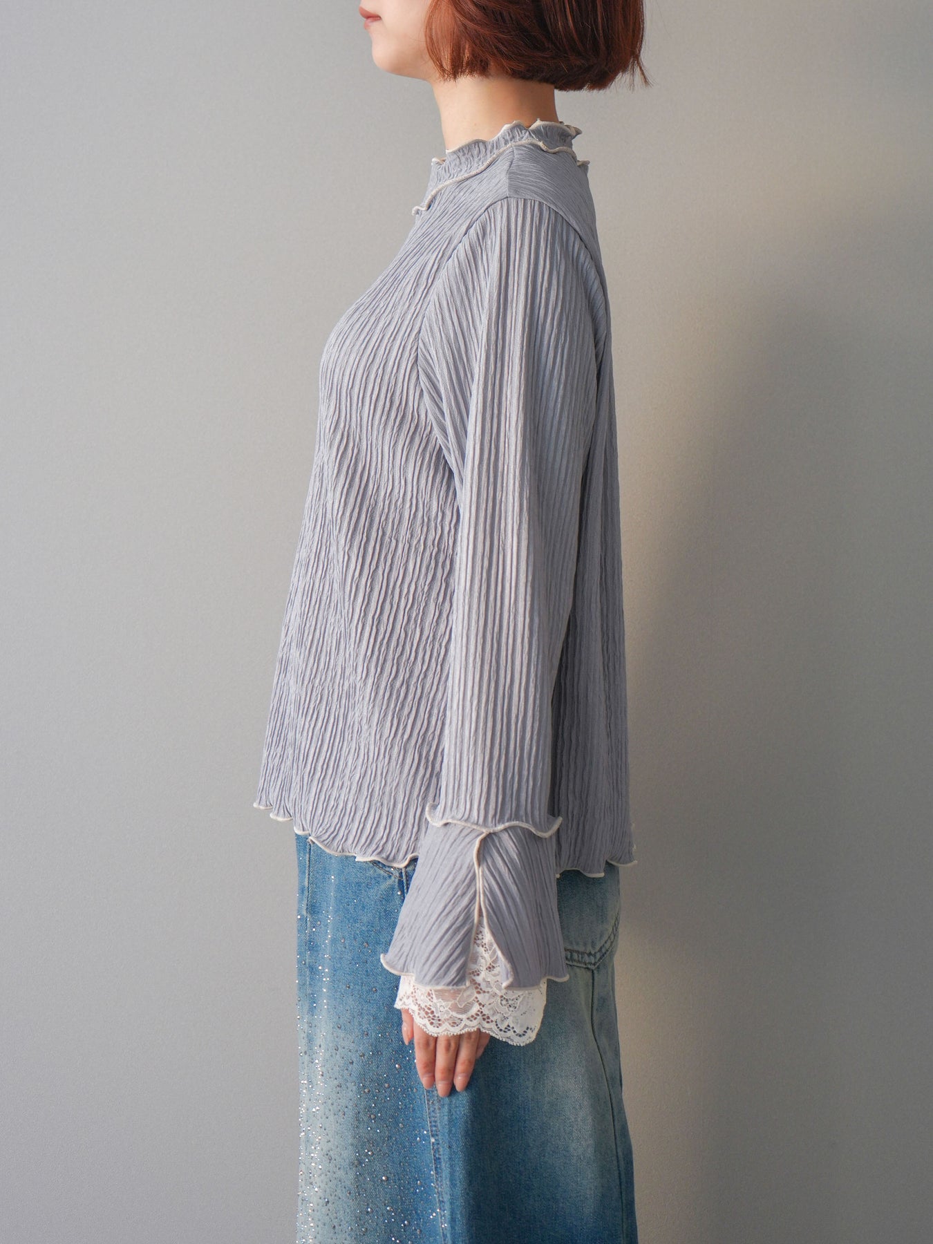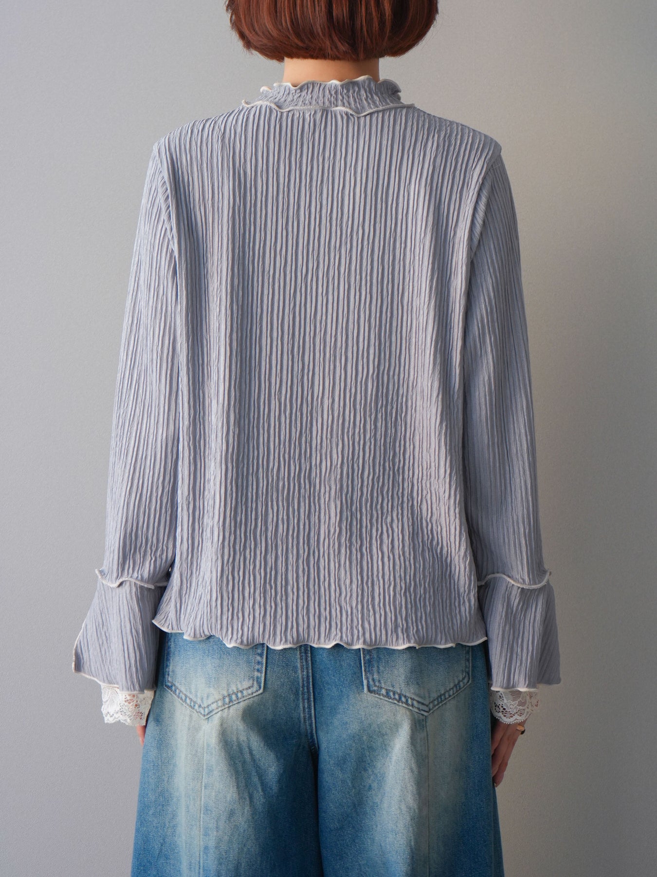 表情のある楊柳素材にメローデザインを施した、軽やかな印象のトップス。首元や裾、袖口の配色メローがさりげないアクセントになり、動くたびに揺れるシルエットが柔らかな雰囲気を演出します。袖口から覗くレースディテールが女性らしさをプラスし、レイヤードスタイルにも活躍。インでもアウトでもバランス良く決まる、着回し力の高い一枚です。 ※ボトムス、キャミソール(インナー)以外の商品は一律でインナーは付属していません