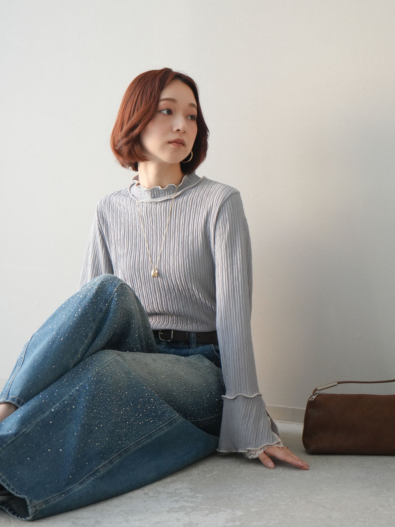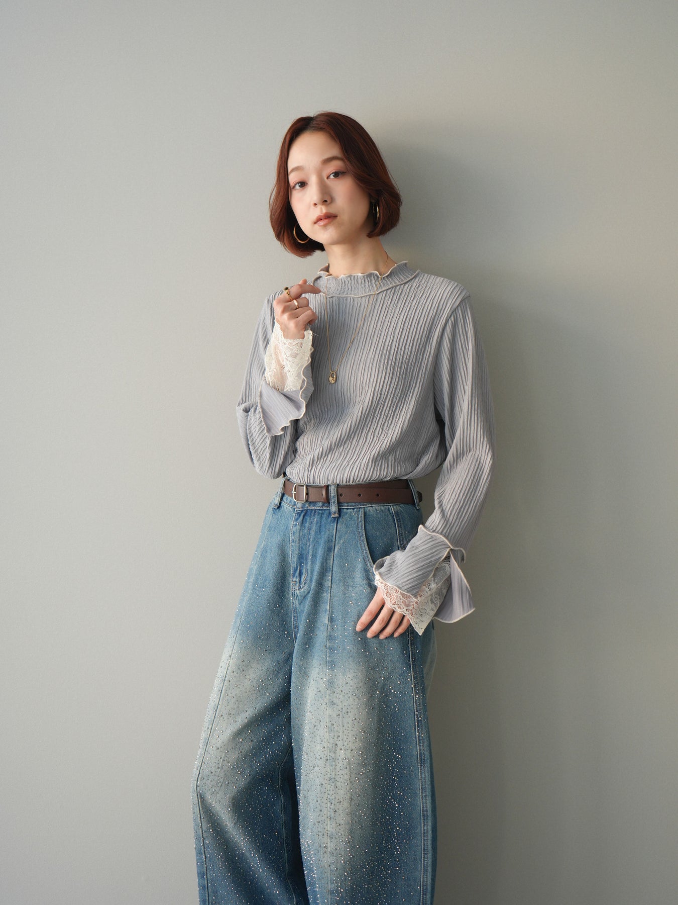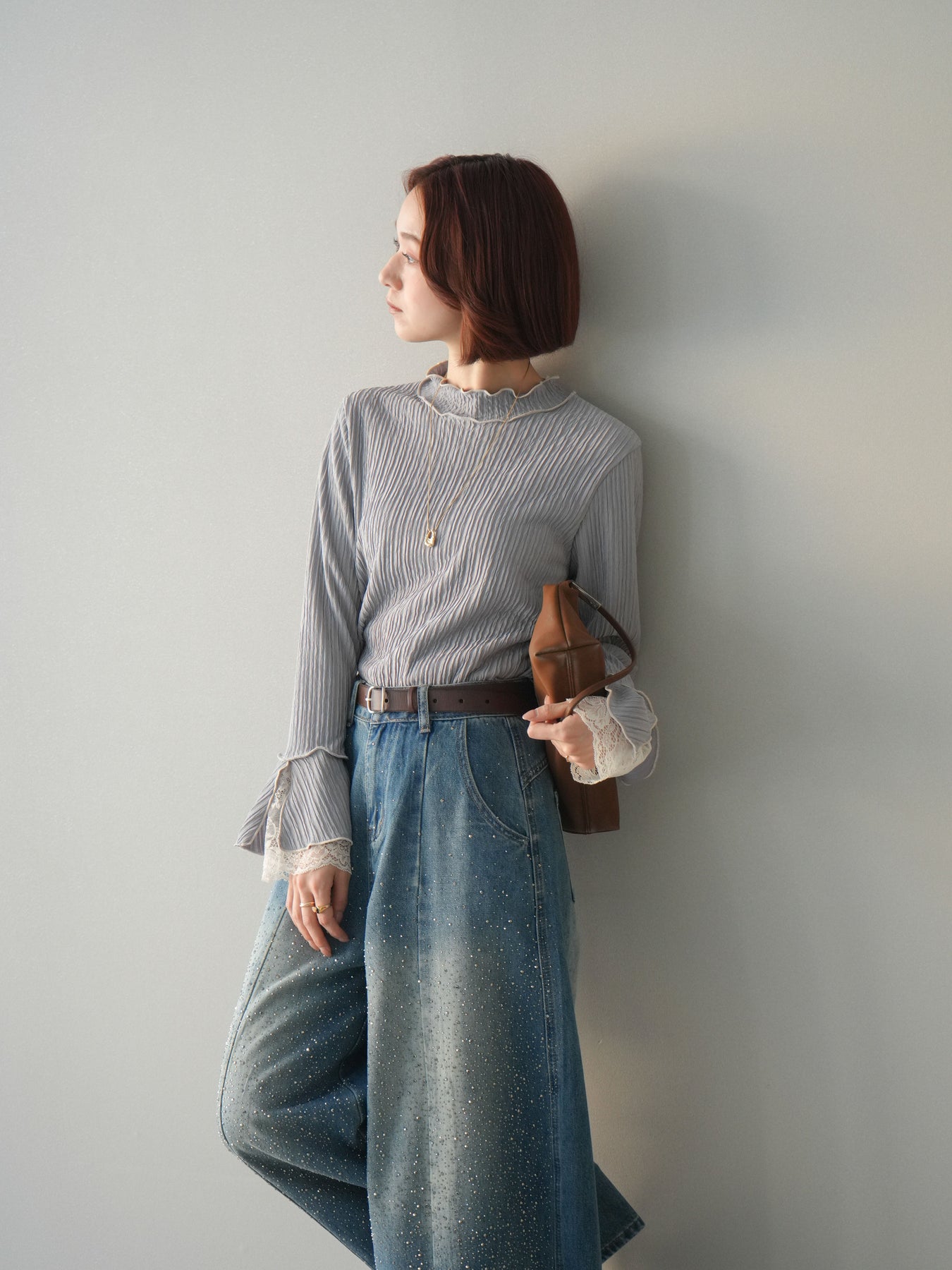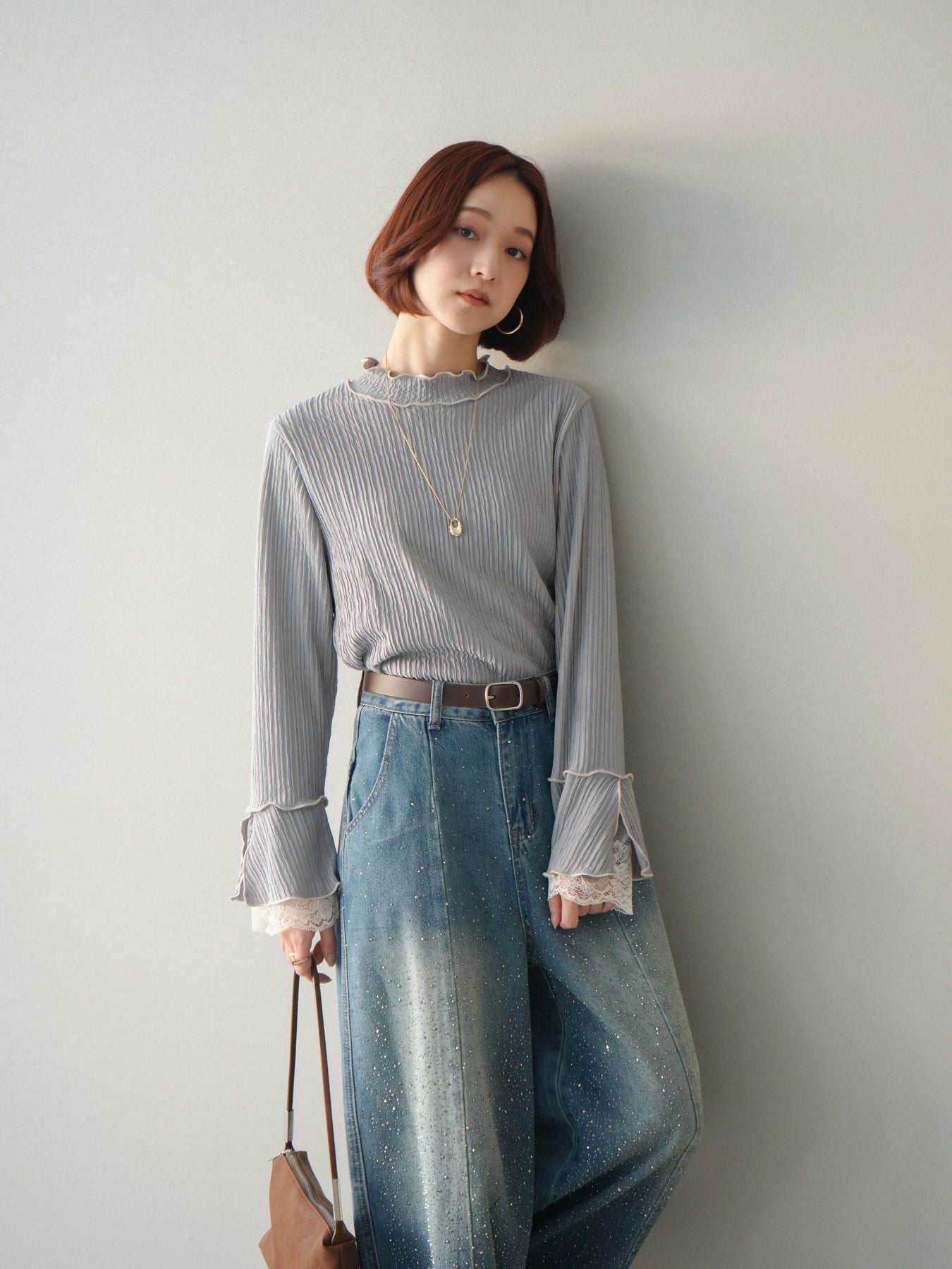 表情のある楊柳素材にメローデザインを施した、軽やかな印象のトップス。首元や裾、袖口の配色メローがさりげないアクセントになり、動くたびに揺れるシルエットが柔らかな雰囲気を演出します。袖口から覗くレースディテールが女性らしさをプラスし、レイヤードスタイルにも活躍。インでもアウトでもバランス良く決まる、着回し力の高い一枚です。 ※ボトムス、キャミソール(インナー)以外の商品は一律でインナーは付属していません