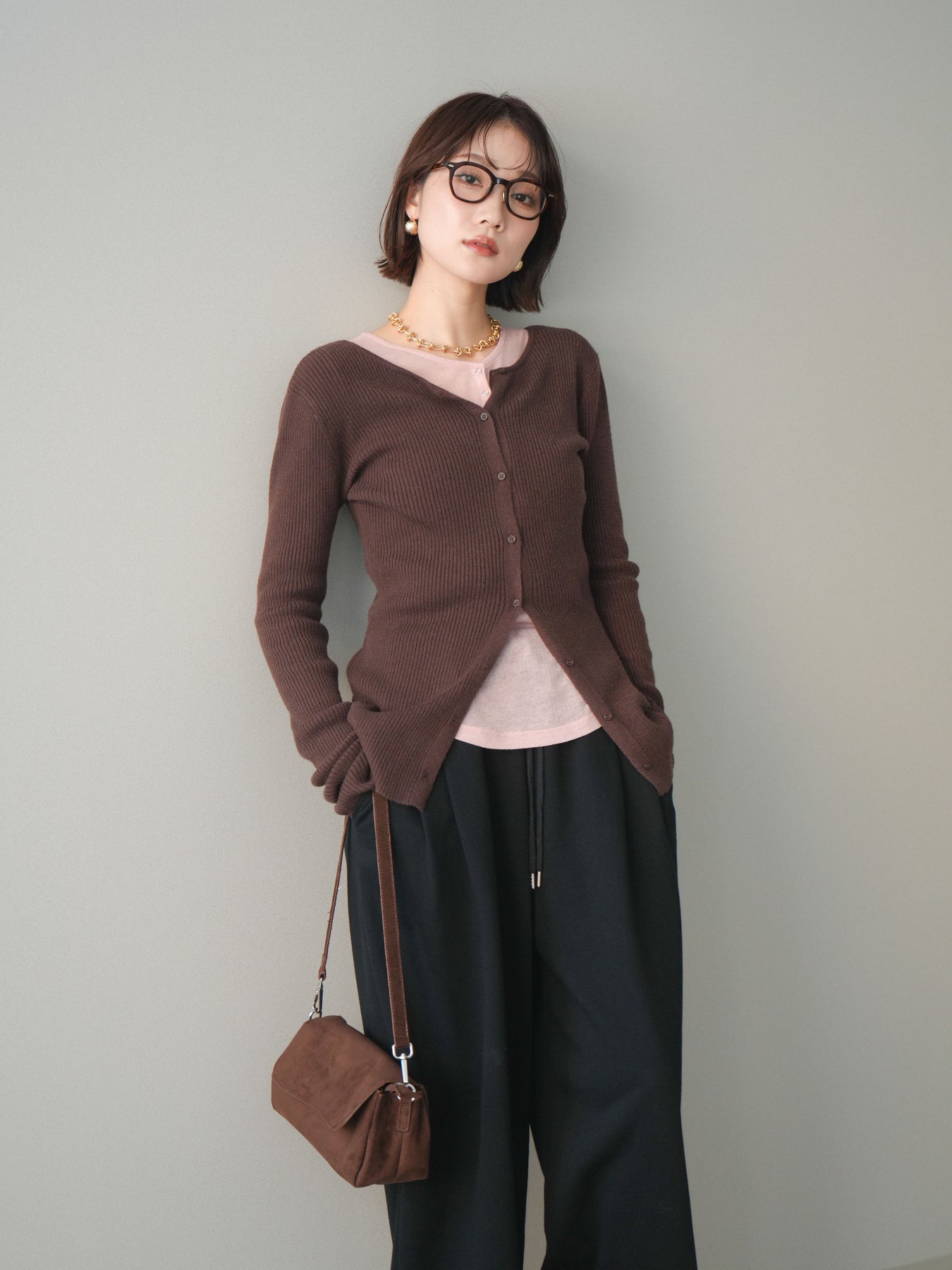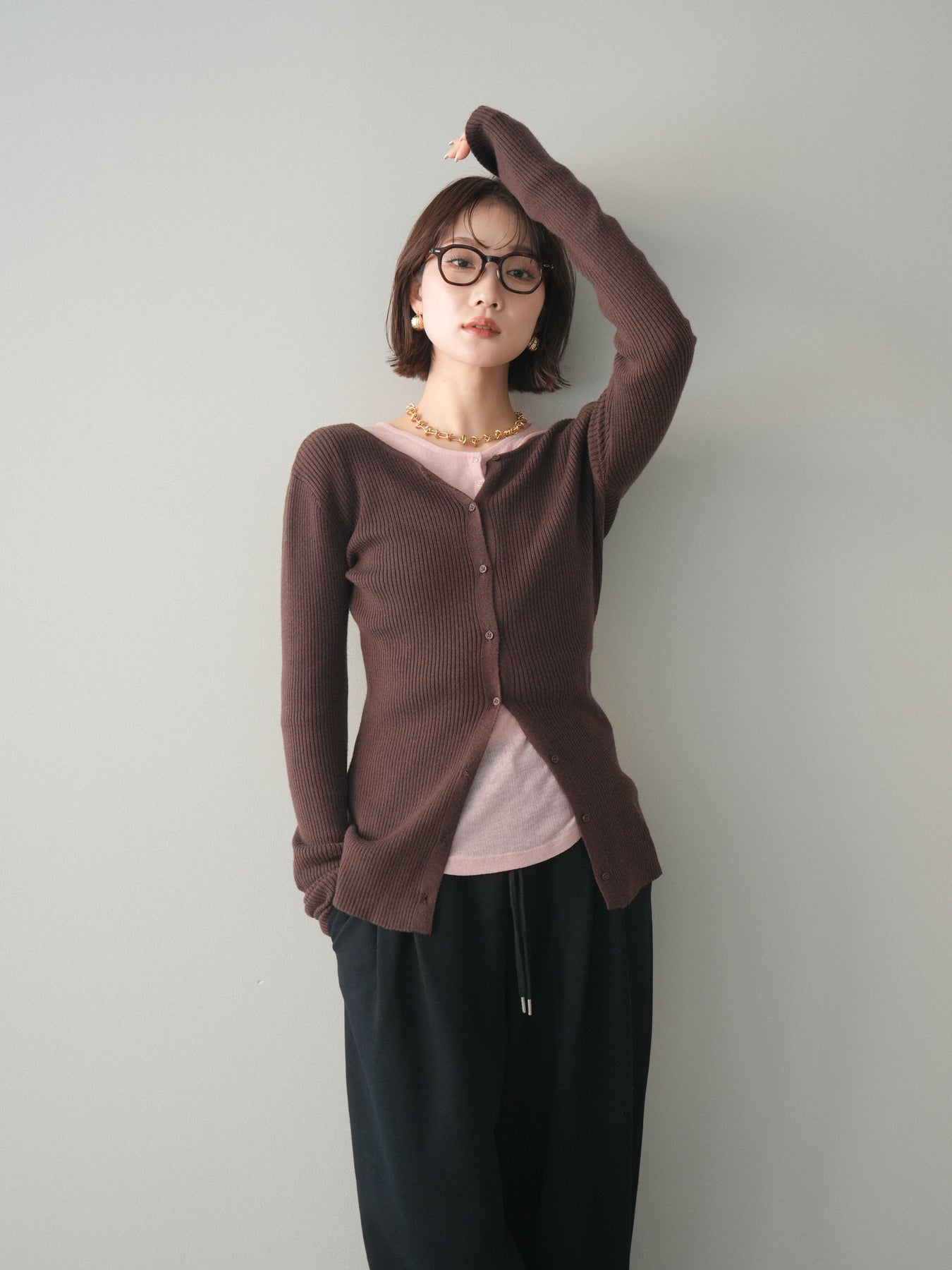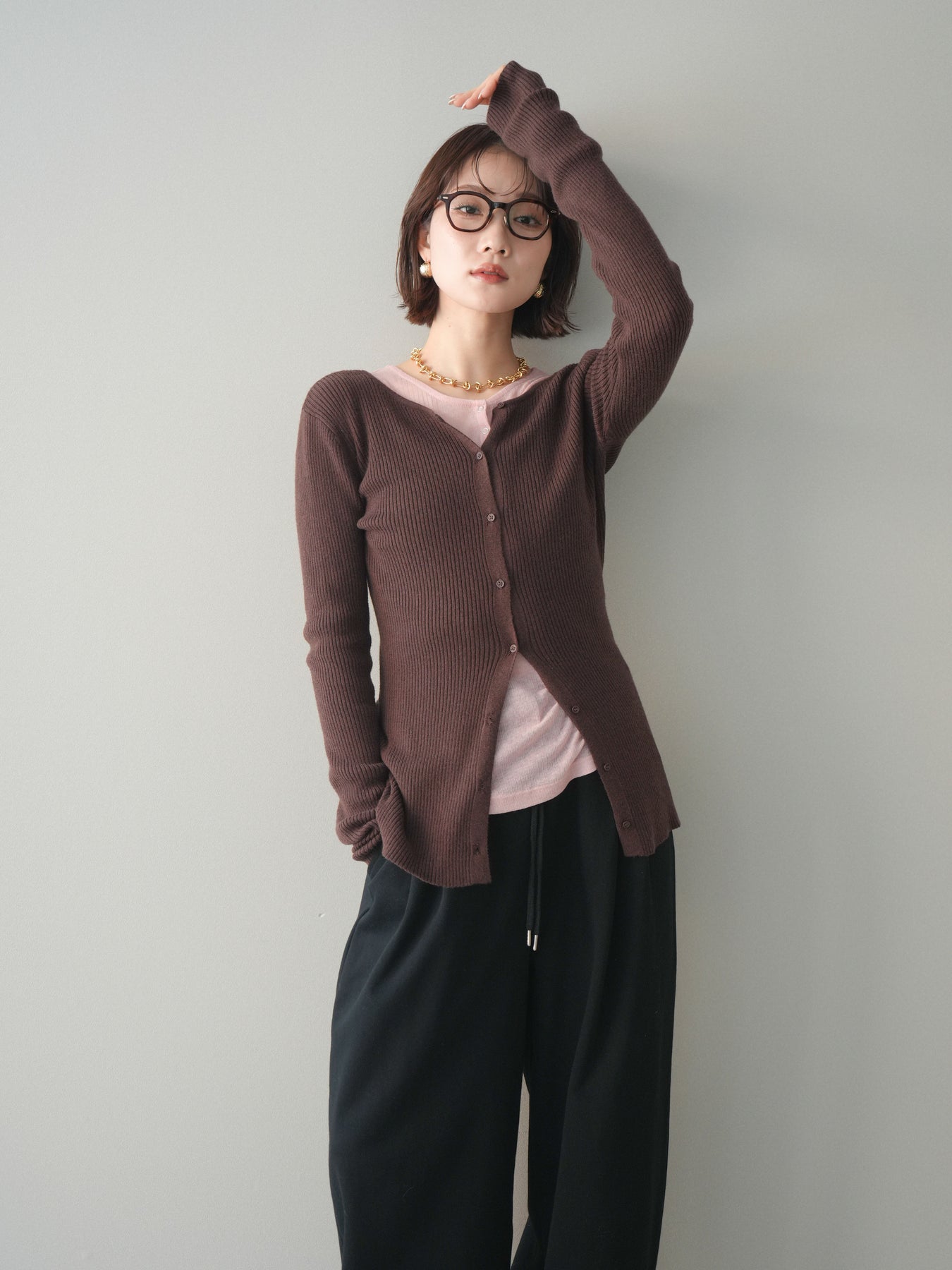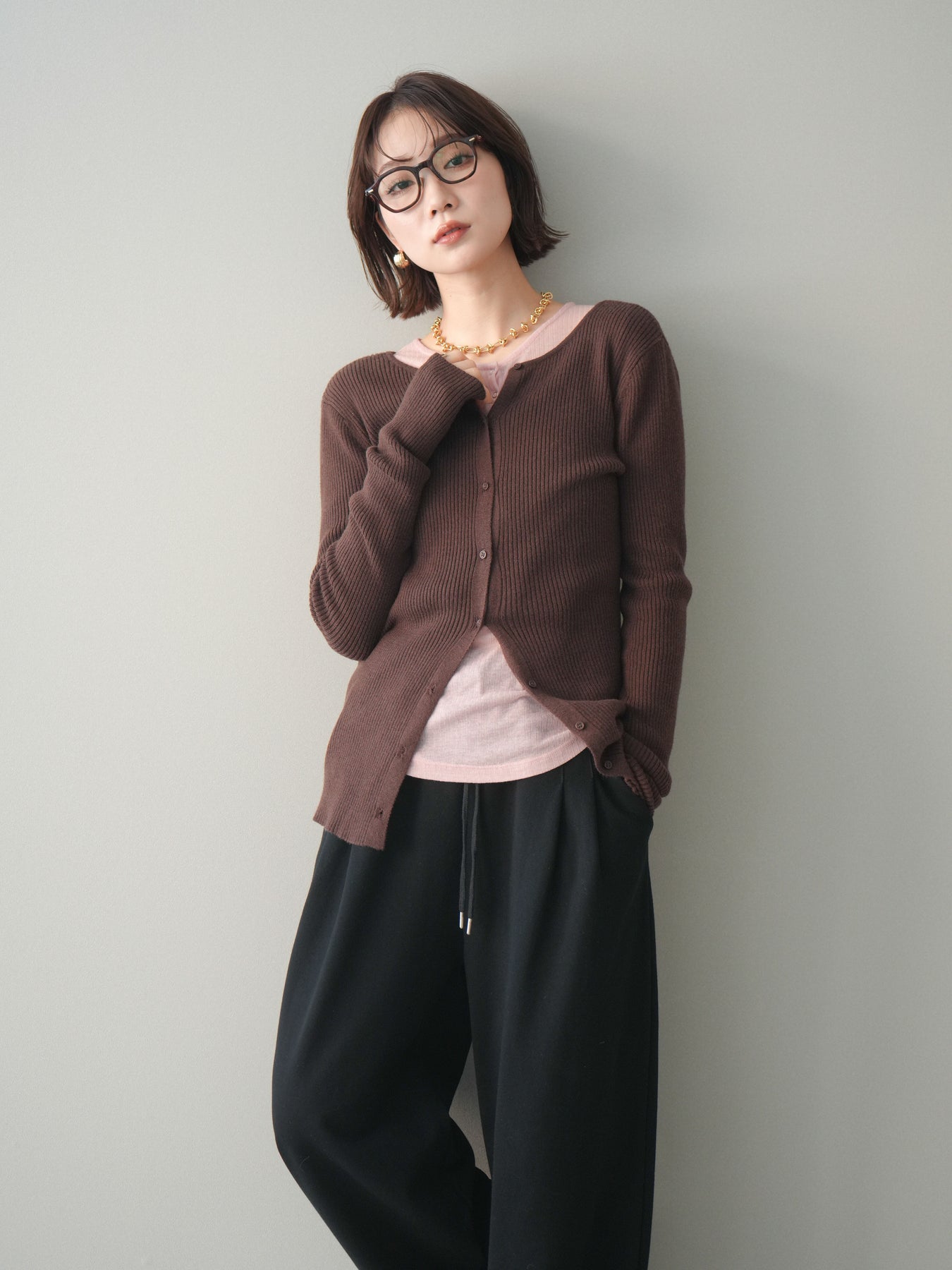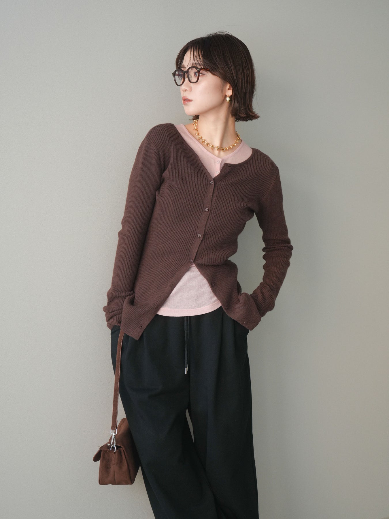 リブ編みの程よいフィット感とすっきりとしたシルエットが魅力のクルーネックカーディガン。前後どちらでも着用できる2WAY仕様で、ボタンを前にすればカーディガンとして、後ろにすればプルオーバー感覚でも楽しめます。縦ラインを強調するリブ編みが自然にスタイルを引き立て、シンプルながら着回し力の高い一着。デイリーからきれいめまで幅広いスタイリングに馴染み、季節を問わず活躍します。 ※ボトムス、キャミソール(インナー)以外の商品は一律でインナーは付属していません。