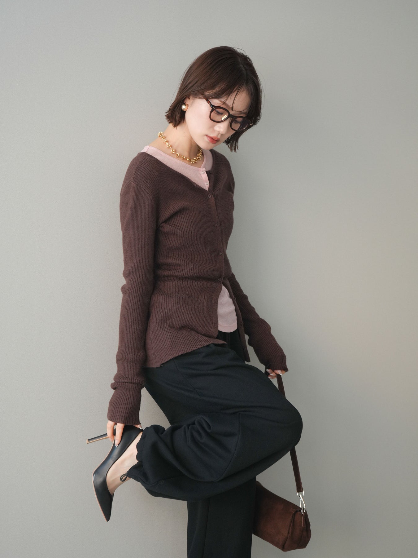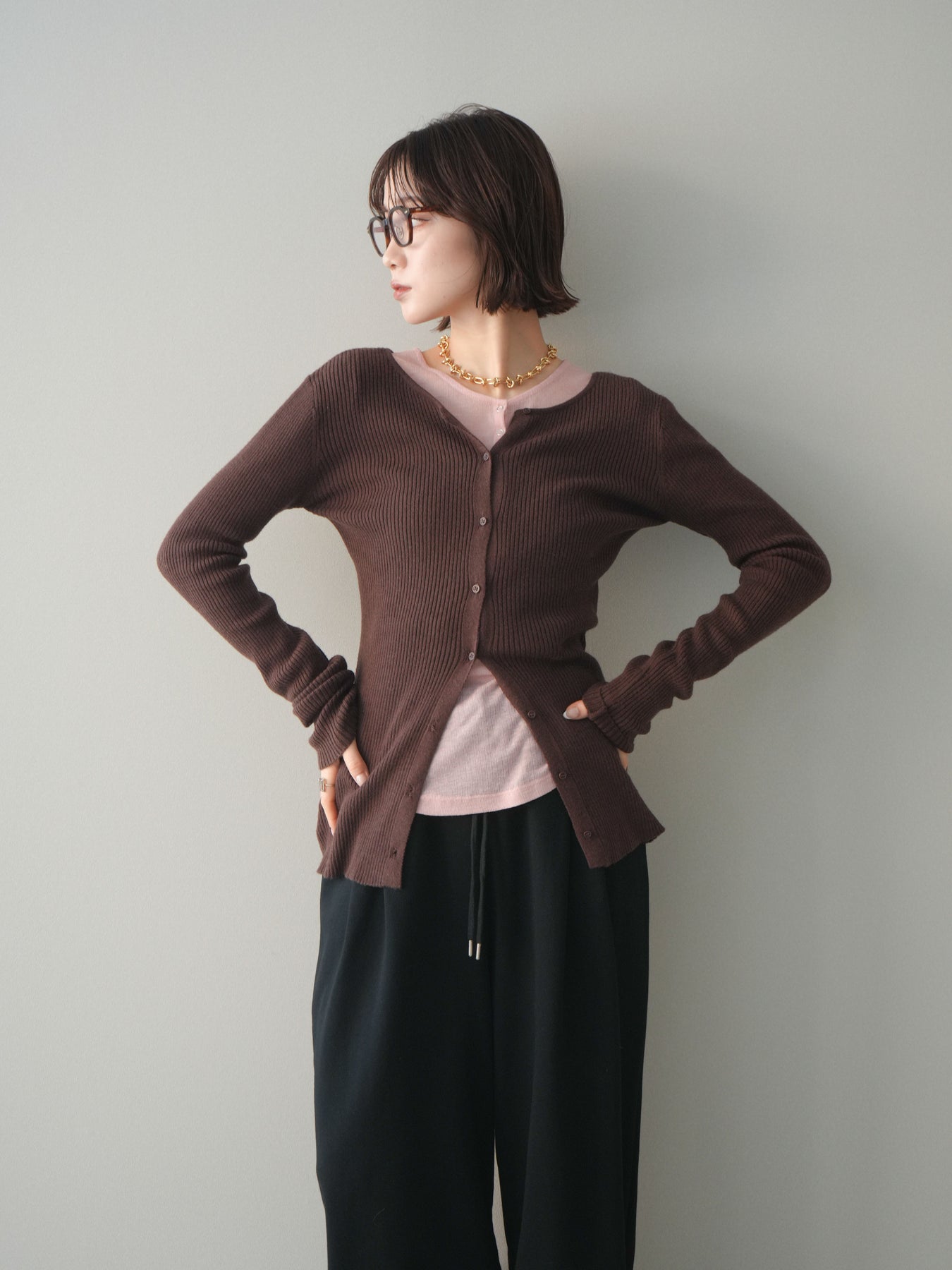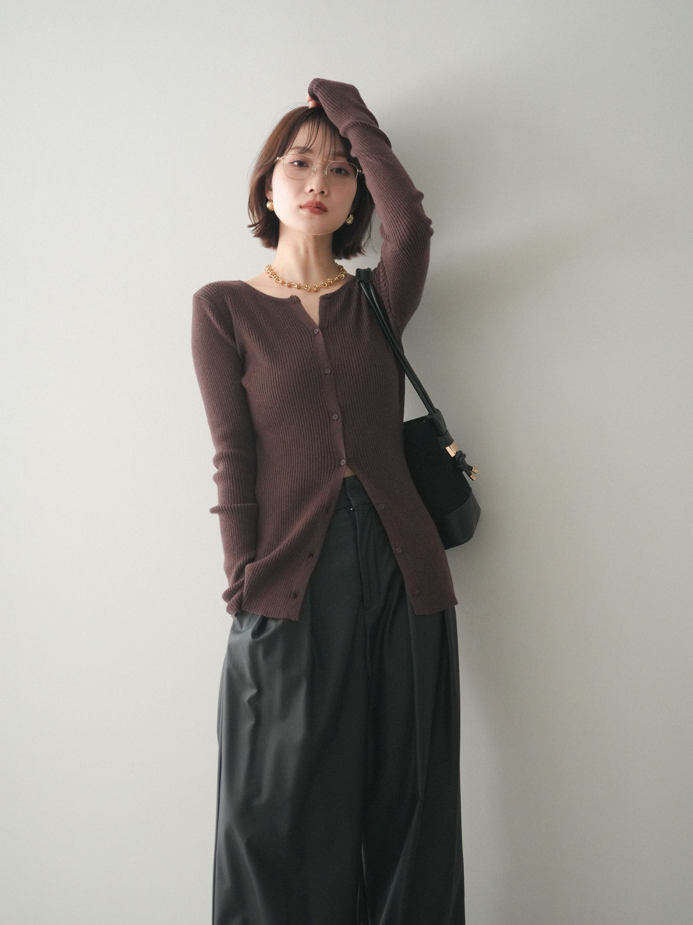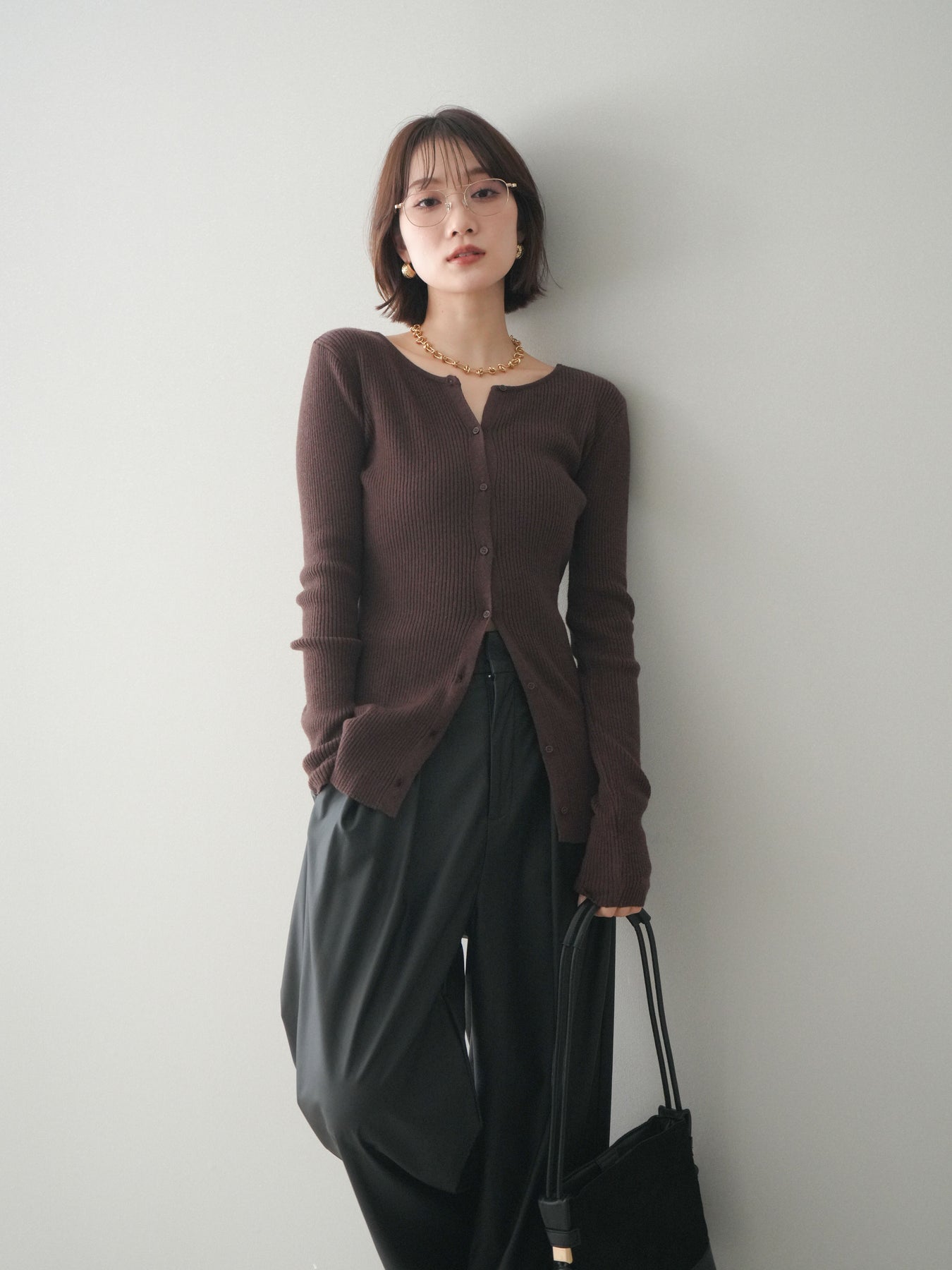 リブ編みの程よいフィット感とすっきりとしたシルエットが魅力のクルーネックカーディガン。前後どちらでも着用できる2WAY仕様で、ボタンを前にすればカーディガンとして、後ろにすればプルオーバー感覚でも楽しめます。縦ラインを強調するリブ編みが自然にスタイルを引き立て、シンプルながら着回し力の高い一着。デイリーからきれいめまで幅広いスタイリングに馴染み、季節を問わず活躍します。 ※ボトムス、キャミソール(インナー)以外の商品は一律でインナーは付属していません。