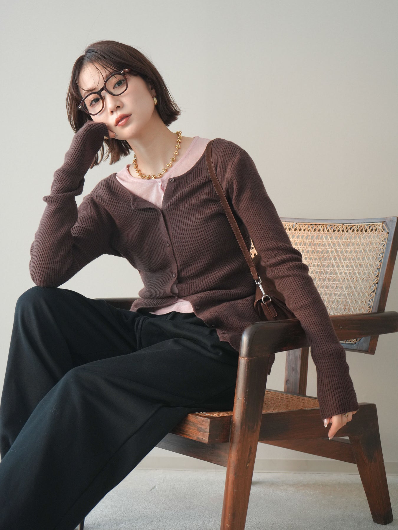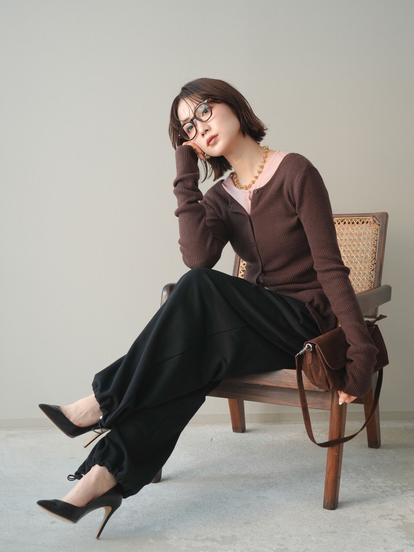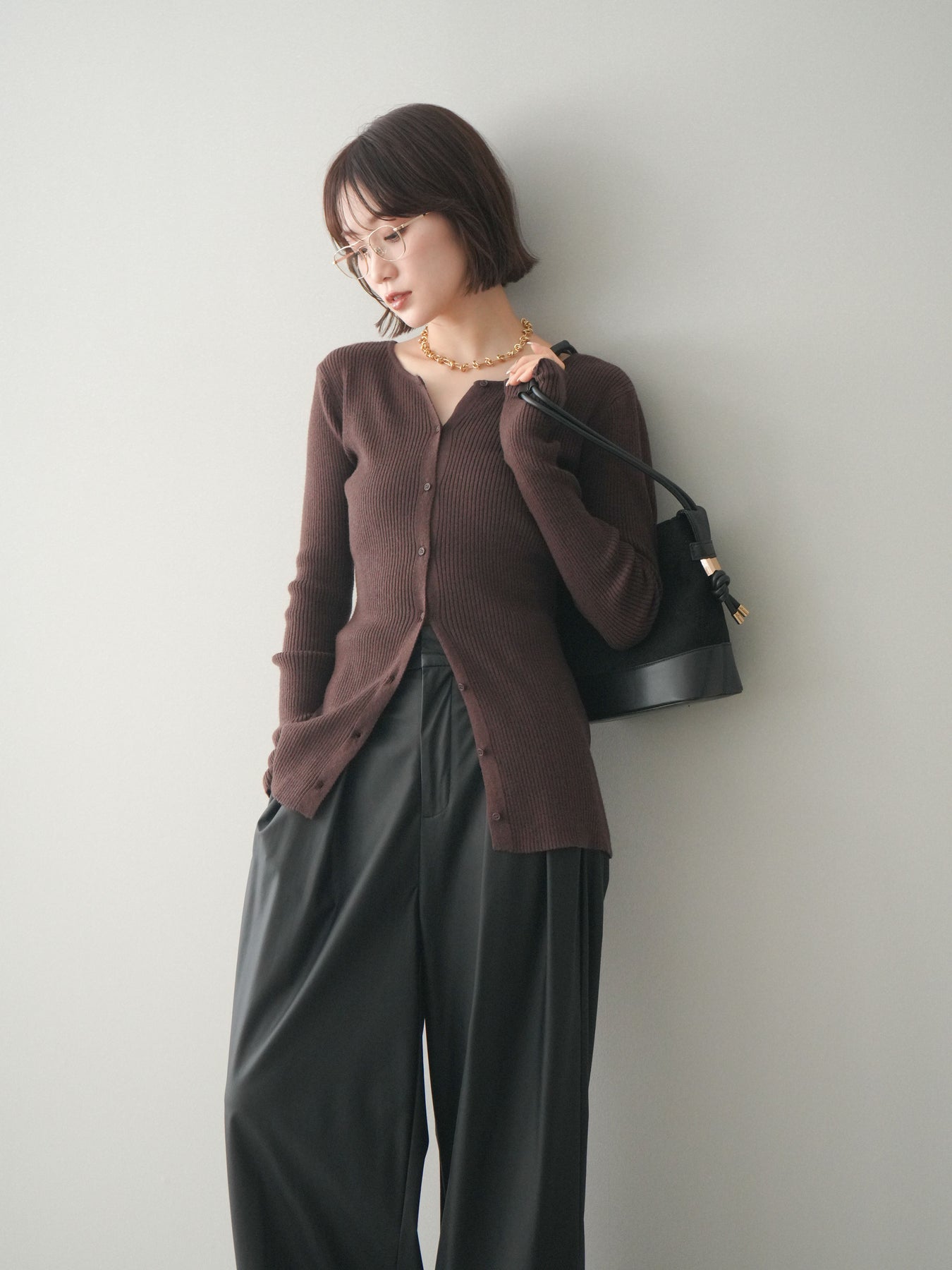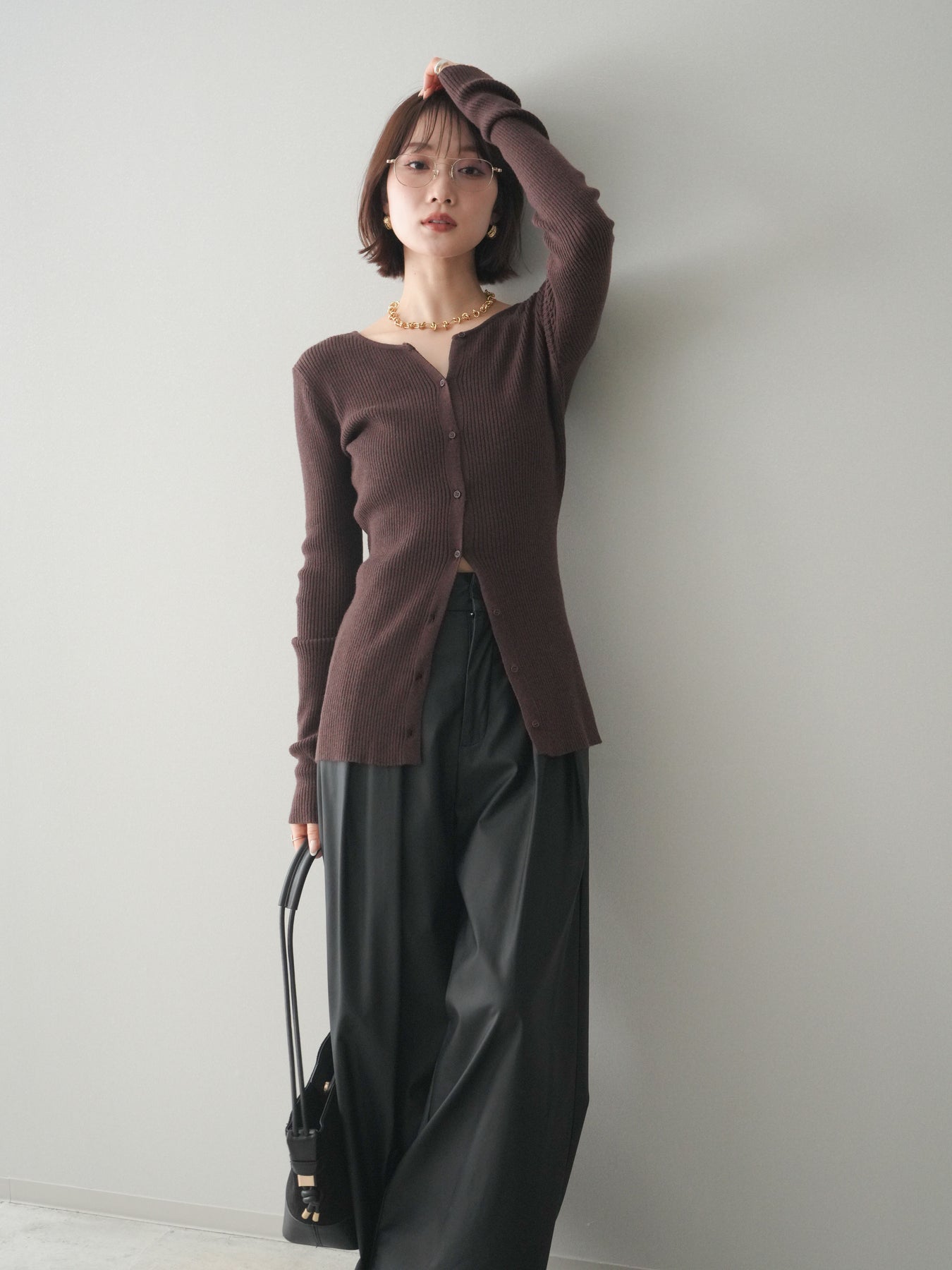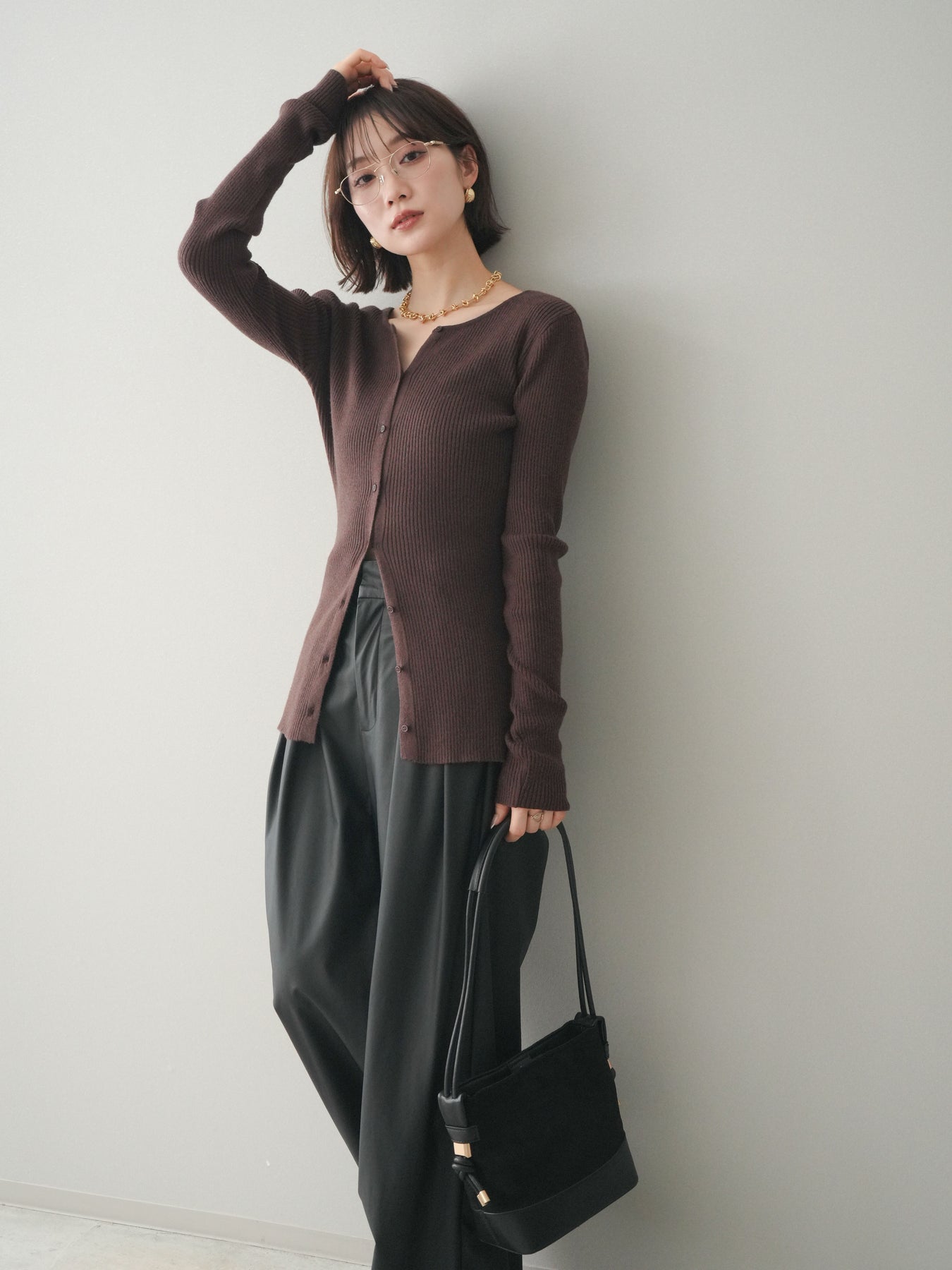 リブ編みの程よいフィット感とすっきりとしたシルエットが魅力のクルーネックカーディガン。前後どちらでも着用できる2WAY仕様で、ボタンを前にすればカーディガンとして、後ろにすればプルオーバー感覚でも楽しめます。縦ラインを強調するリブ編みが自然にスタイルを引き立て、シンプルながら着回し力の高い一着。デイリーからきれいめまで幅広いスタイリングに馴染み、季節を問わず活躍します。 ※ボトムス、キャミソール(インナー)以外の商品は一律でインナーは付属していません。
