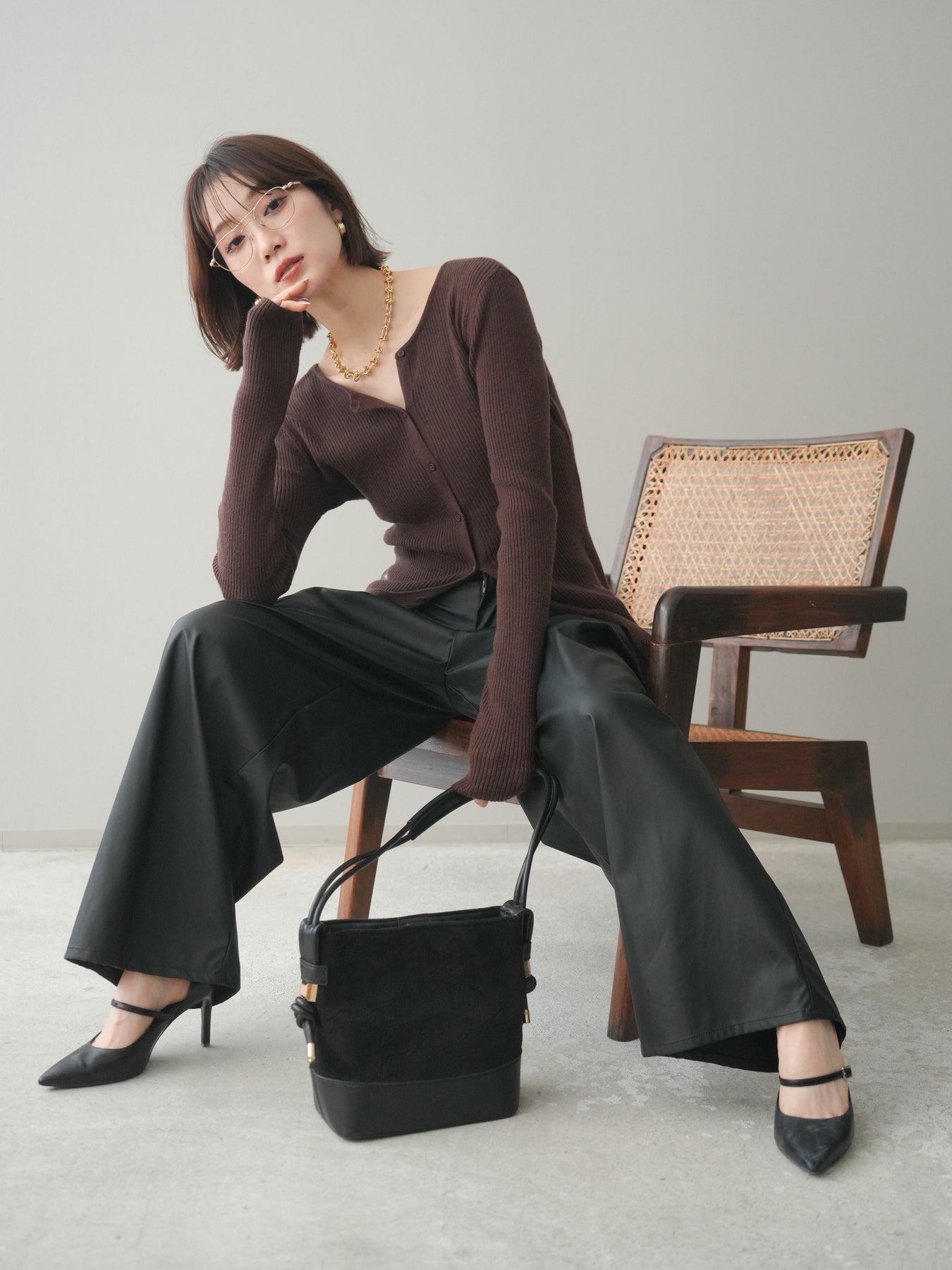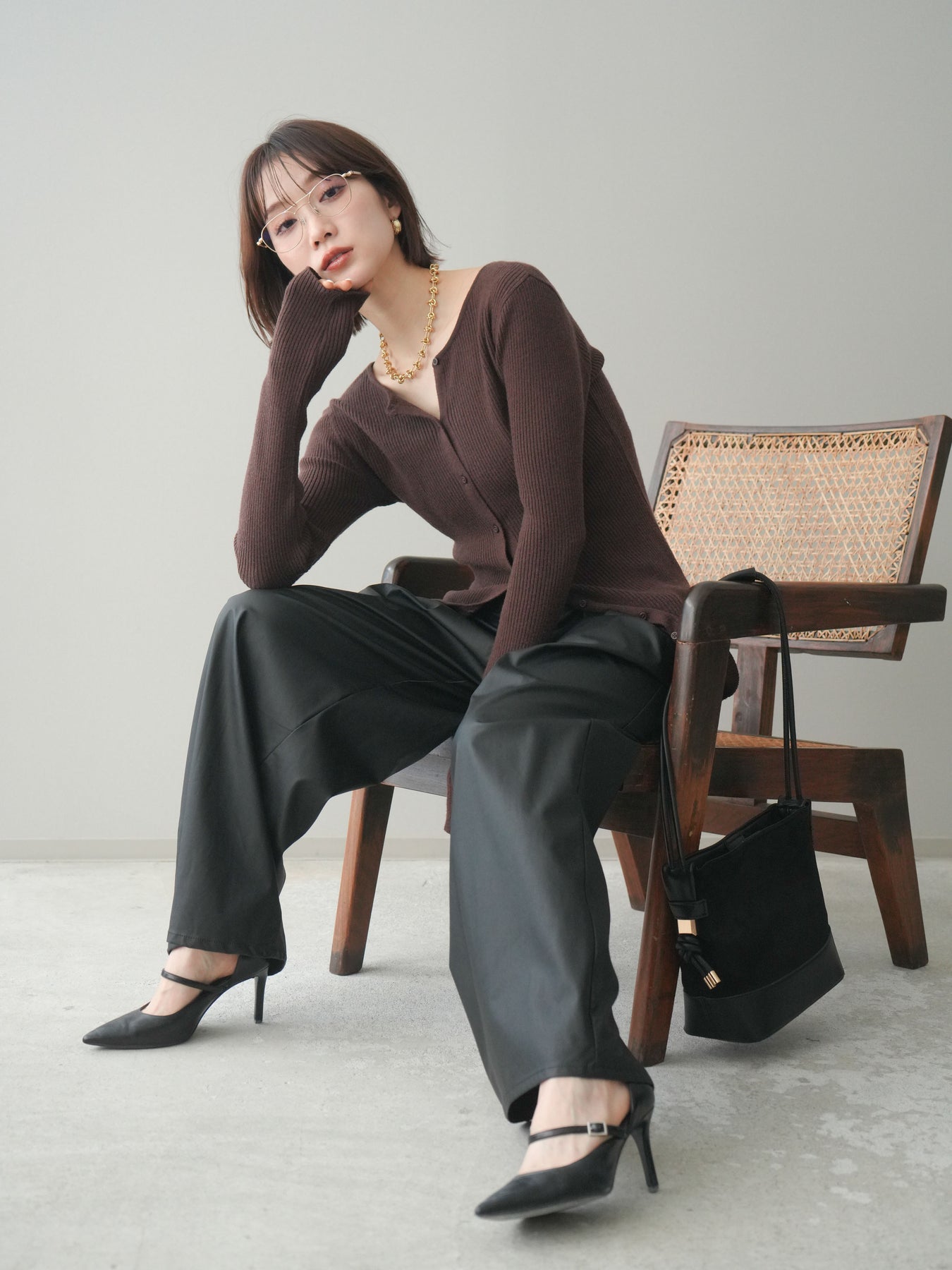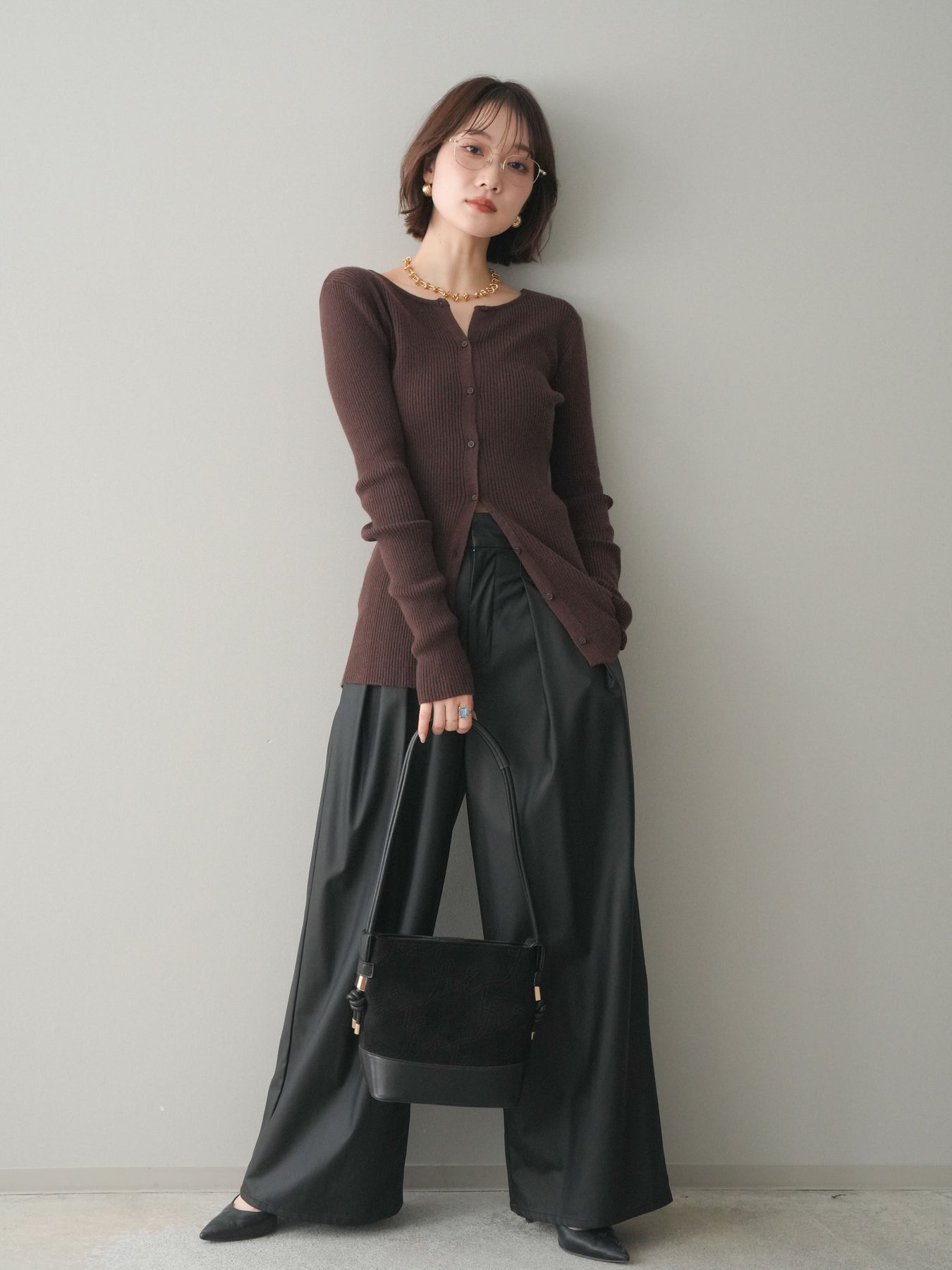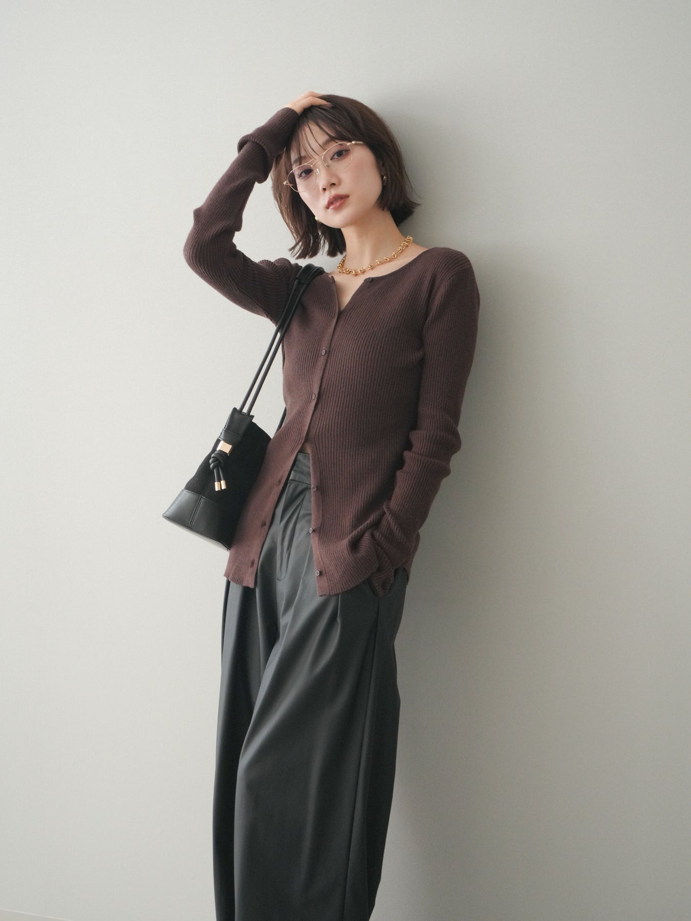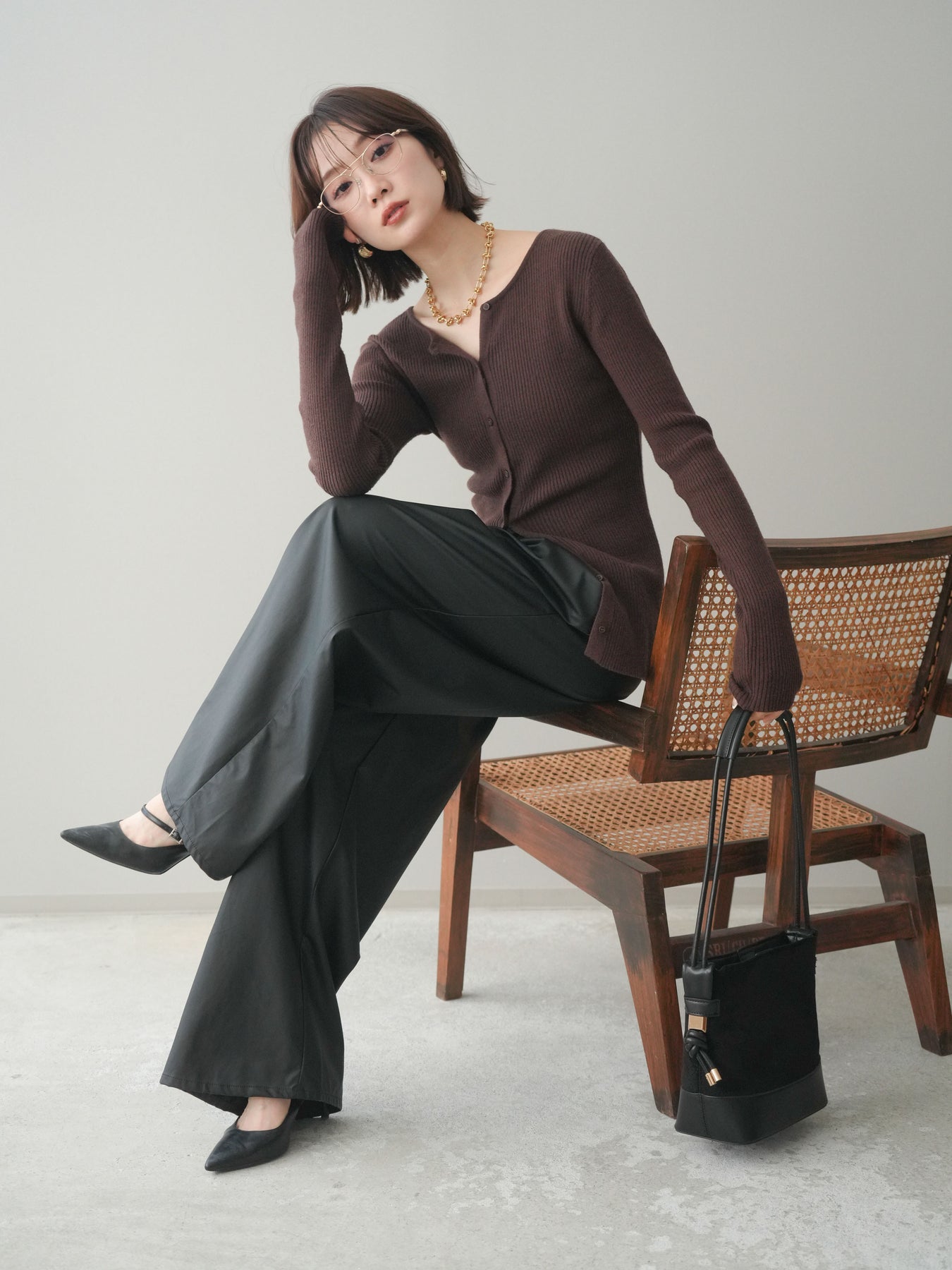 リブ編みの程よいフィット感とすっきりとしたシルエットが魅力のクルーネックカーディガン。前後どちらでも着用できる2WAY仕様で、ボタンを前にすればカーディガンとして、後ろにすればプルオーバー感覚でも楽しめます。縦ラインを強調するリブ編みが自然にスタイルを引き立て、シンプルながら着回し力の高い一着。デイリーからきれいめまで幅広いスタイリングに馴染み、季節を問わず活躍します。 ※ボトムス、キャミソール(インナー)以外の商品は一律でインナーは付属していません。