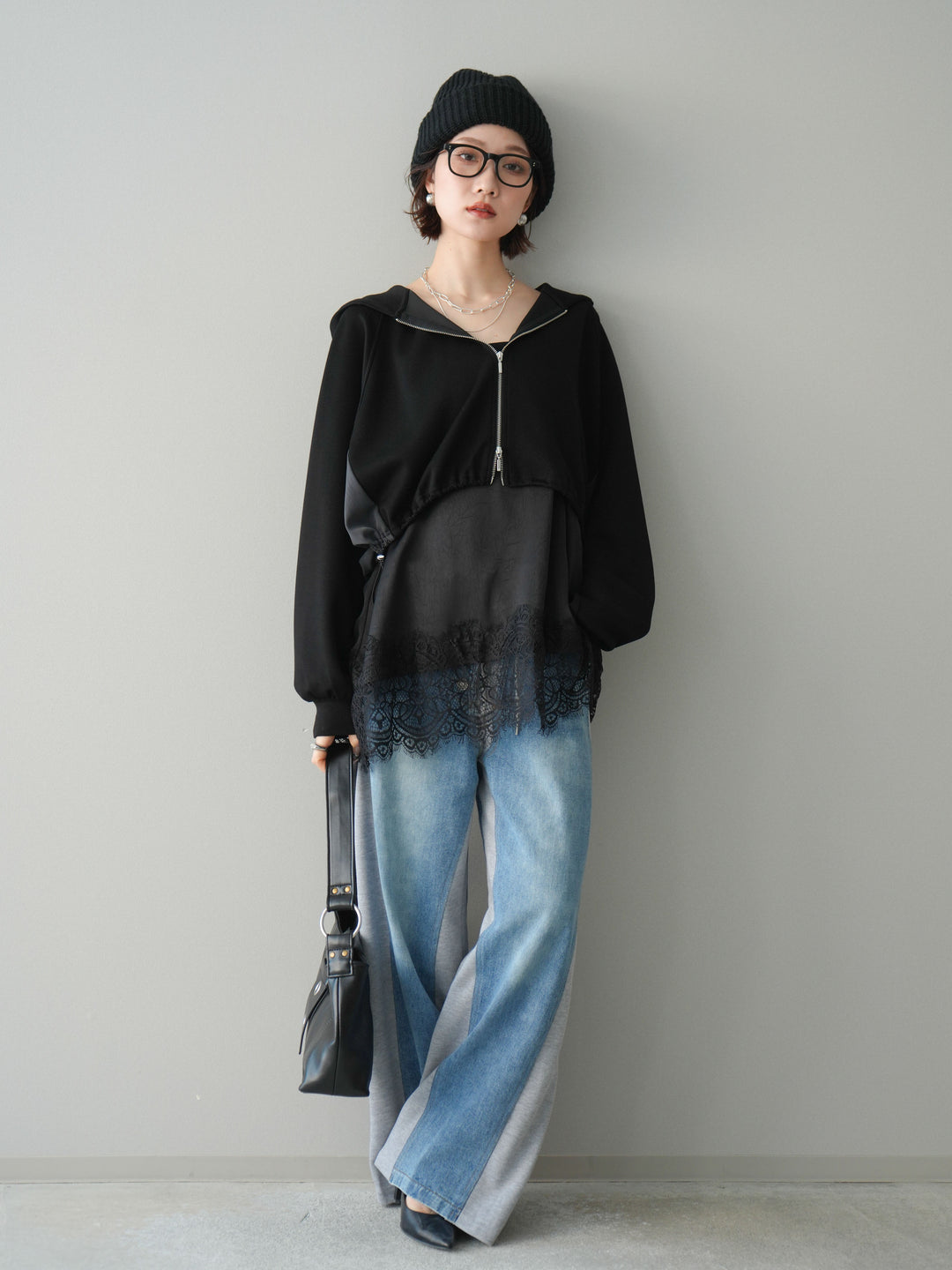 [予約]センターシームラップデザインストレートデニム/ブラック