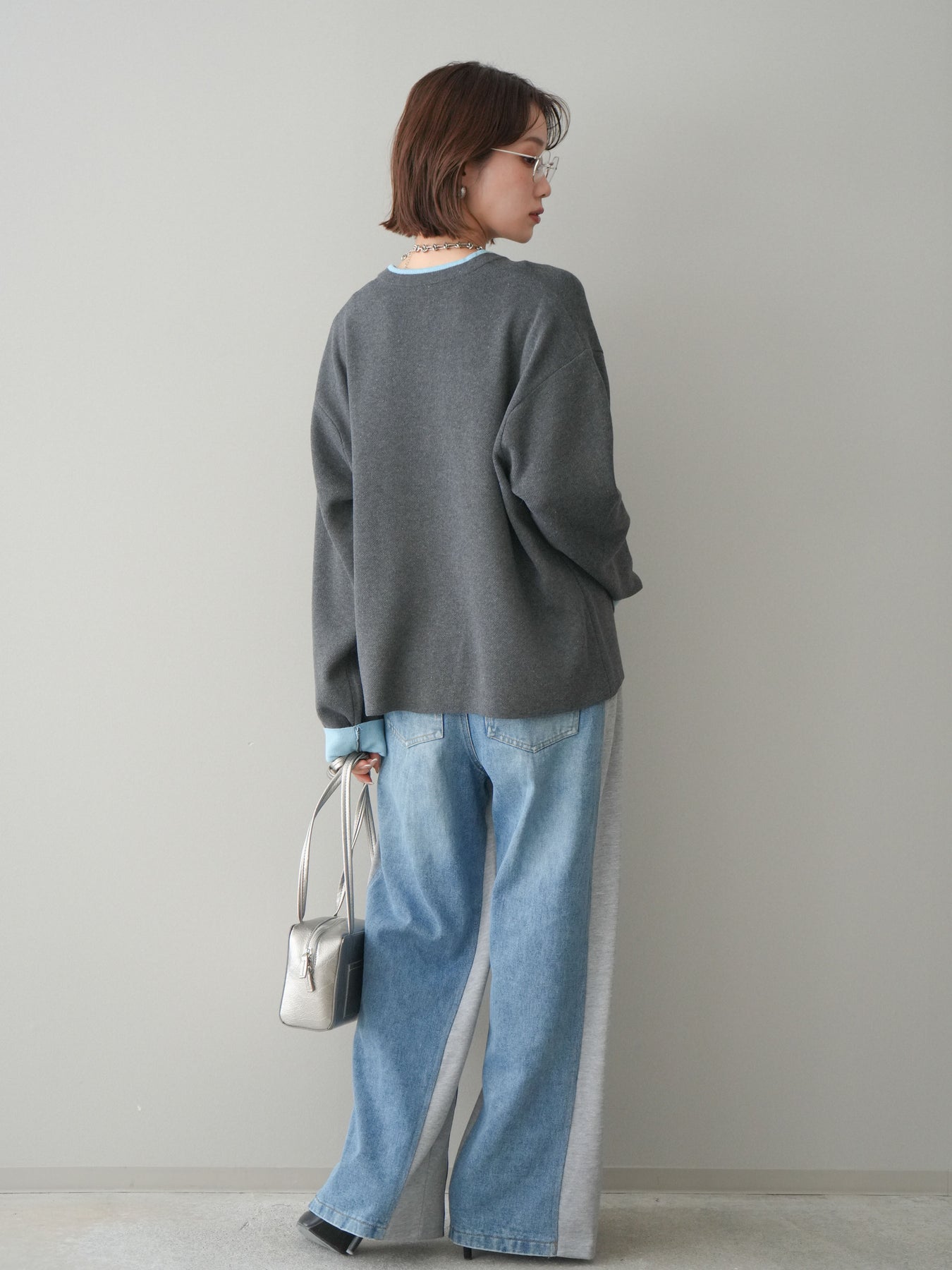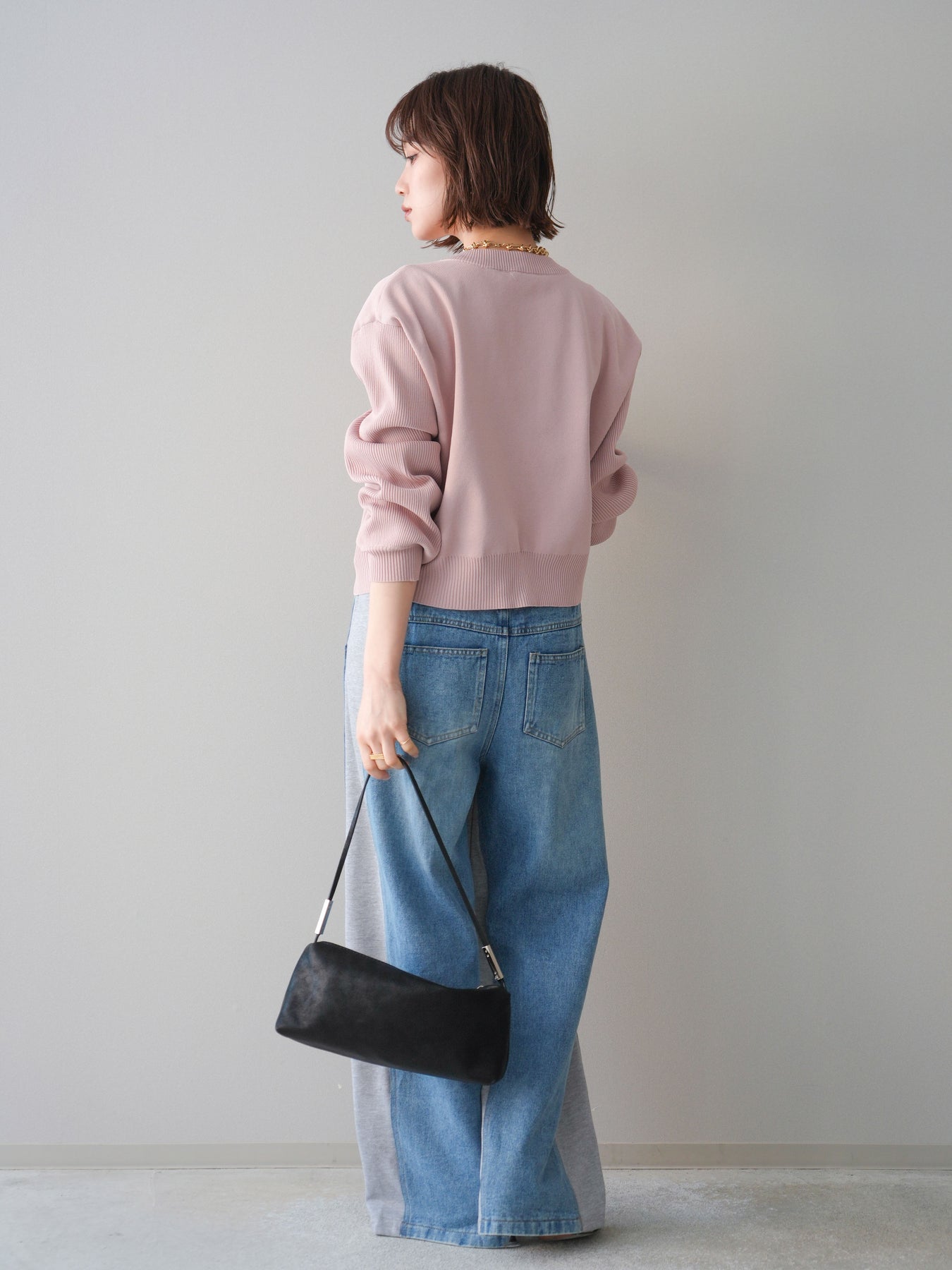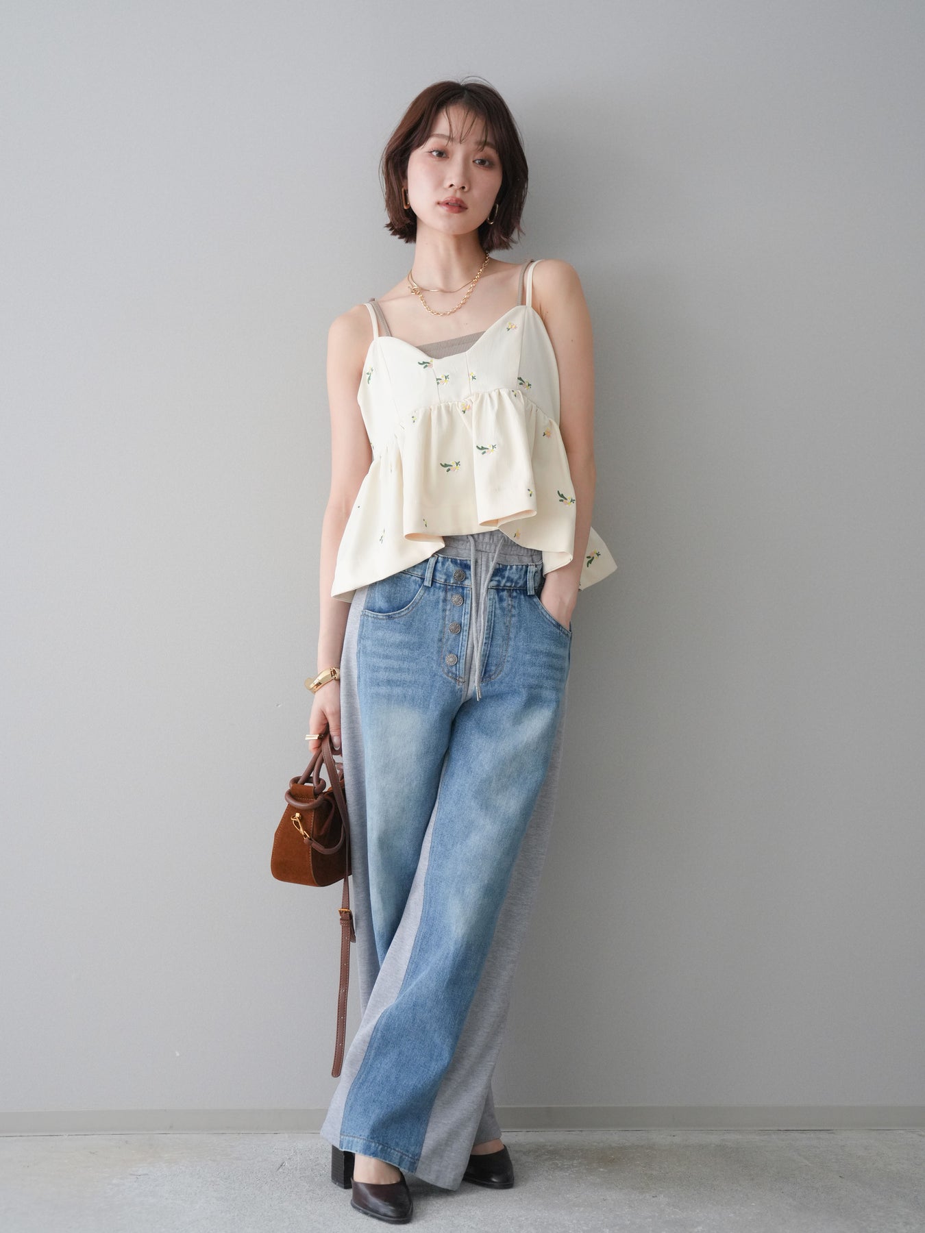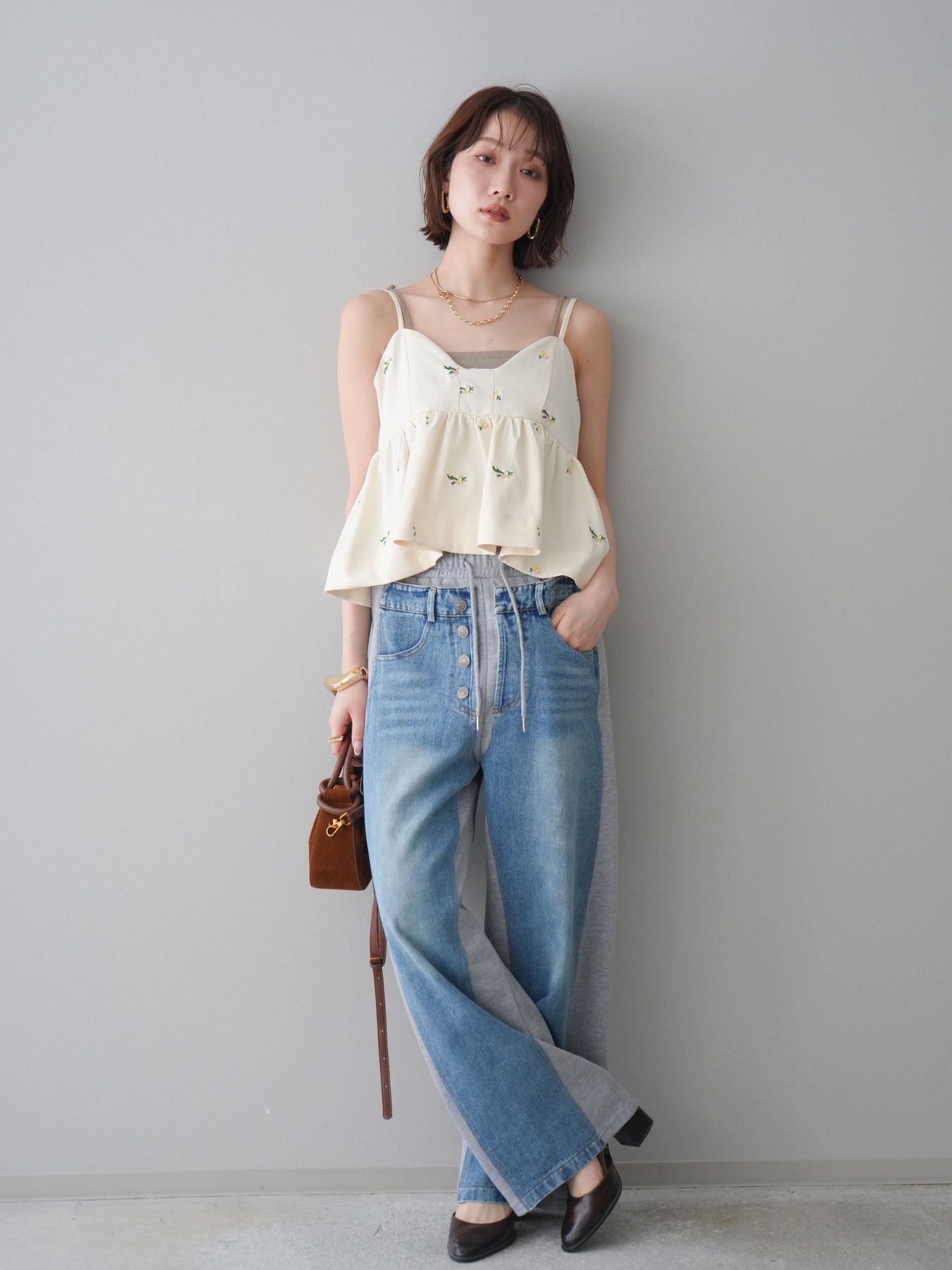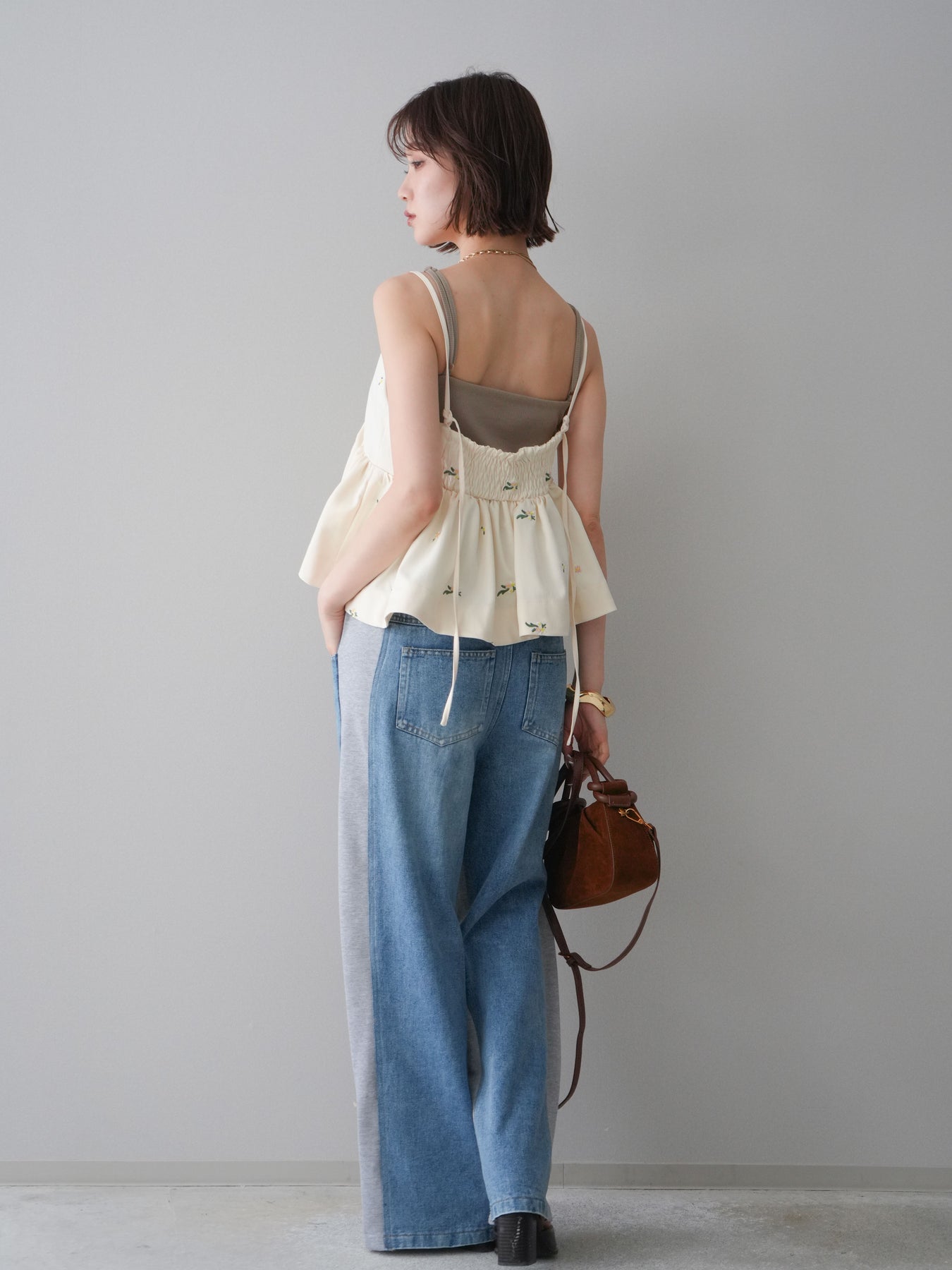 デニムとスウェット素材を切り替えた、カジュアルながらもデザイン性の高いスウェットパンツ。フロントはデニムライクな表情で程よくメリハリを持たせつつ、ウエストやサイドには柔らかなスウェット素材を使用し、リラックス感のある穿き心地に仕上げています。ウエストはイージー仕様でストレスフリーながら、シルエットはすっきりと見えるバランスに。ラフになりすぎず、トップス次第でカジュアルからきれいめまで幅広いスタイリングに対応する一本です。 ※ボトムス、キャミソール(インナー)以外の商品は一律でインナーは付属していません。