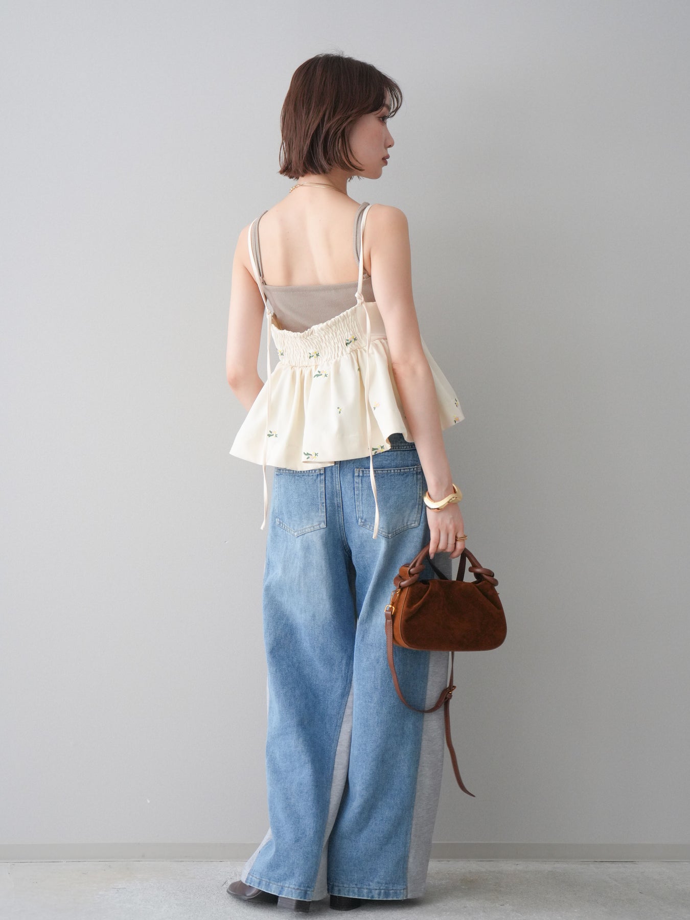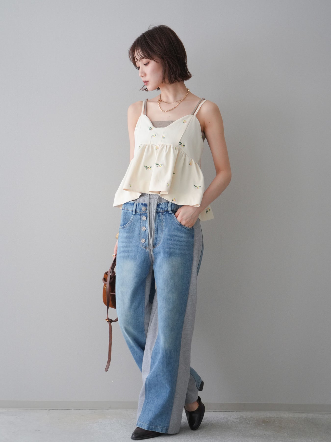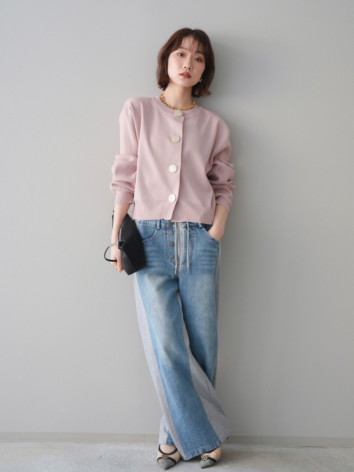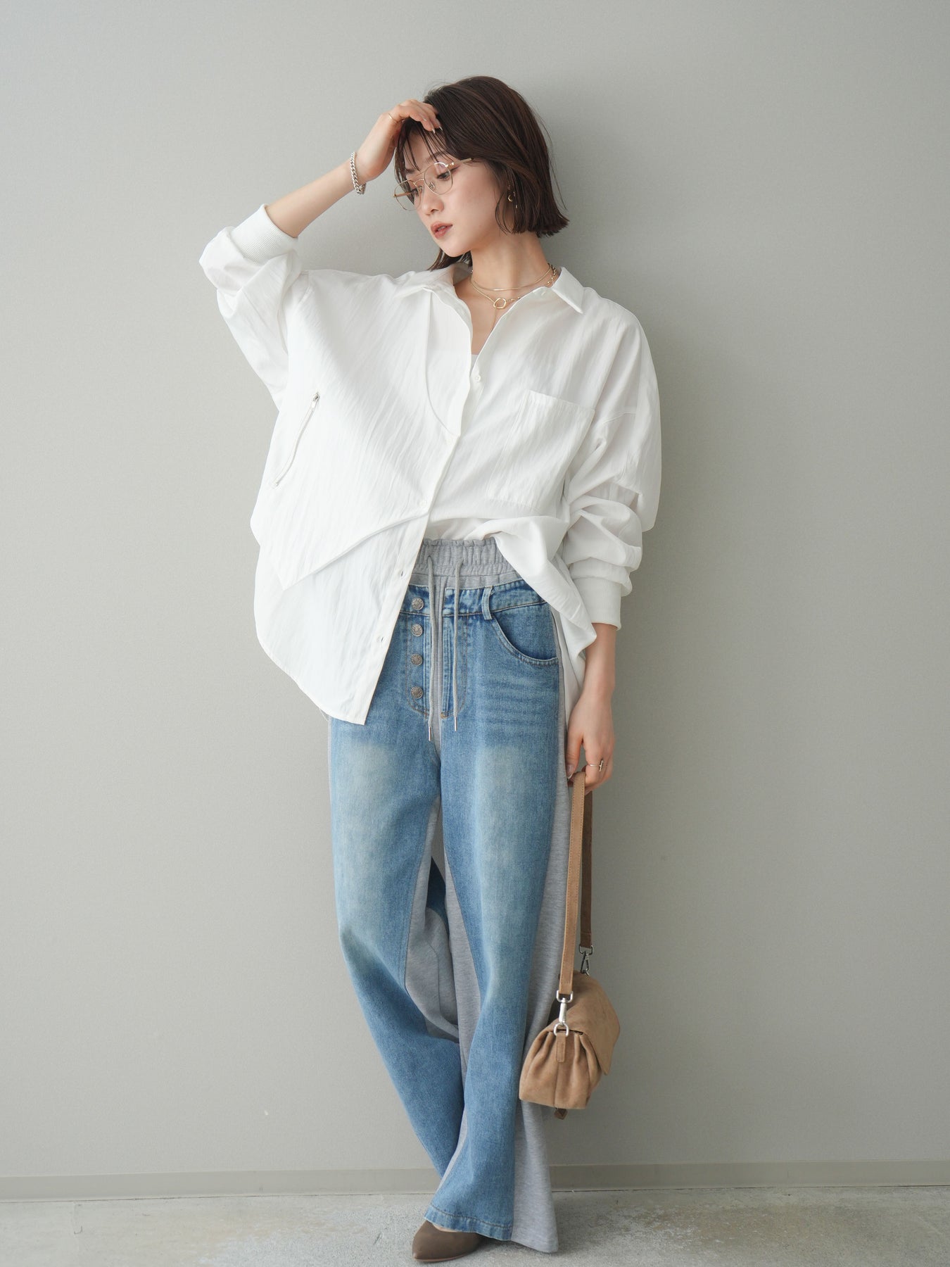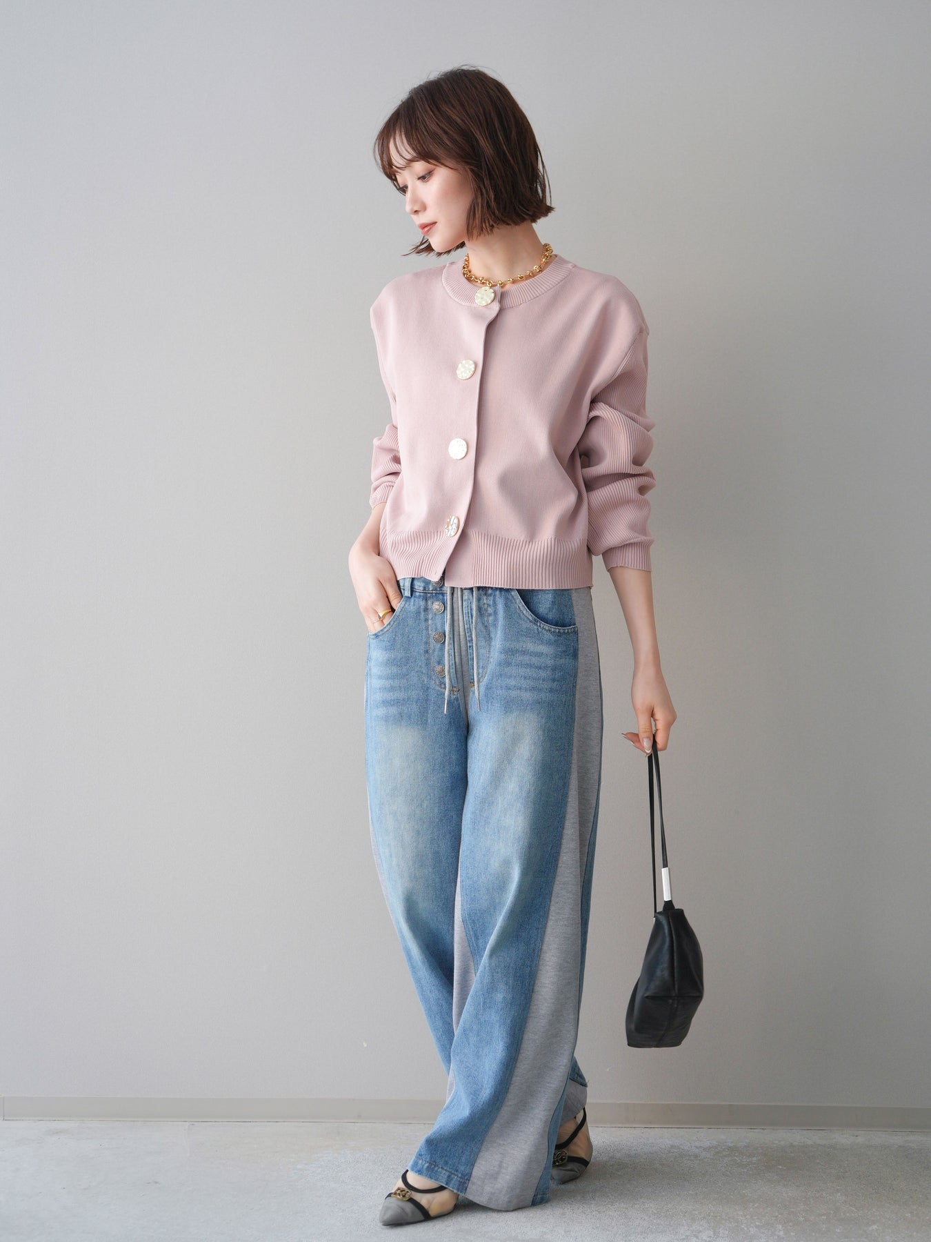デニムとスウェット素材を切り替えた、カジュアルながらもデザイン性の高いスウェットパンツ。フロントはデニムライクな表情で程よくメリハリを持たせつつ、ウエストやサイドには柔らかなスウェット素材を使用し、リラックス感のある穿き心地に仕上げています。ウエストはイージー仕様でストレスフリーながら、シルエットはすっきりと見えるバランスに。ラフになりすぎず、トップス次第でカジュアルからきれいめまで幅広いスタイリングに対応する一本です。 ※ボトムス、キャミソール(インナー)以外の商品は一律でインナーは付属していません。