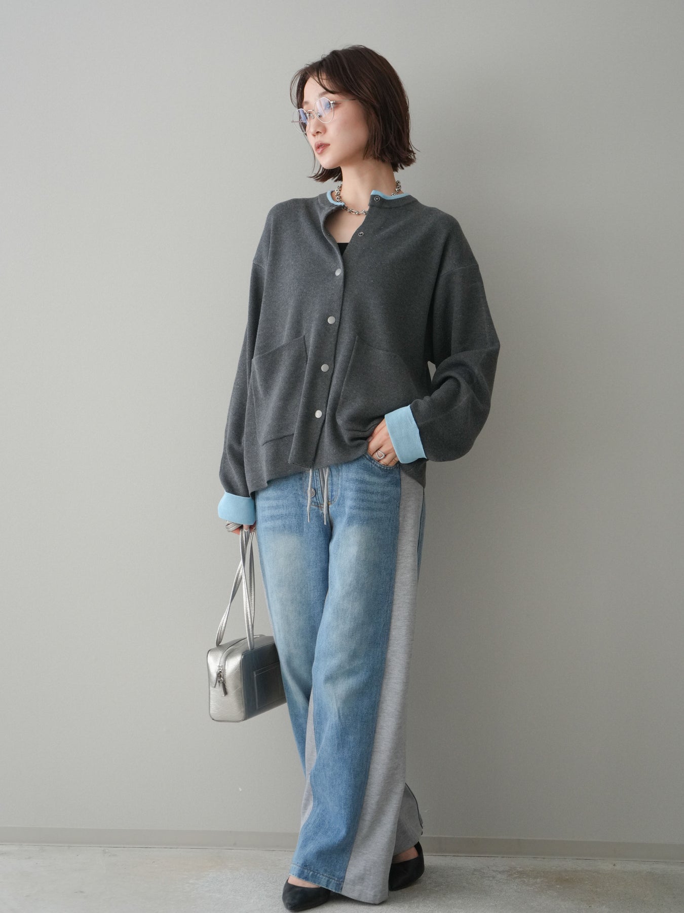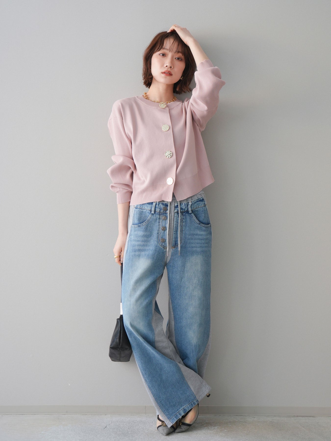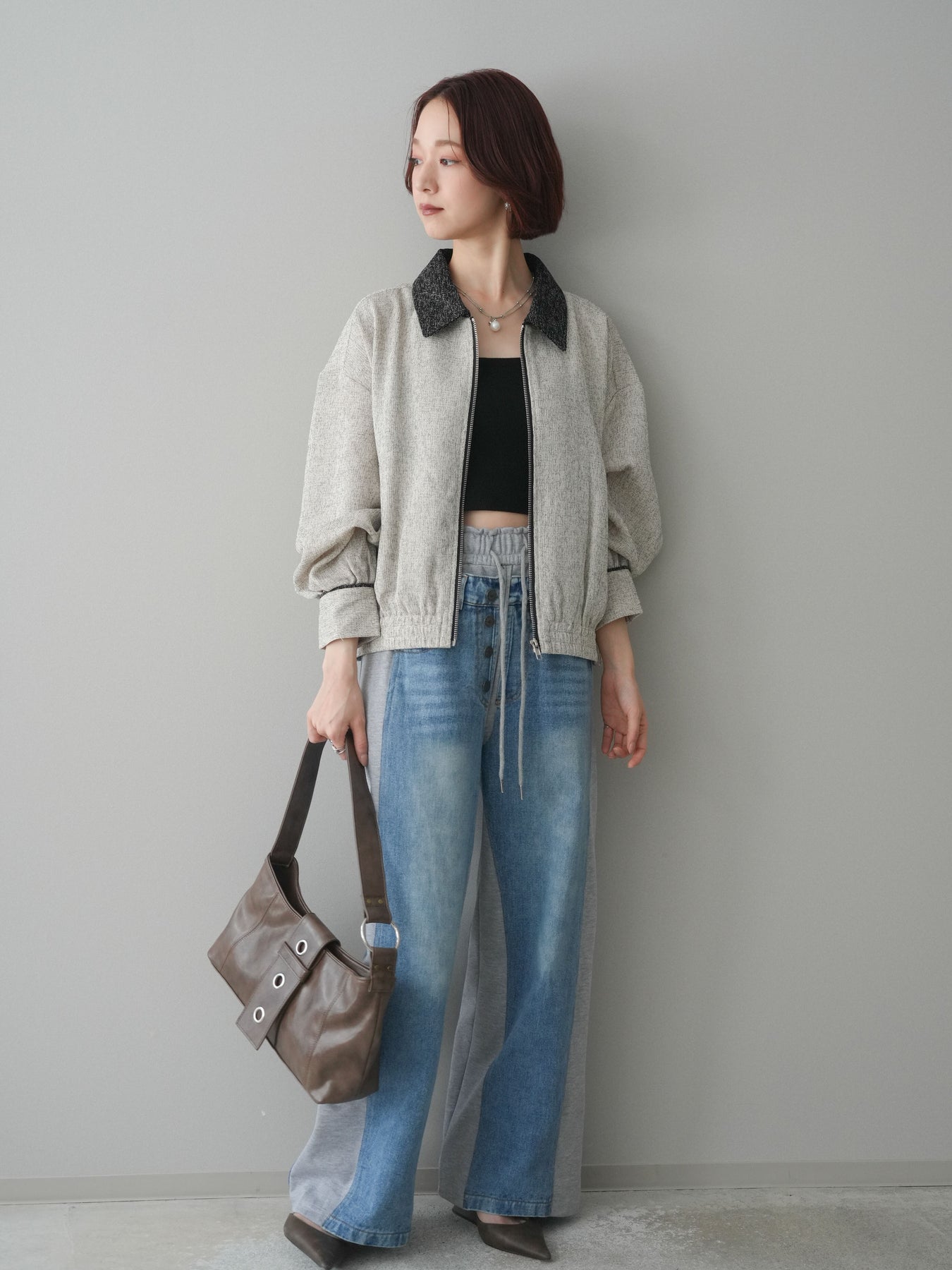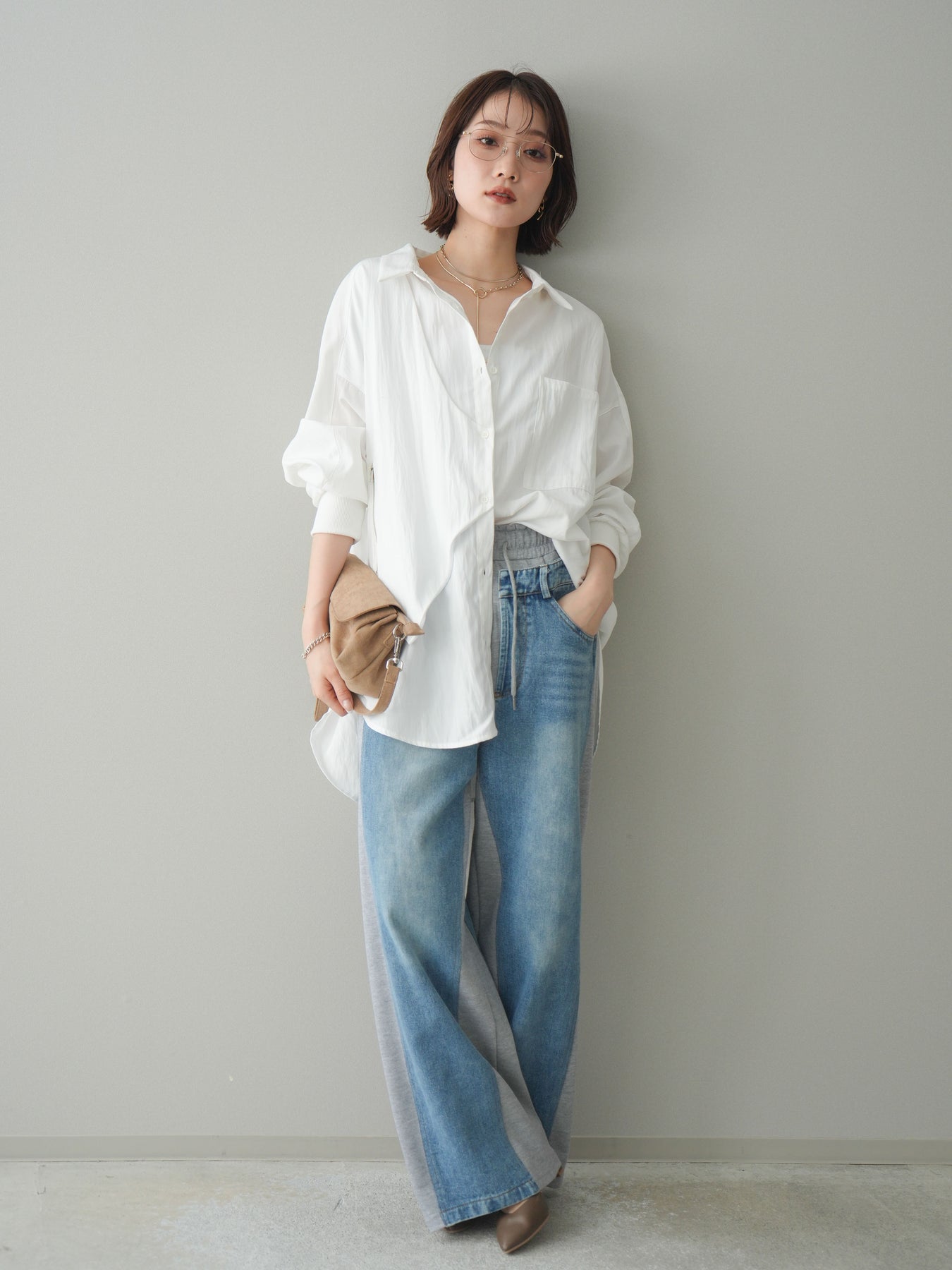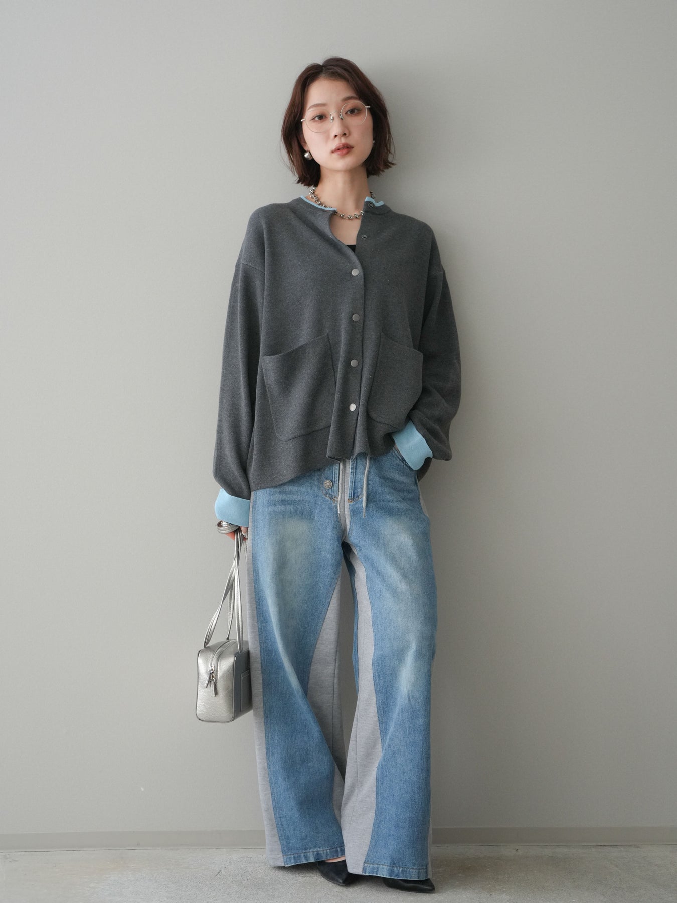 デニムとスウェット素材を切り替えた、カジュアルながらもデザイン性の高いスウェットパンツ。フロントはデニムライクな表情で程よくメリハリを持たせつつ、ウエストやサイドには柔らかなスウェット素材を使用し、リラックス感のある穿き心地に仕上げています。ウエストはイージー仕様でストレスフリーながら、シルエットはすっきりと見えるバランスに。ラフになりすぎず、トップス次第でカジュアルからきれいめまで幅広いスタイリングに対応する一本です。 ※ボトムス、キャミソール(インナー)以外の商品は一律でインナーは付属していません。