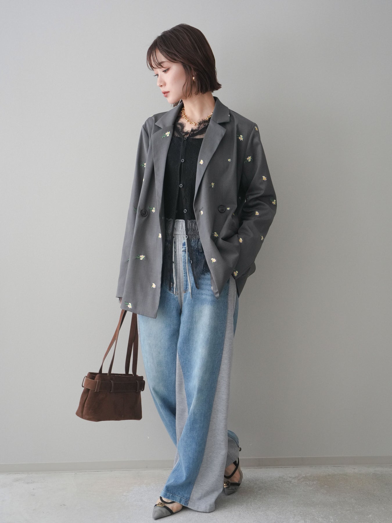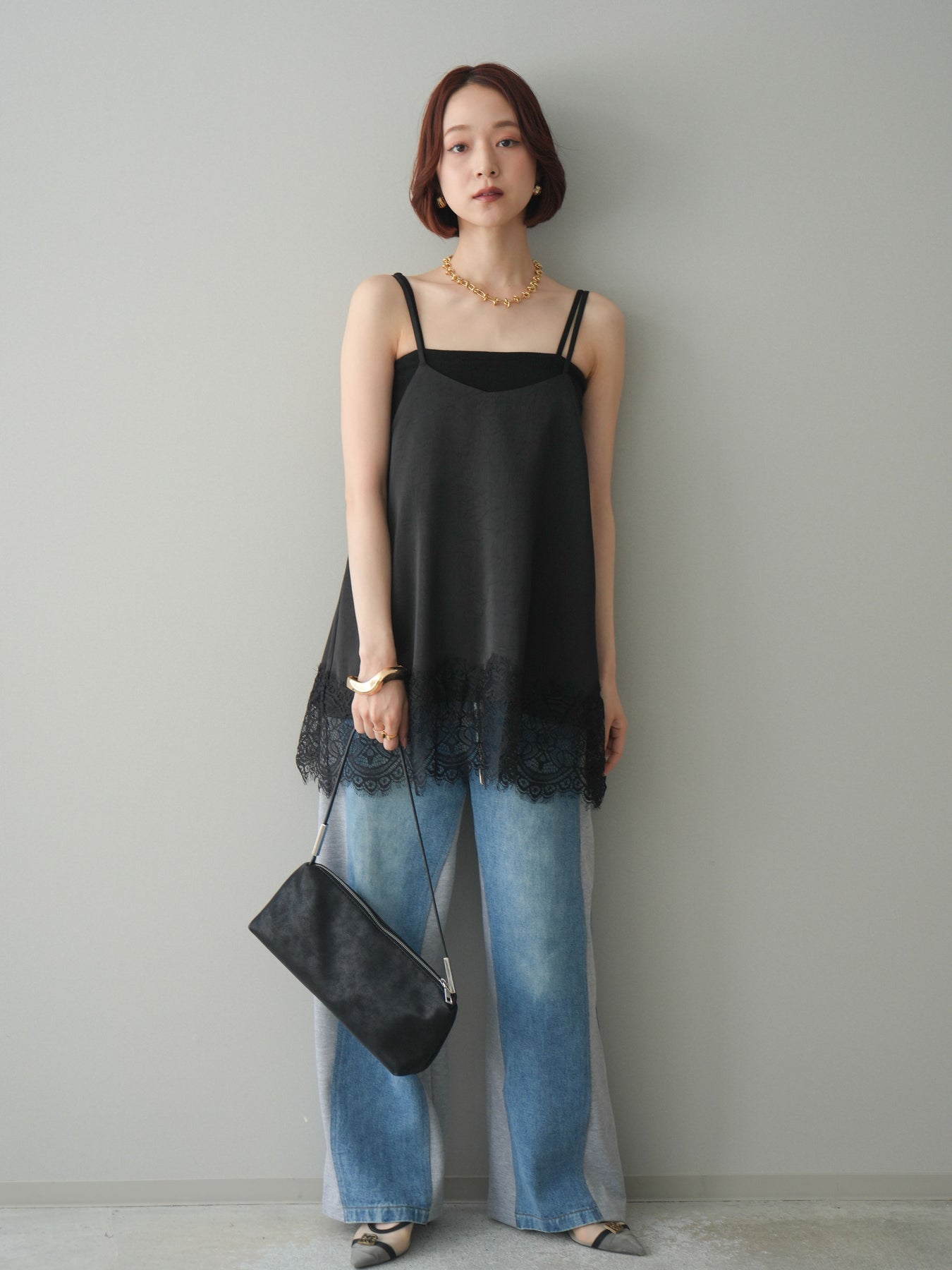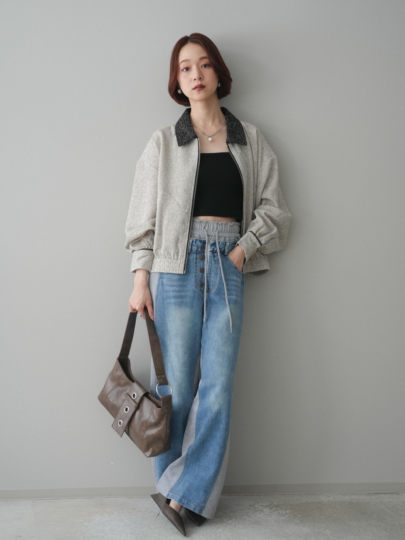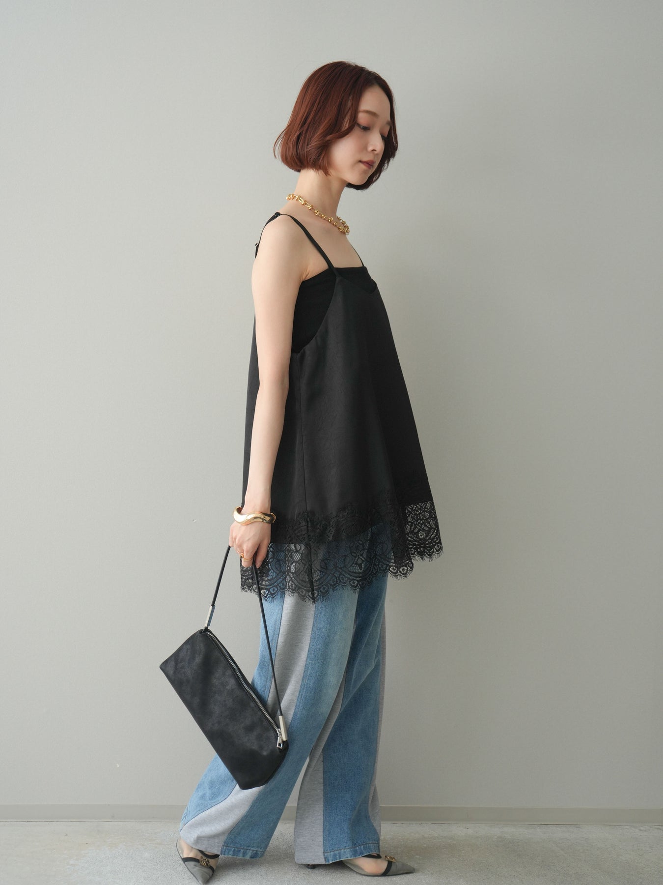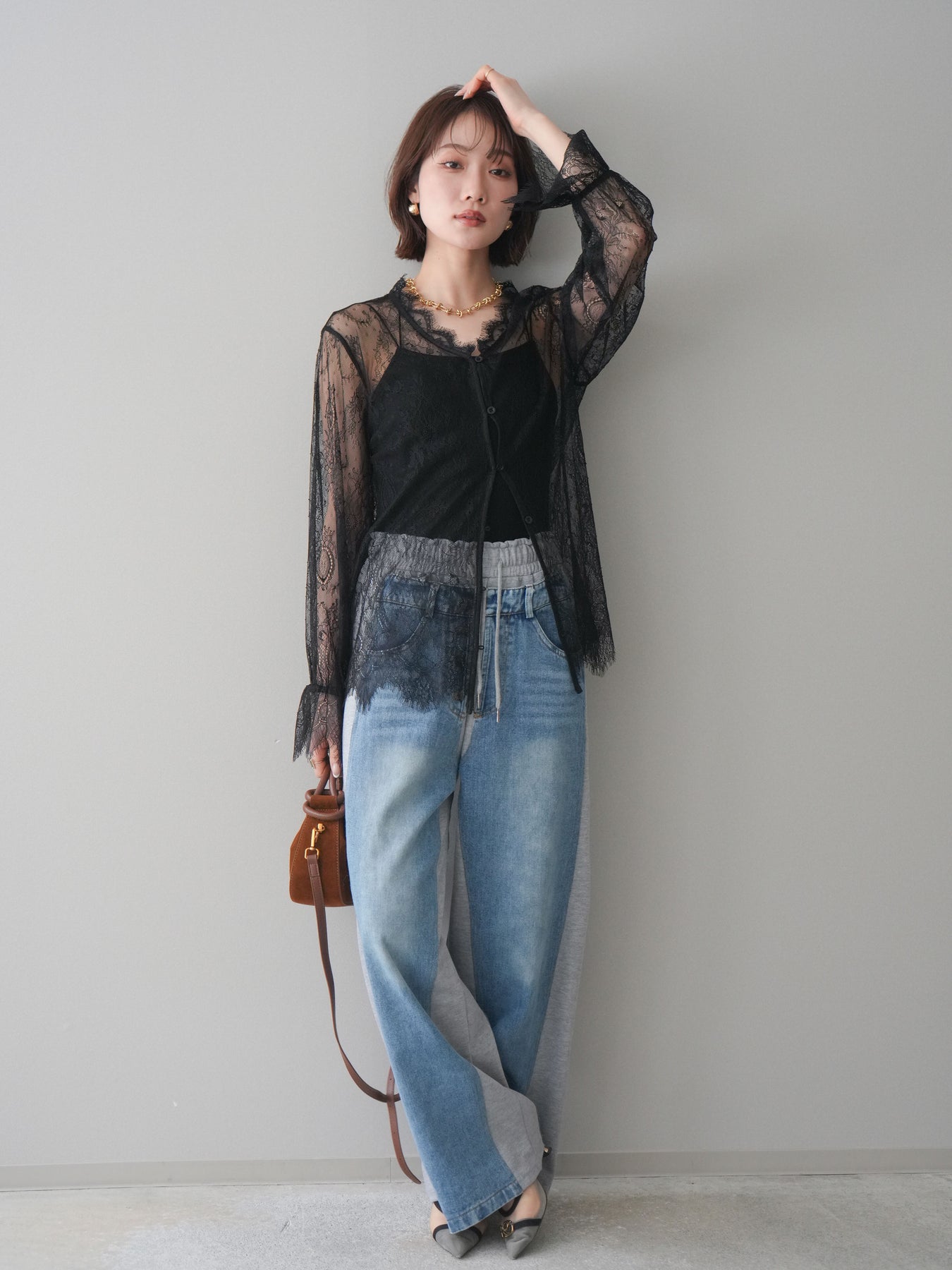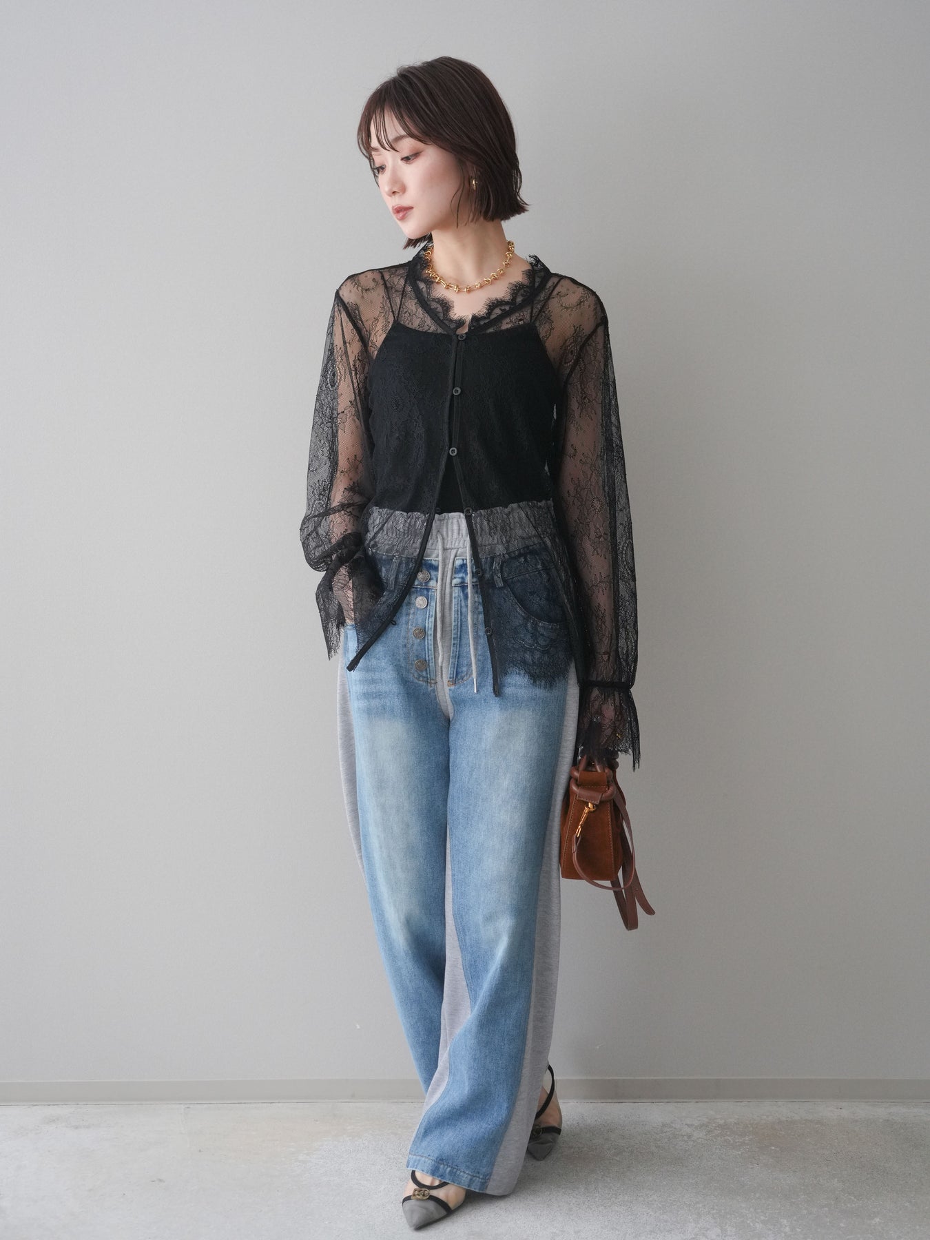 デニムとスウェット素材を切り替えた、カジュアルながらもデザイン性の高いスウェットパンツ。フロントはデニムライクな表情で程よくメリハリを持たせつつ、ウエストやサイドには柔らかなスウェット素材を使用し、リラックス感のある穿き心地に仕上げています。ウエストはイージー仕様でストレスフリーながら、シルエットはすっきりと見えるバランスに。ラフになりすぎず、トップス次第でカジュアルからきれいめまで幅広いスタイリングに対応する一本です。 ※ボトムス、キャミソール(インナー)以外の商品は一律でインナーは付属していません。