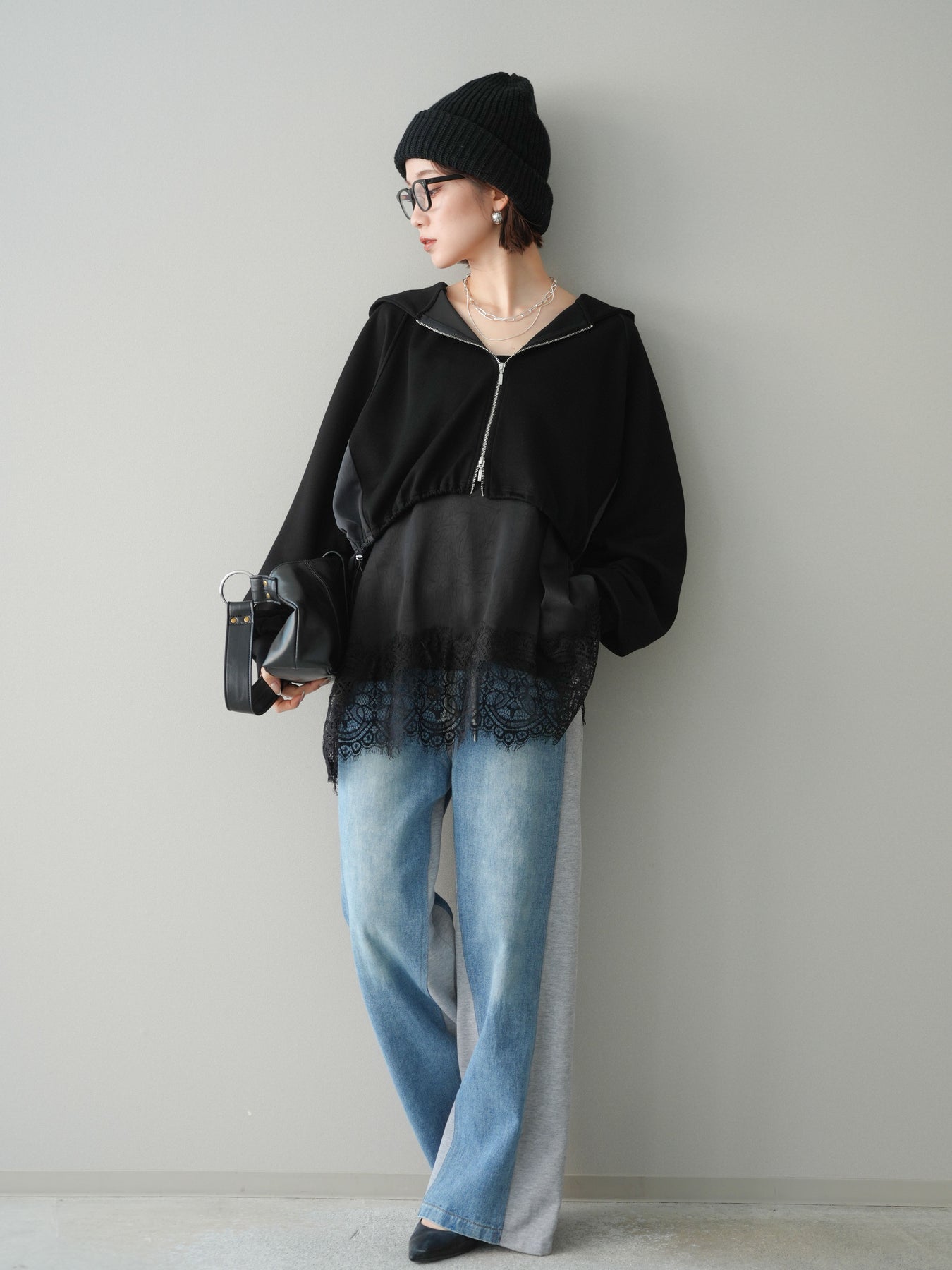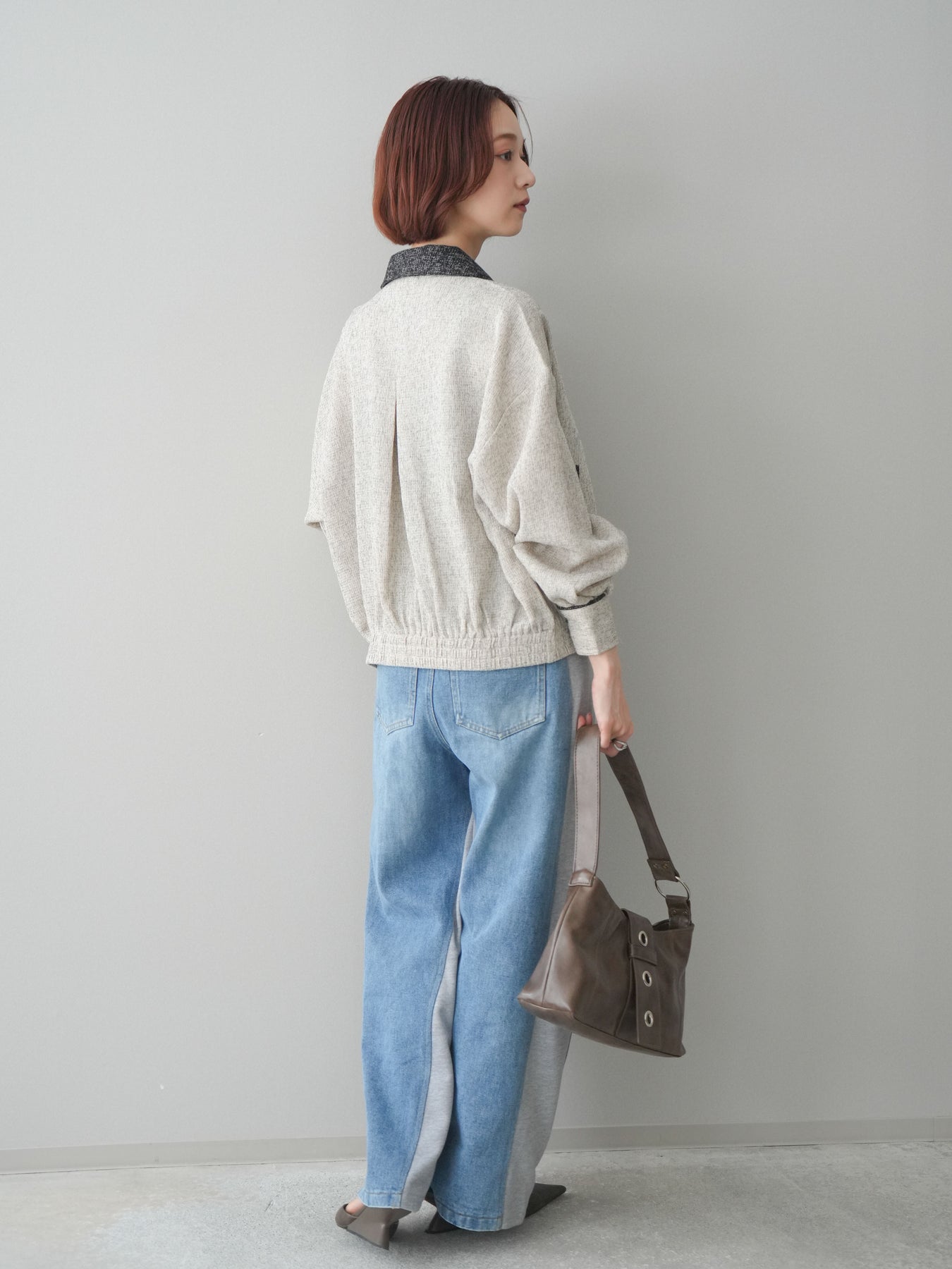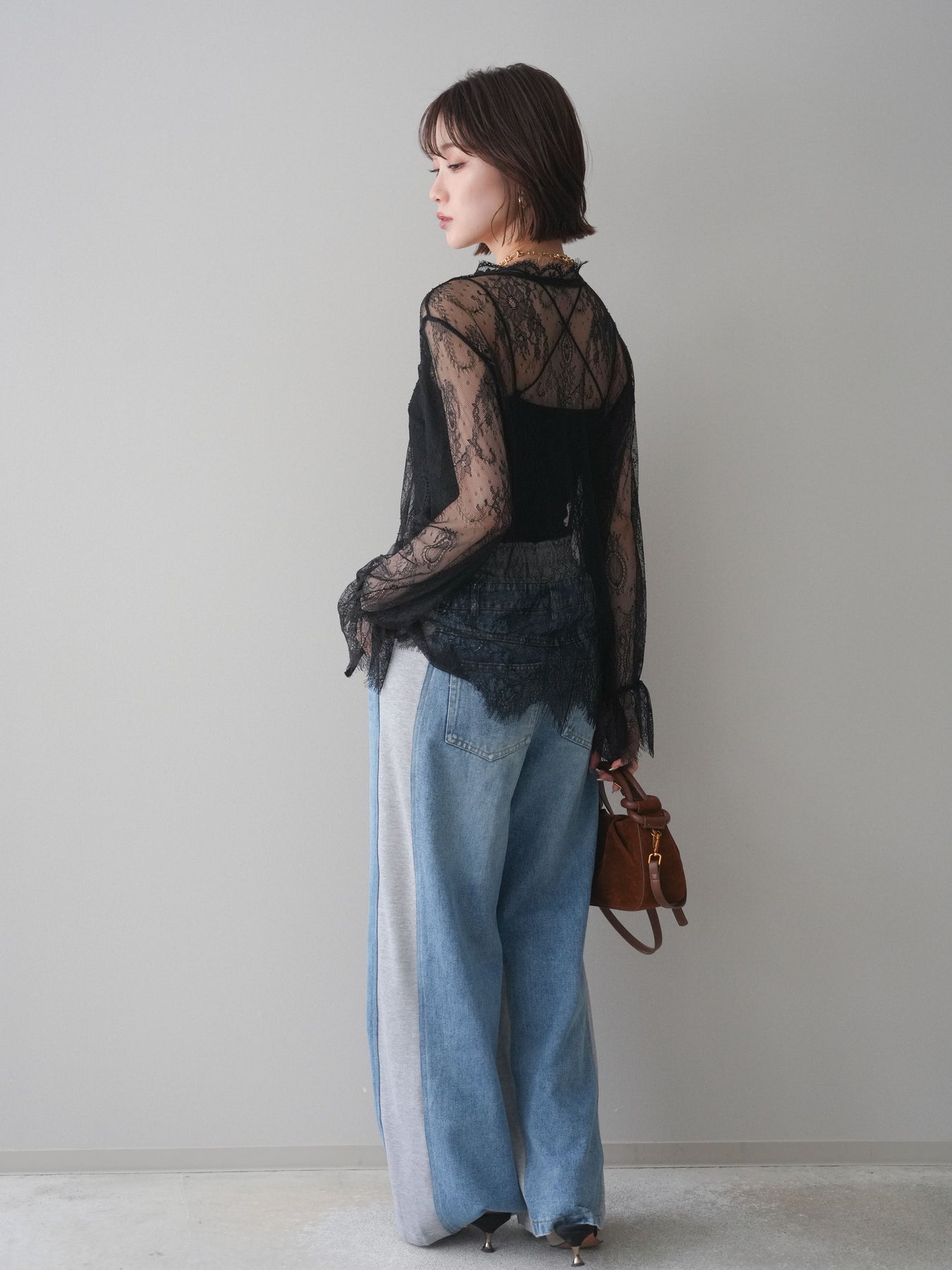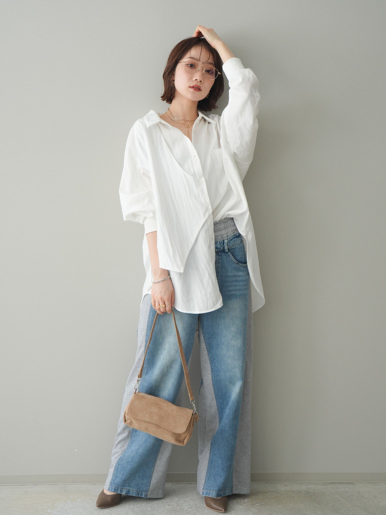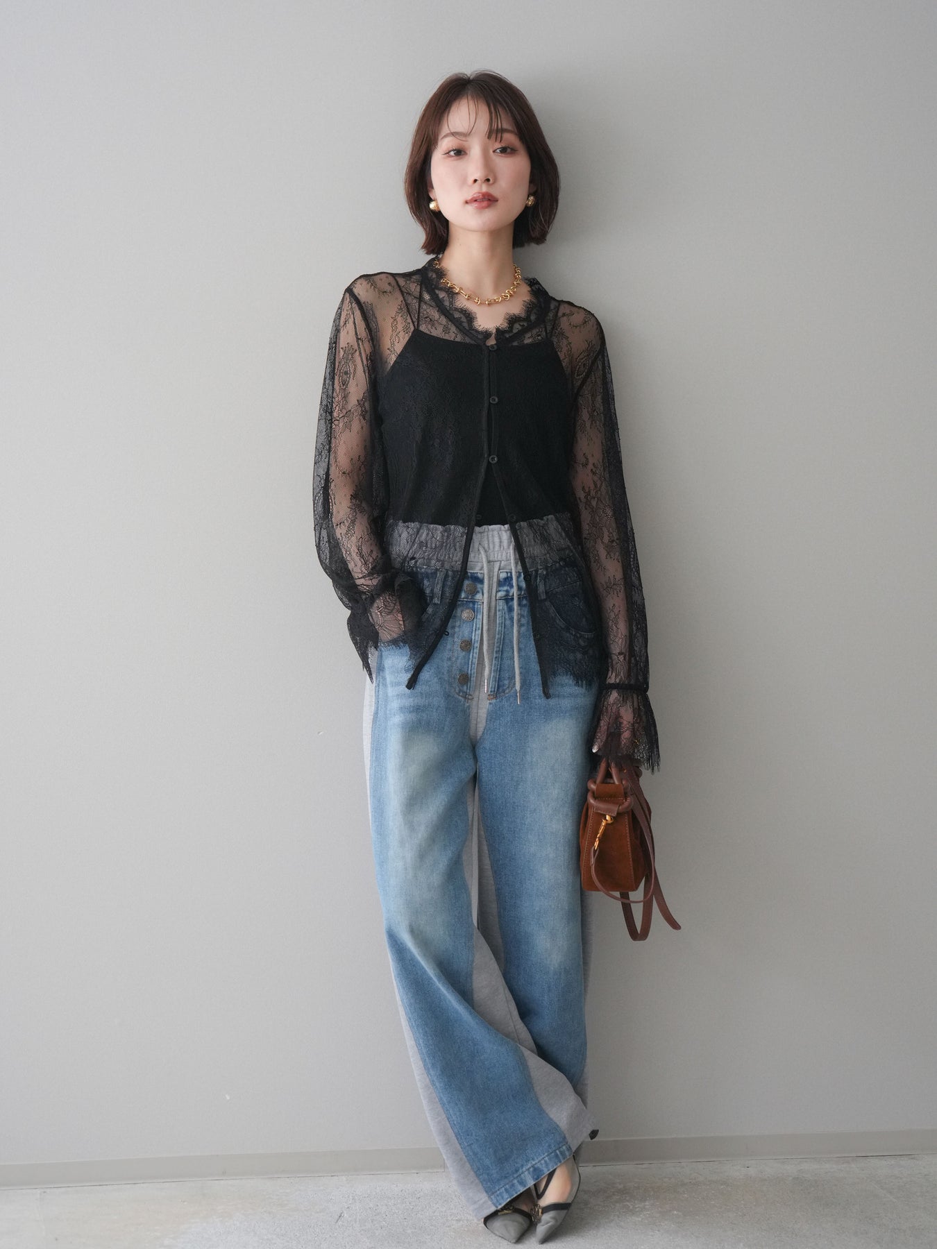 デニムとスウェット素材を切り替えた、カジュアルながらもデザイン性の高いスウェットパンツ。フロントはデニムライクな表情で程よくメリハリを持たせつつ、ウエストやサイドには柔らかなスウェット素材を使用し、リラックス感のある穿き心地に仕上げています。ウエストはイージー仕様でストレスフリーながら、シルエットはすっきりと見えるバランスに。ラフになりすぎず、トップス次第でカジュアルからきれいめまで幅広いスタイリングに対応する一本です。 ※ボトムス、キャミソール(インナー)以外の商品は一律でインナーは付属していません。