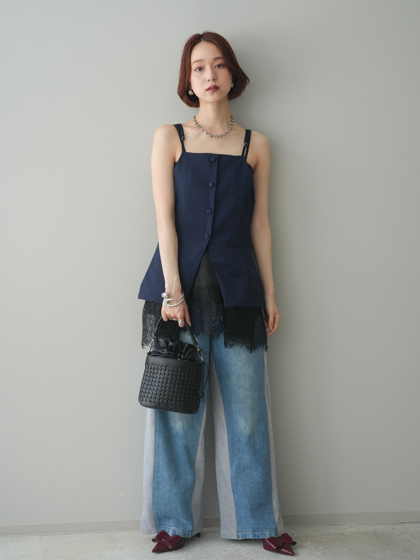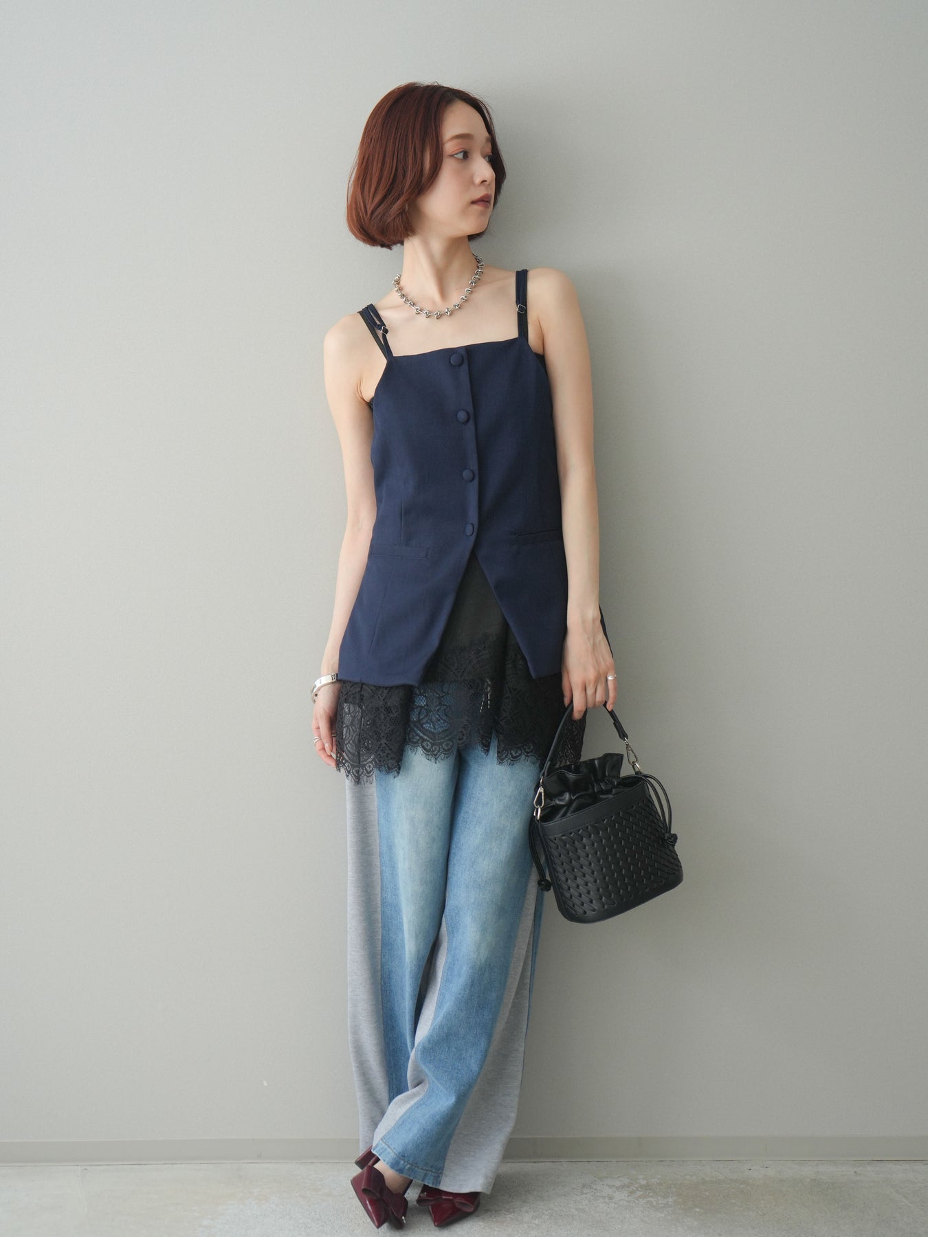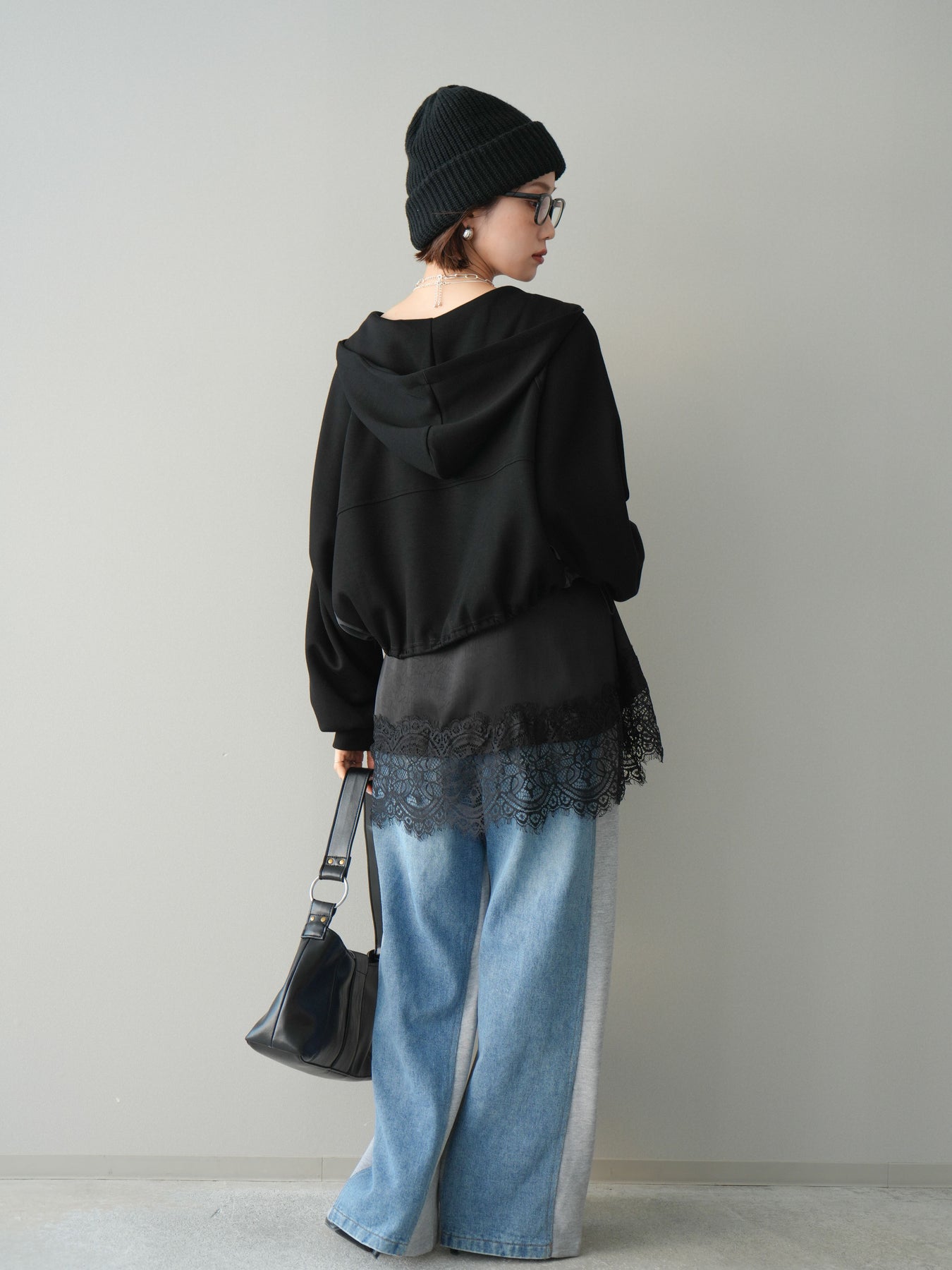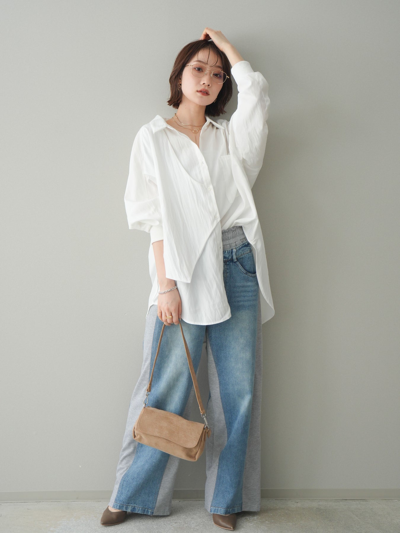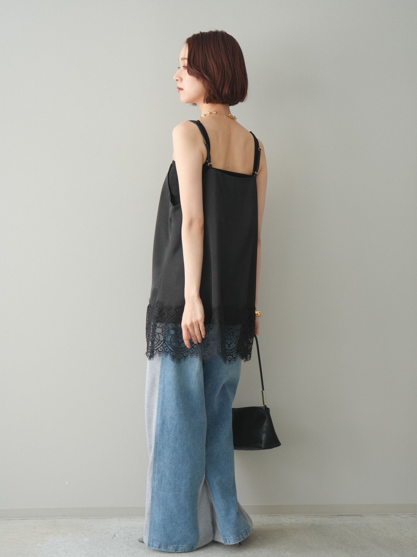 デニムとスウェット素材を切り替えた、カジュアルながらもデザイン性の高いスウェットパンツ。フロントはデニムライクな表情で程よくメリハリを持たせつつ、ウエストやサイドには柔らかなスウェット素材を使用し、リラックス感のある穿き心地に仕上げています。ウエストはイージー仕様でストレスフリーながら、シルエットはすっきりと見えるバランスに。ラフになりすぎず、トップス次第でカジュアルからきれいめまで幅広いスタイリングに対応する一本です。 ※ボトムス、キャミソール(インナー)以外の商品は一律でインナーは付属していません。