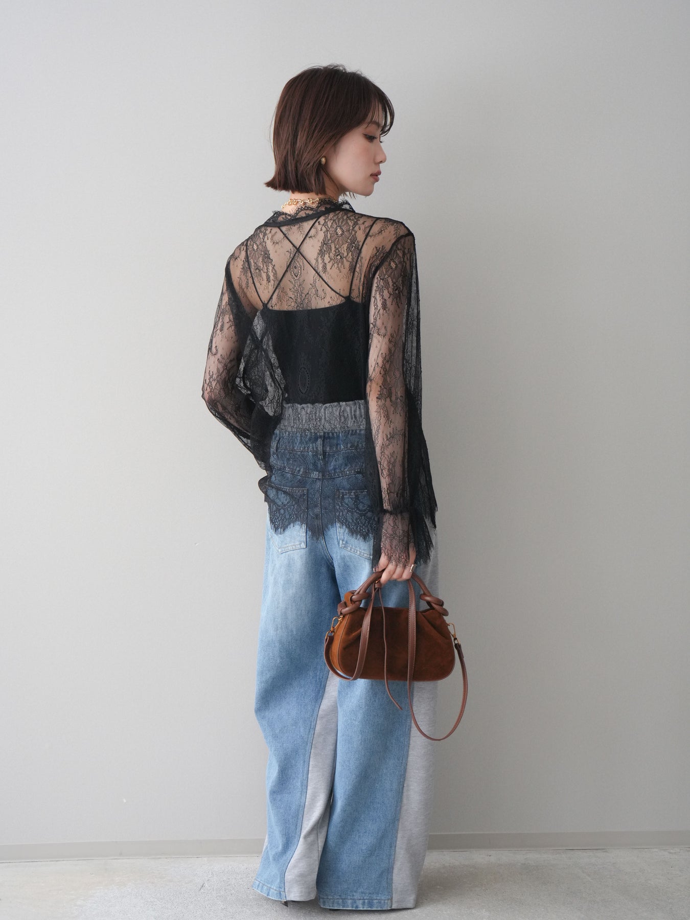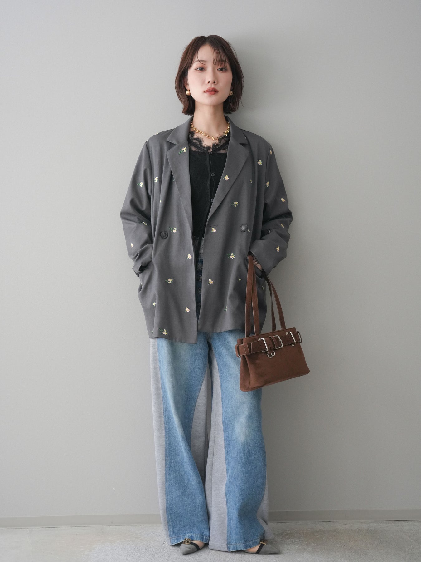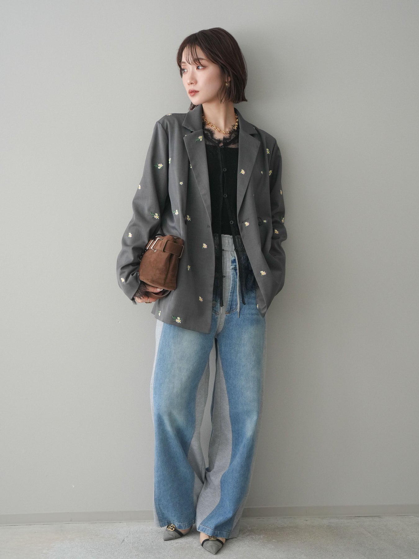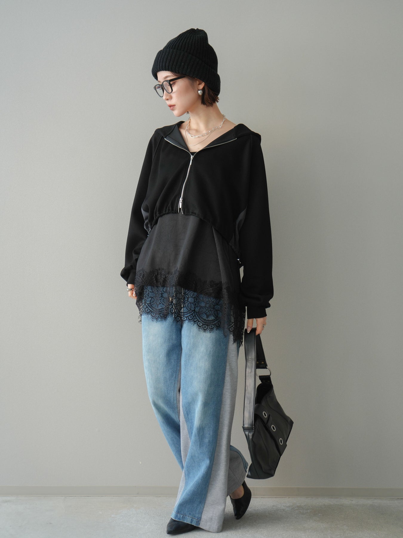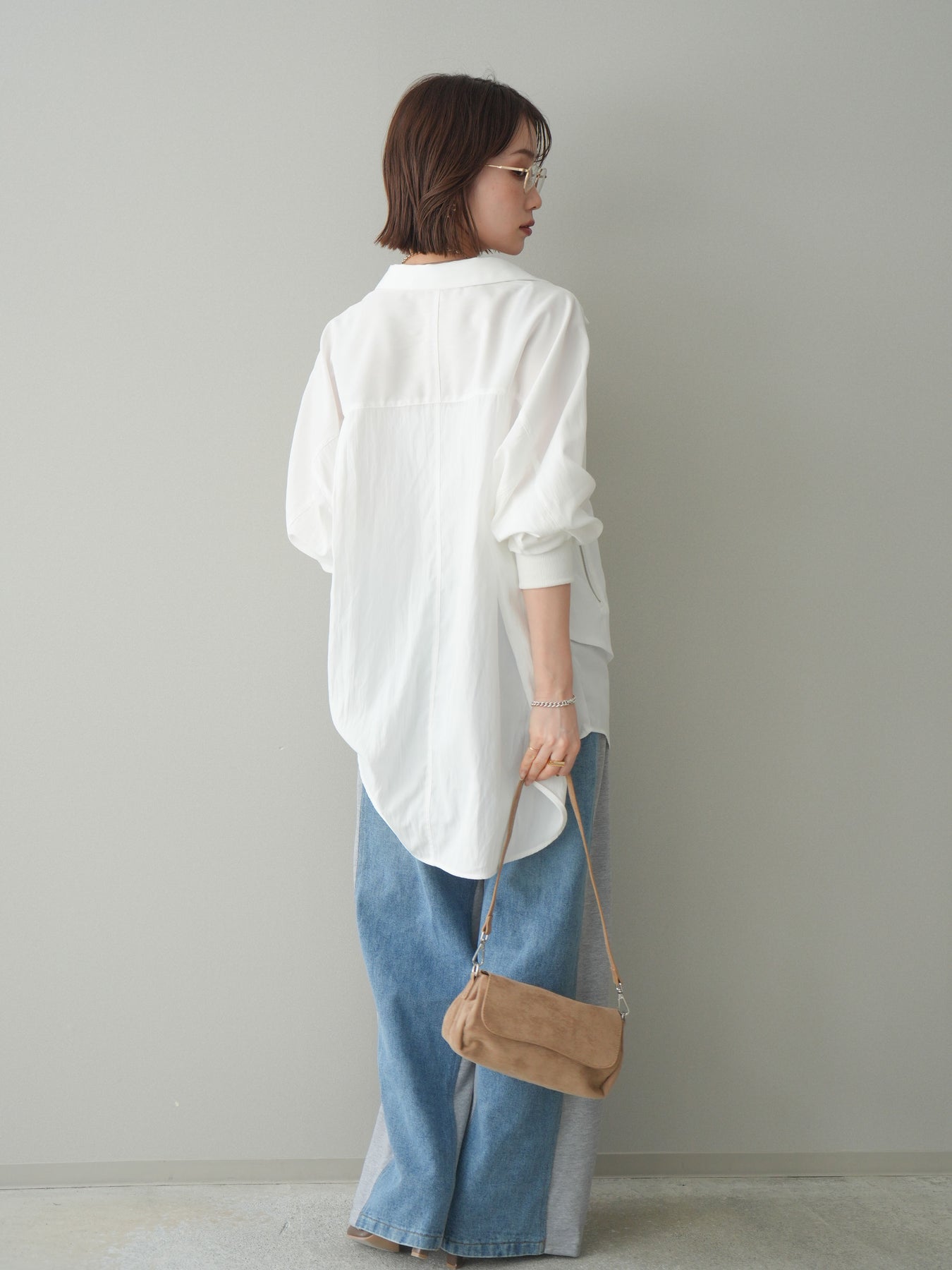 デニムとスウェット素材を切り替えた、カジュアルながらもデザイン性の高いスウェットパンツ。フロントはデニムライクな表情で程よくメリハリを持たせつつ、ウエストやサイドには柔らかなスウェット素材を使用し、リラックス感のある穿き心地に仕上げています。ウエストはイージー仕様でストレスフリーながら、シルエットはすっきりと見えるバランスに。ラフになりすぎず、トップス次第でカジュアルからきれいめまで幅広いスタイリングに対応する一本です。 ※ボトムス、キャミソール(インナー)以外の商品は一律でインナーは付属していません。