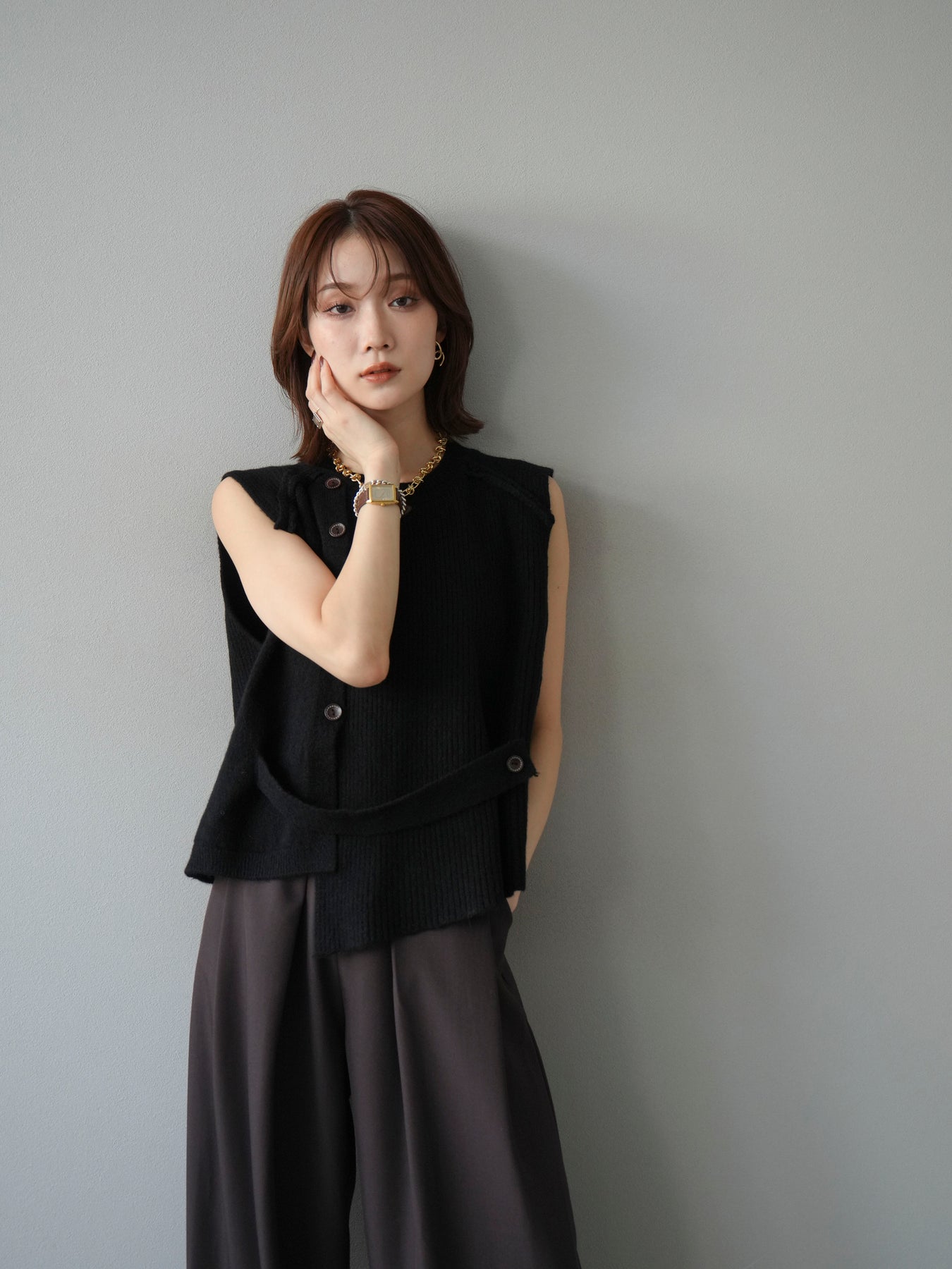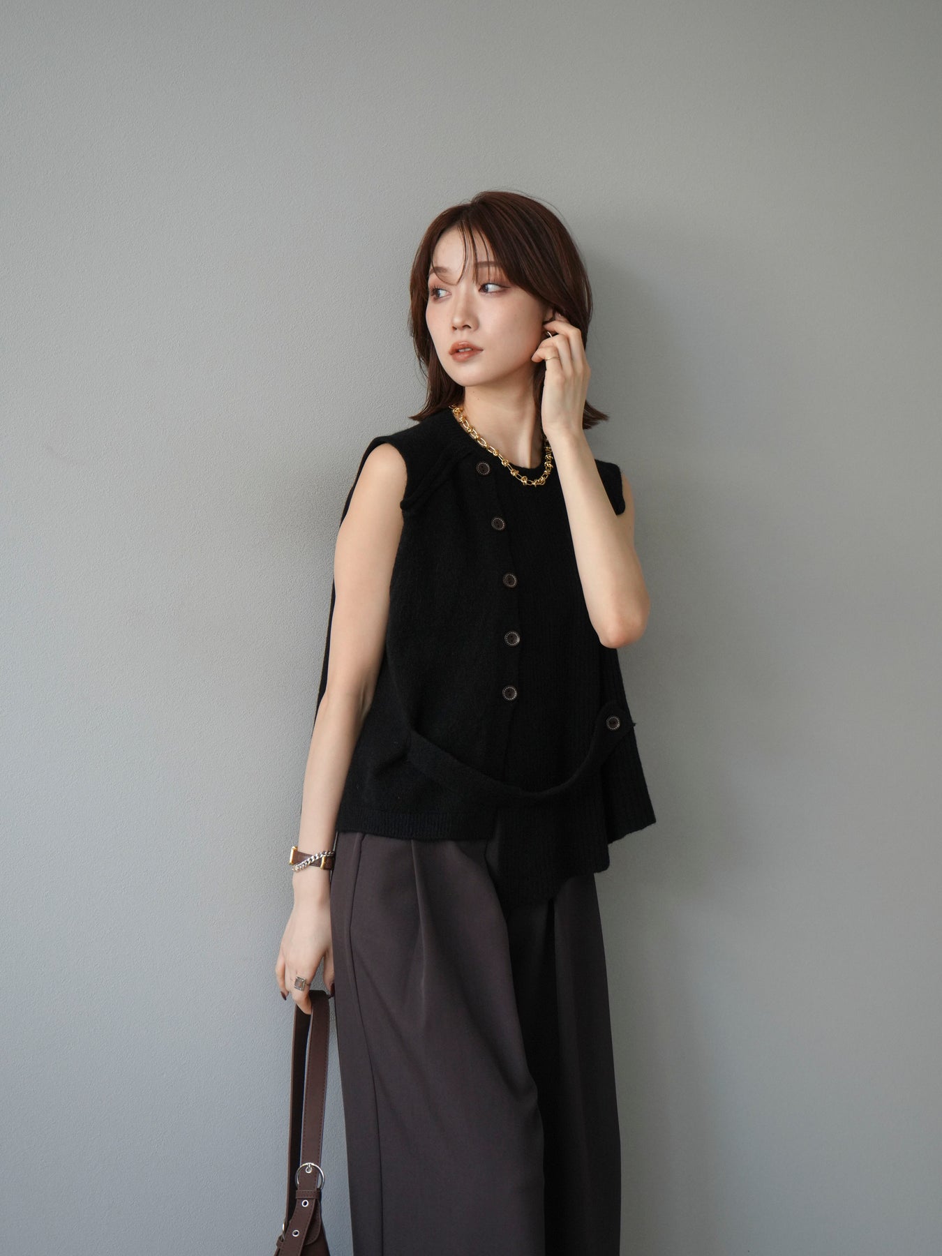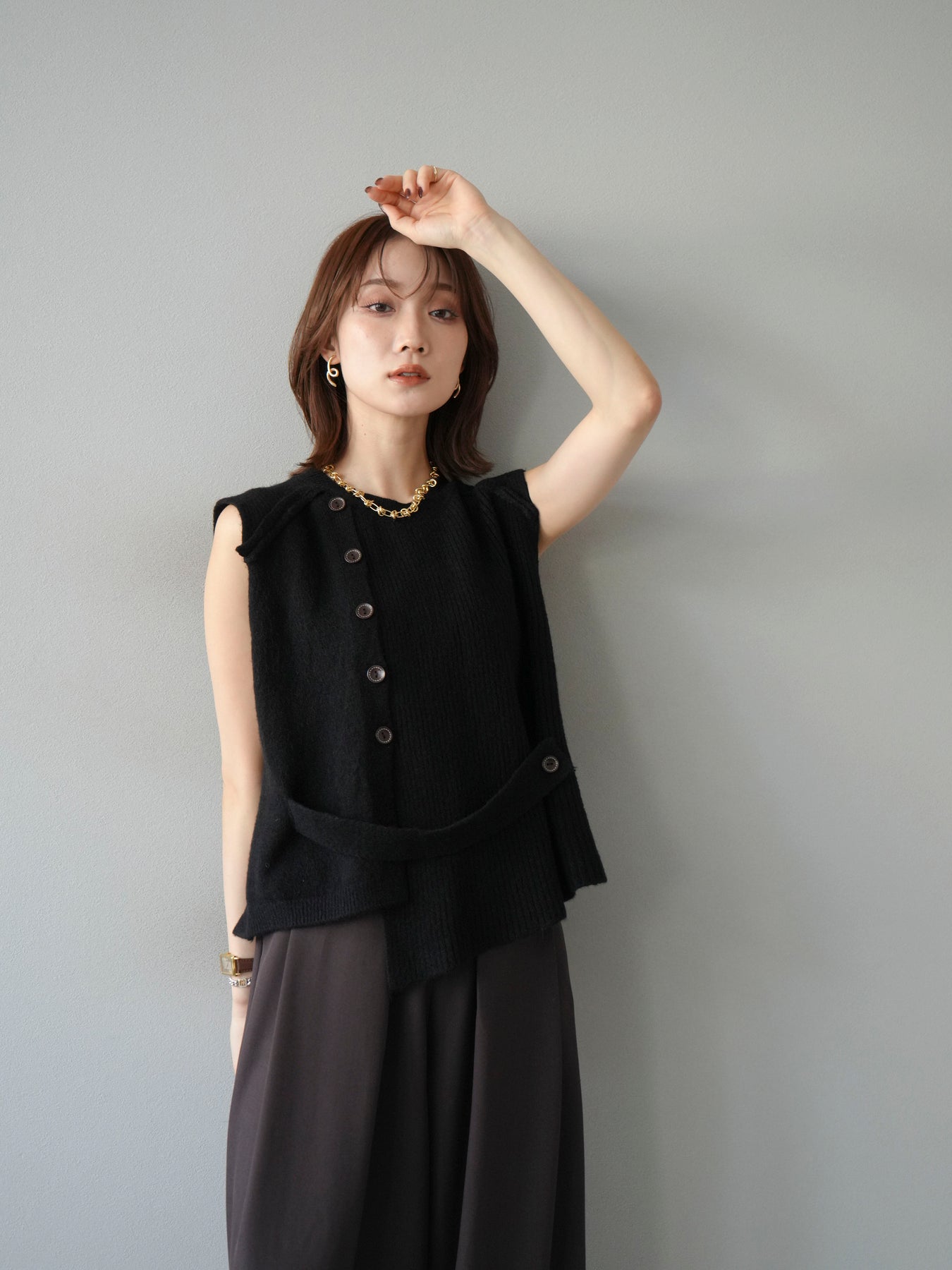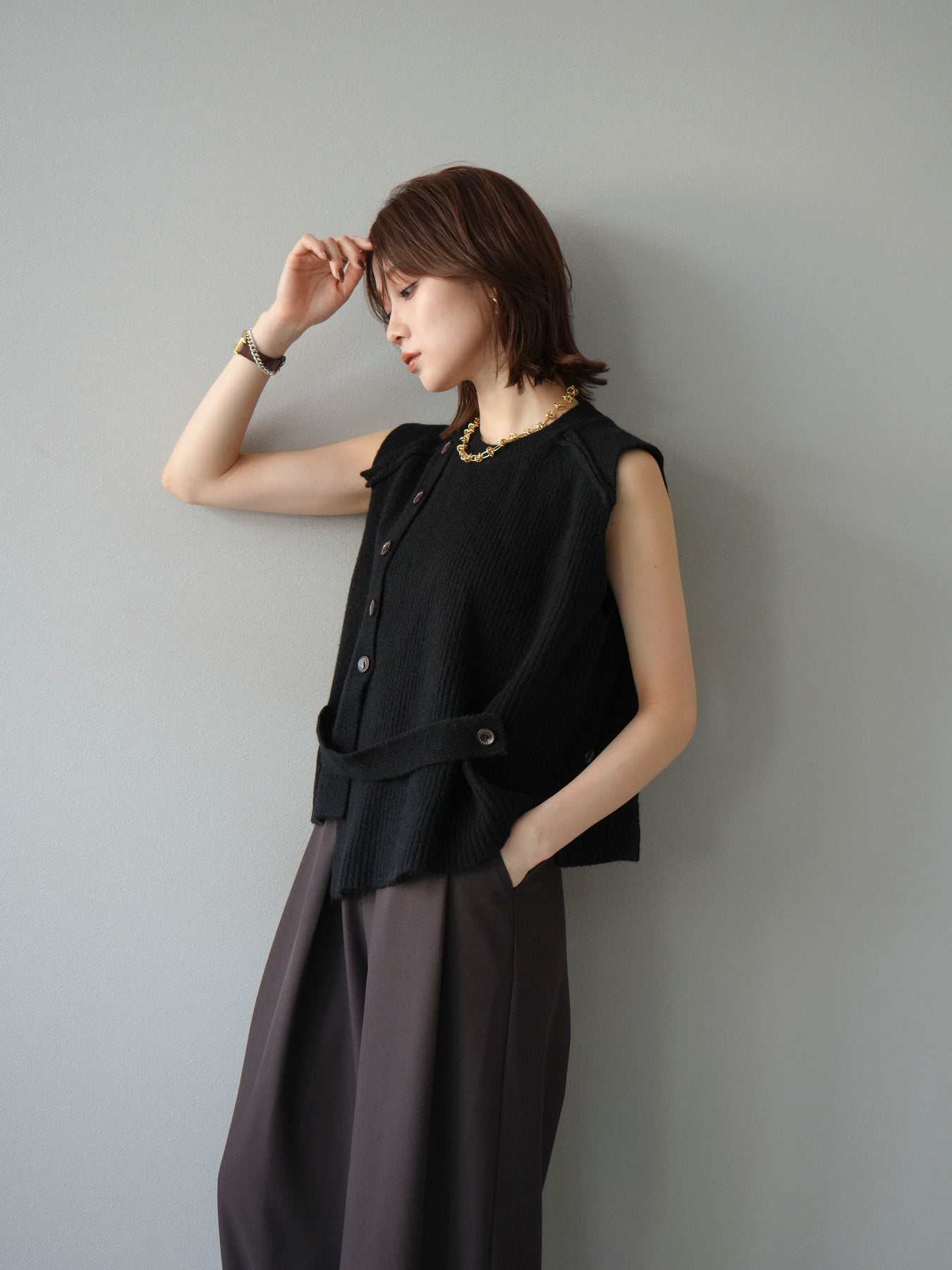 サイドとショルダーにボタンディテールをあしらった、レイヤードデザインのニットベスト。リブ編みの縦ラインがすっきりとした印象を与え、シンプルながらもこなれた雰囲気に仕上げます。程よい厚みでインナーにシャツやカットソーを合わせやすく、季節の変わり目にも活躍。ボタンの開閉によってシルエットの変化も楽しめる一枚です。ベーシックながら着映えする万能アイテム。 ※ボトムス、キャミソール(インナー)以外の商品は一律でインナーは付属していません。