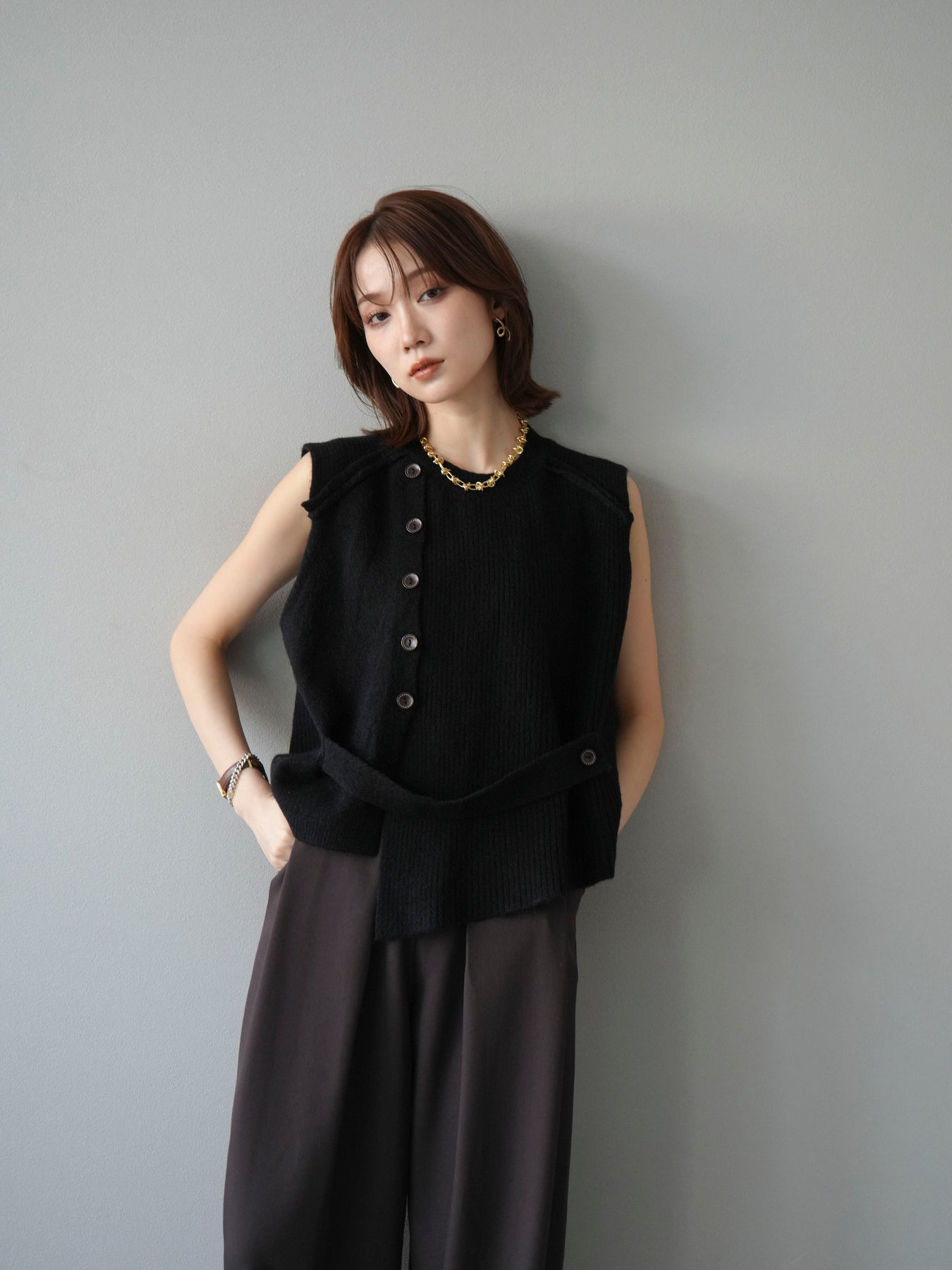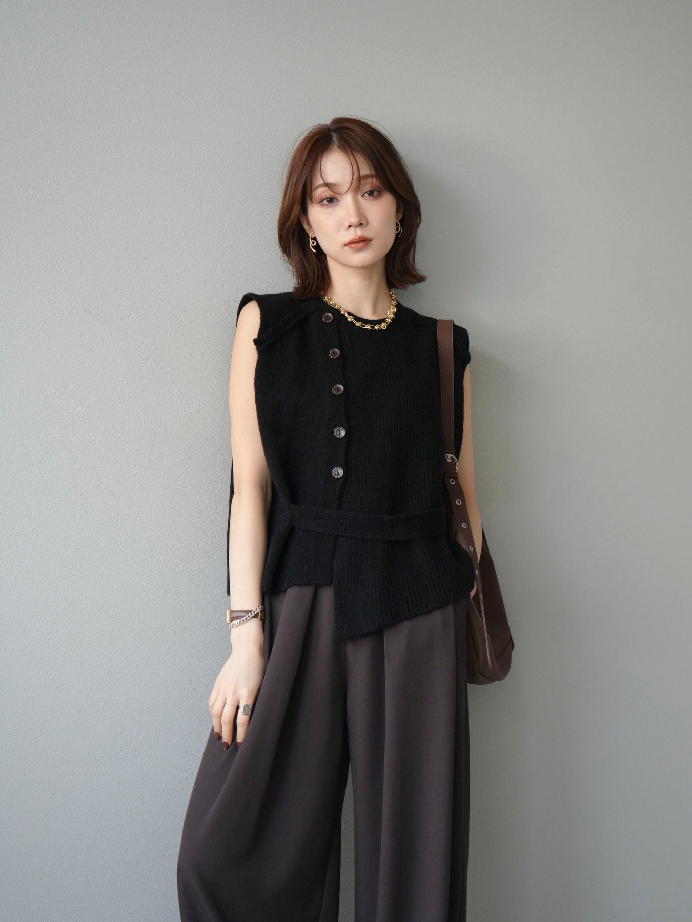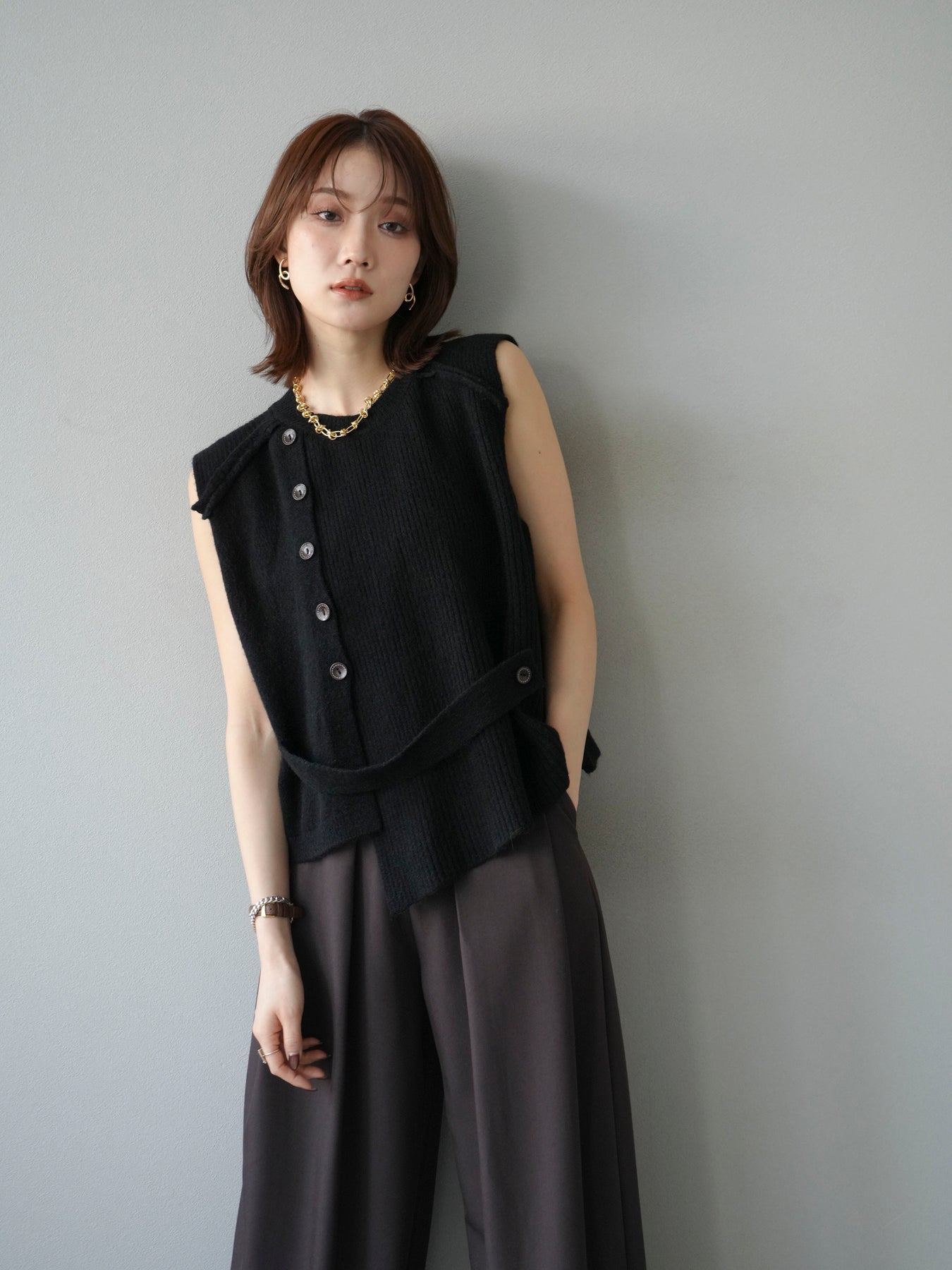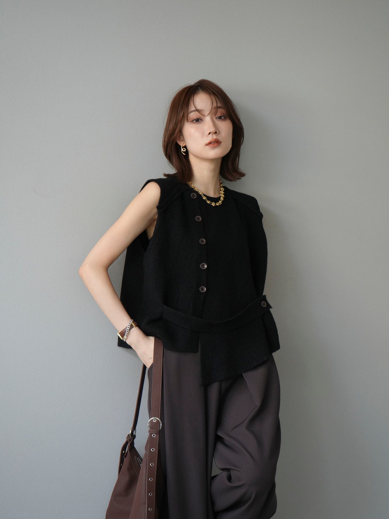 サイドとショルダーにボタンディテールをあしらった、レイヤードデザインのニットベスト。リブ編みの縦ラインがすっきりとした印象を与え、シンプルながらもこなれた雰囲気に仕上げます。程よい厚みでインナーにシャツやカットソーを合わせやすく、季節の変わり目にも活躍。ボタンの開閉によってシルエットの変化も楽しめる一枚です。ベーシックながら着映えする万能アイテム。 ※ボトムス、キャミソール(インナー)以外の商品は一律でインナーは付属していません。