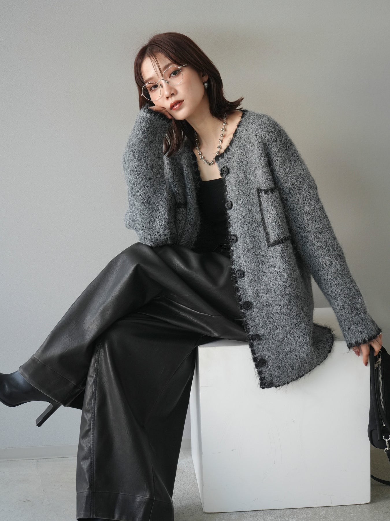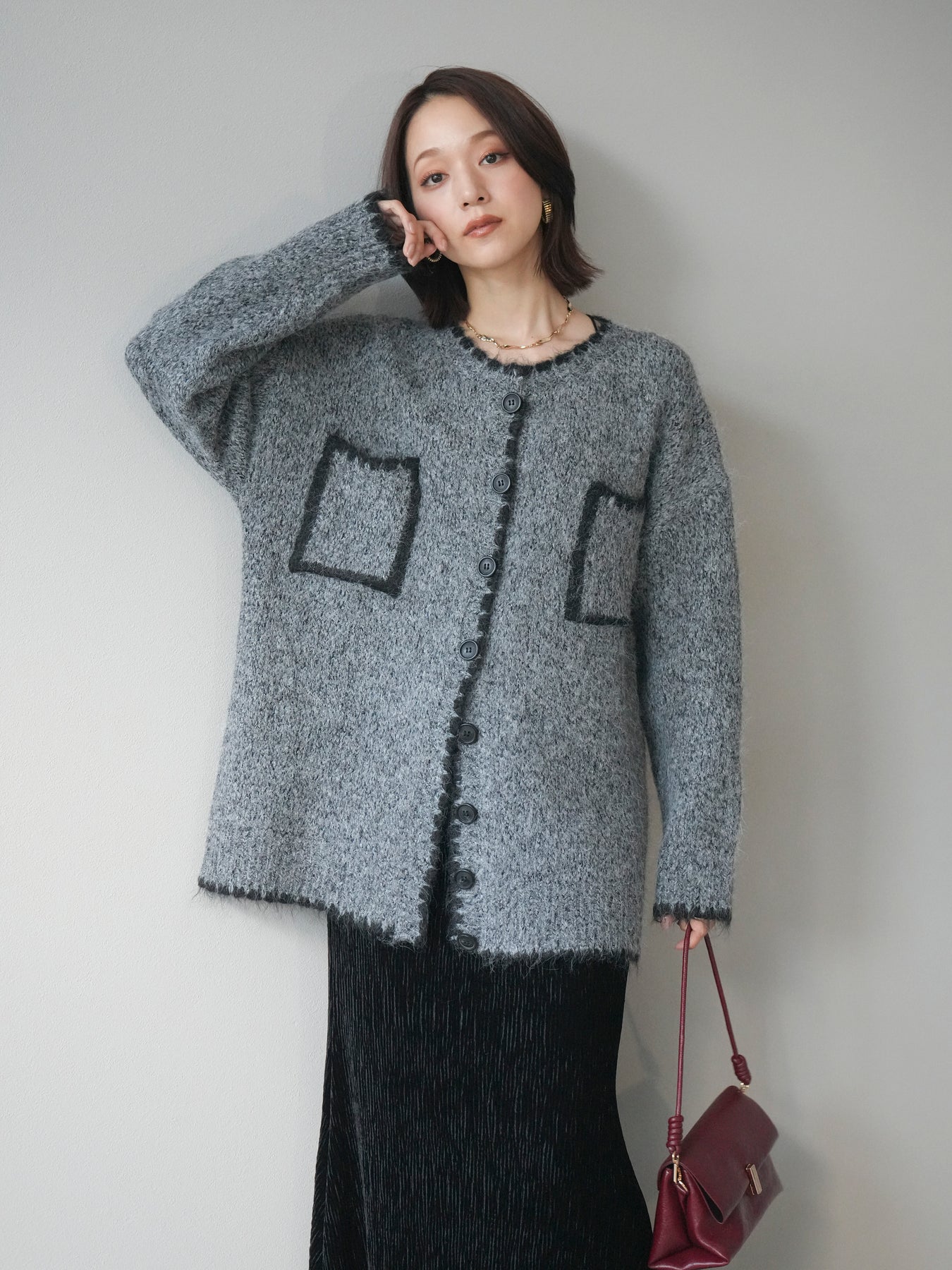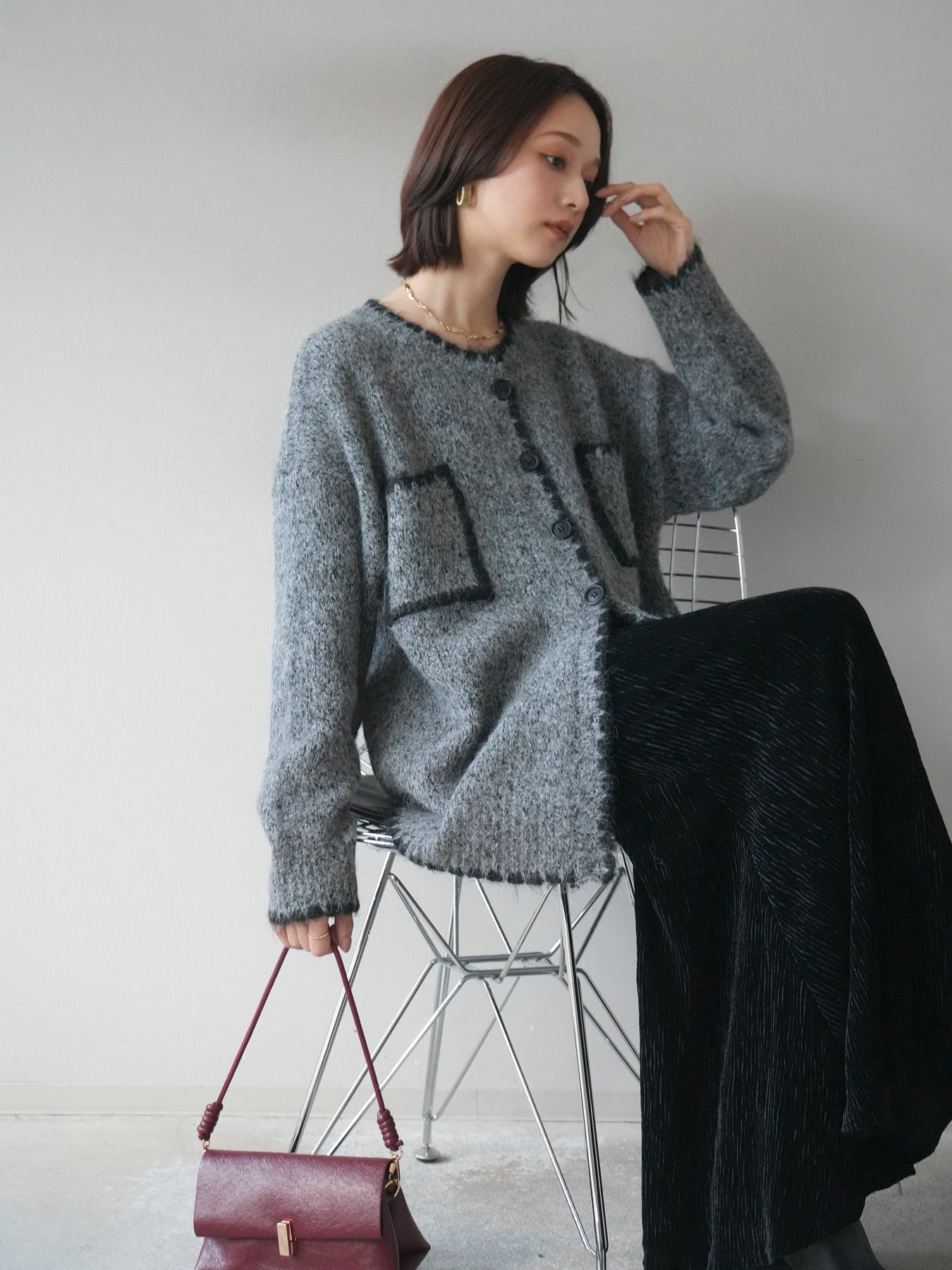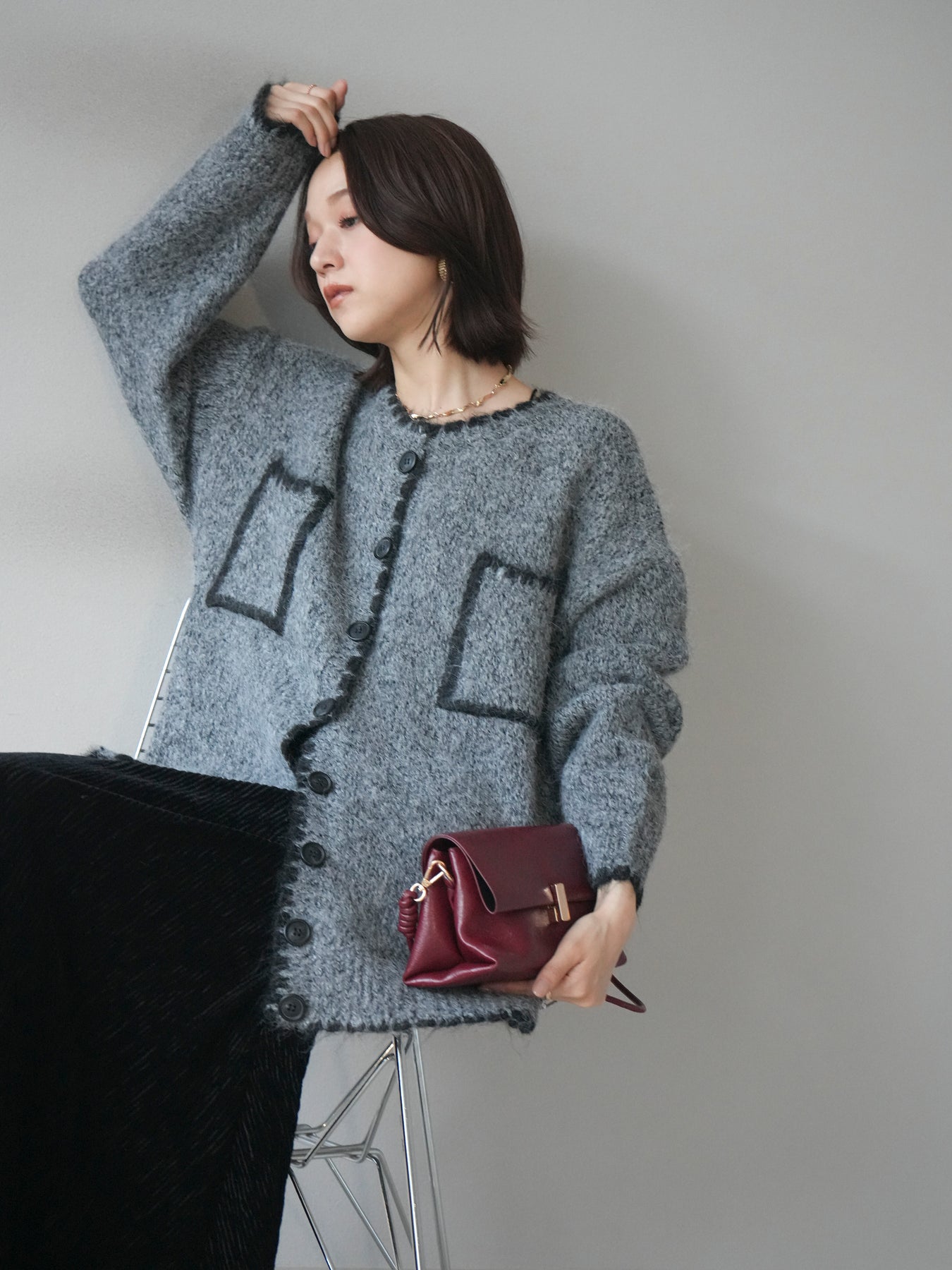 ふんわりとした素材感にハンドステッチ風のラインをあしらったニットカーディガン。 優しい風合いと大きめのポケットデザインが、リラックス感の中にも温もりを感じさせます。 裾や袖口に施されたステッチがアクセントになり、シンプルなコーディネートにも立体感をプラス。 ゆったりとしたシルエットで、ニットやシャツの上からもさらっと羽織れるバランス感。 デイリーに取り入れやすく、季節の変わり目のアウターとしても活躍する一枚です。 ※ボトムス、キャミソール(インナー)以外の商品は一律でインナーは付属していません。