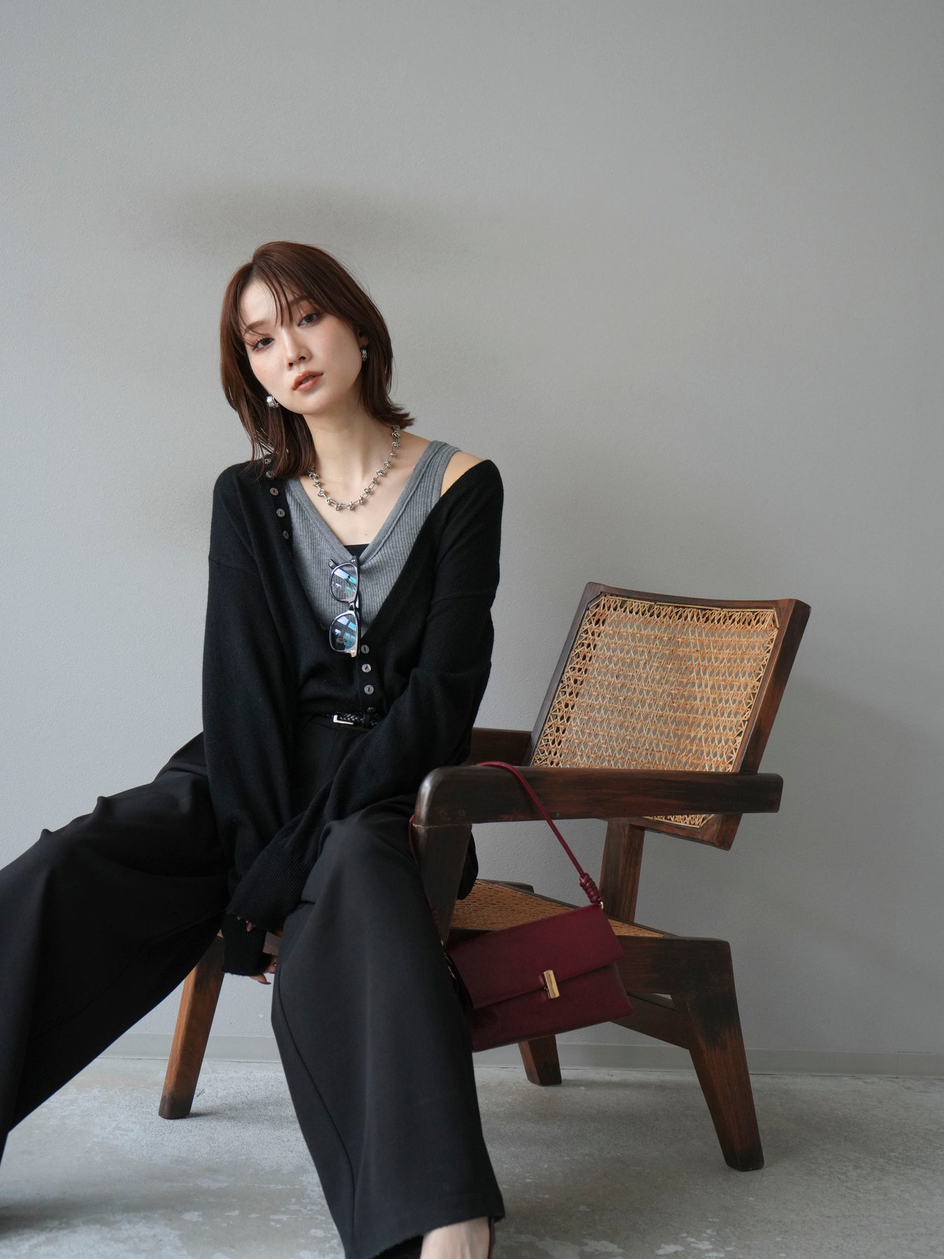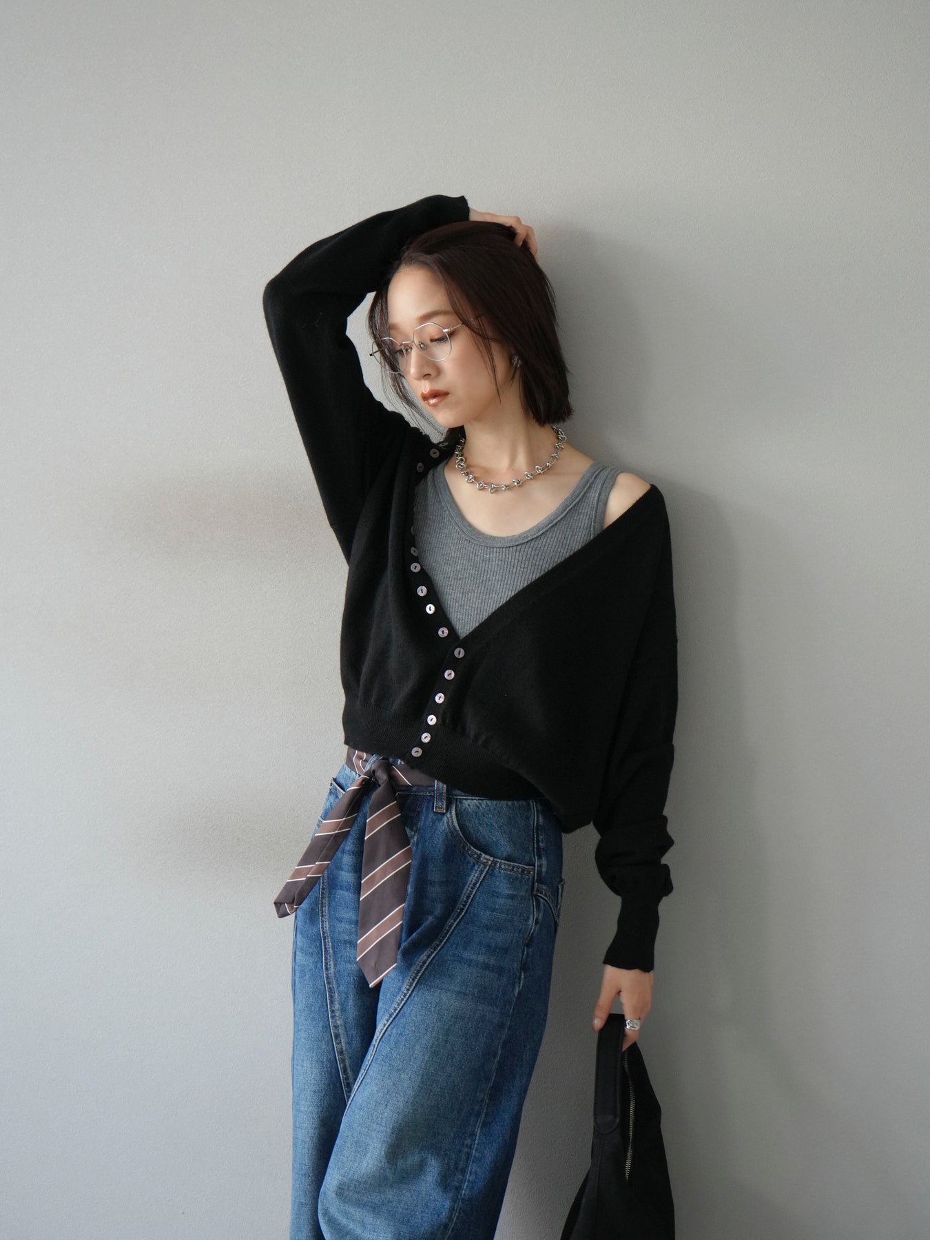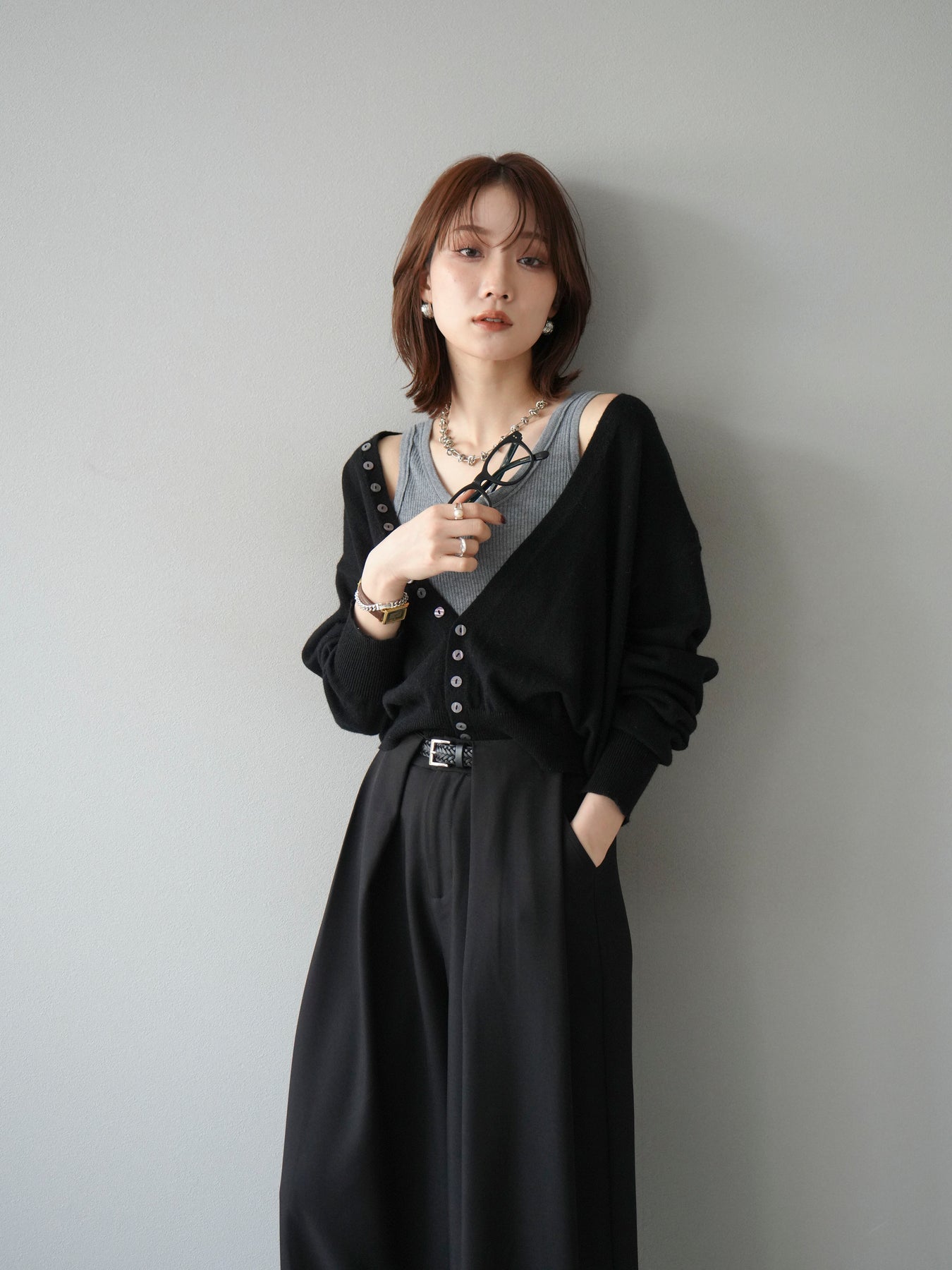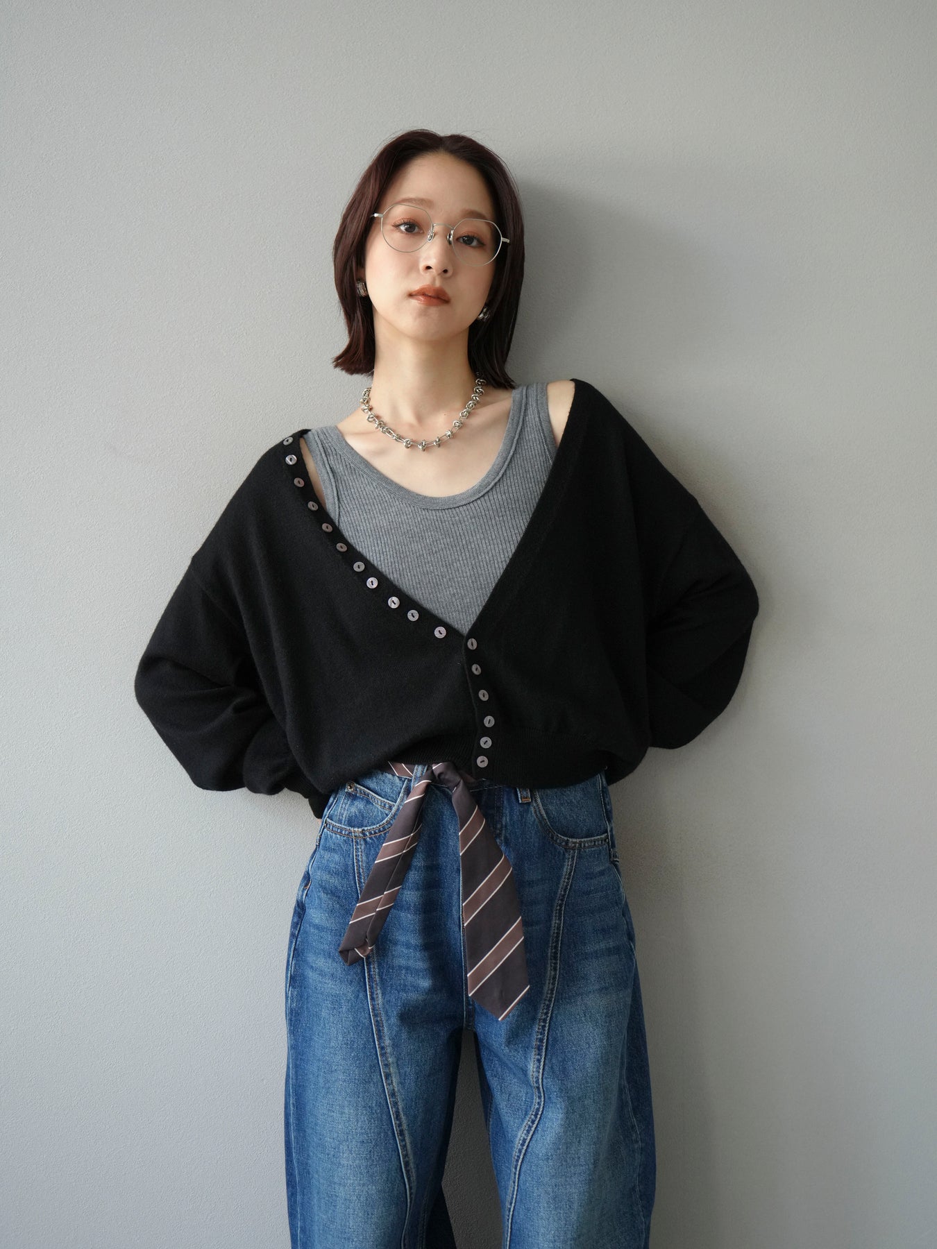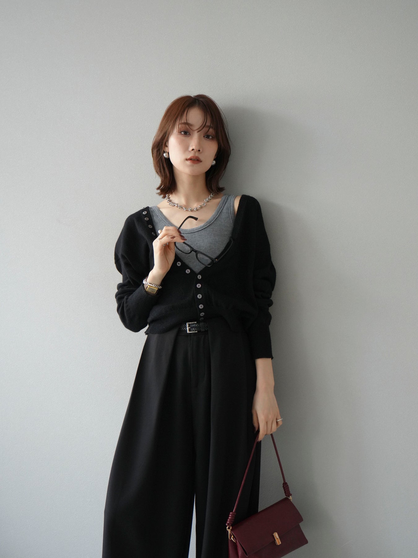 アシンメトリーに並んだボタンデザインが印象的なニットカーディガンと、リブタンクトップのセットアイテム。程よくゆとりのあるカーディガンは、デコルテラインを美しく見せる深めのVネック仕様。タンクトップとレイヤードすることで抜け感のあるスタイリングが完成します。それぞれ単体でも着回しができ、季節を問わず活躍。デニムやスカートなど、幅広いアイテムと相性の良い万能セットです。 ※ボトムス、キャミソール(インナー)以外の商品は一律でインナーは付属していません。
