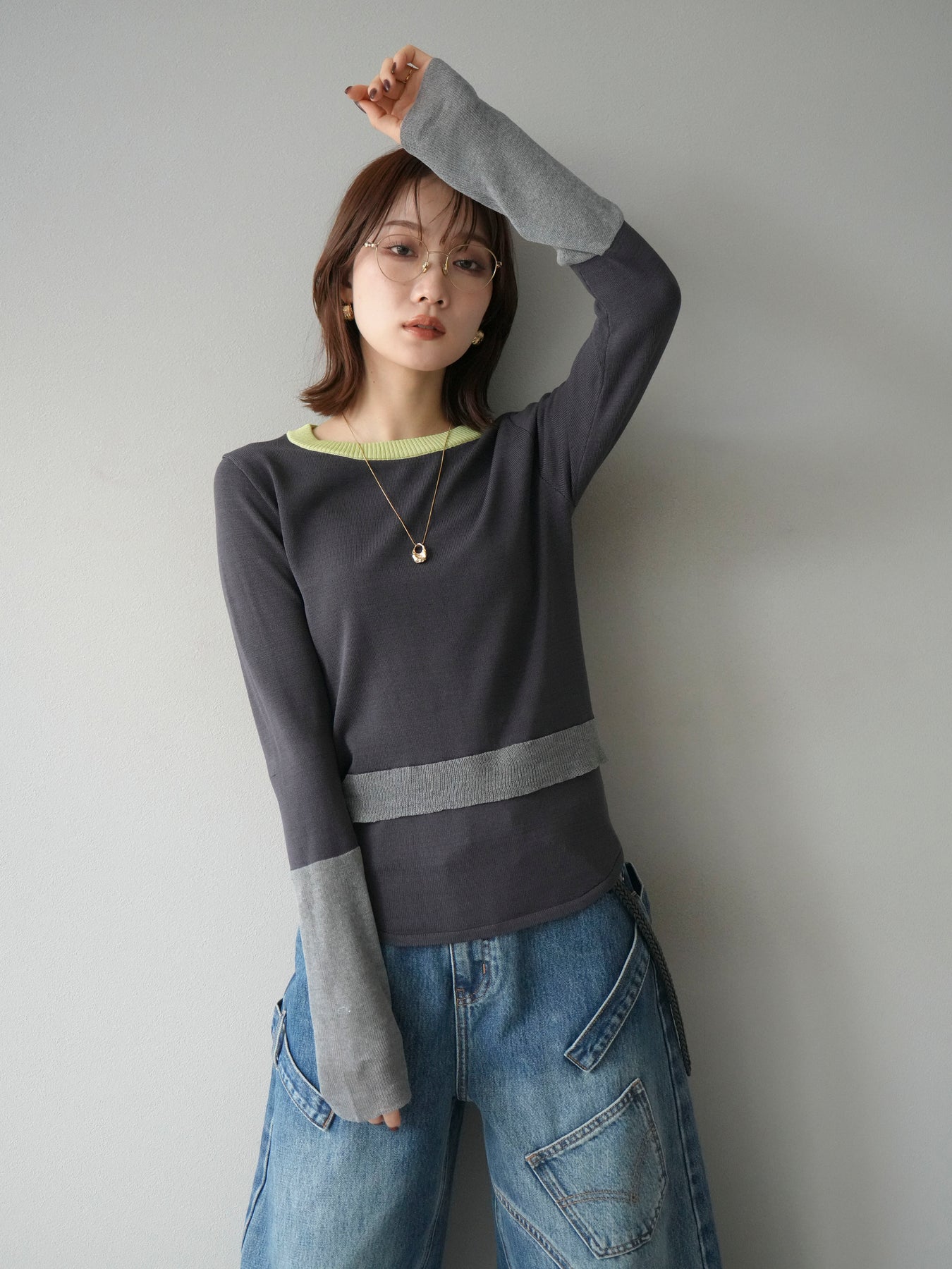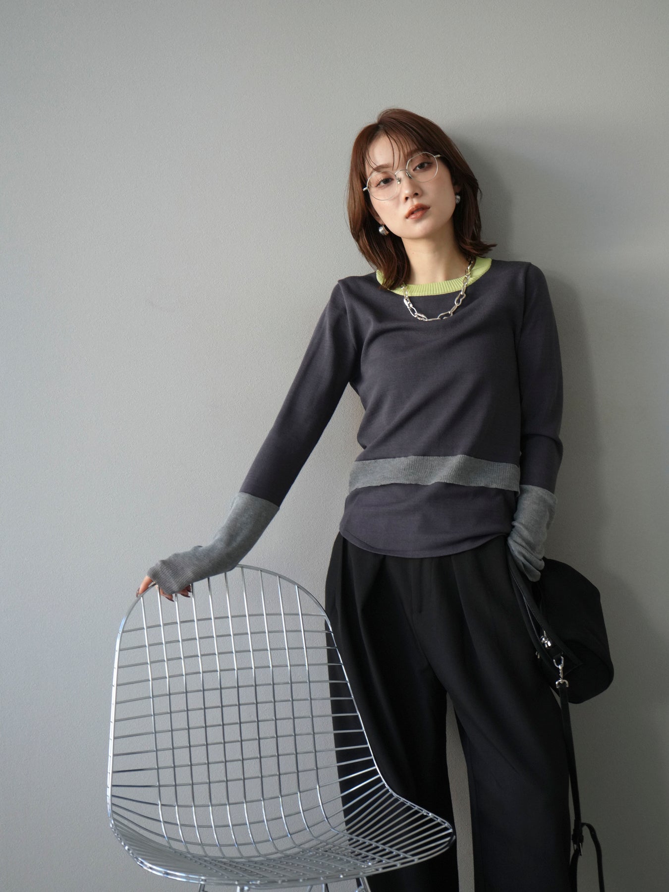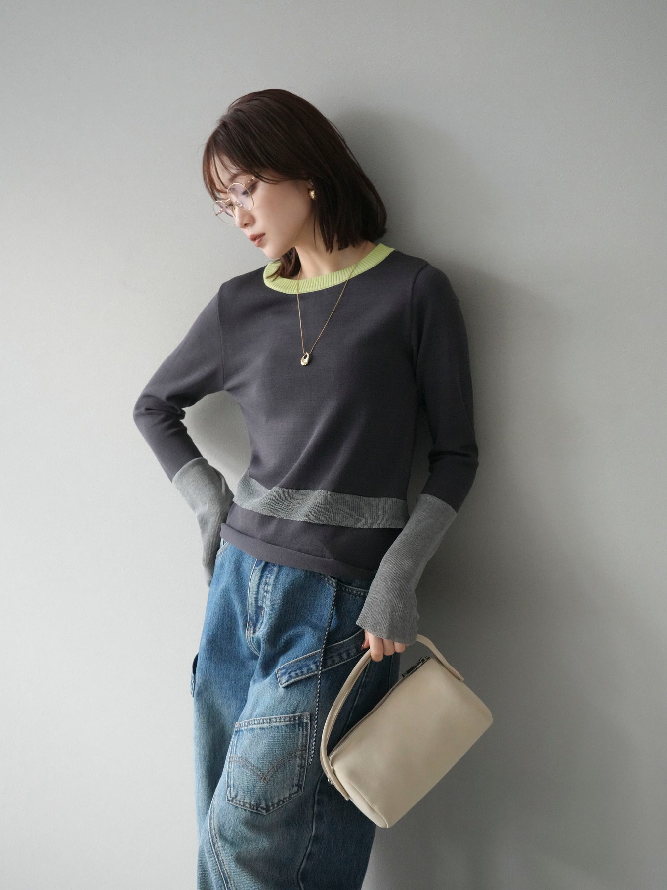 異素材の切り替えと配色デザインが目を引くニットトップス。シンプルなシルエットにさりげないアクセントを加え、1枚で着映えする仕上がりになっています。柔らかなニット素材とさらりとした異素材の組み合わせで快適な着心地を実現。程よくゆとりのあるシルエットは、パンツにもスカートにも合わせやすく、デイリーからオフィスカジュアルまで幅広く活躍します。ベーシックながらもモード感を取り入れられる万能な一着です。 ※ボトムス、キャミソール(インナー)以外の商品は一律でインナーは付属していません。