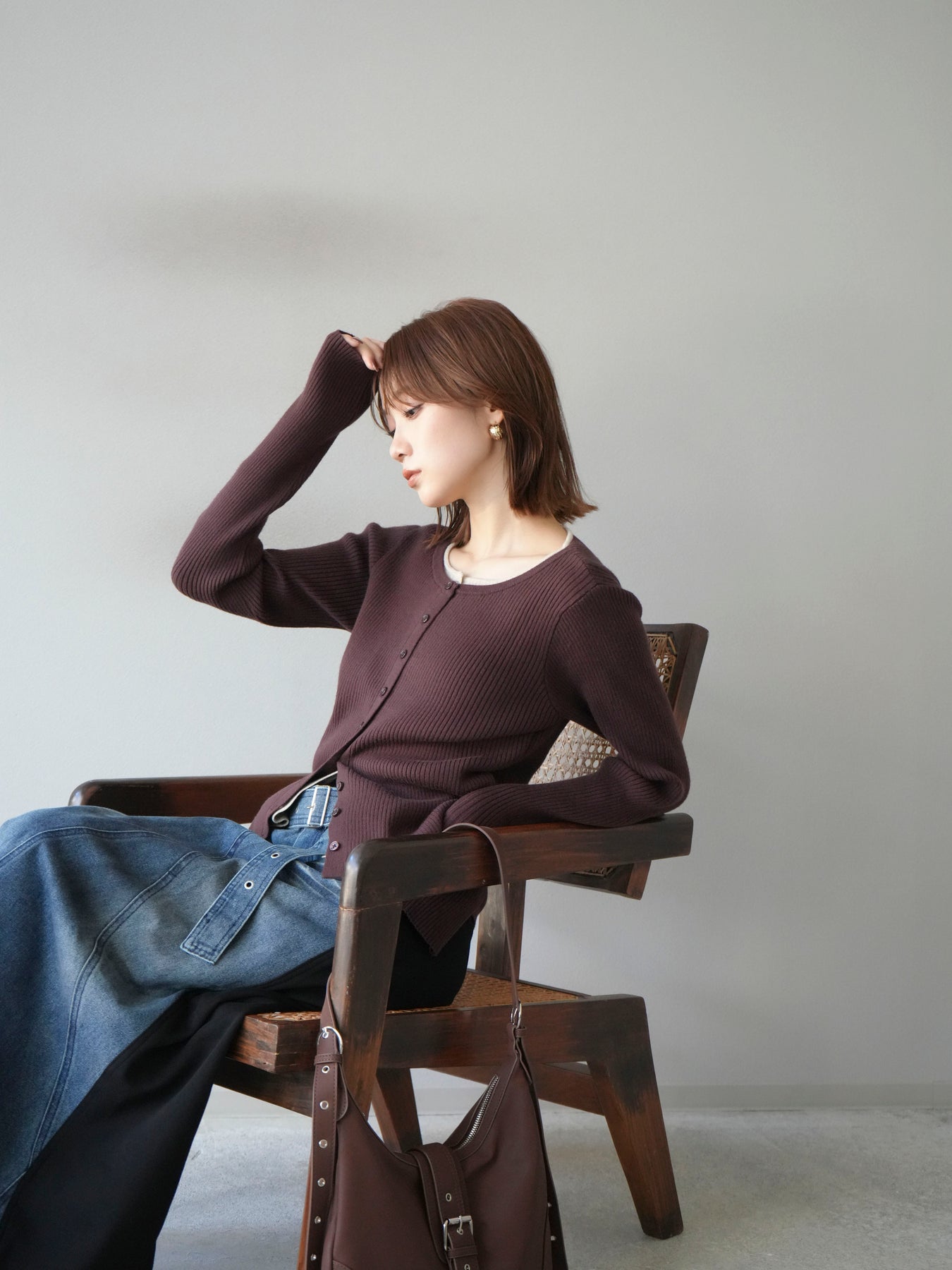 配色デザインが目を引くレイヤード風ニットカーディガン。首元や裾に施されたコントラストカラーがアクセントとなり、シンプルな中にモード感を漂わせます。細やかなリブ編みがすっきりとしたシルエットを生み出し、女性らしいラインをきれいに引き立てます。羽織りとしてはもちろん、ボタンを閉めてトップス風に着てもサマになり、デニムやスカートとの相性も抜群。デイリーコーデにこなれ感をプラスしてくれる万能アイテムです。 ※ボトムス、キャミソール(インナー)以外の商品は一律でインナーは付属していません。