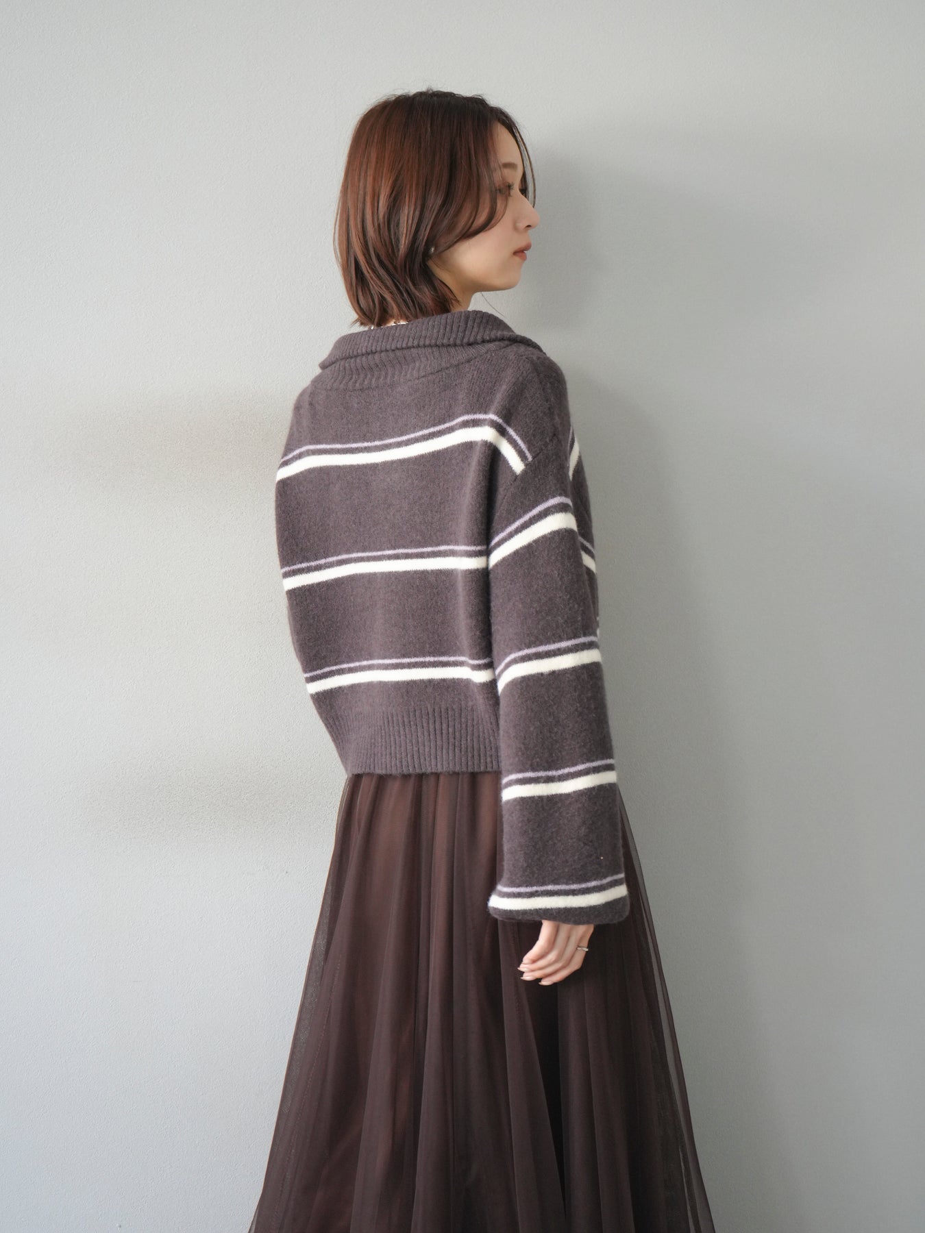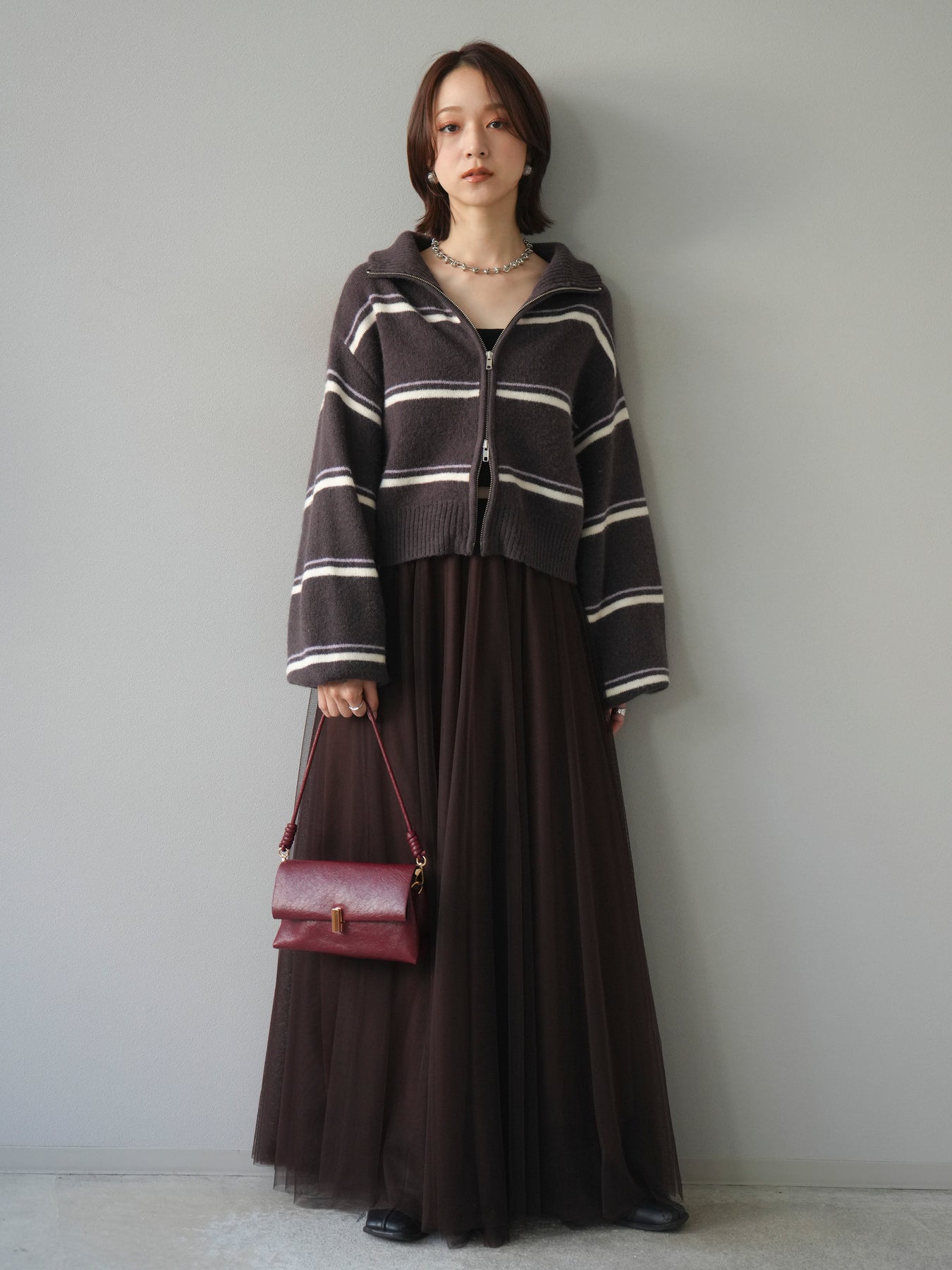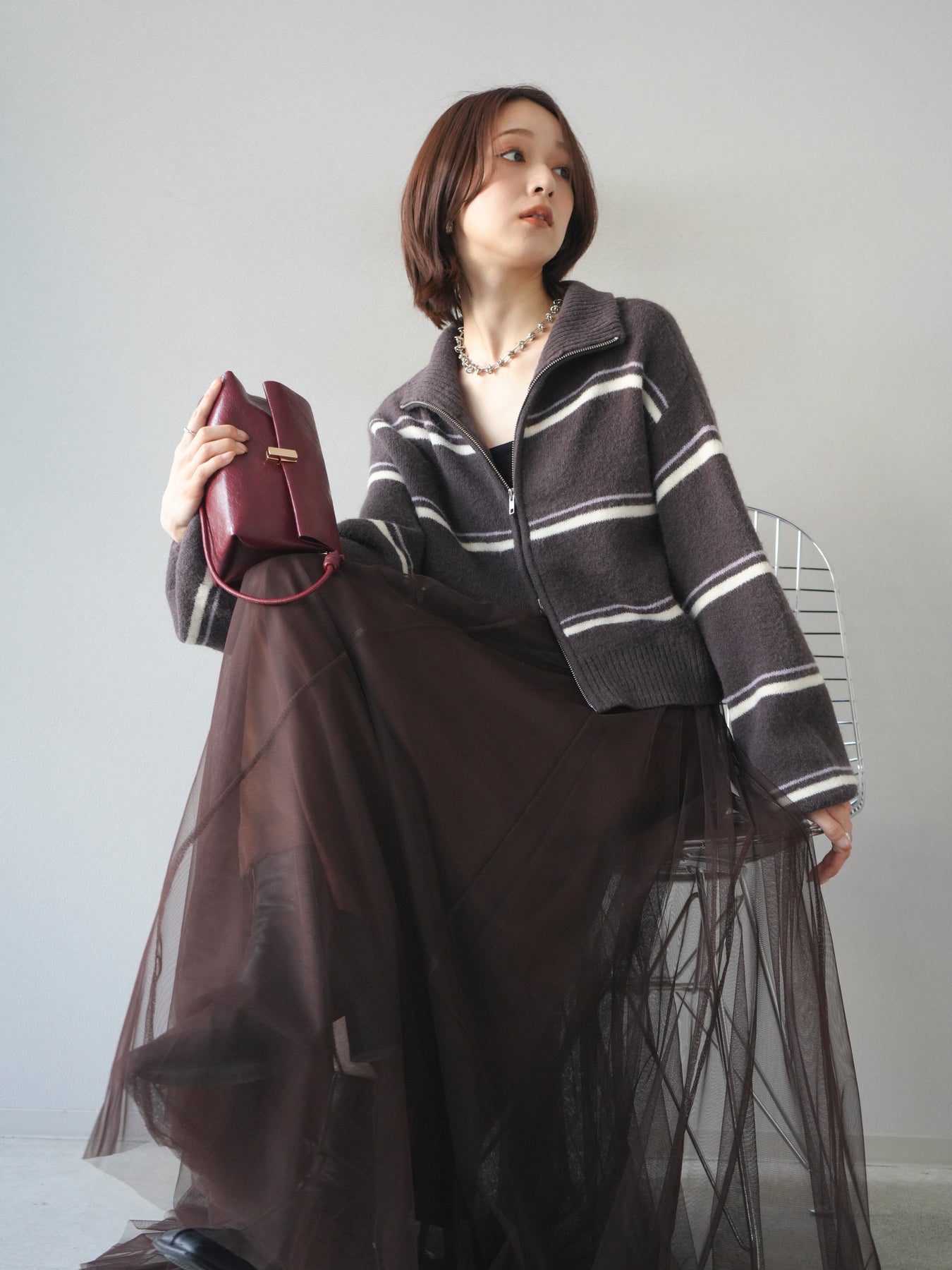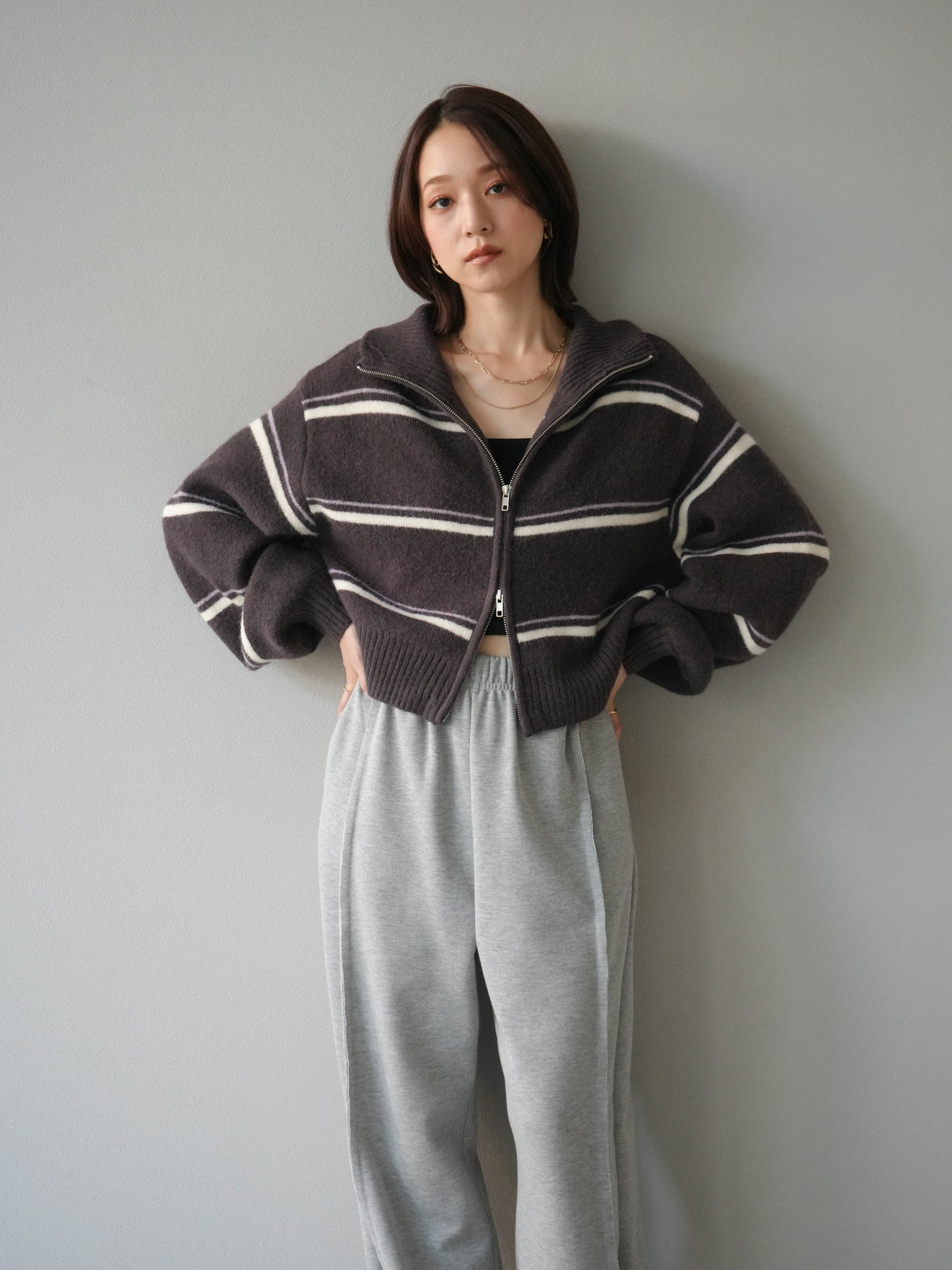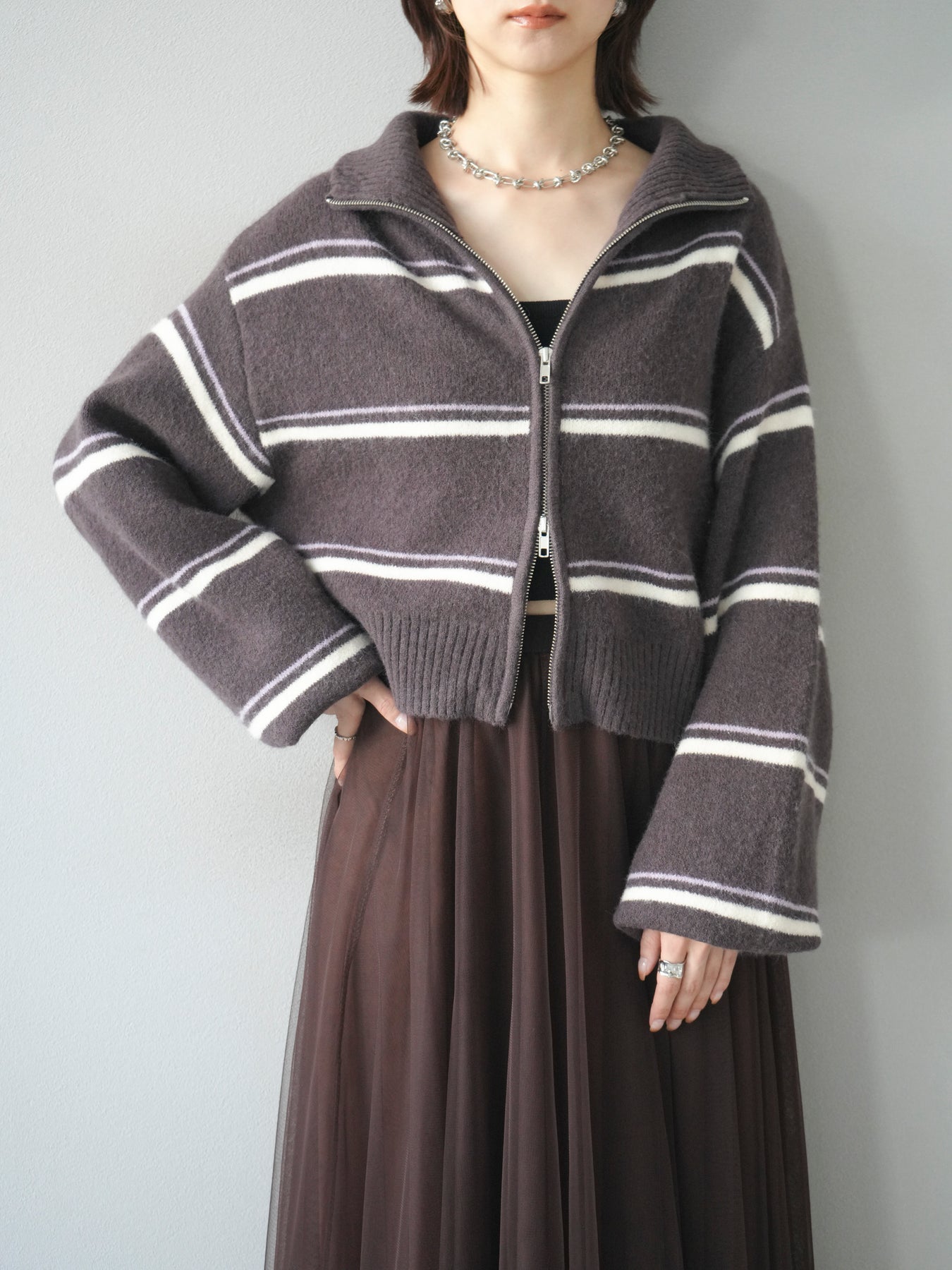 [予約]ボーダーZIPショートニットカーディガン/brown