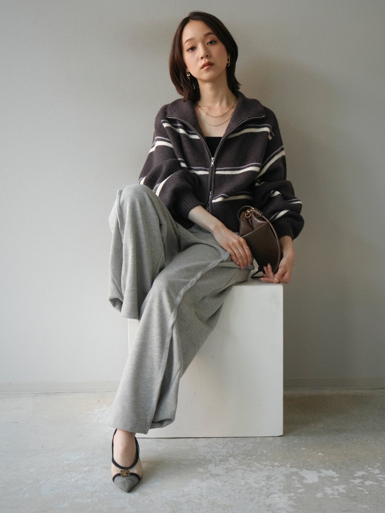 立体感のあるボーダー柄が目を引くジップカーディガン。やや短めの丈感で、スカートにもパンツにもバランスよく合わせられる一枚。ジップは上まで閉めてハイネック風にも着用可能で、着こなしに幅を持たせられます。ほんのり膨らみのあるスリーブが柔らかな印象をプラス。