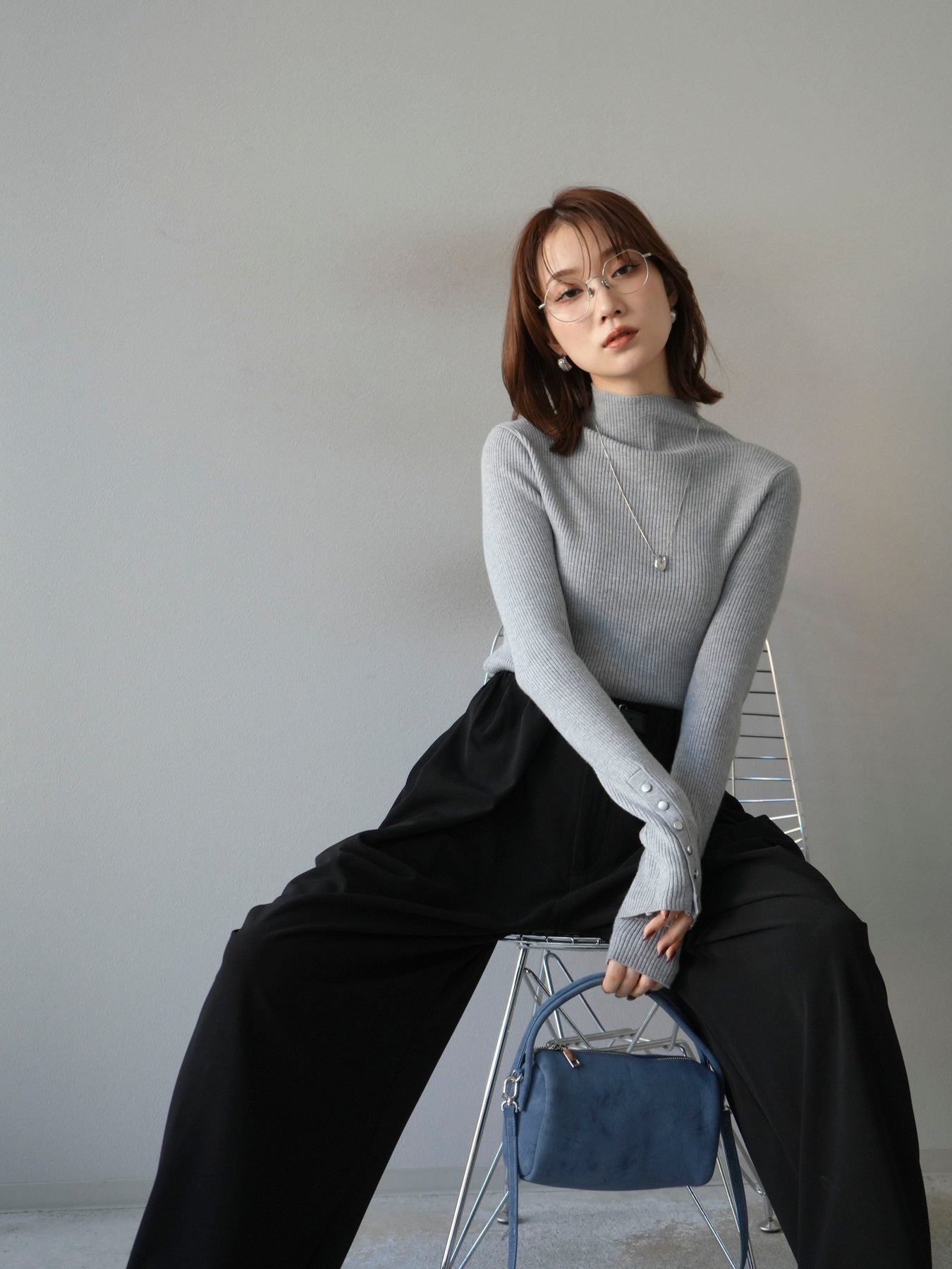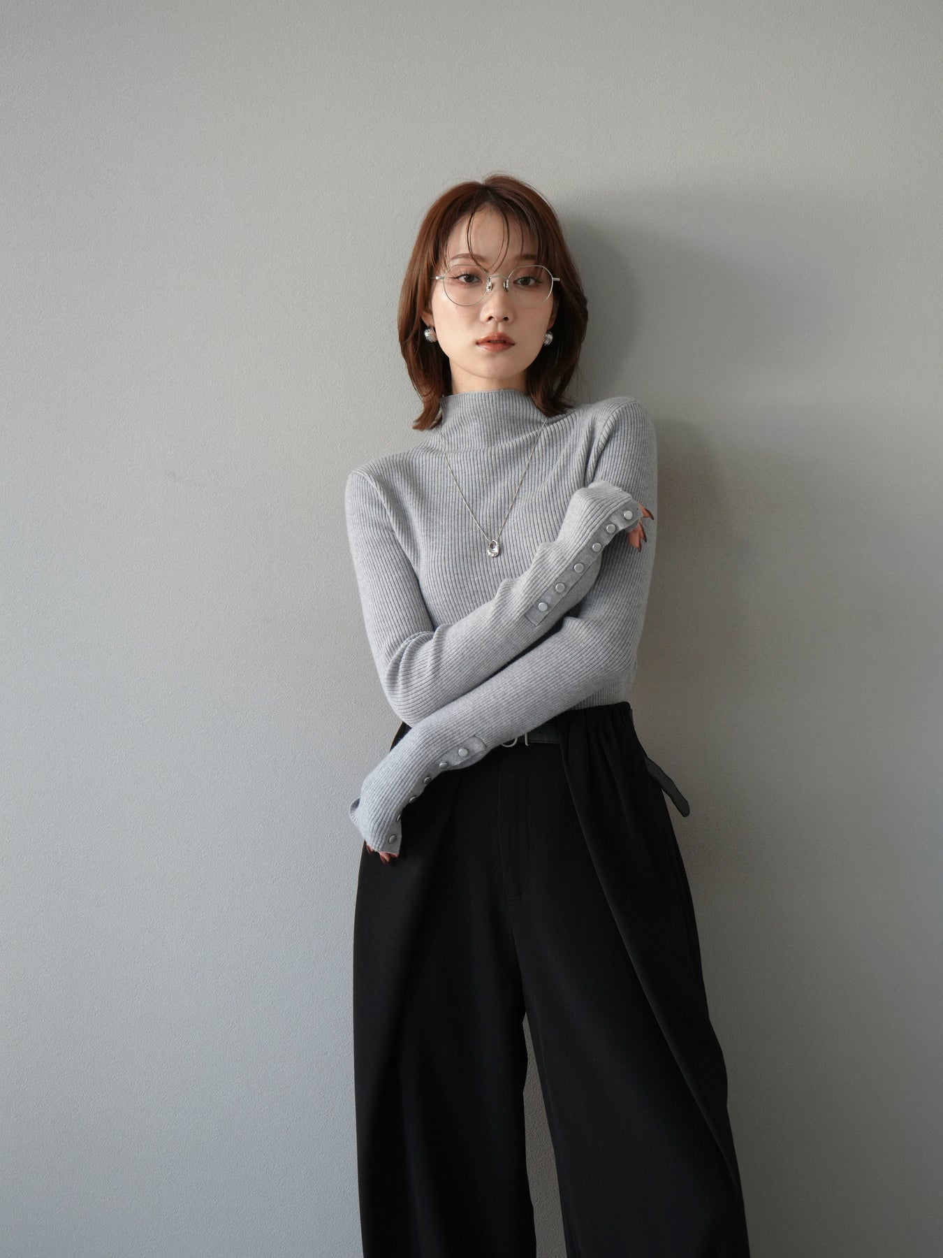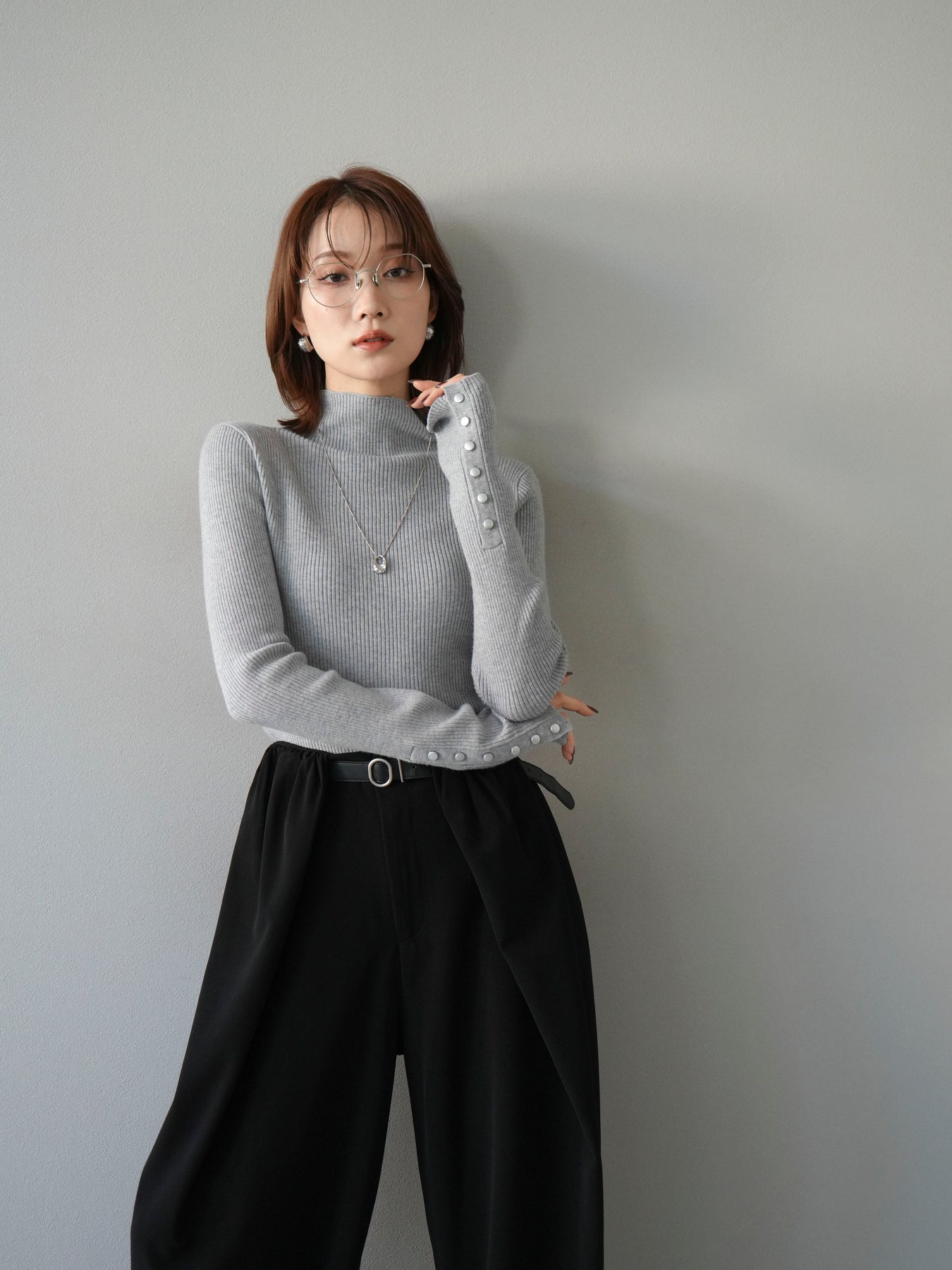 [予約]袖ボタンボトルネックリブニットトップス/杢グレー