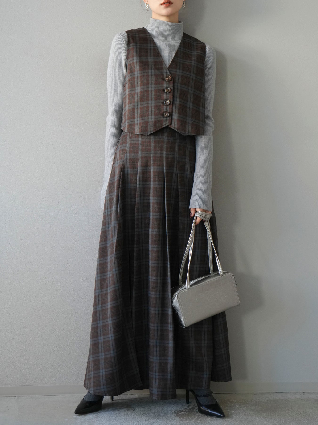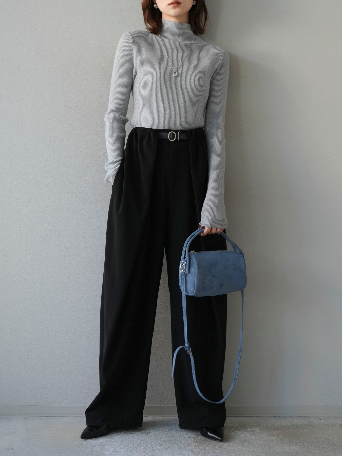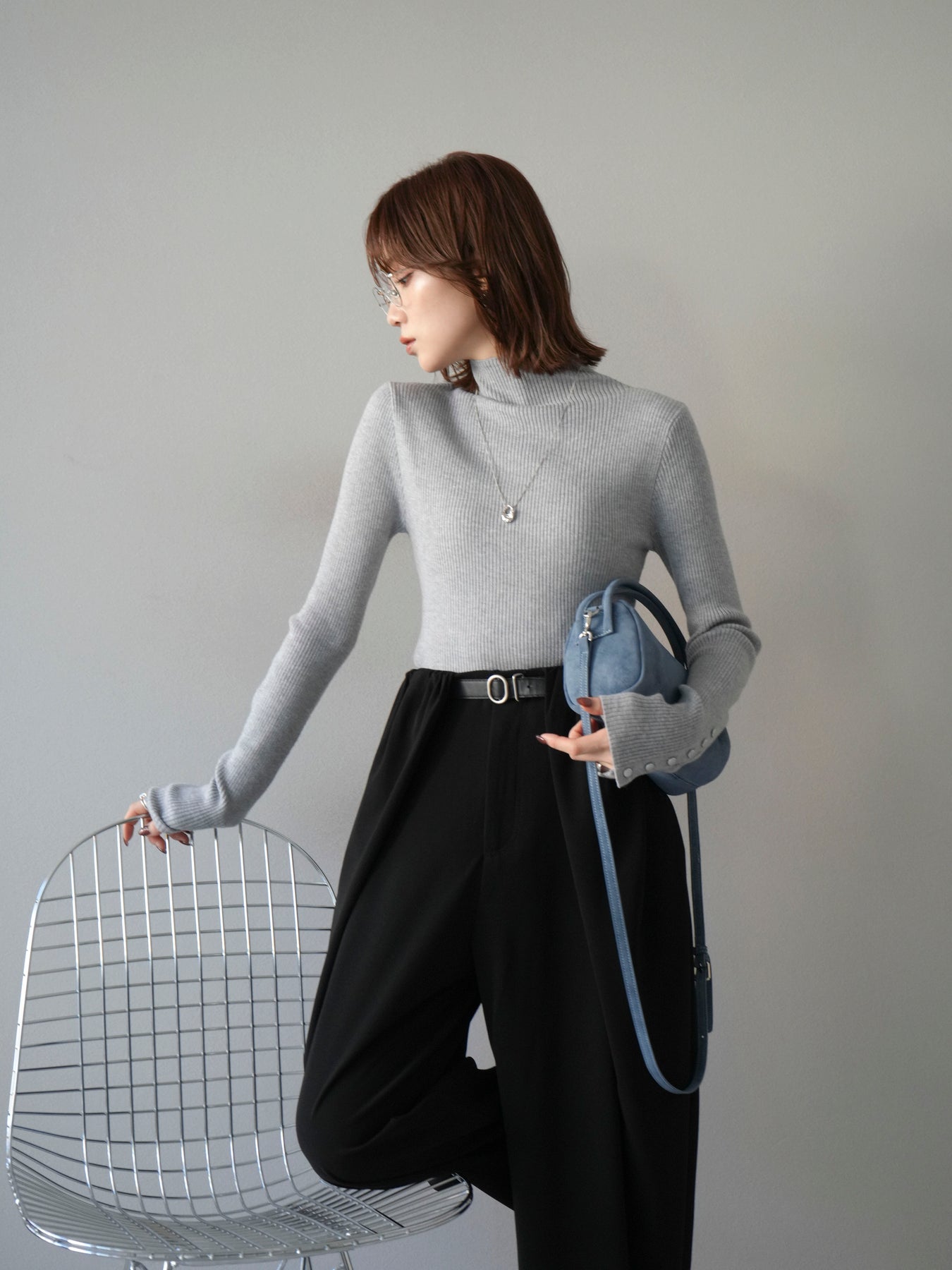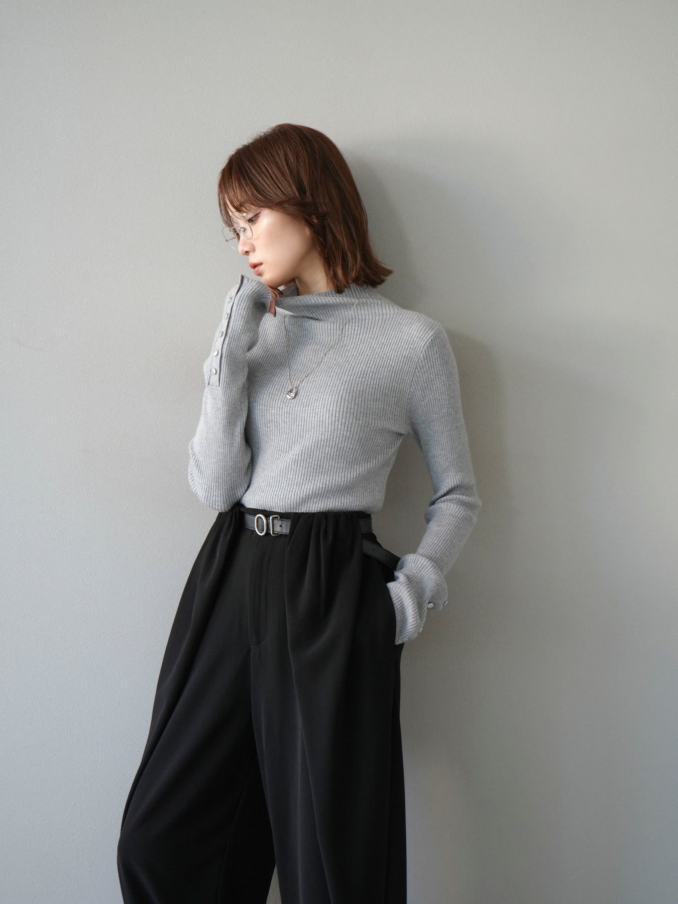 [予約]袖ボタンボトルネックリブニットトップス/杢グレー