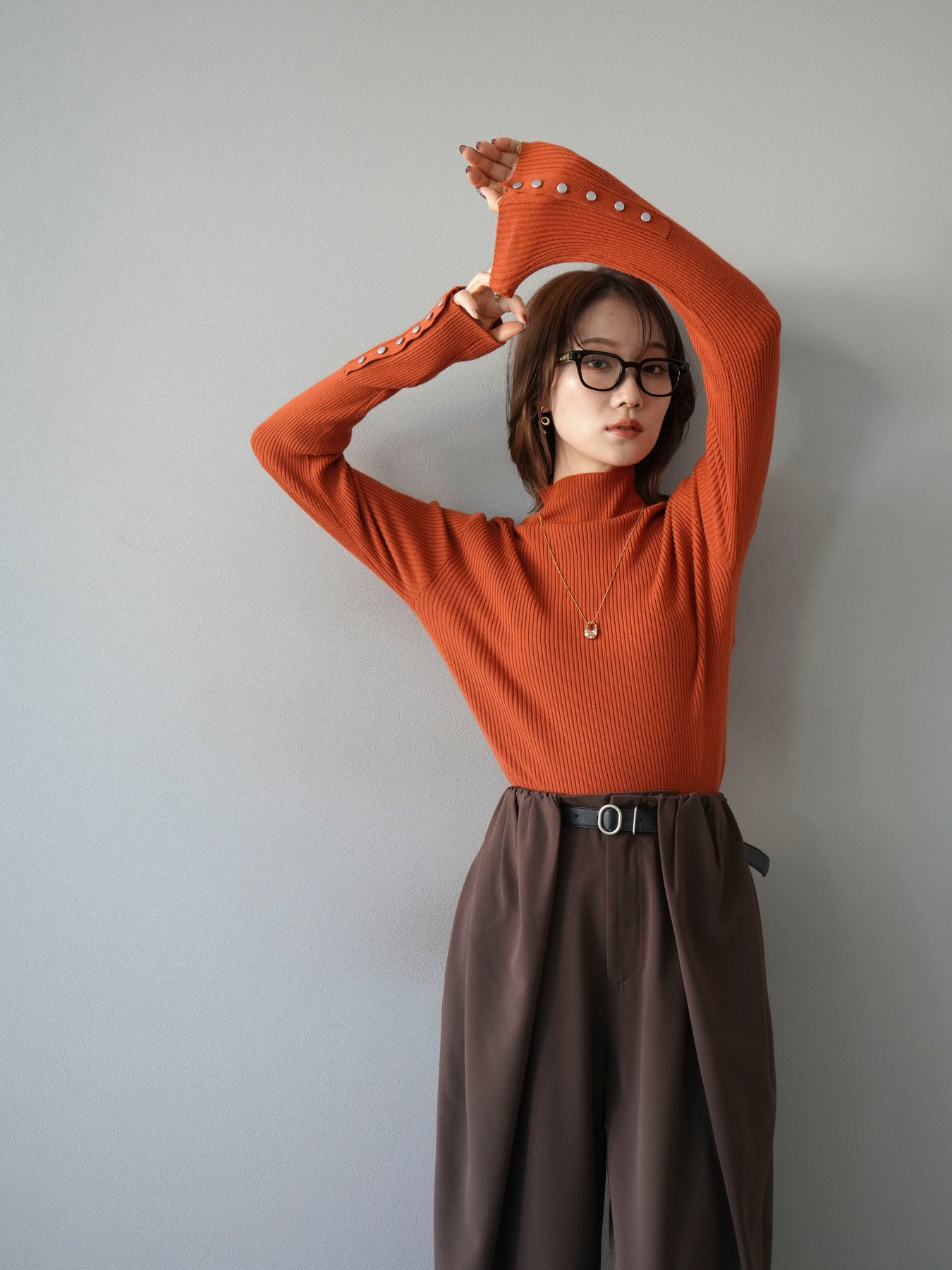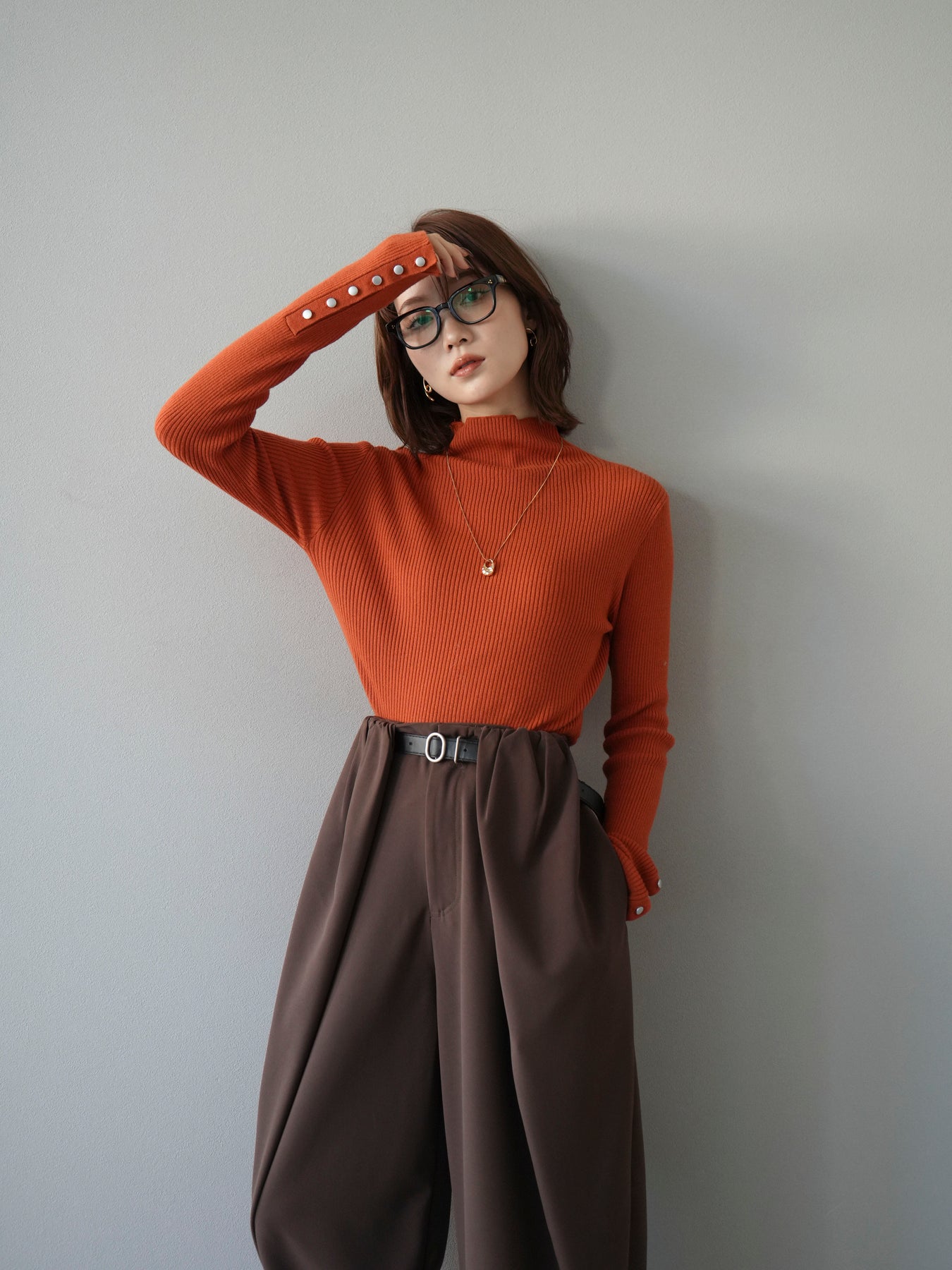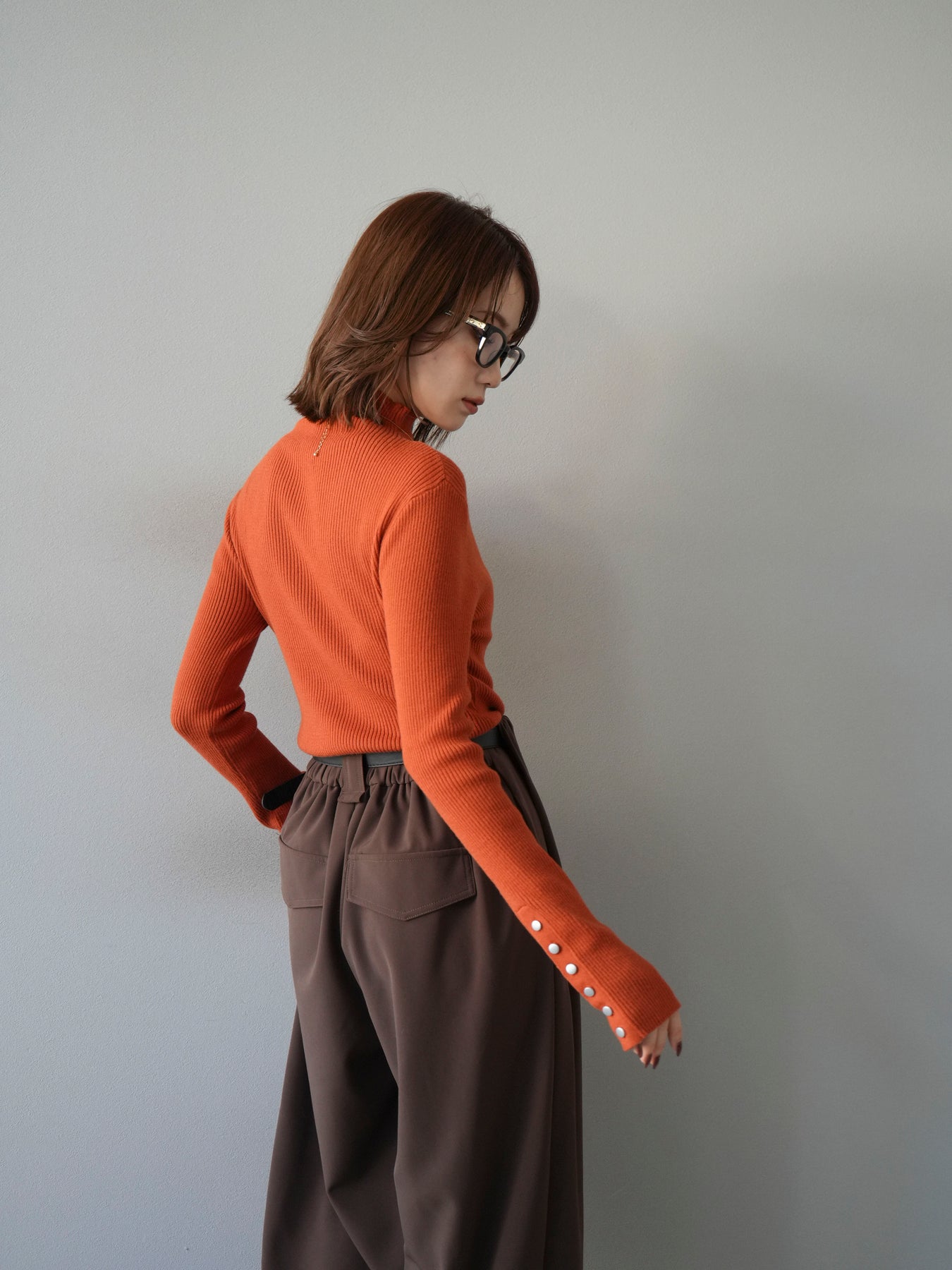 [予約]袖ボタンボトルネックリブニットトップス/オレンジ