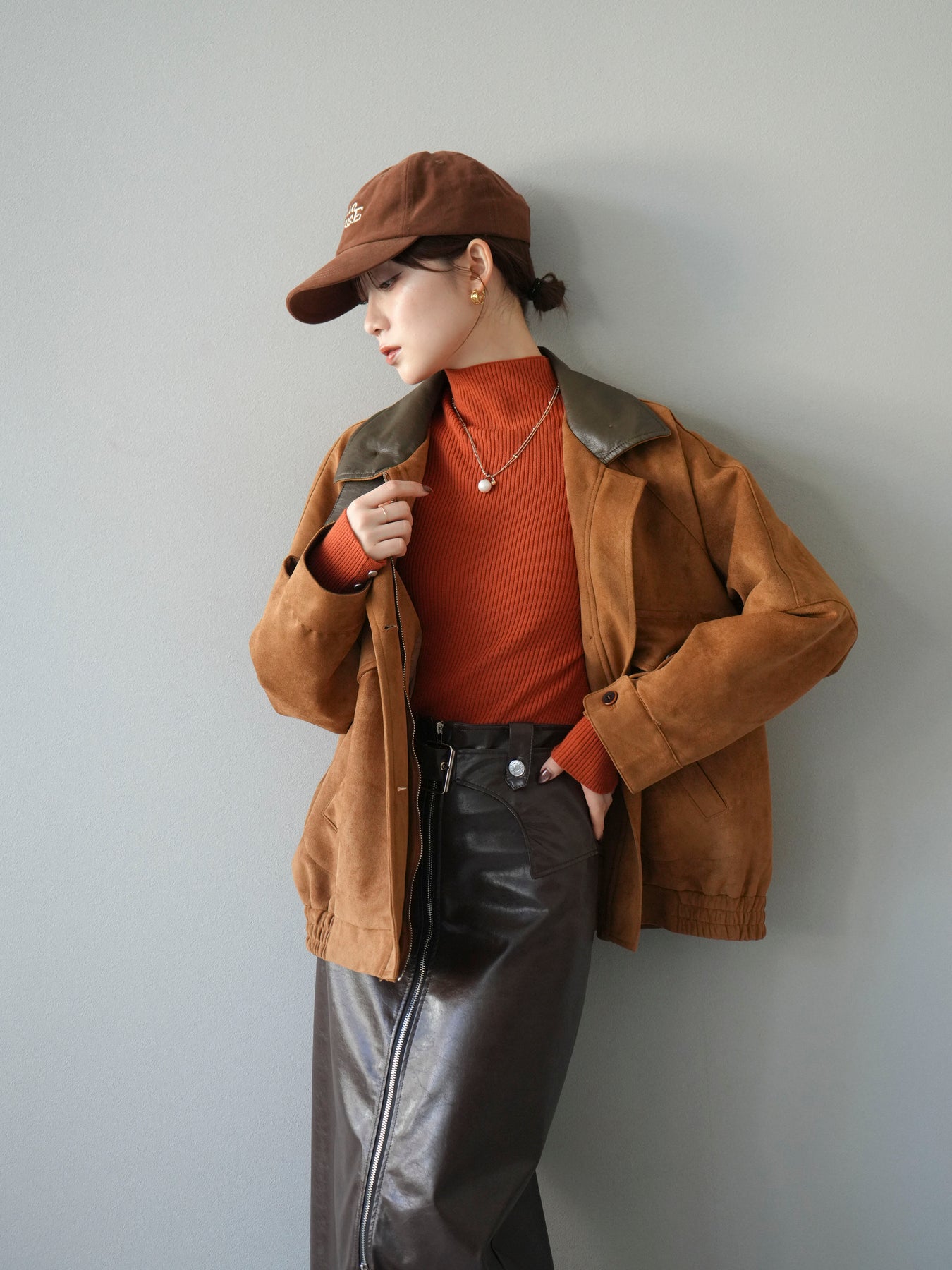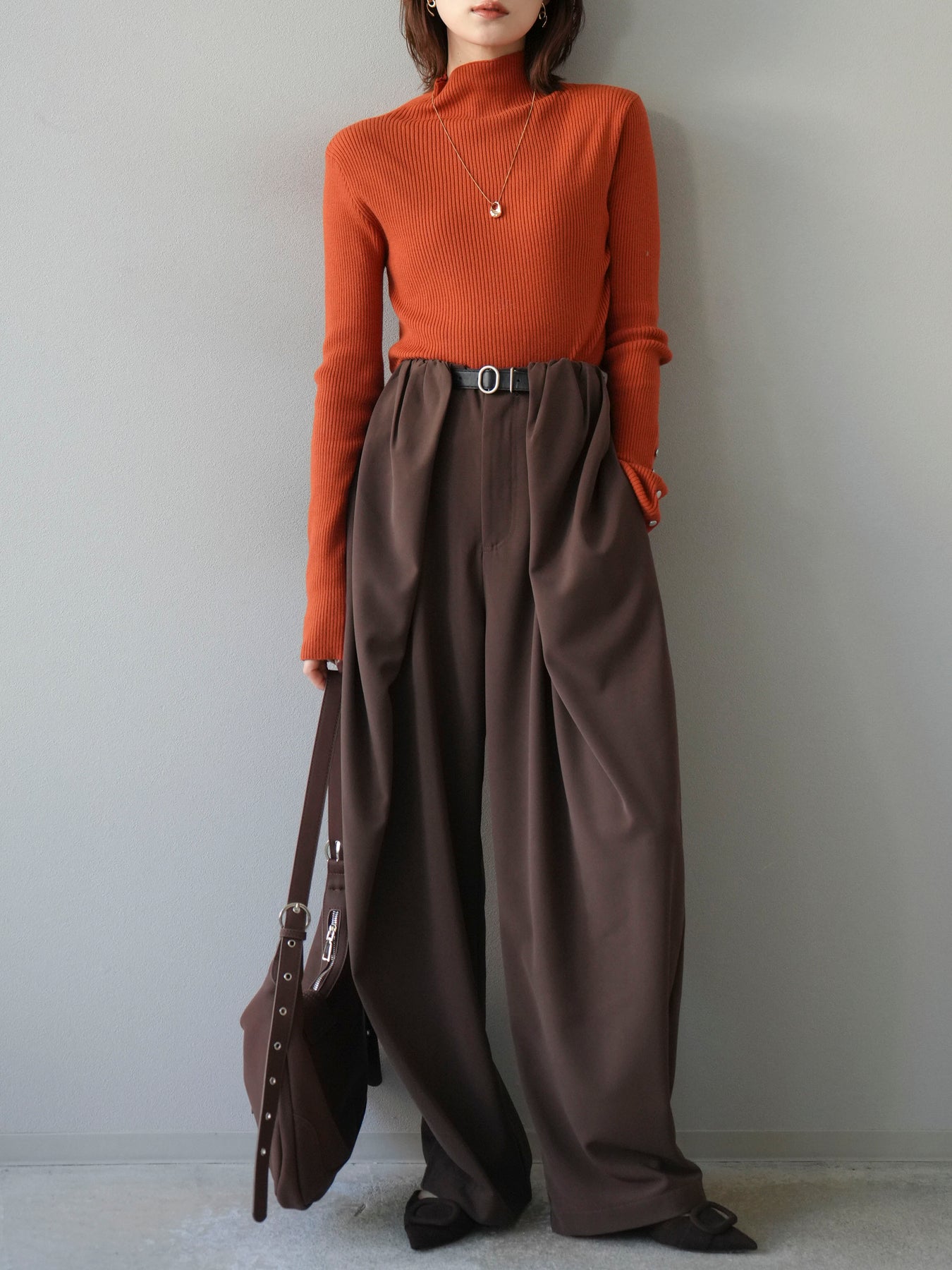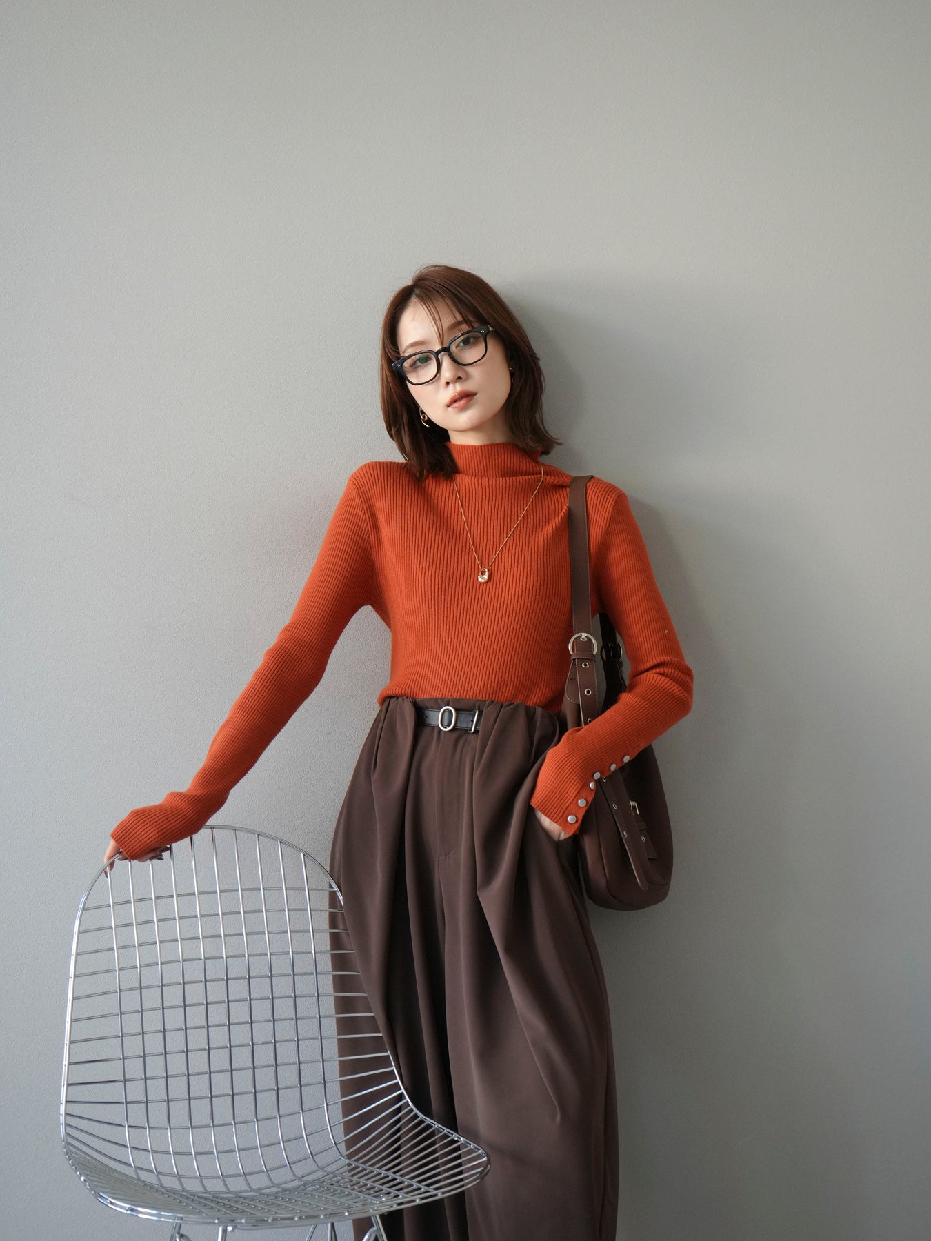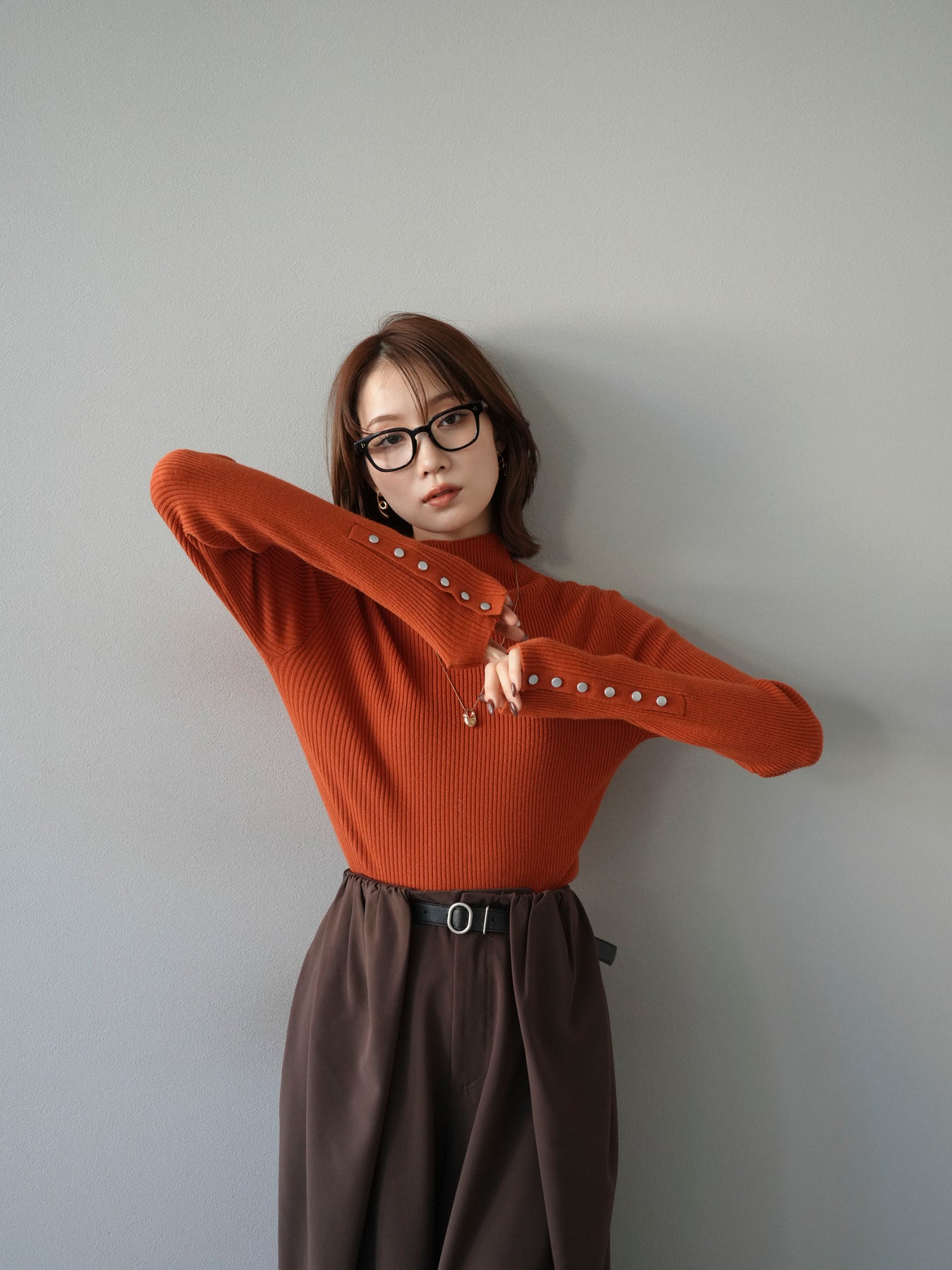 [予約]袖ボタンボトルネックリブニットトップス/オレンジ