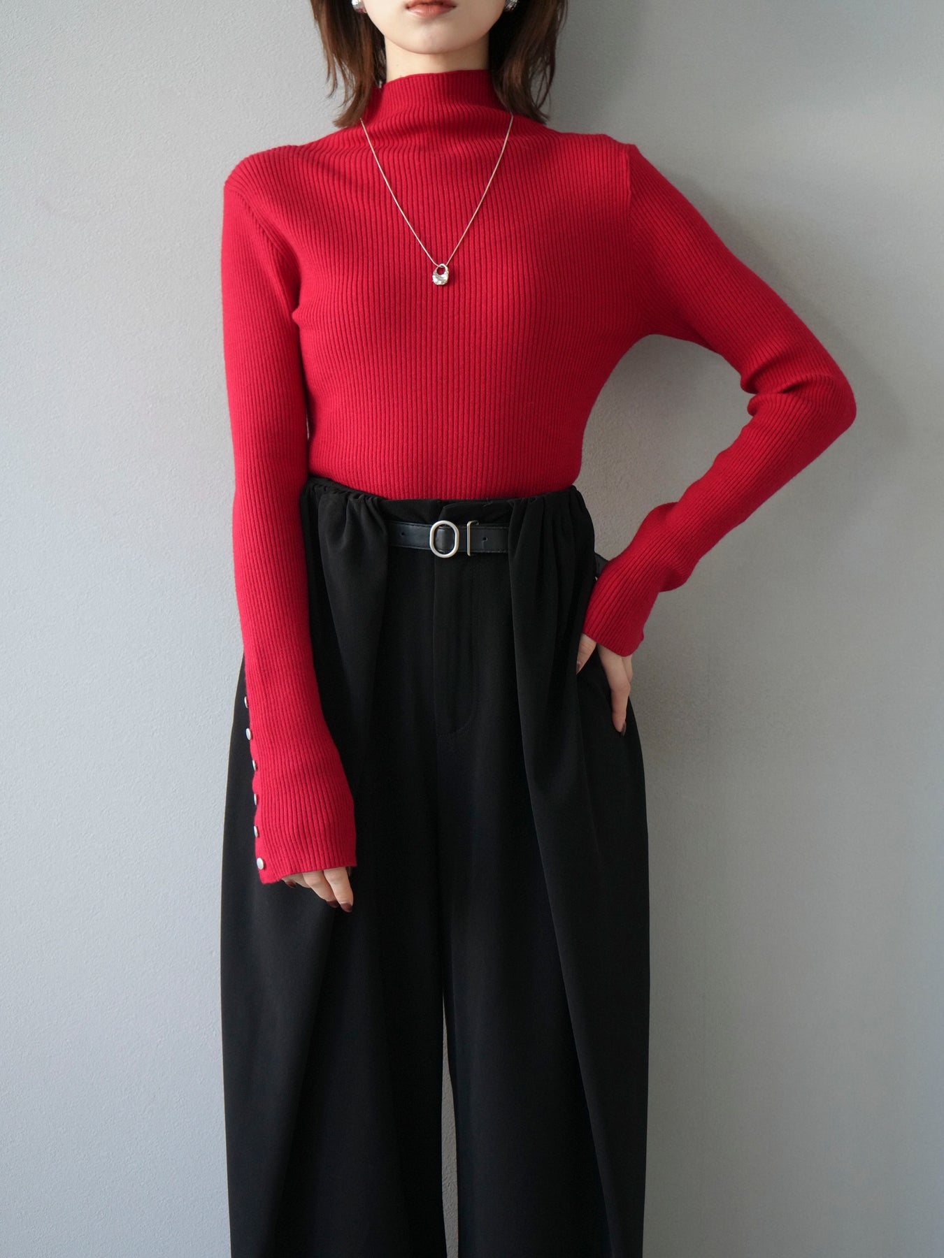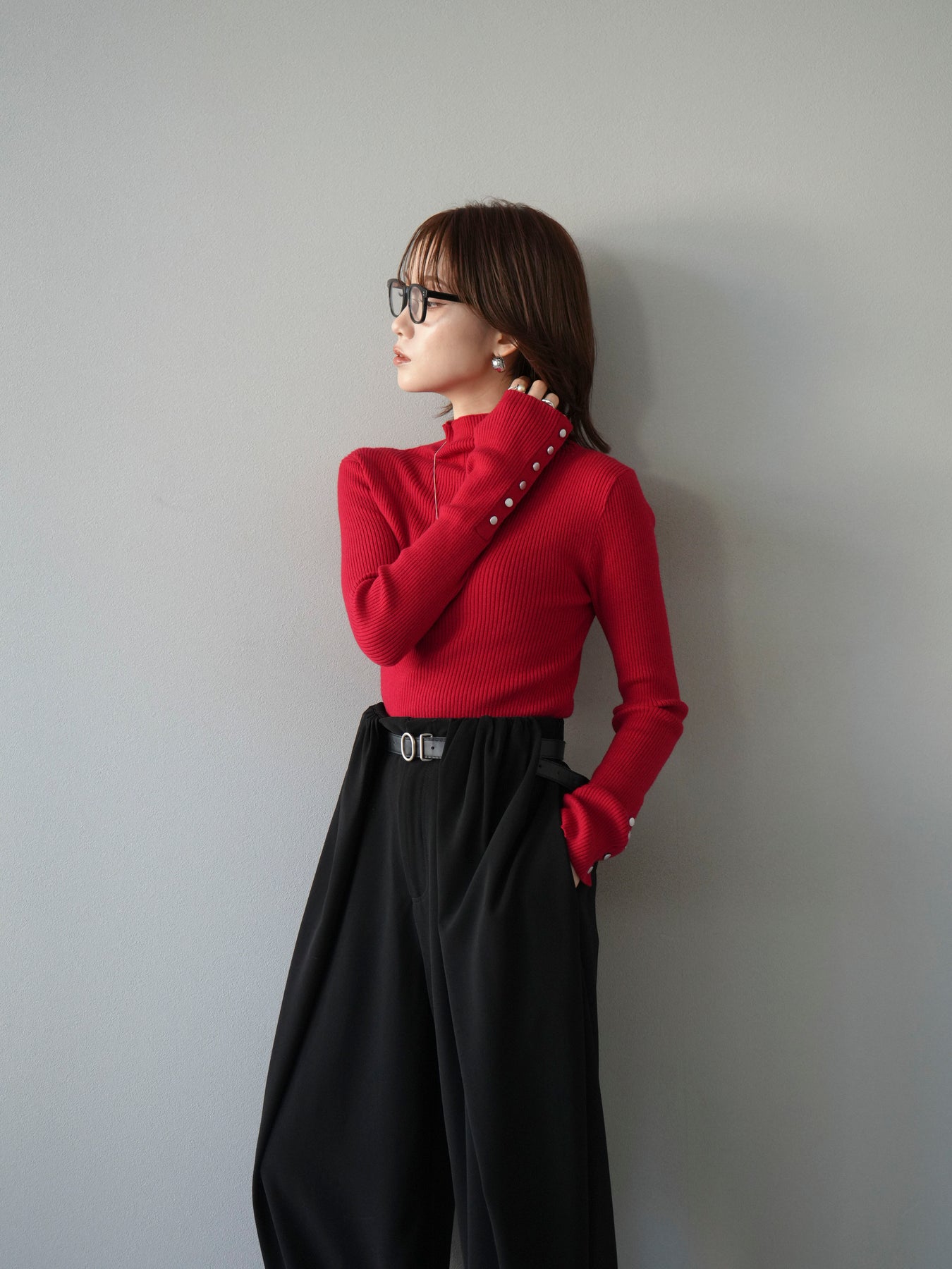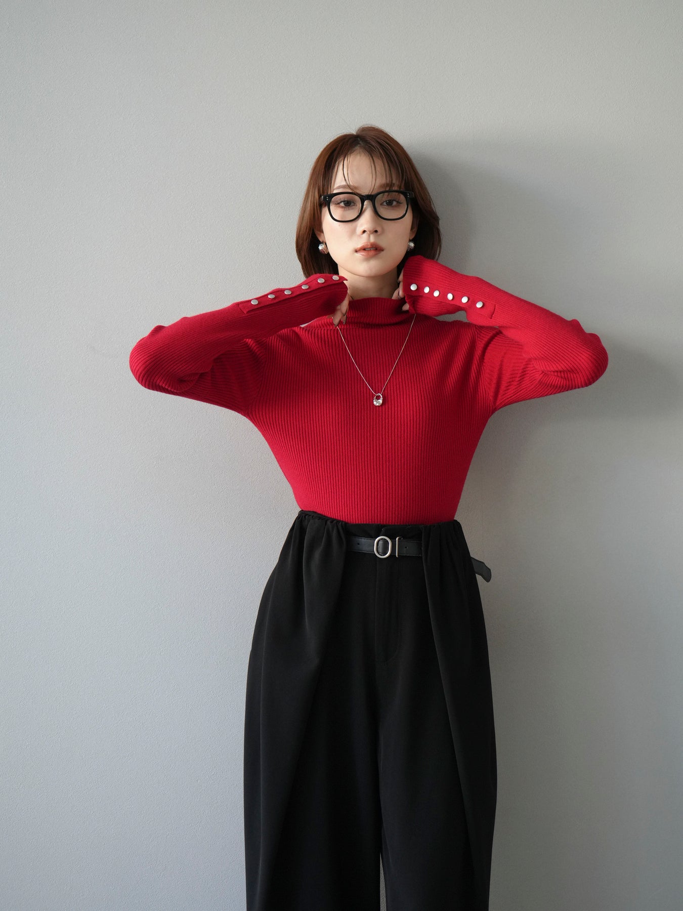 [予約]袖ボタンボトルネックリブニットトップス/レッド