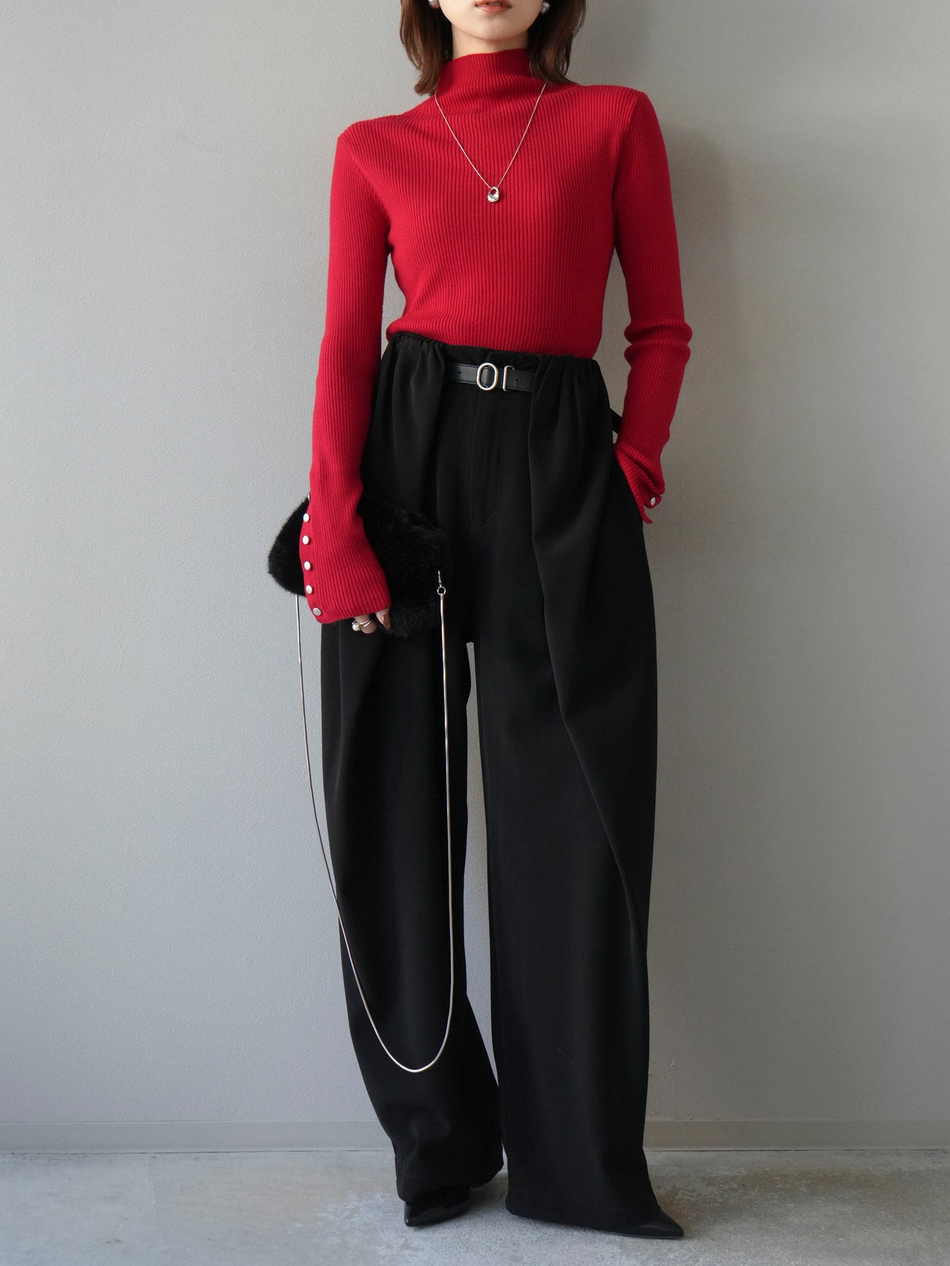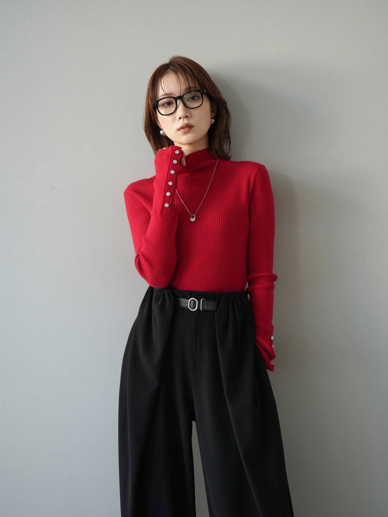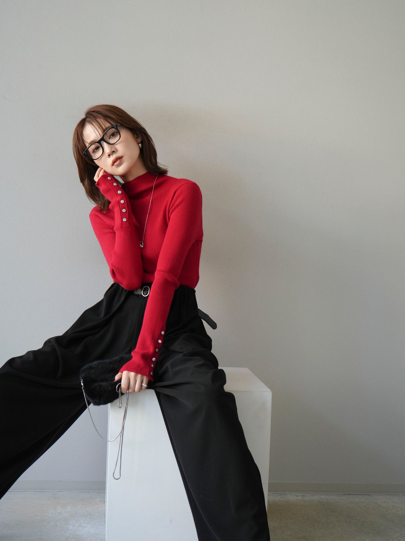 [予約]袖ボタンボトルネックリブニットトップス/レッド