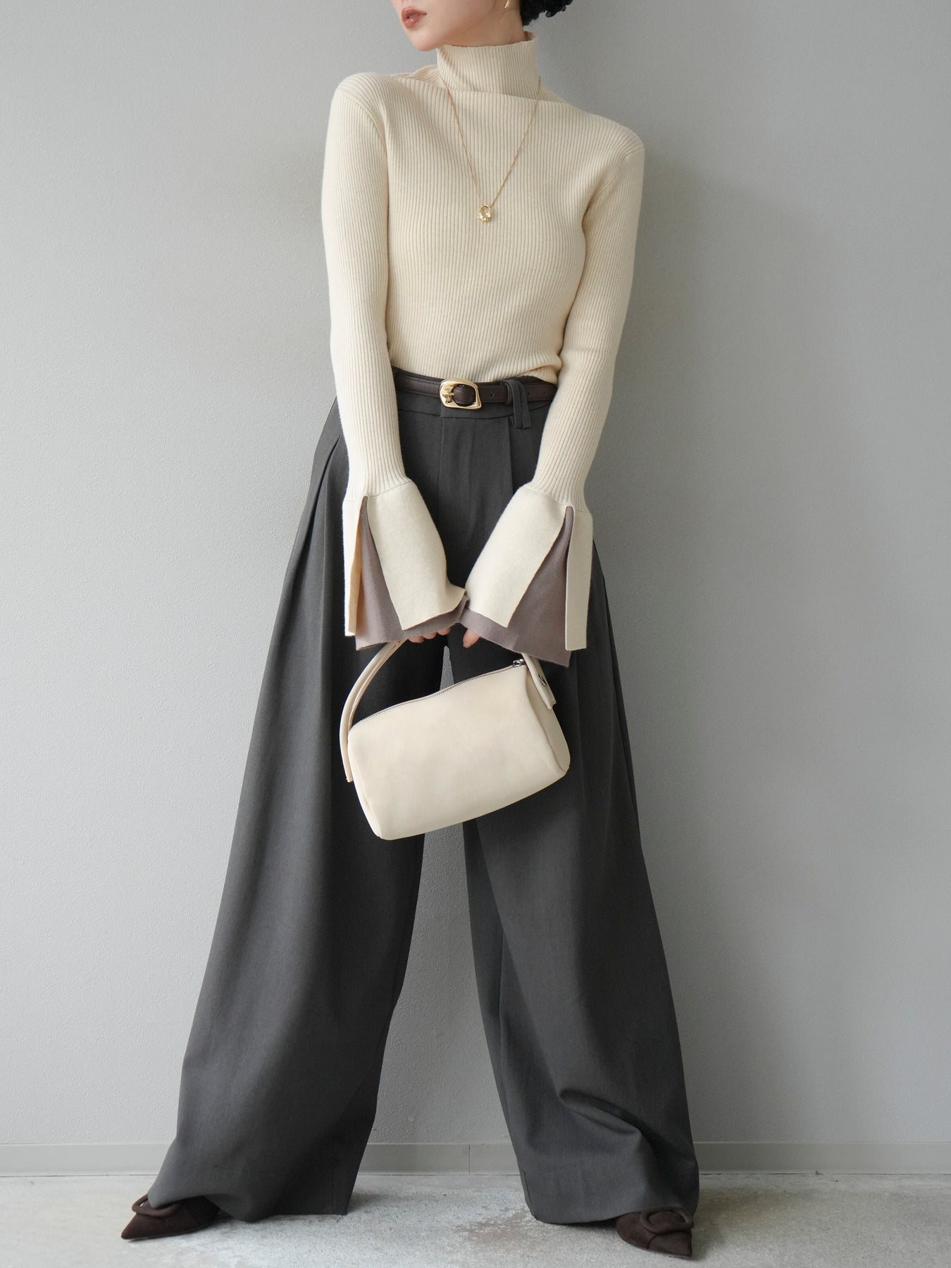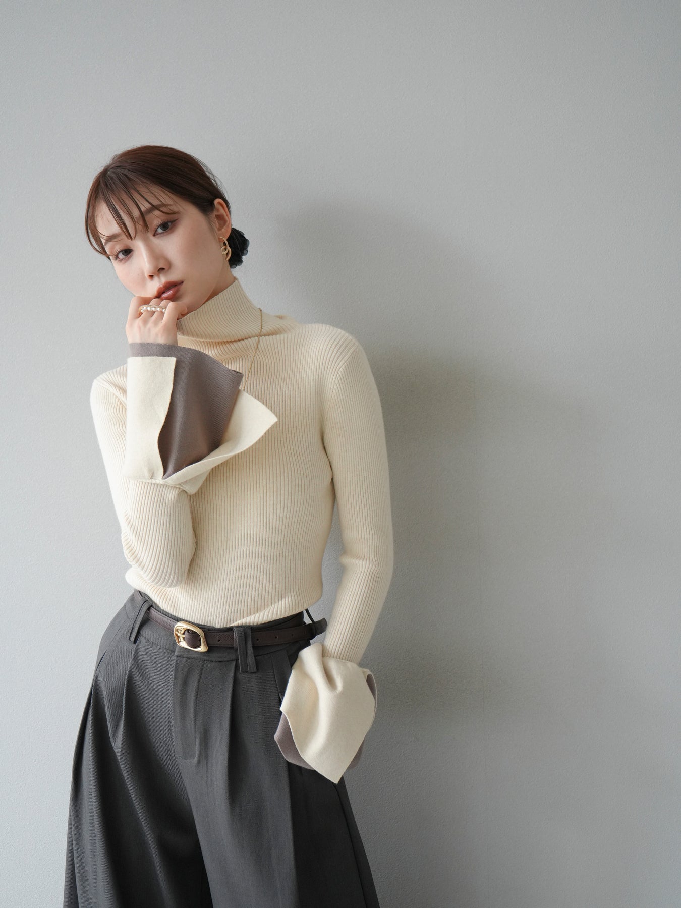 袖口にレイヤードデザインを施したフレアスリーブが印象的なハイネックニットトップス。シンプルなリブニットに遊び心あるデザインを加えることで、1枚でスタイリングが映える主役アイテムに仕上がっています。体に程よくフィットするシルエットで、ジャケットやアウターのインナーとしても相性抜群。デイリーからお出かけまで幅広く活躍し、着こなしに華やかさを添えてくれる一着です。 ※ボトムス、キャミソール(インナー)以外の商品は一律でインナーは付属していません。