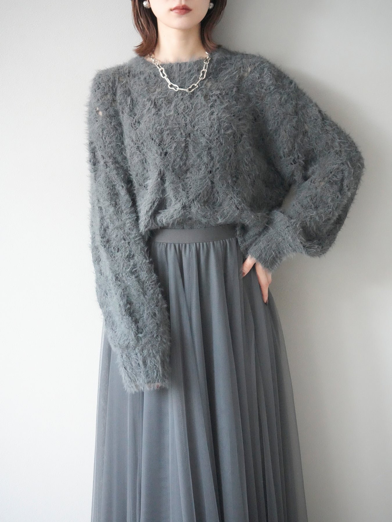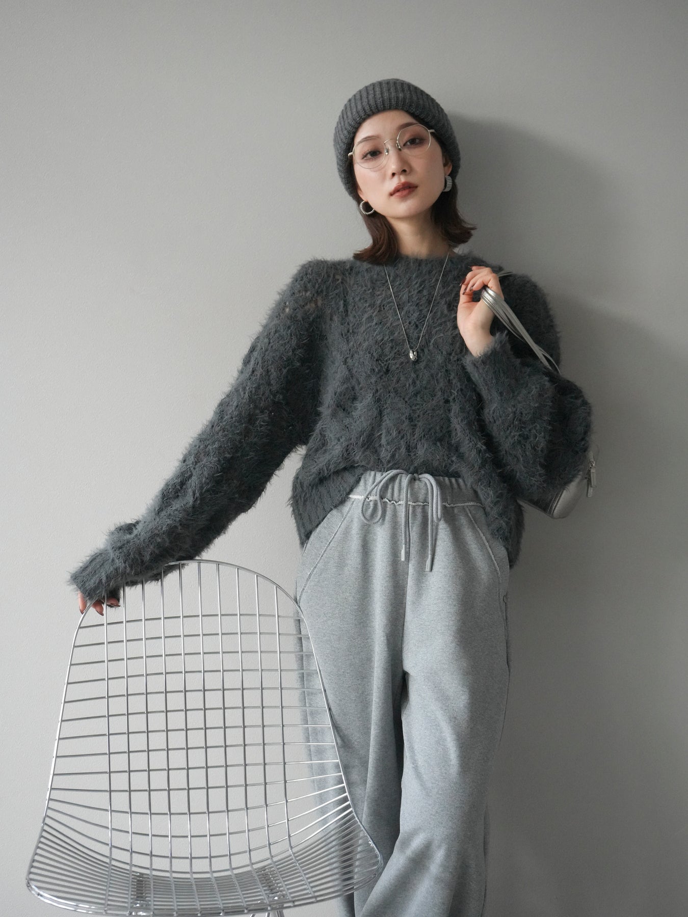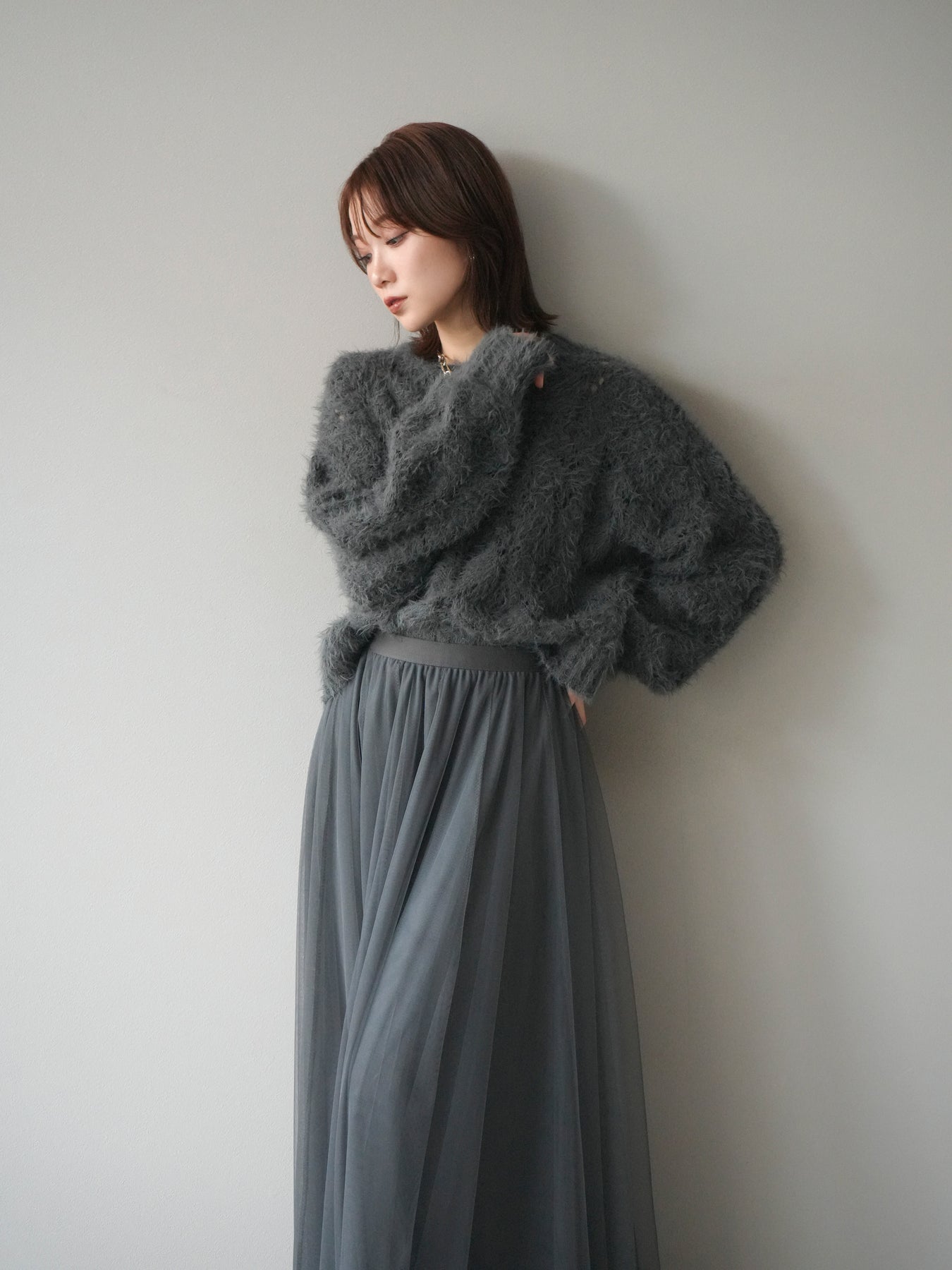 [予約]モール×フェザー透かし編みニットプルオーバー/black