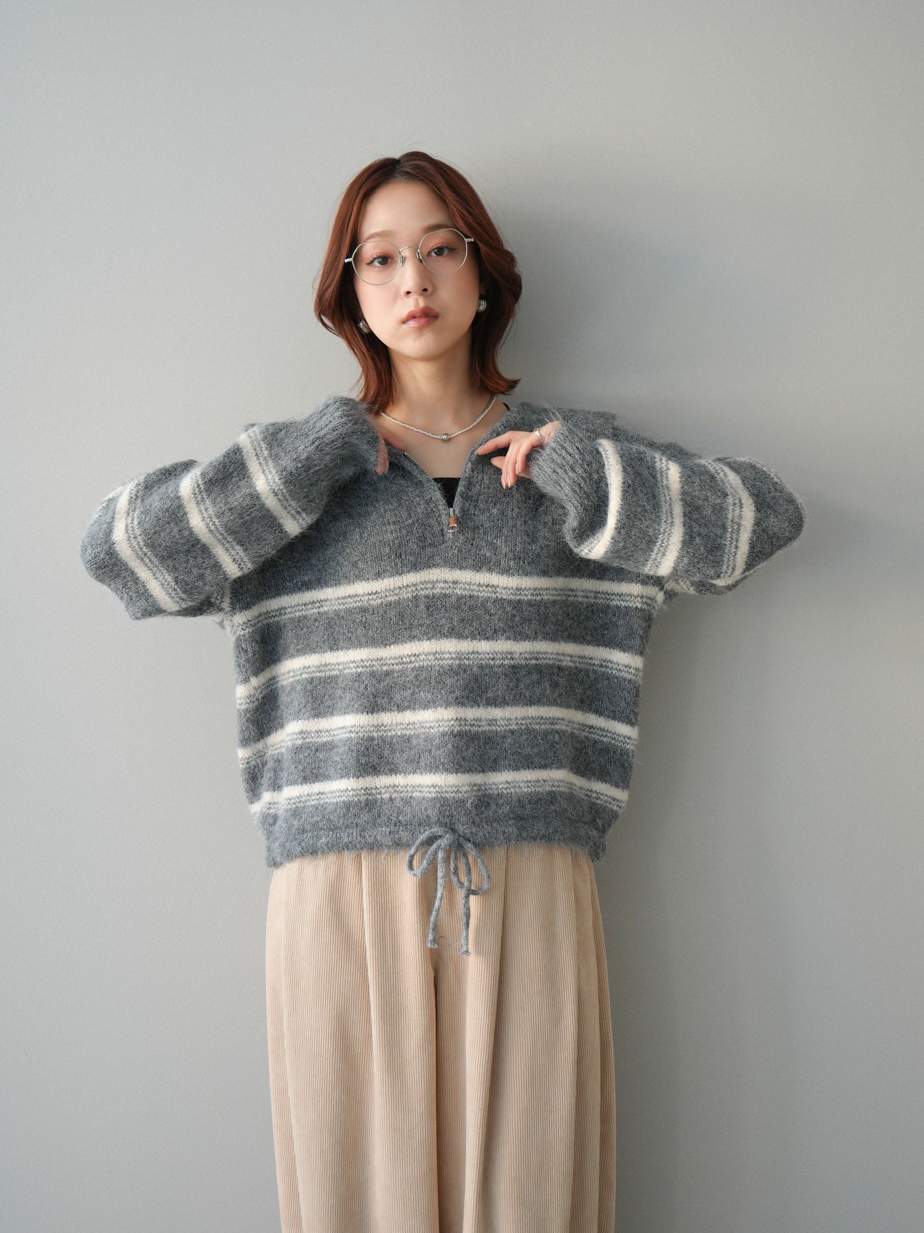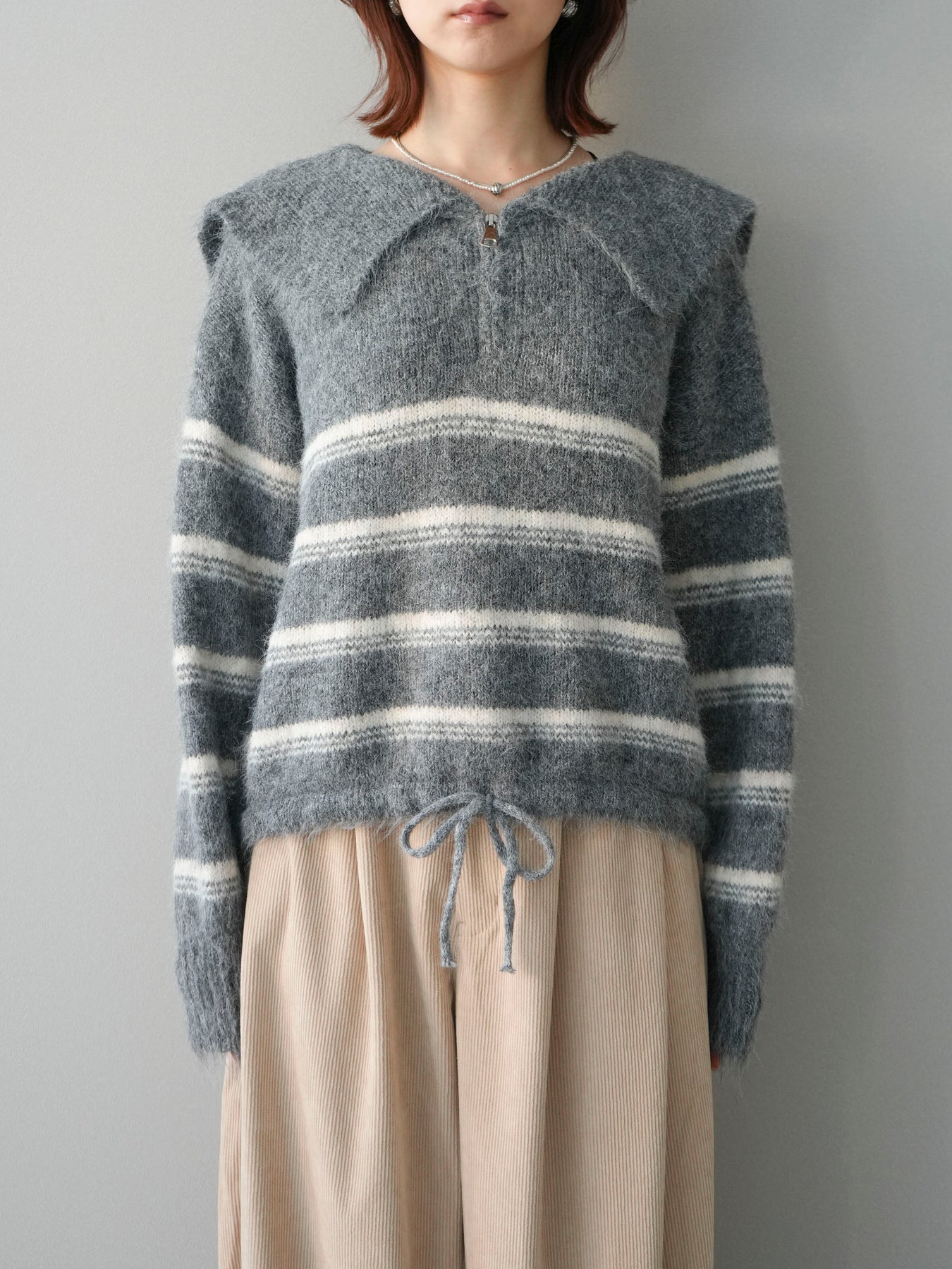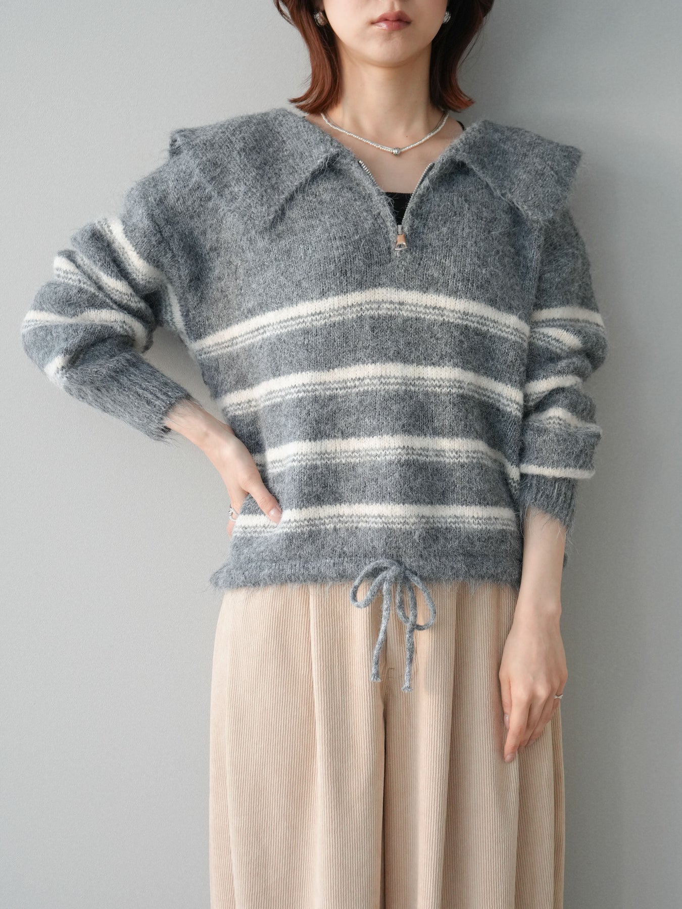 ハーフジップデザインとボーダー柄を組み合わせた、程よくカジュアル感のあるニットプルオーバー。 首元のジップ開閉で印象を変えられ、レイヤードや抜け感のある着こなしが楽しめます。 柔らかな編地とゆとりのあるシルエットが、リラックス感のある着心地を実現。 一枚で着映えしつつも主張しすぎず、スカートやパンツなど幅広いボトムと好相性です。 デイリーコーデに取り入れやすく、シーズンスタイルをさりげなく格上げしてくれる一着です。 ※ボトムス、キャミソール(インナー)以外の商品は一律でインナーは付属していません。