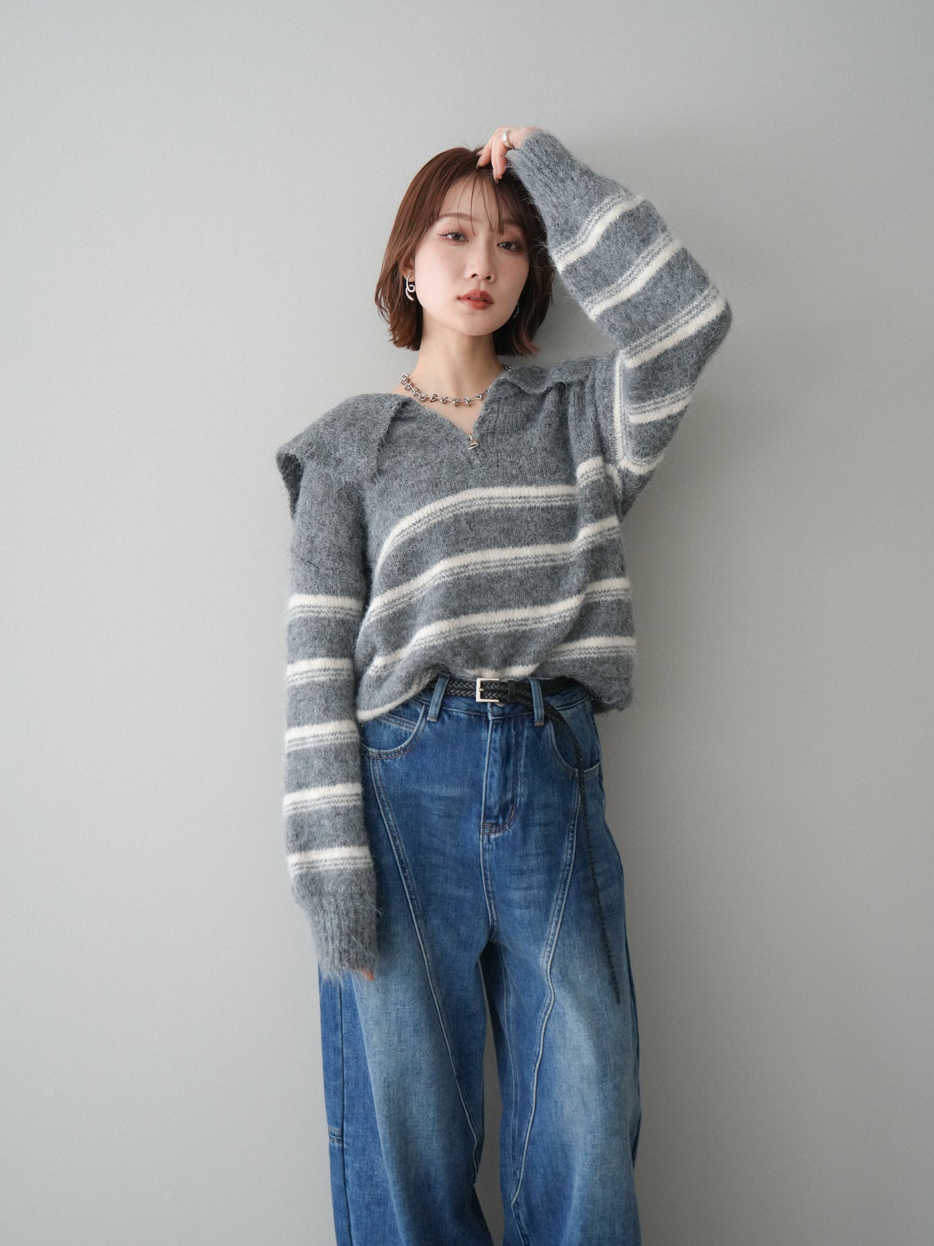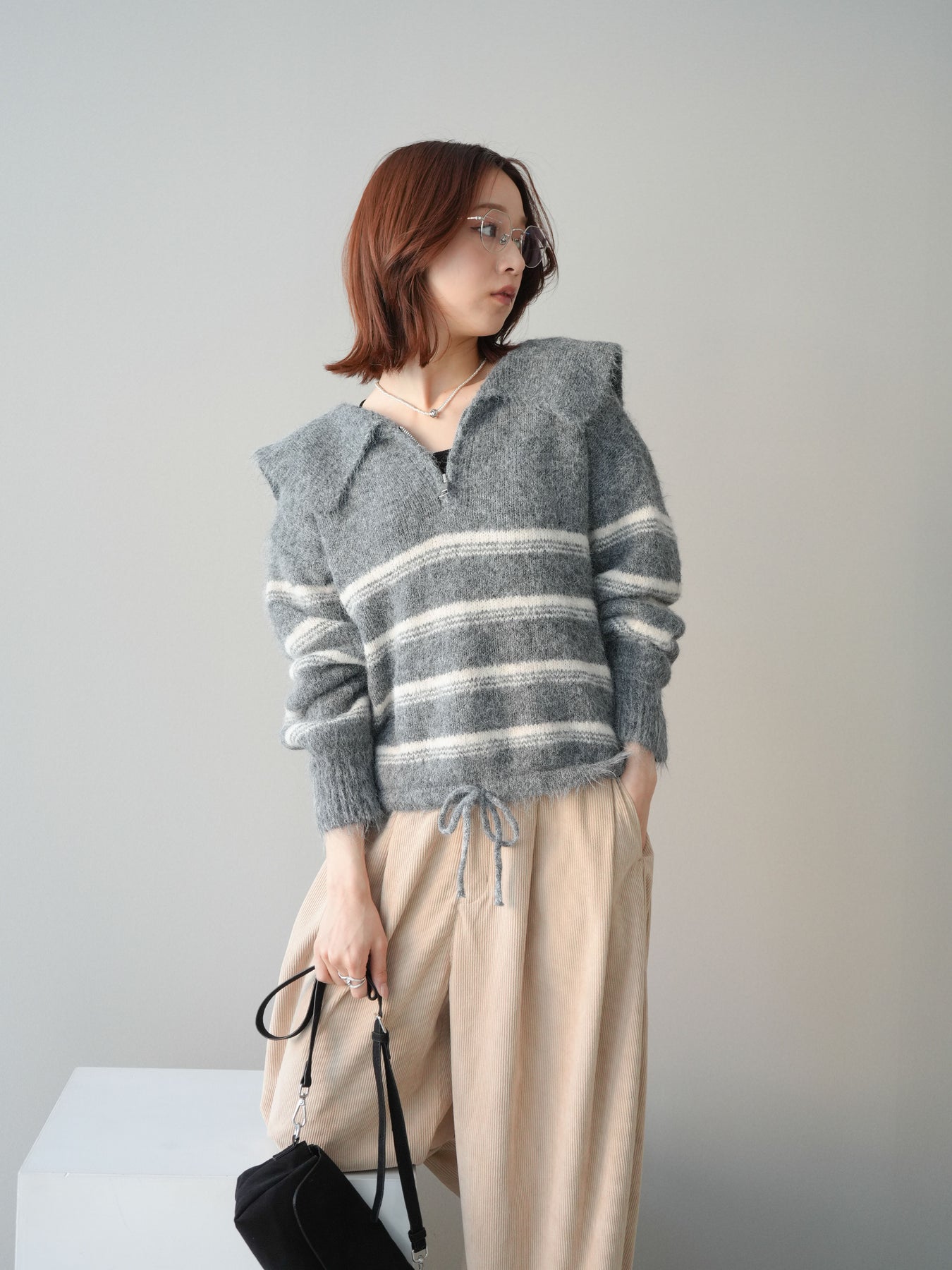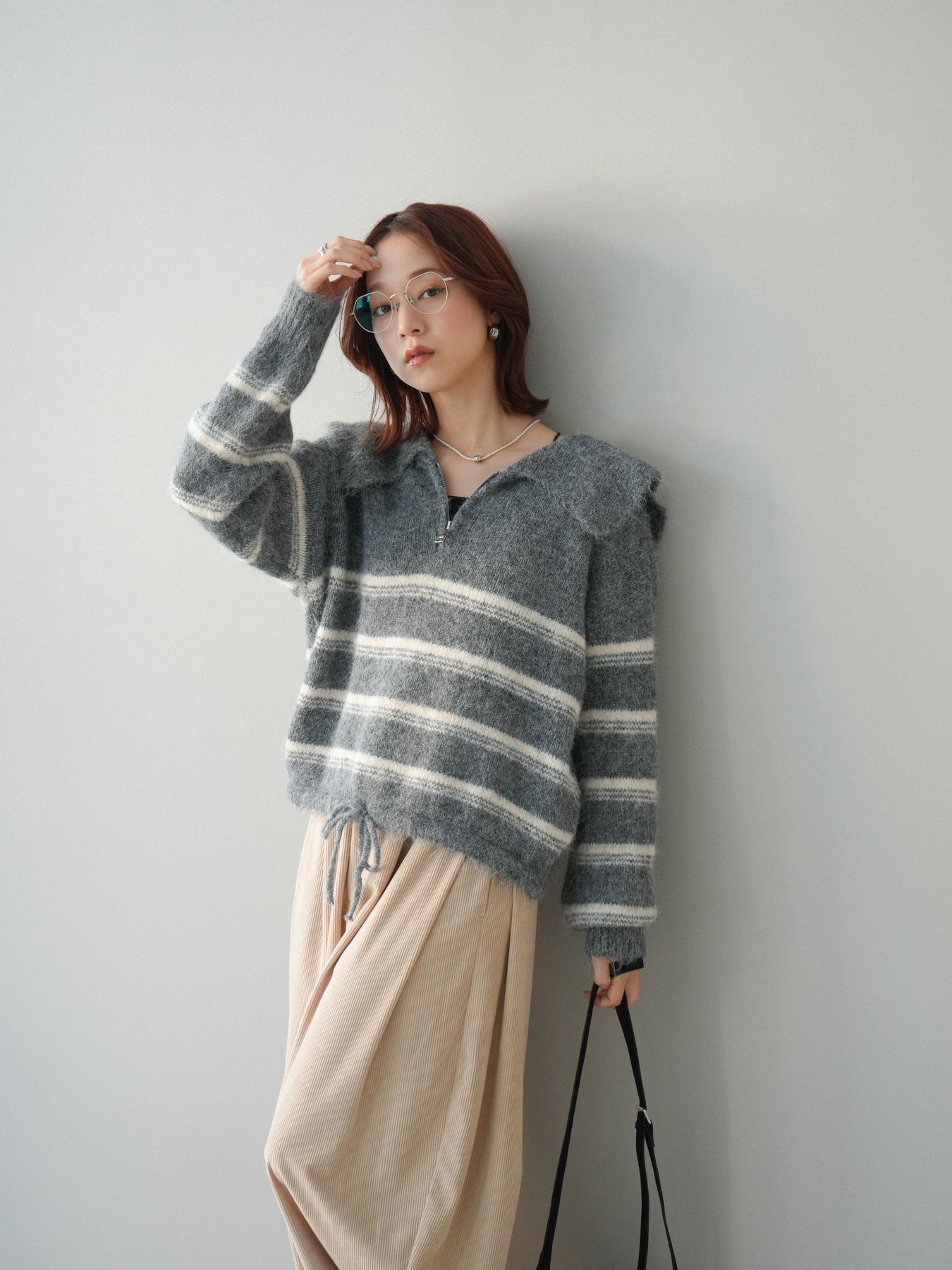 ハーフジップデザインとボーダー柄を組み合わせた、程よくカジュアル感のあるニットプルオーバー。 首元のジップ開閉で印象を変えられ、レイヤードや抜け感のある着こなしが楽しめます。 柔らかな編地とゆとりのあるシルエットが、リラックス感のある着心地を実現。 一枚で着映えしつつも主張しすぎず、スカートやパンツなど幅広いボトムと好相性です。 デイリーコーデに取り入れやすく、シーズンスタイルをさりげなく格上げしてくれる一着です。 ※ボトムス、キャミソール(インナー)以外の商品は一律でインナーは付属していません。