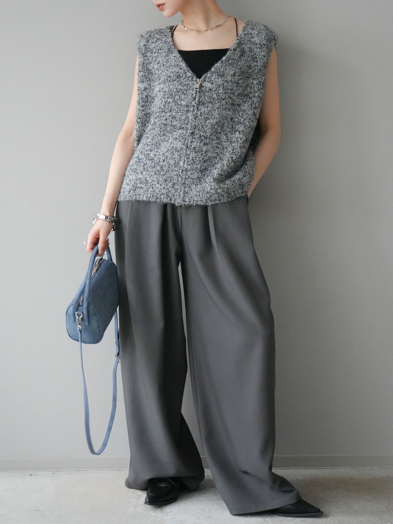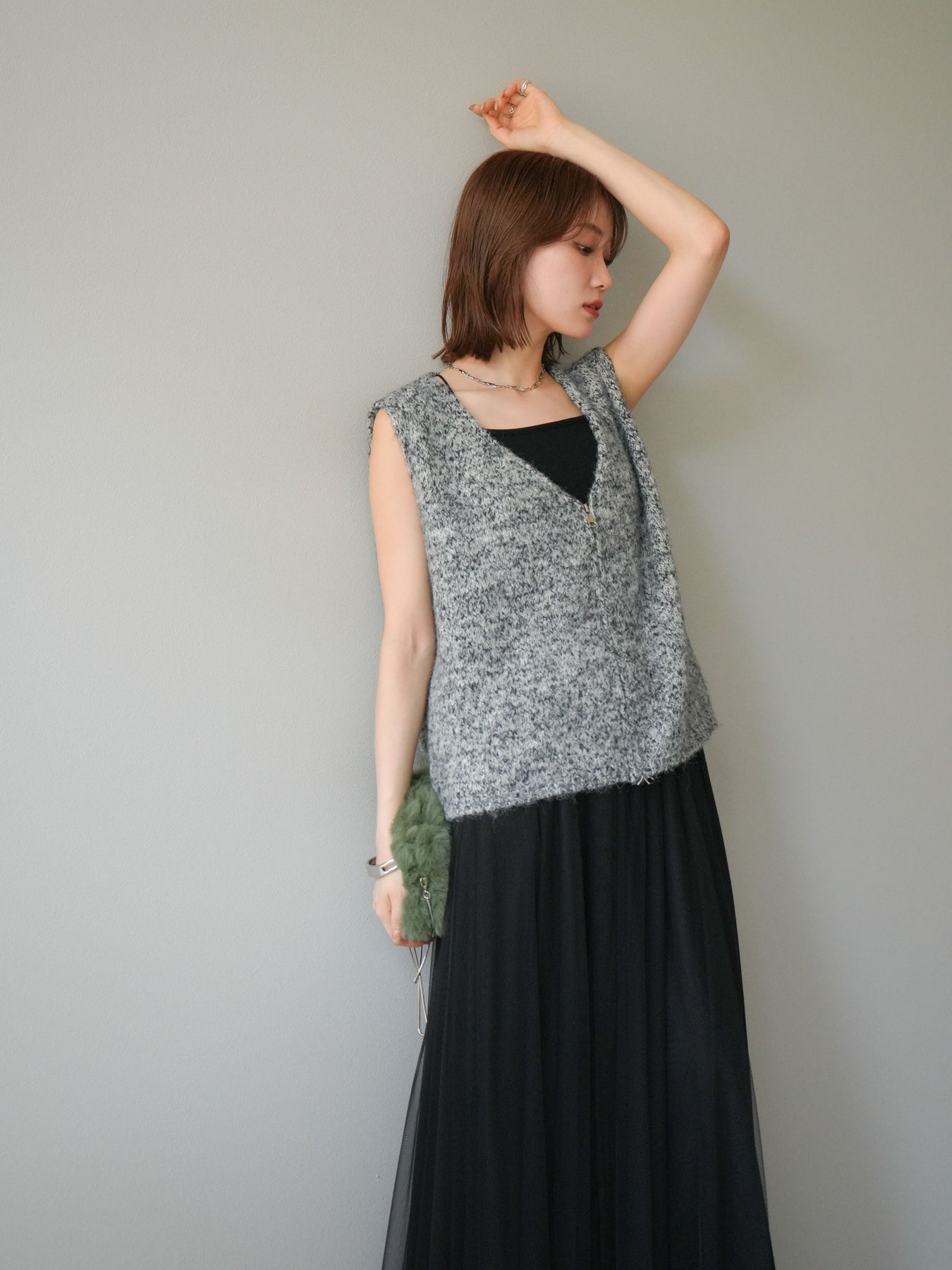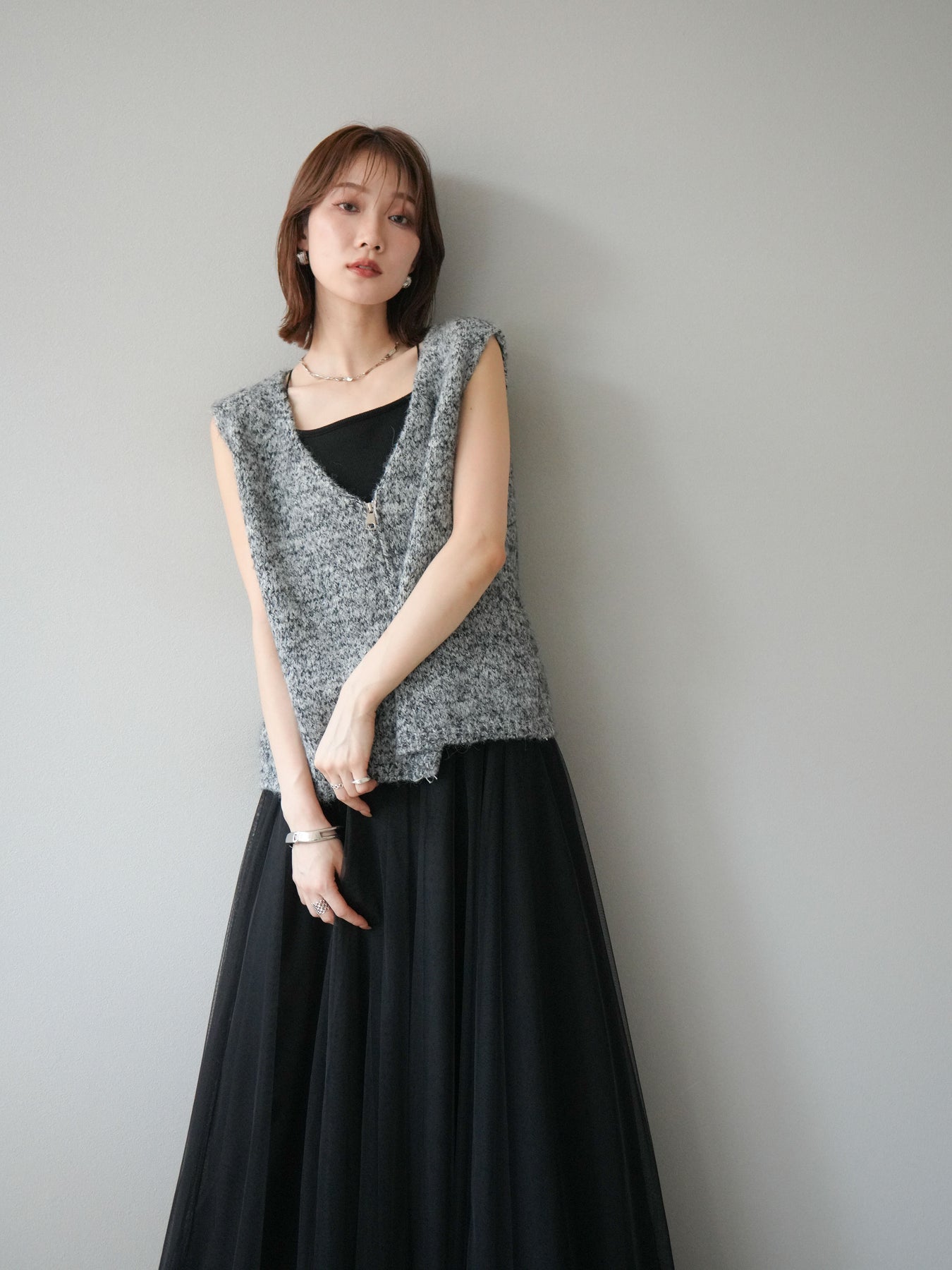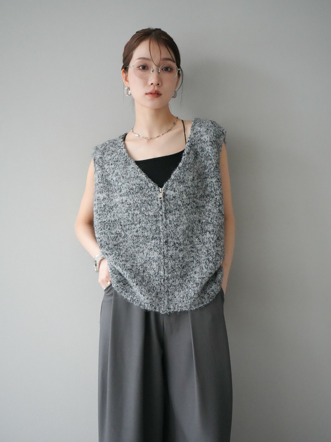 色糸をミックスした奥行きのある編地が魅力のニットベスト。フロントに施したZIPディテールがアクセントとなり、カジュアルからモードまで幅広いスタイリングにマッチします。程よくゆとりのあるシルエットでレイヤードがしやすく、シャツやカットソーの上に重ねるだけでトレンド感のある着こなしに。ショート丈寄りのデザインでバランスが取りやすく、ワイドパンツやスカートとも好相性です。季節の変わり目にはライトアウター感覚としても活躍する、着回し力抜群の一枚です。 ※ボトムス、キャミソール(インナー)以外の商品は一律でインナーは付属していません。