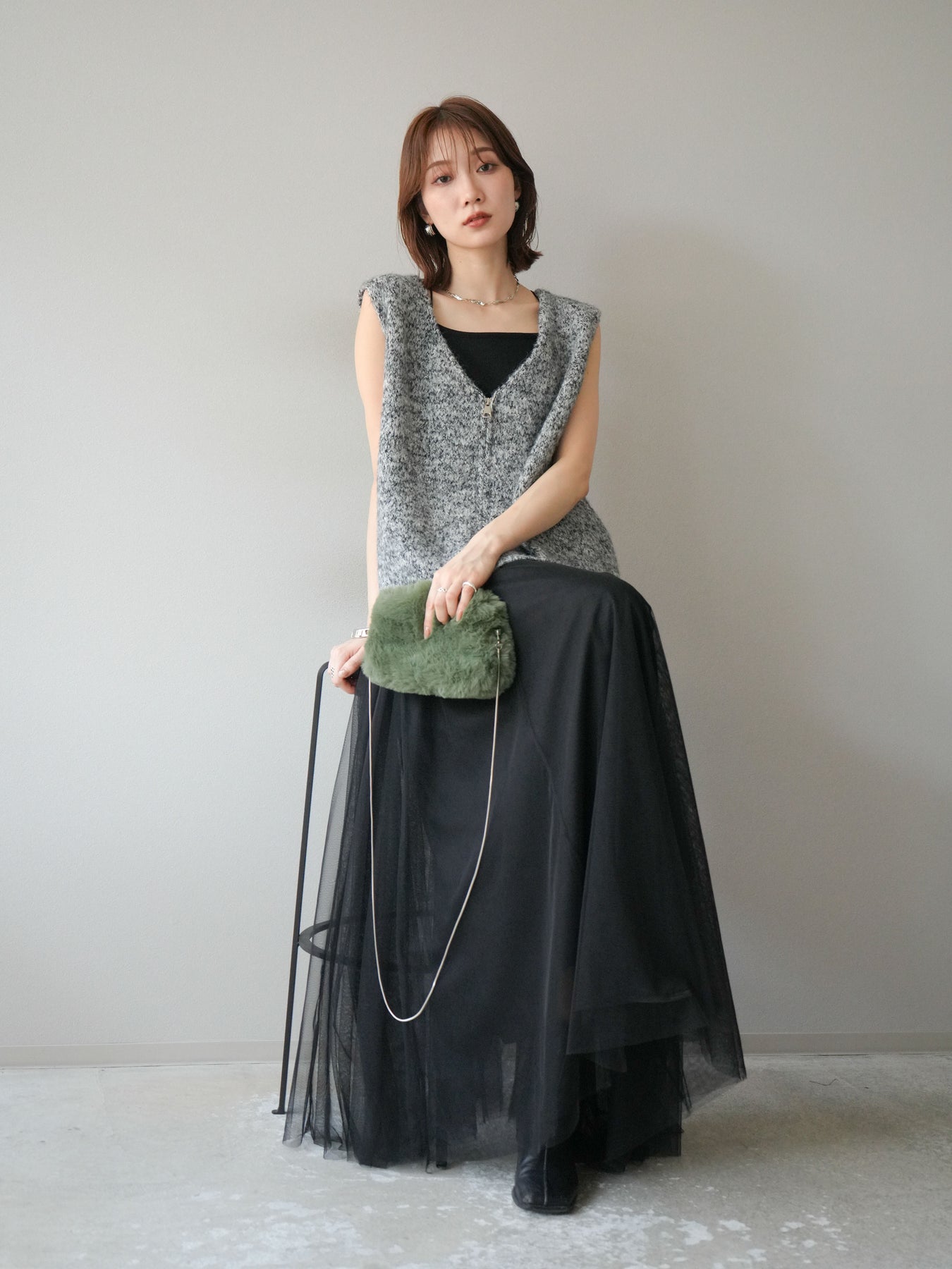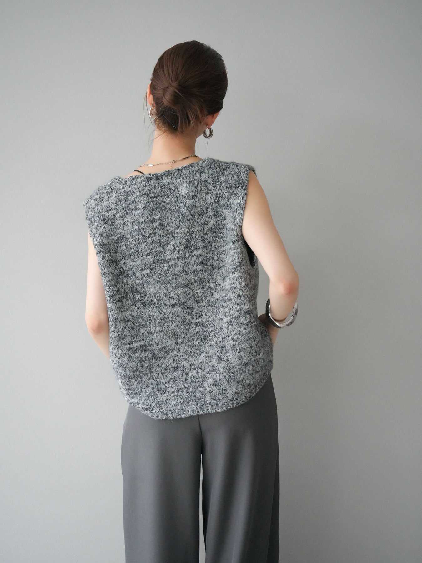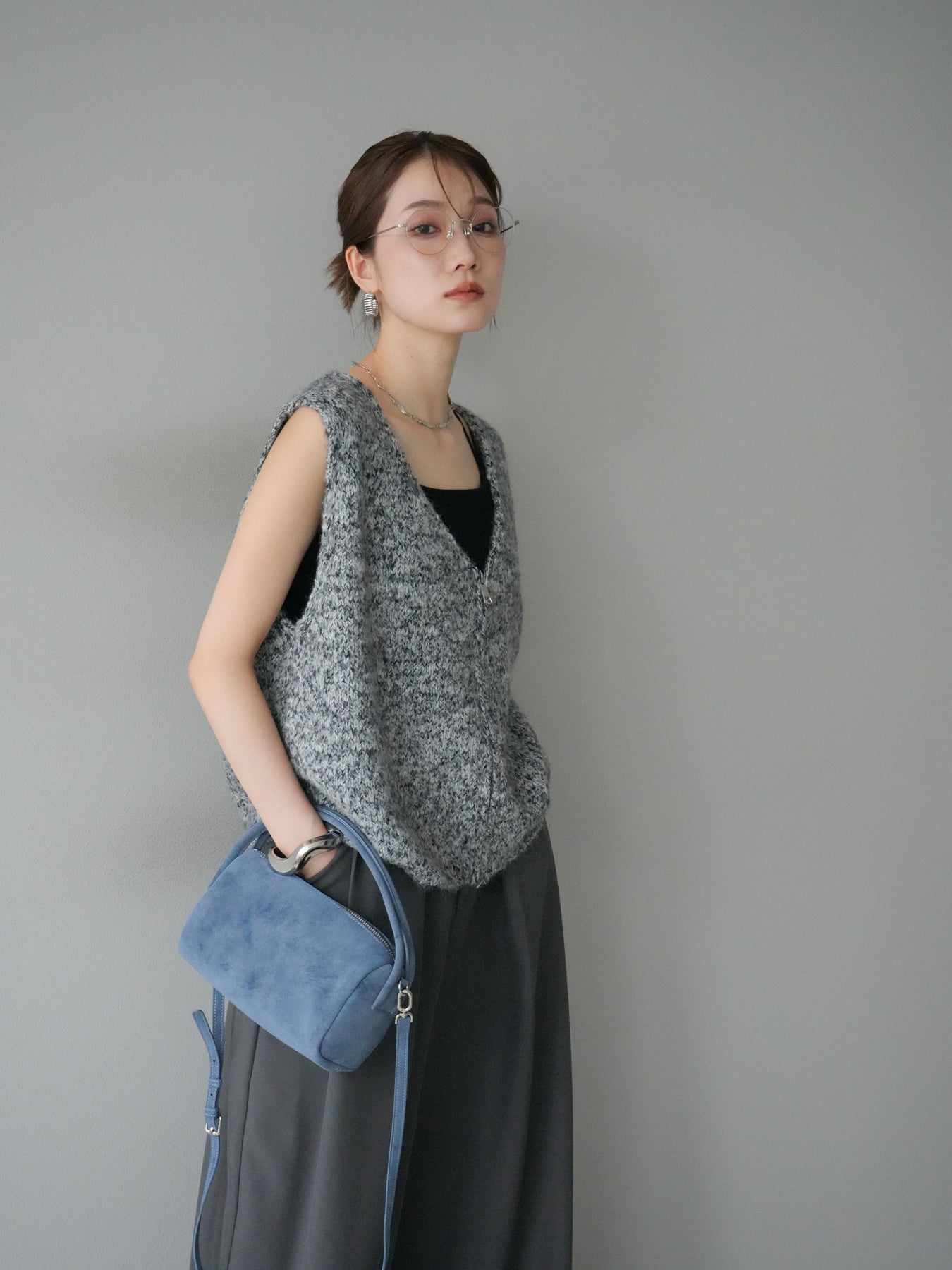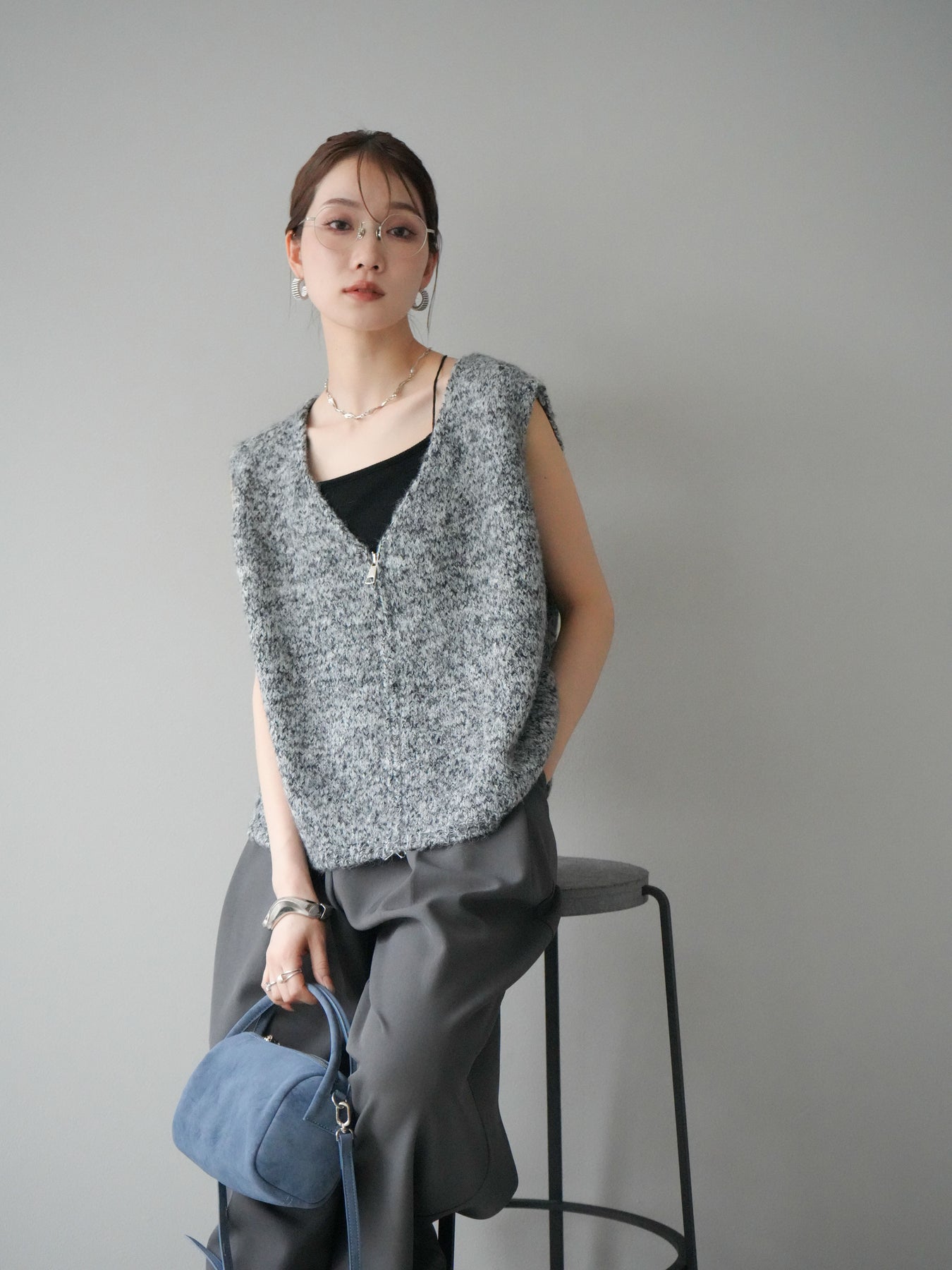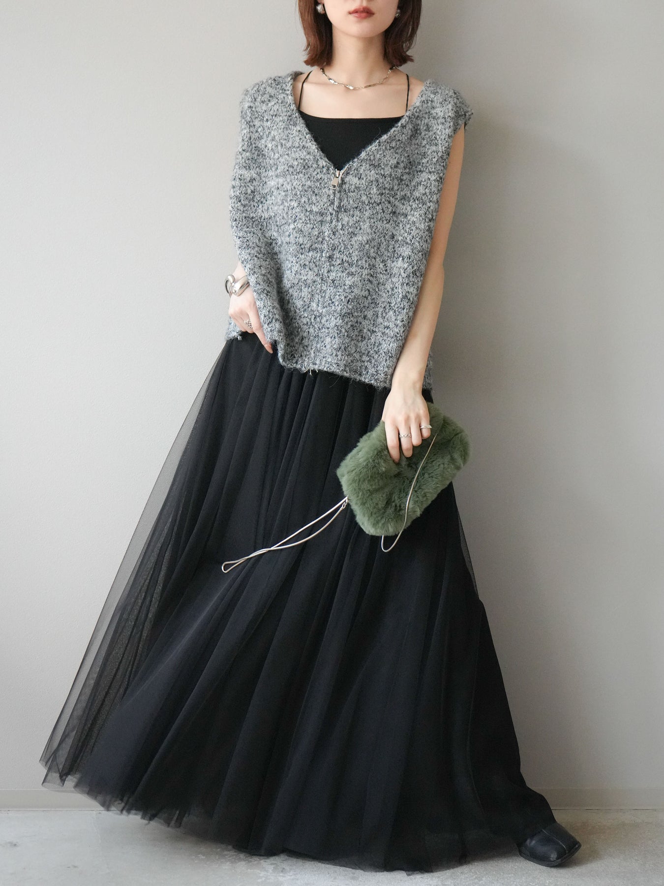 色糸をミックスした奥行きのある編地が魅力のニットベスト。フロントに施したZIPディテールがアクセントとなり、カジュアルからモードまで幅広いスタイリングにマッチします。程よくゆとりのあるシルエットでレイヤードがしやすく、シャツやカットソーの上に重ねるだけでトレンド感のある着こなしに。ショート丈寄りのデザインでバランスが取りやすく、ワイドパンツやスカートとも好相性です。季節の変わり目にはライトアウター感覚としても活躍する、着回し力抜群の一枚です。 ※ボトムス、キャミソール(インナー)以外の商品は一律でインナーは付属していません。