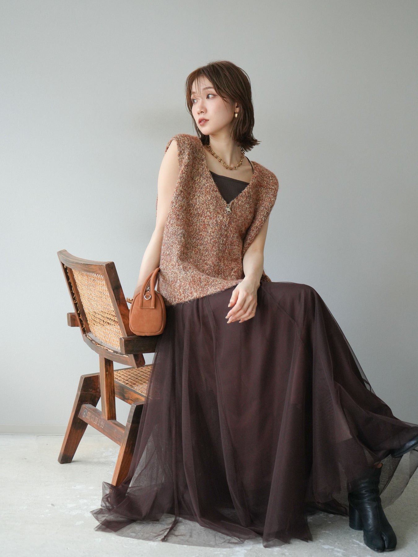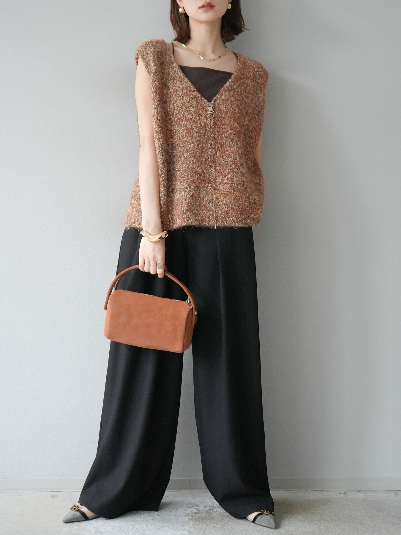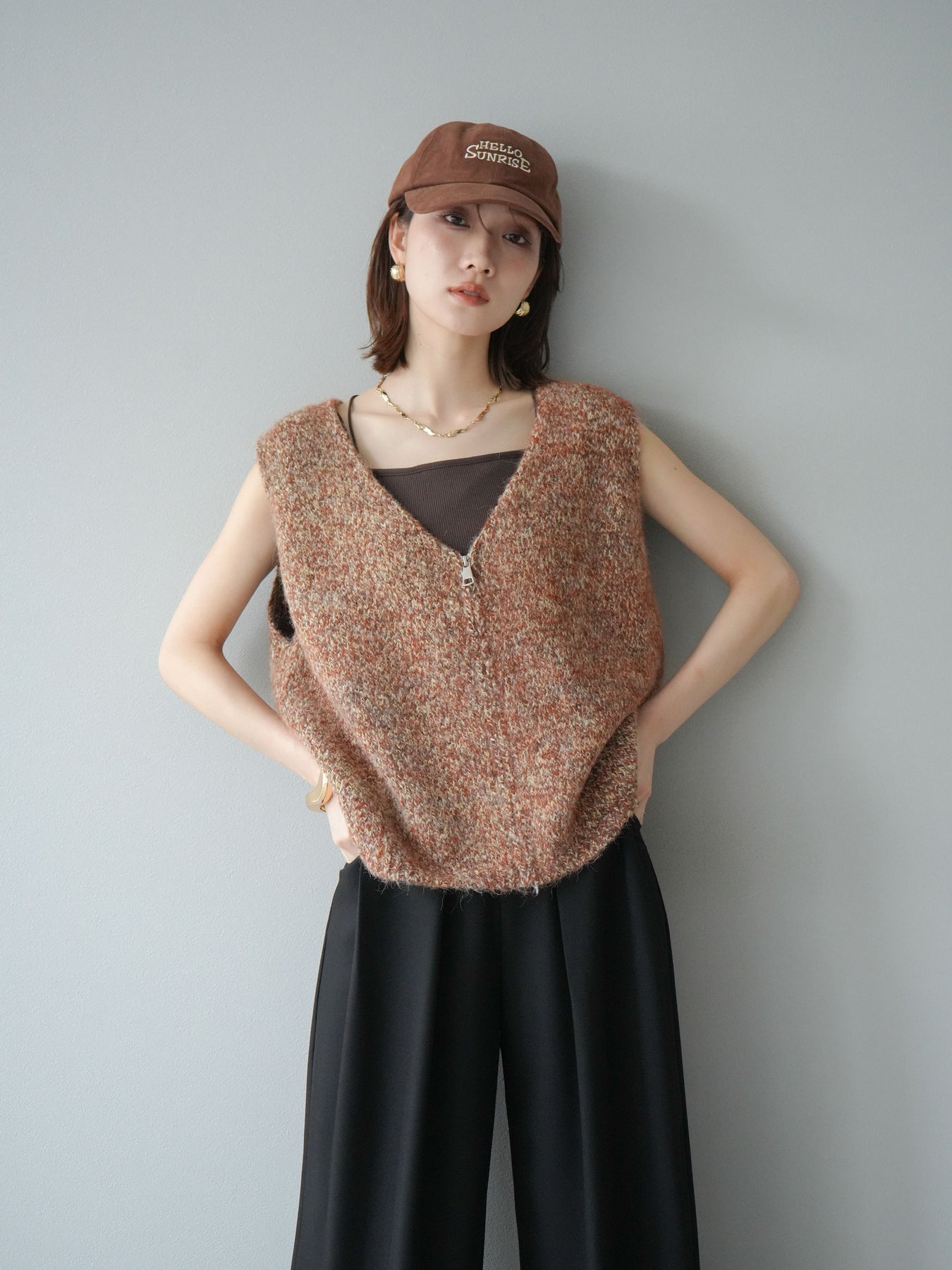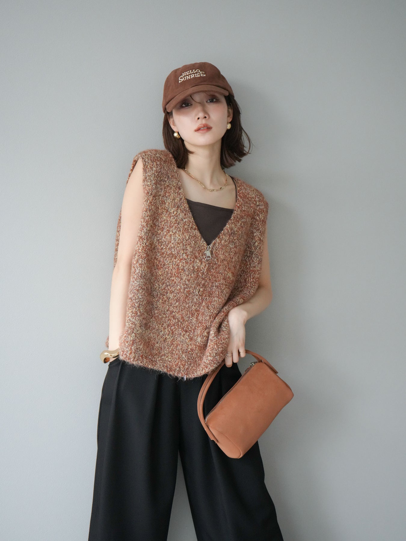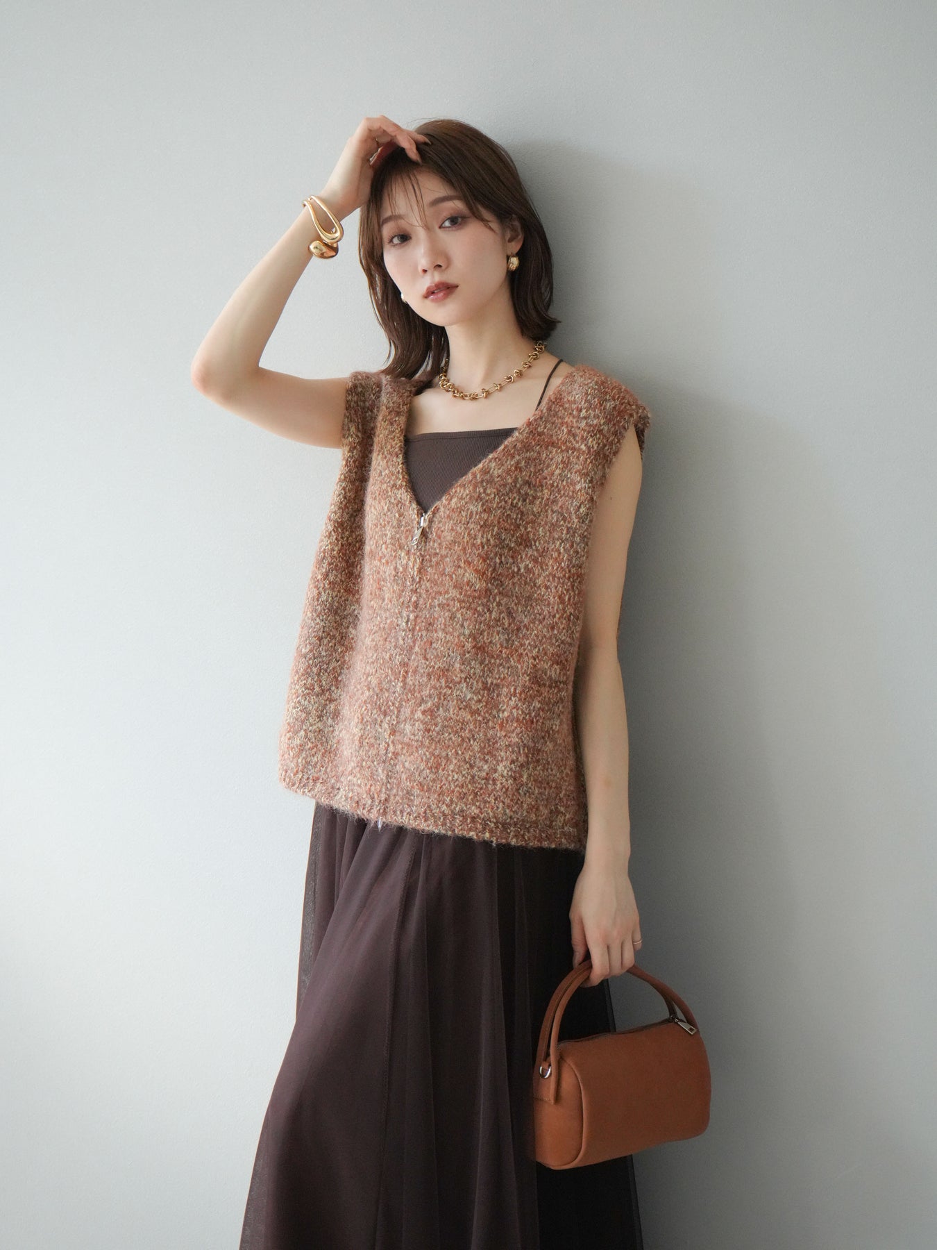色糸をミックスした奥行きのある編地が魅力のニットベスト。フロントに施したZIPディテールがアクセントとなり、カジュアルからモードまで幅広いスタイリングにマッチします。程よくゆとりのあるシルエットでレイヤードがしやすく、シャツやカットソーの上に重ねるだけでトレンド感のある着こなしに。ショート丈寄りのデザインでバランスが取りやすく、ワイドパンツやスカートとも好相性です。季節の変わり目にはライトアウター感覚としても活躍する、着回し力抜群の一枚です。 ※ボトムス、キャミソール(インナー)以外の商品は一律でインナーは付属していません。