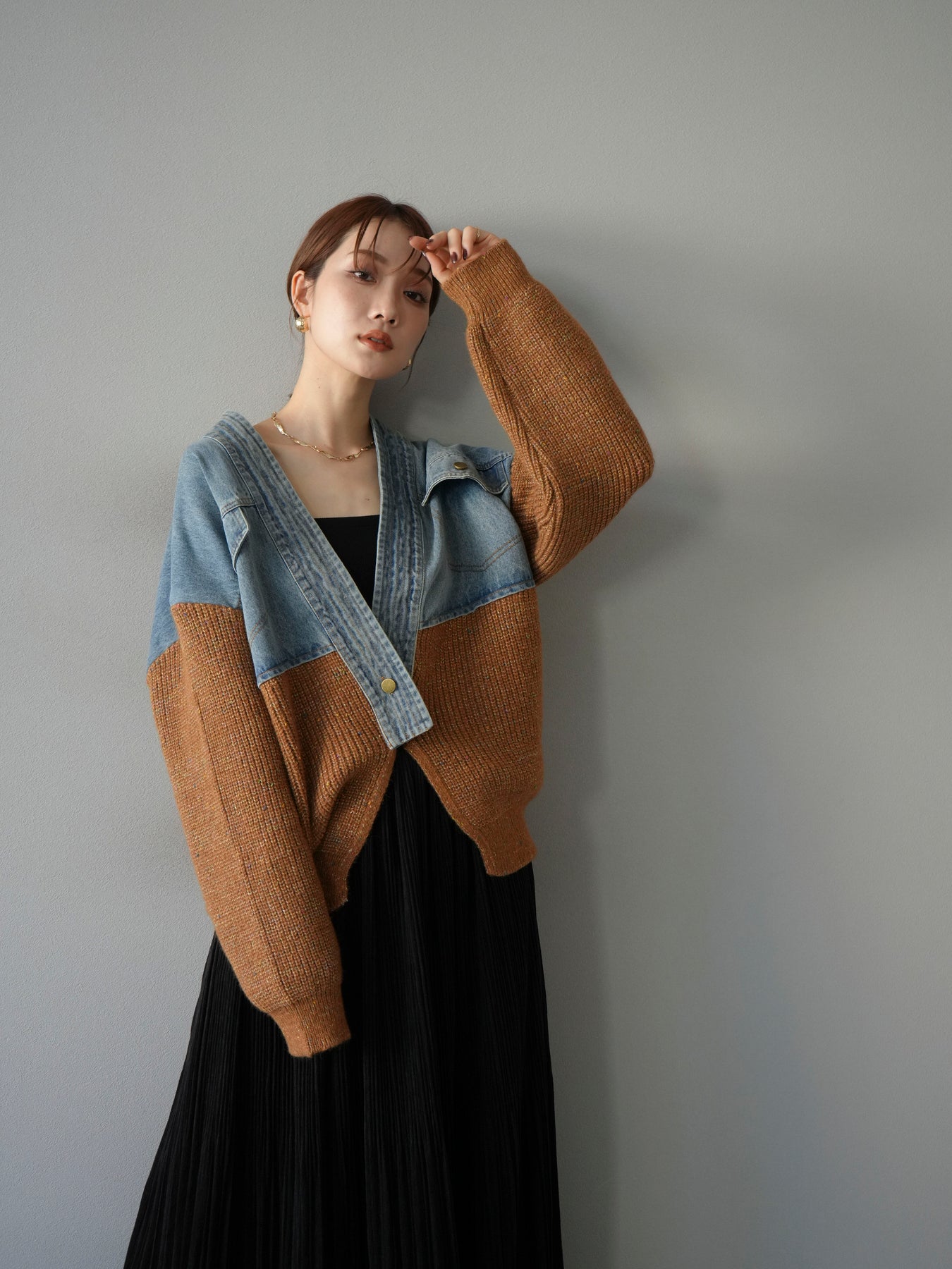 [予約]デニム切替ネップニットカーディガン/キャメル