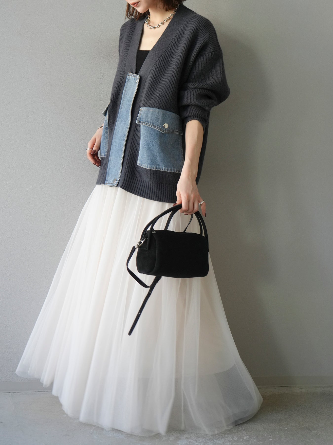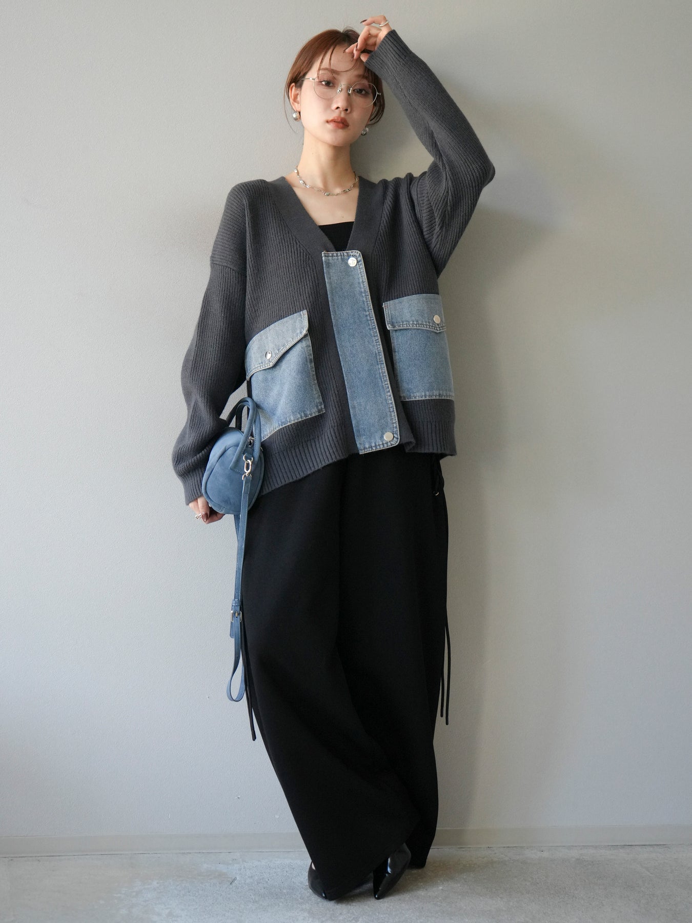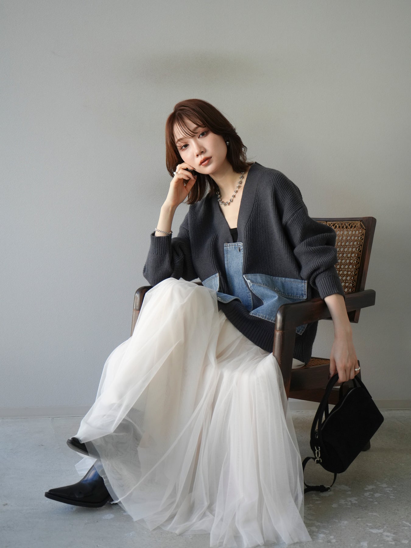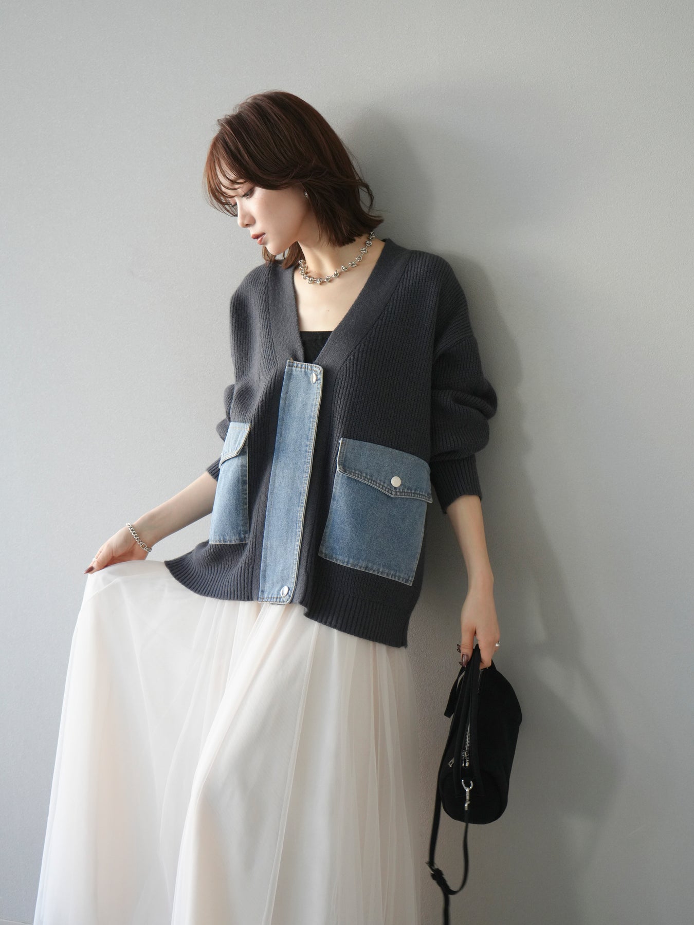 フロントとポケットにデニム素材を切り替えた個性派ニットカーディガン。シンプルなリブ編みニットにデニムディテールをプラスすることで、カジュアルながらも存在感のある一着に仕上がっています。ゆったりとしたシルエットでリラックス感がありつつ、羽織るだけでスタイリングの主役に。パンツやスカートはもちろん、ワンピースに合わせてレイヤードしてもおしゃれに決まります。デイリーコーデに遊び心を加えてくれる万能アイテムです。 ※ボトムス、キャミソール(インナー)以外の商品は一律でインナーは付属していません。