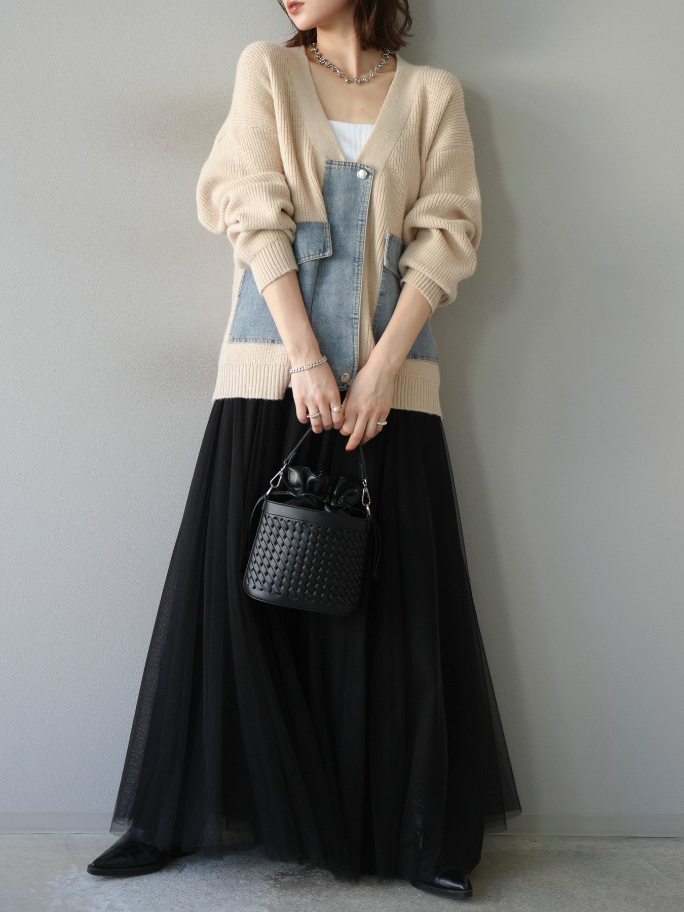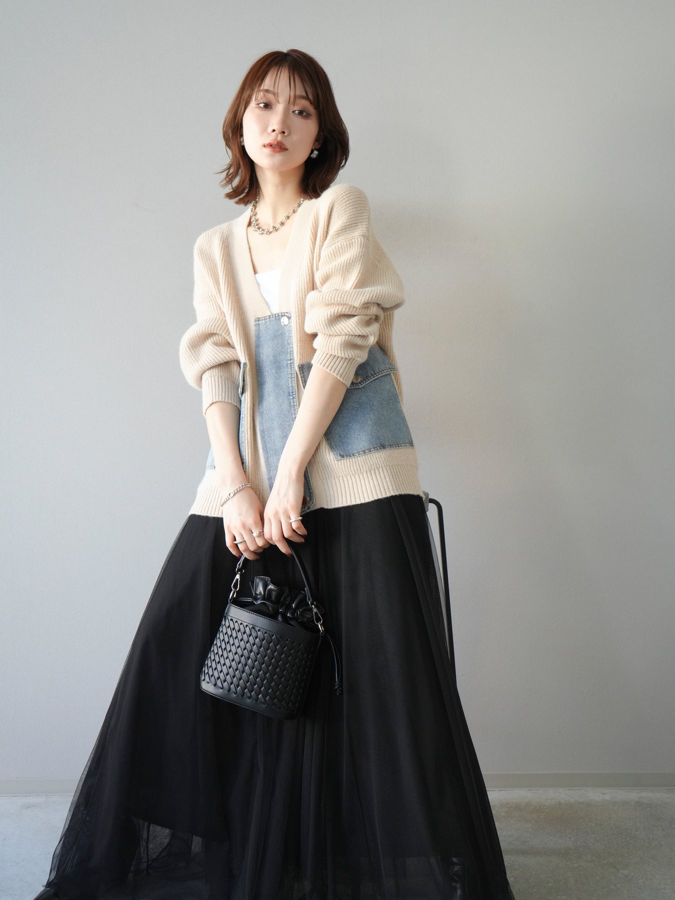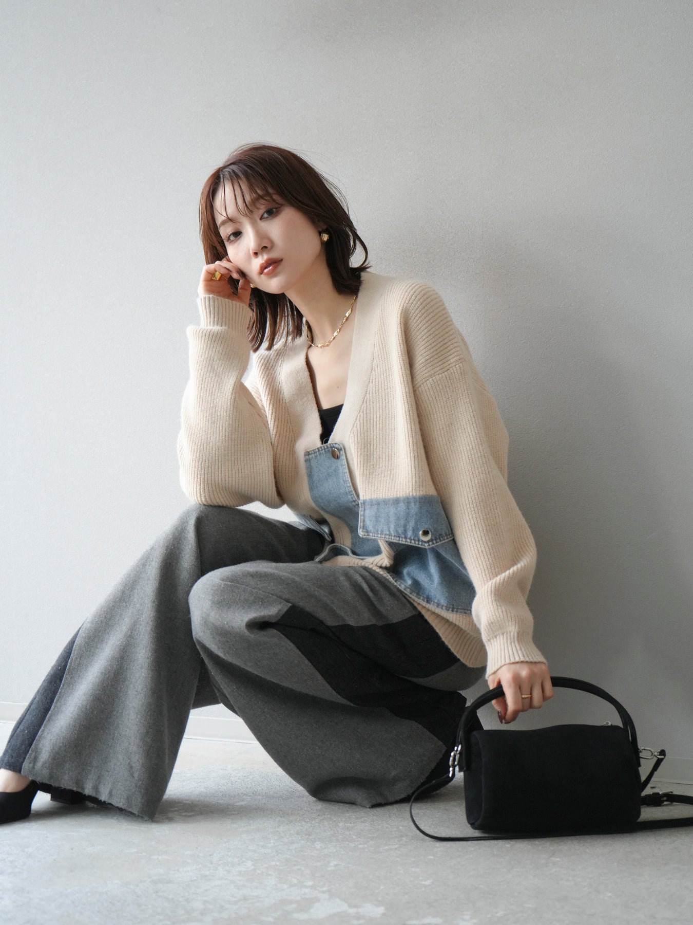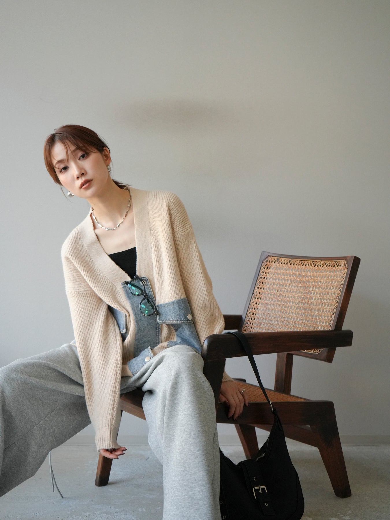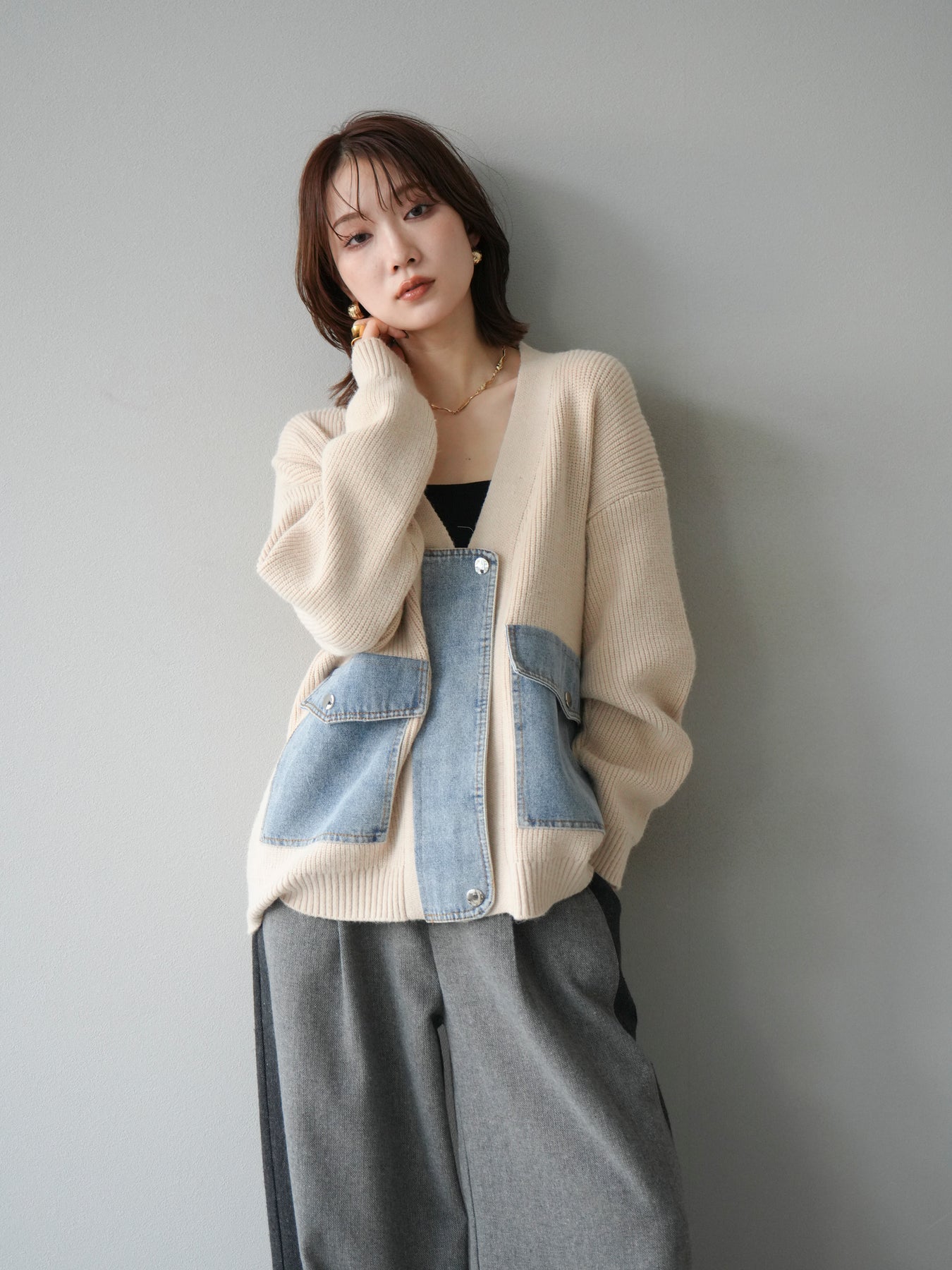 フロントとポケットにデニム素材を切り替えた個性派ニットカーディガン。シンプルなリブ編みニットにデニムディテールをプラスすることで、カジュアルながらも存在感のある一着に仕上がっています。ゆったりとしたシルエットでリラックス感がありつつ、羽織るだけでスタイリングの主役に。パンツやスカートはもちろん、ワンピースに合わせてレイヤードしてもおしゃれに決まります。デイリーコーデに遊び心を加えてくれる万能アイテムです。 ※ボトムス、キャミソール(インナー)以外の商品は一律でインナーは付属していません。