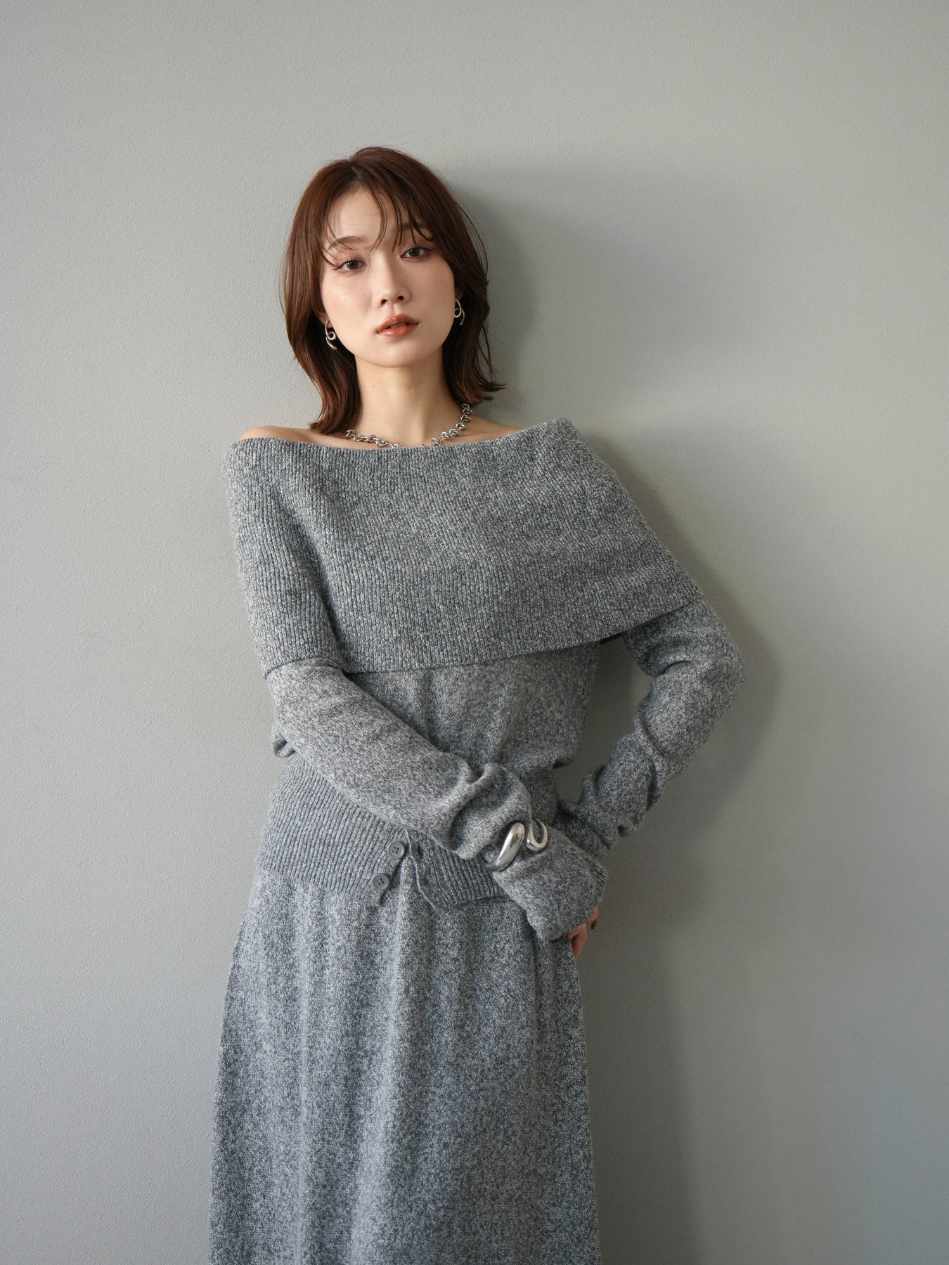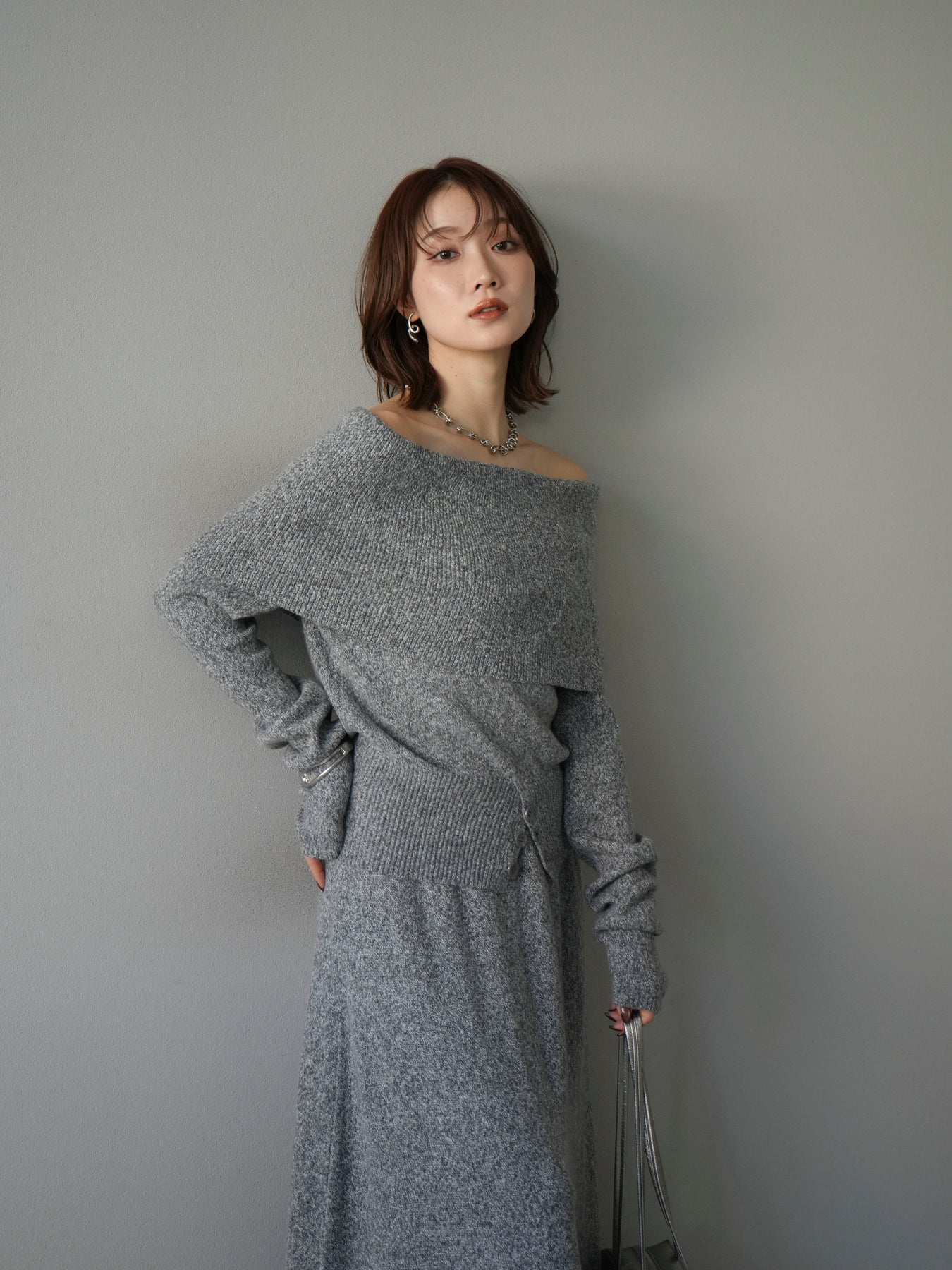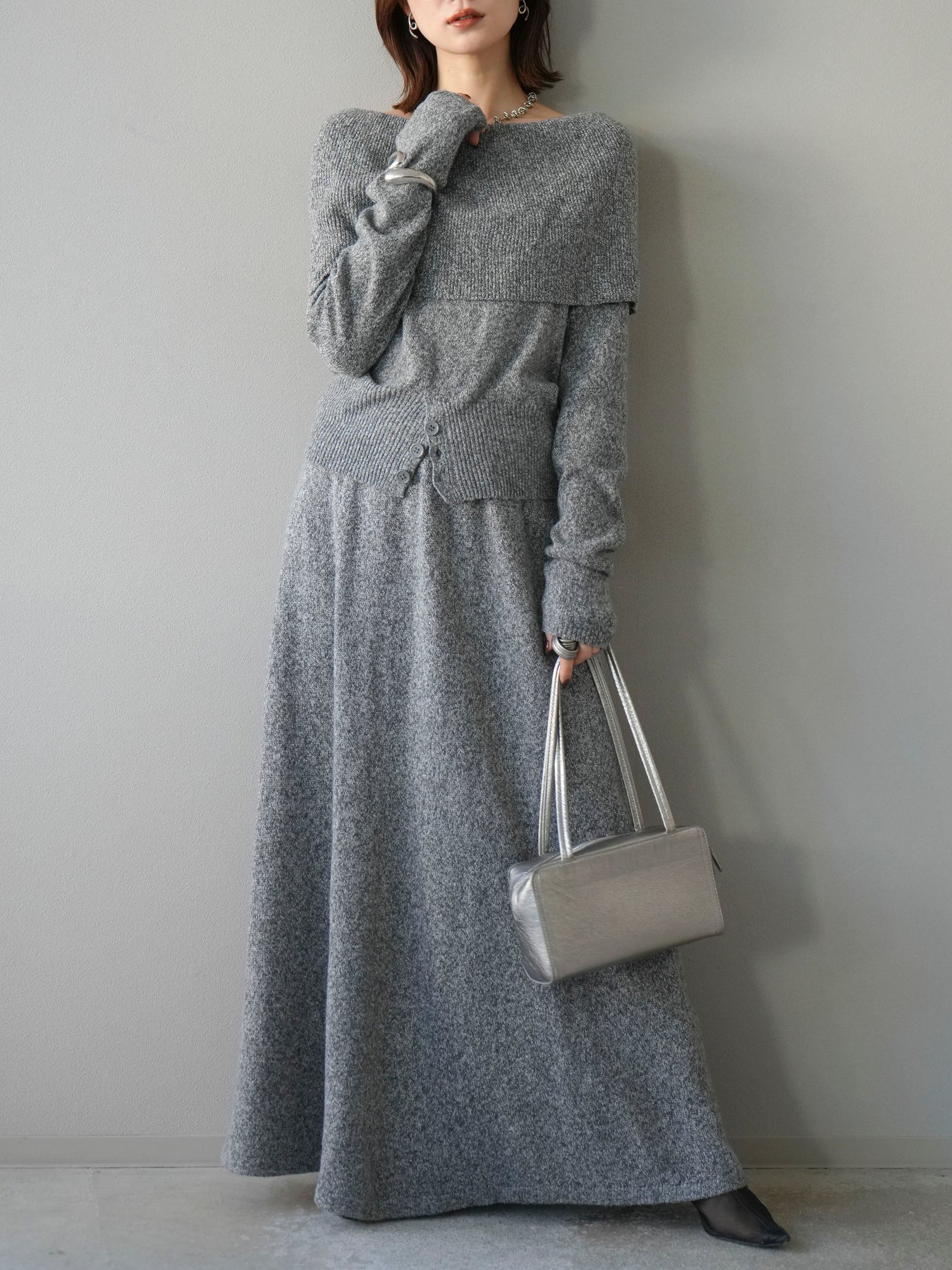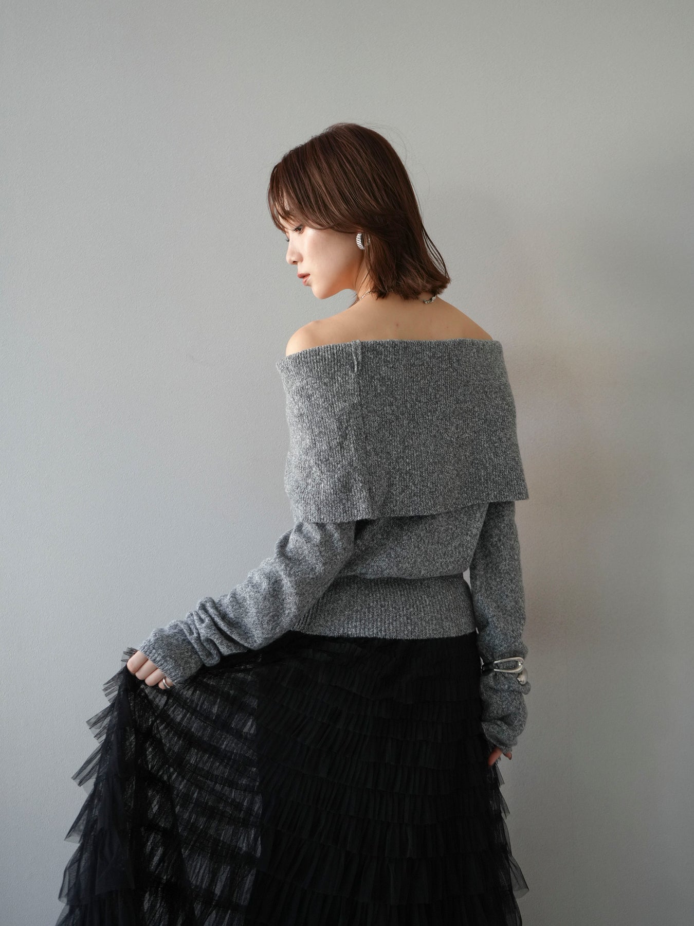 [予約]ミックスヤーンオフショルニットプルオーバー/グレー