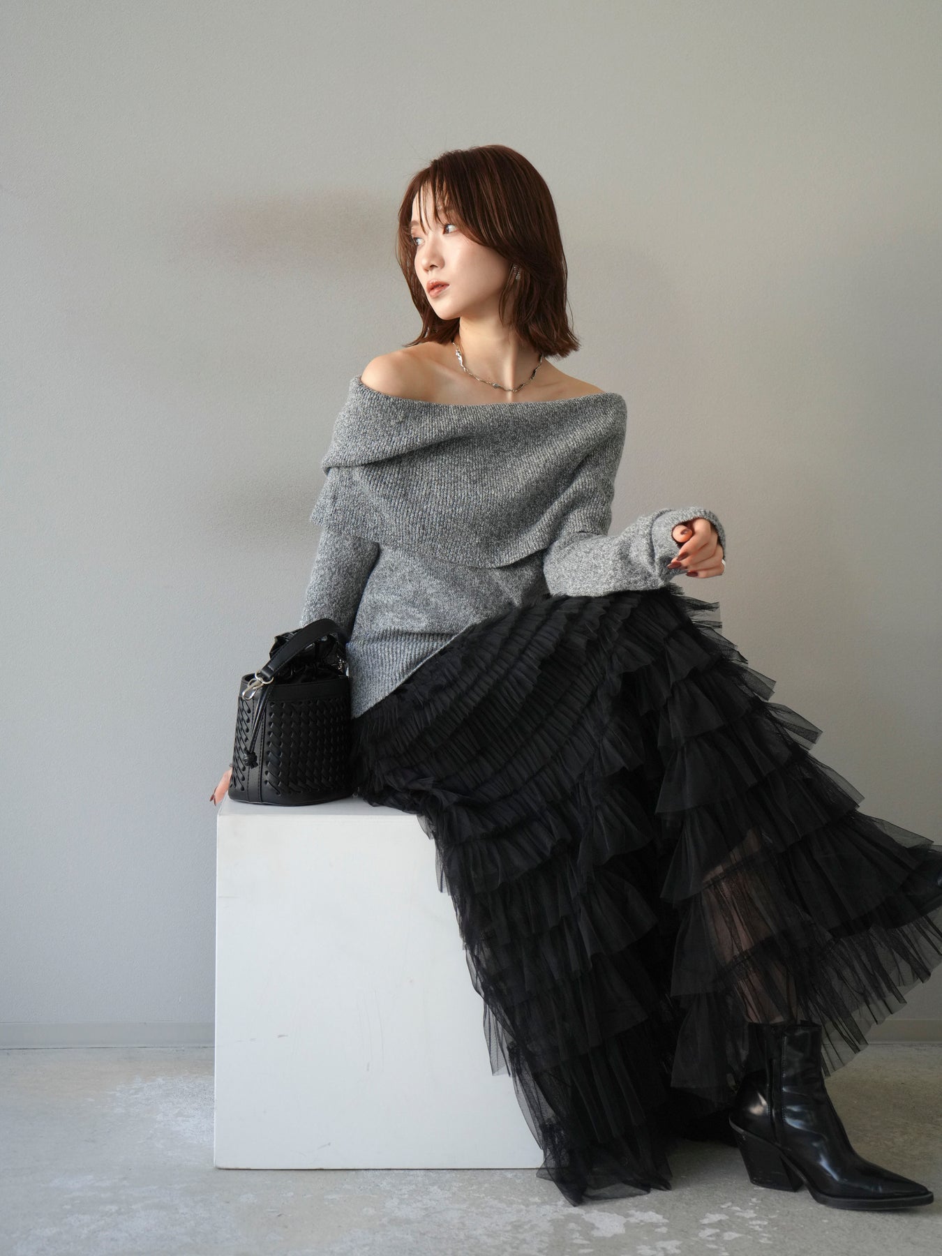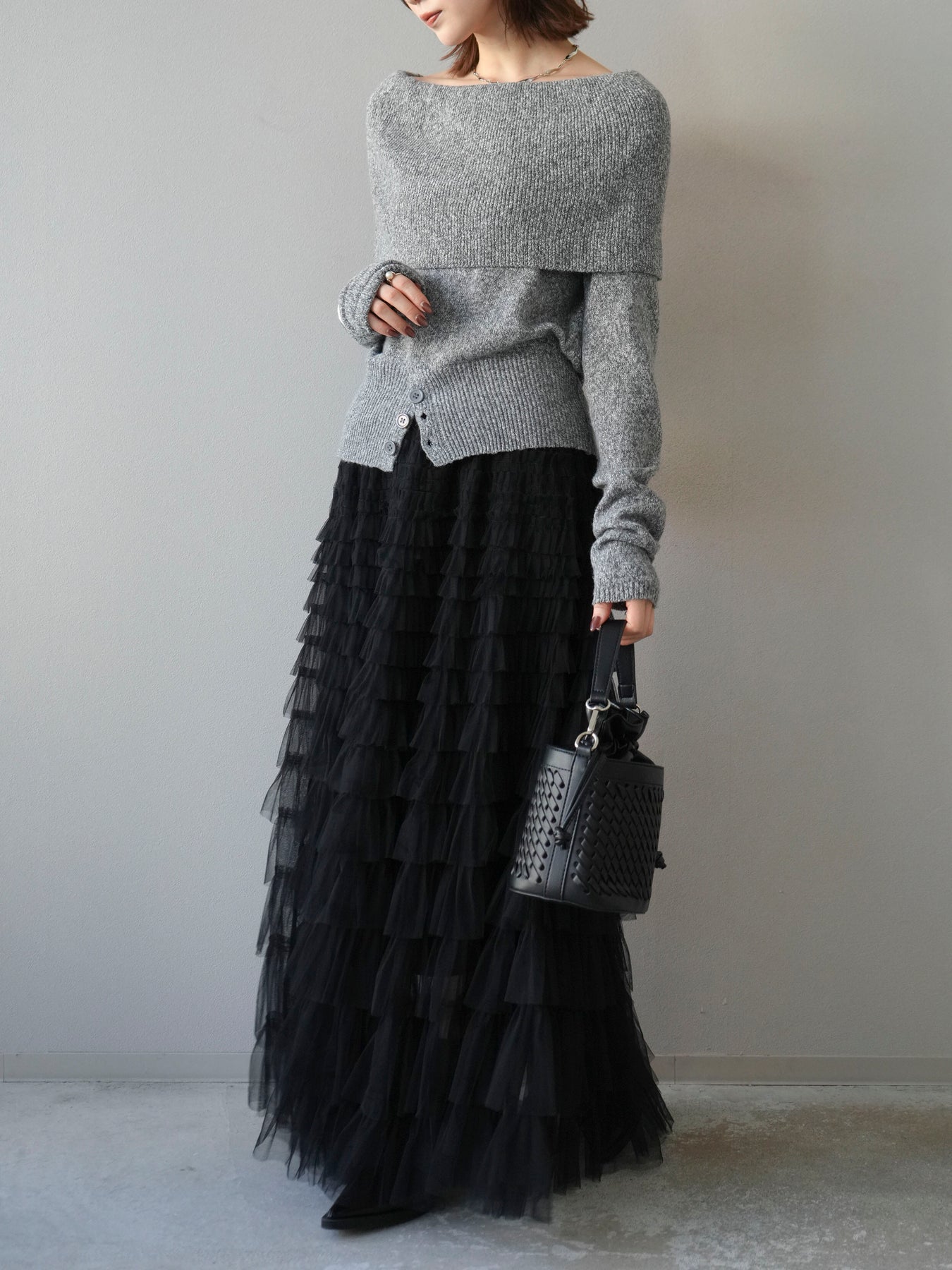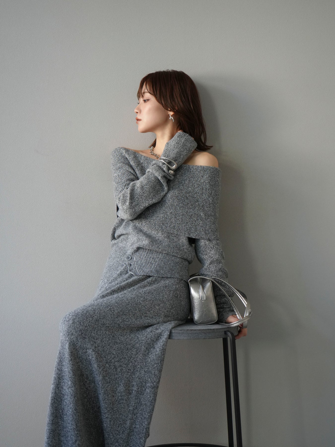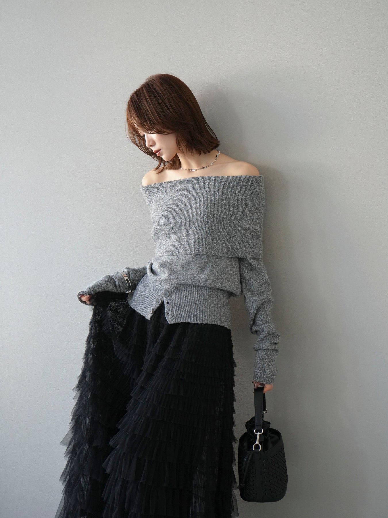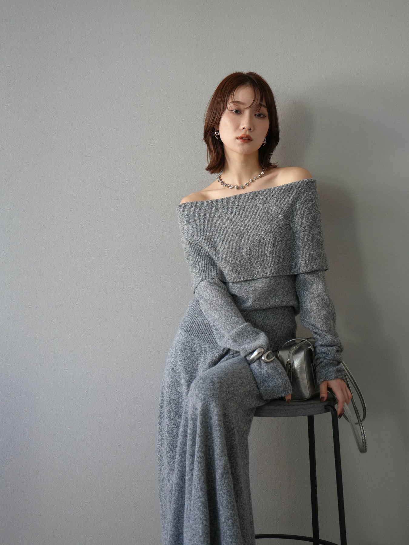 [予約]ミックスヤーンオフショルニットプルオーバー/グレー