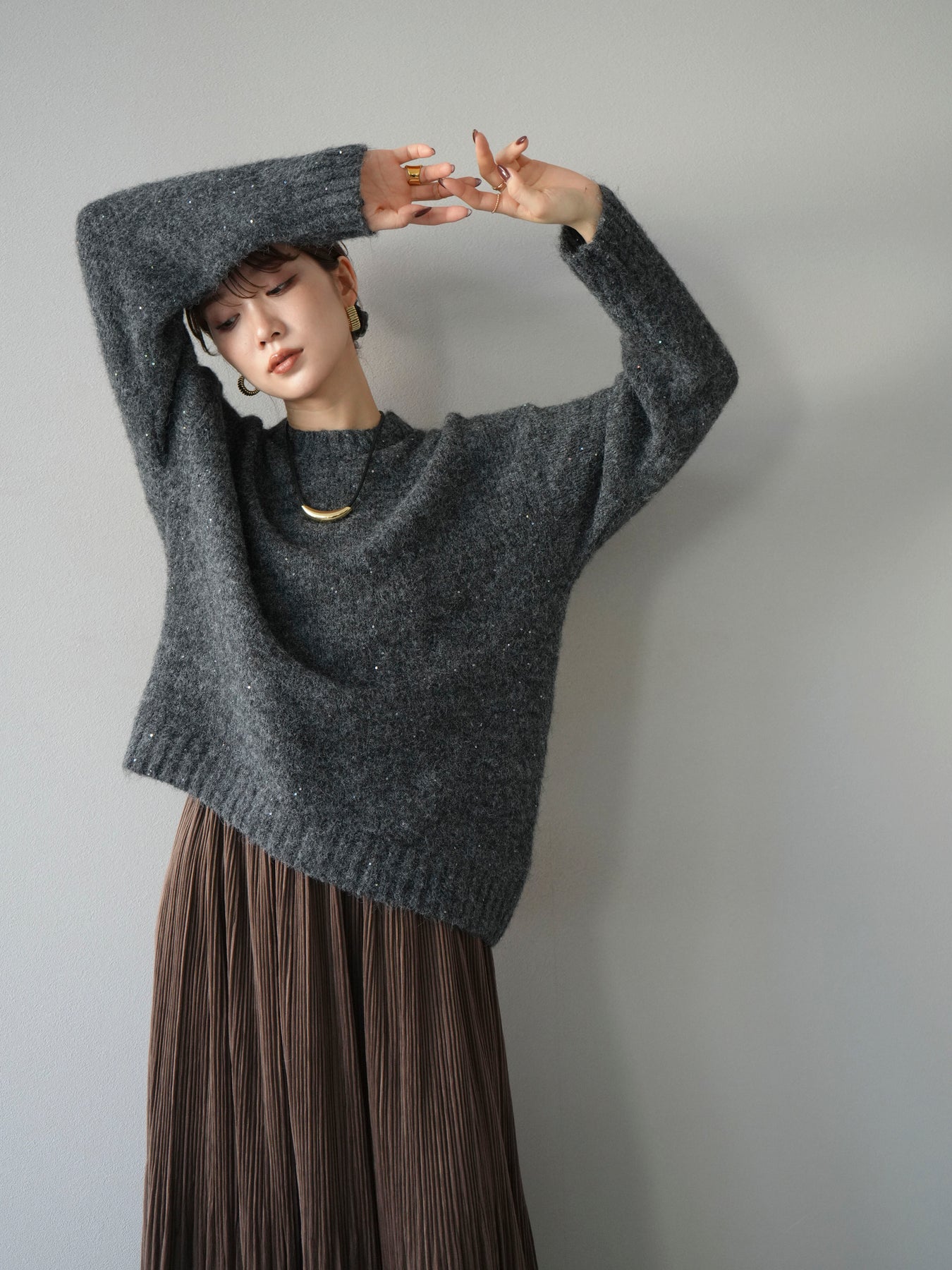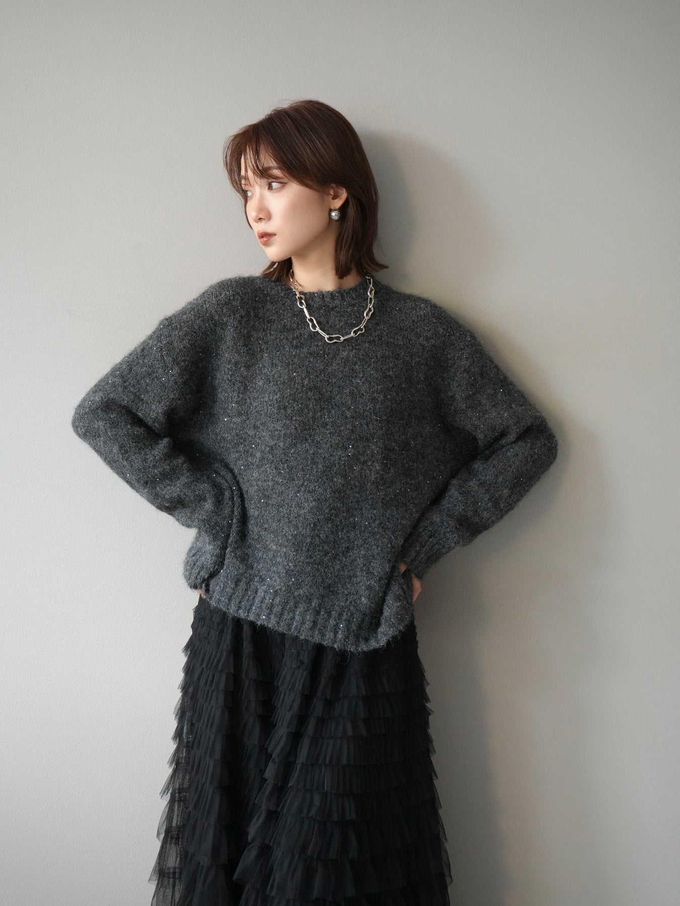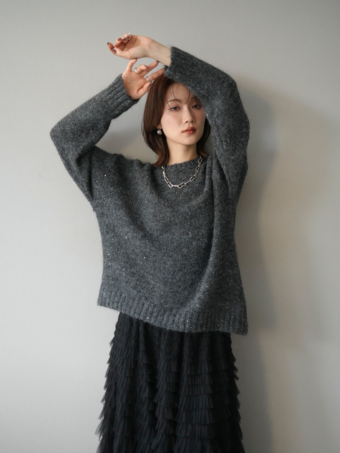 ふんわりとした風合いのニットにスパンコールを散りばめた、華やかさのあるプルオーバー。シンプルなシルエットながら、光の加減でさりげなく輝くスパンコールがコーディネートに女性らしいアクセントをプラスします。ゆとりのあるサイズ感でリラックスした着心地を叶えつつ、デイリーから特別なお出かけシーンまで活躍。パンツと合わせてカジュアルに、スカートと合わせてフェミニンにと幅広い着こなしが楽しめる一着です。 ※ボトムス、キャミソール(インナー)以外の商品は一律でインナーは付属していません。