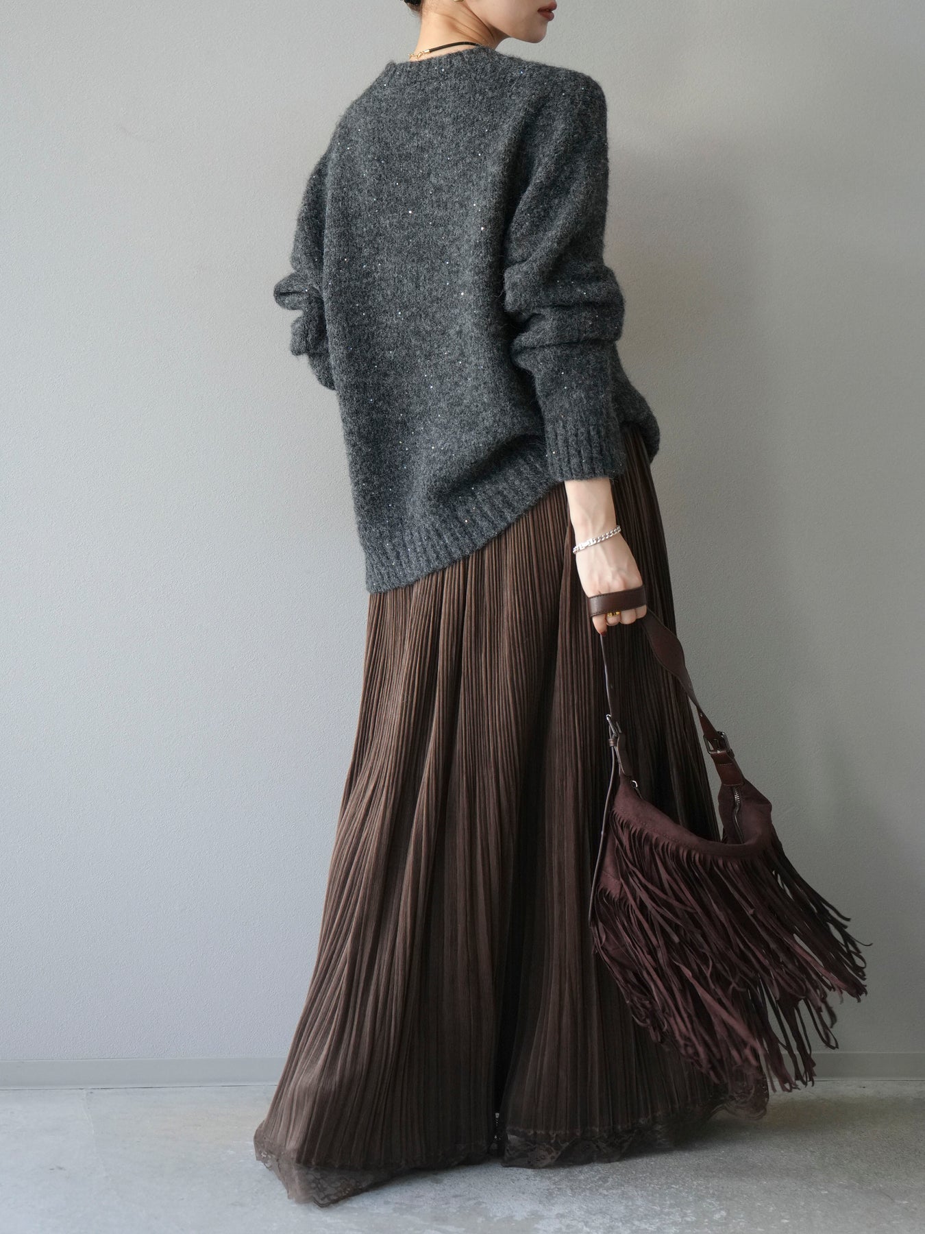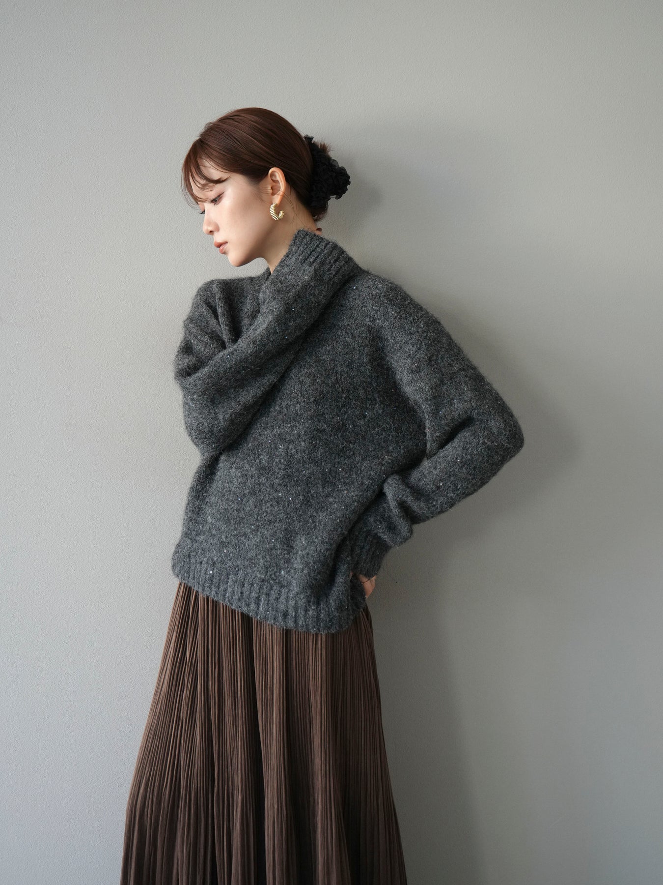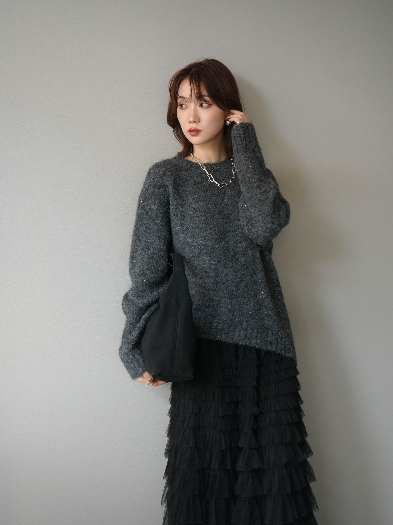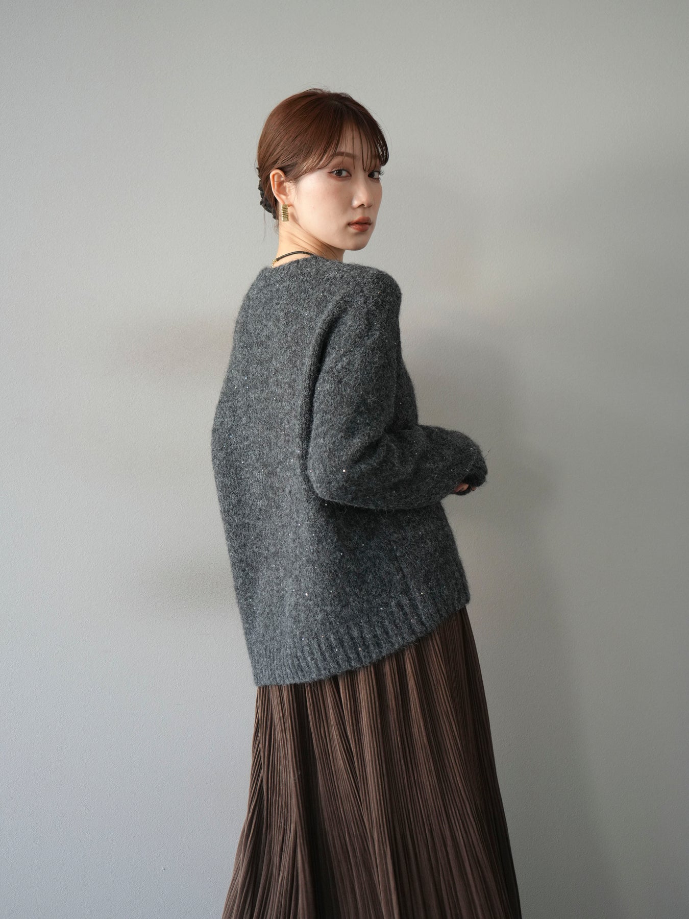 ふんわりとした風合いのニットにスパンコールを散りばめた、華やかさのあるプルオーバー。シンプルなシルエットながら、光の加減でさりげなく輝くスパンコールがコーディネートに女性らしいアクセントをプラスします。ゆとりのあるサイズ感でリラックスした着心地を叶えつつ、デイリーから特別なお出かけシーンまで活躍。パンツと合わせてカジュアルに、スカートと合わせてフェミニンにと幅広い着こなしが楽しめる一着です。 ※ボトムス、キャミソール(インナー)以外の商品は一律でインナーは付属していません。