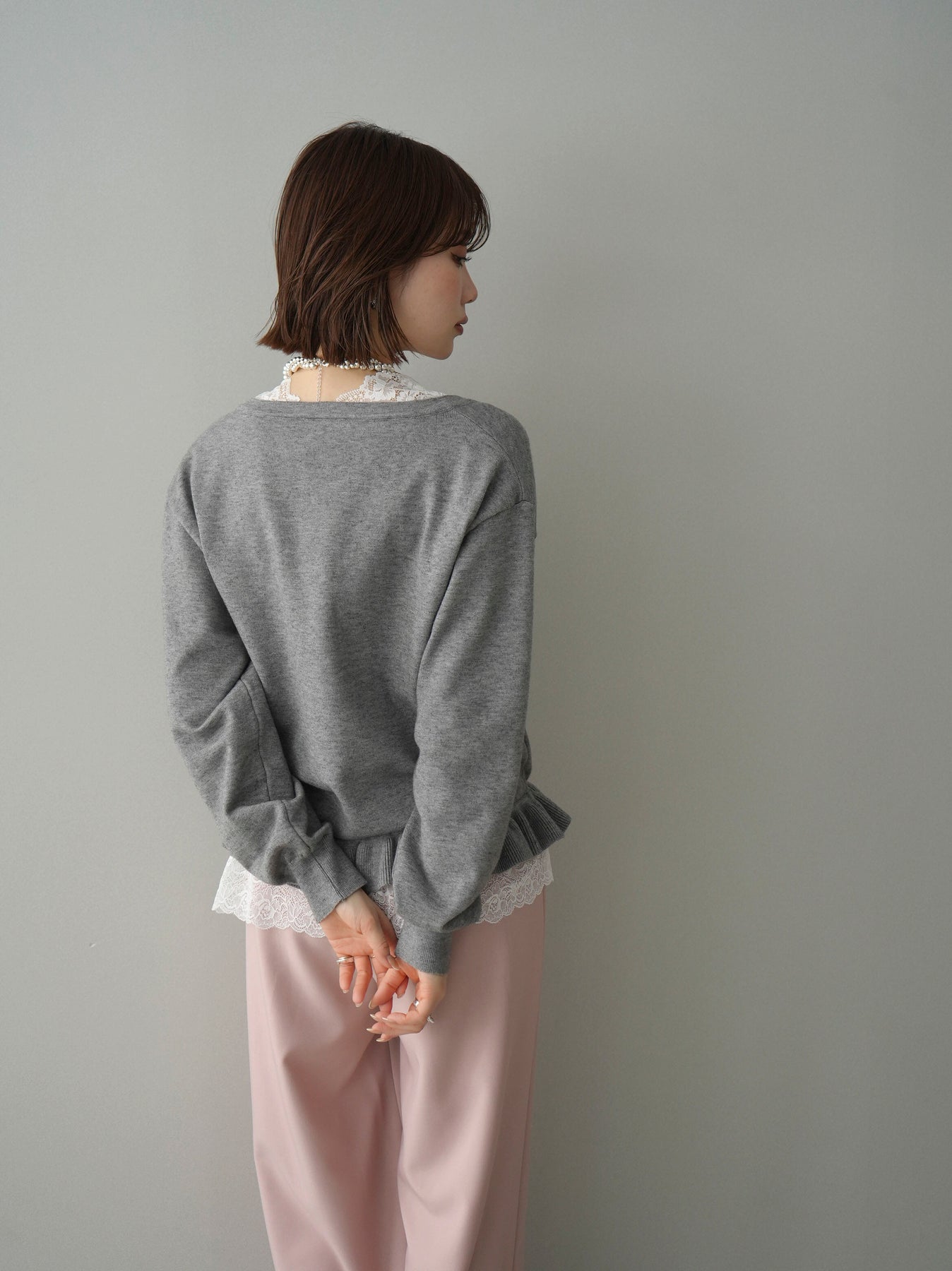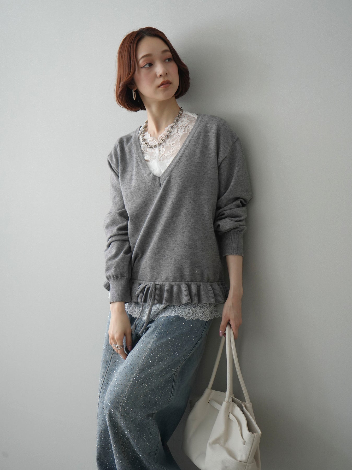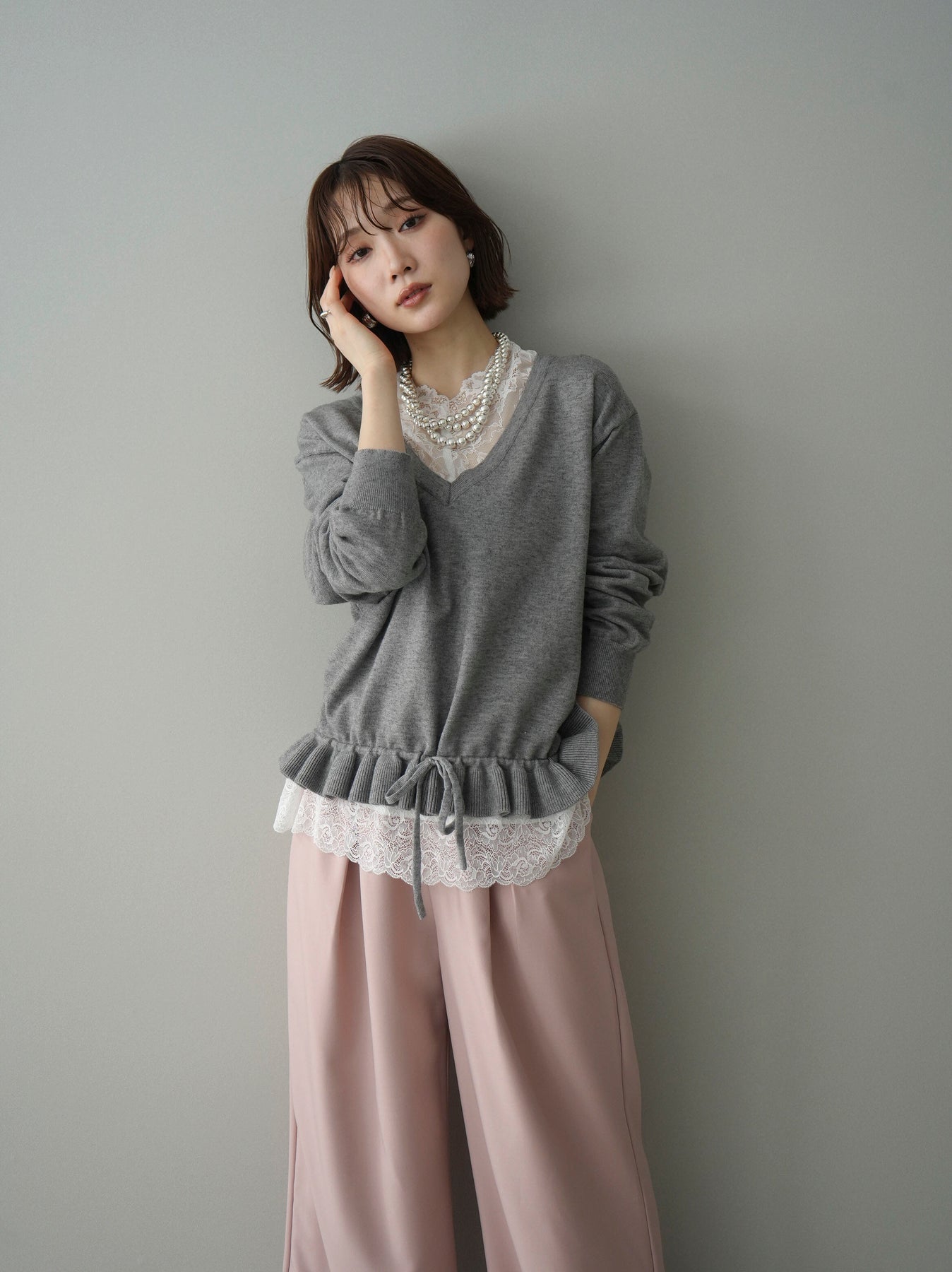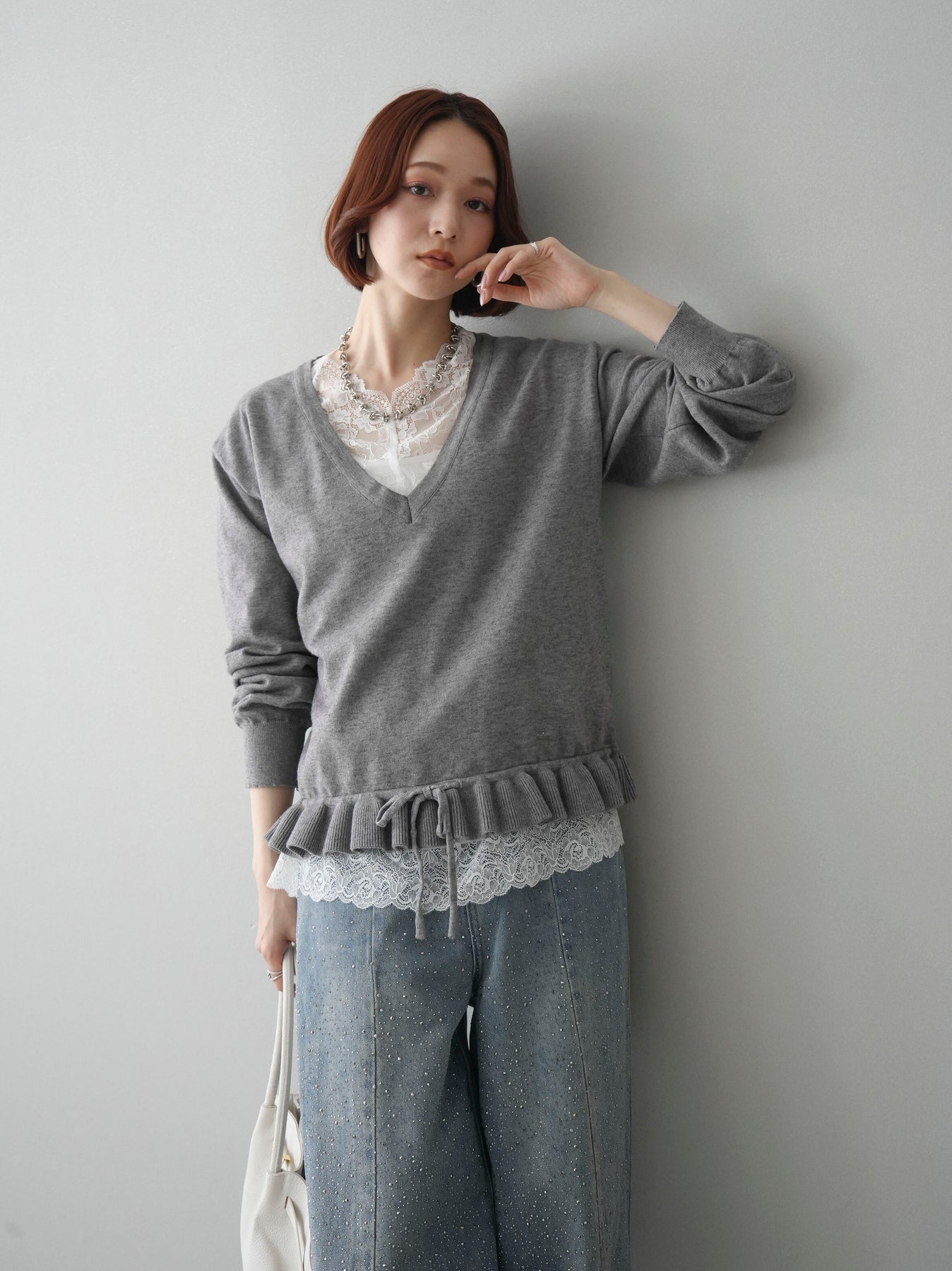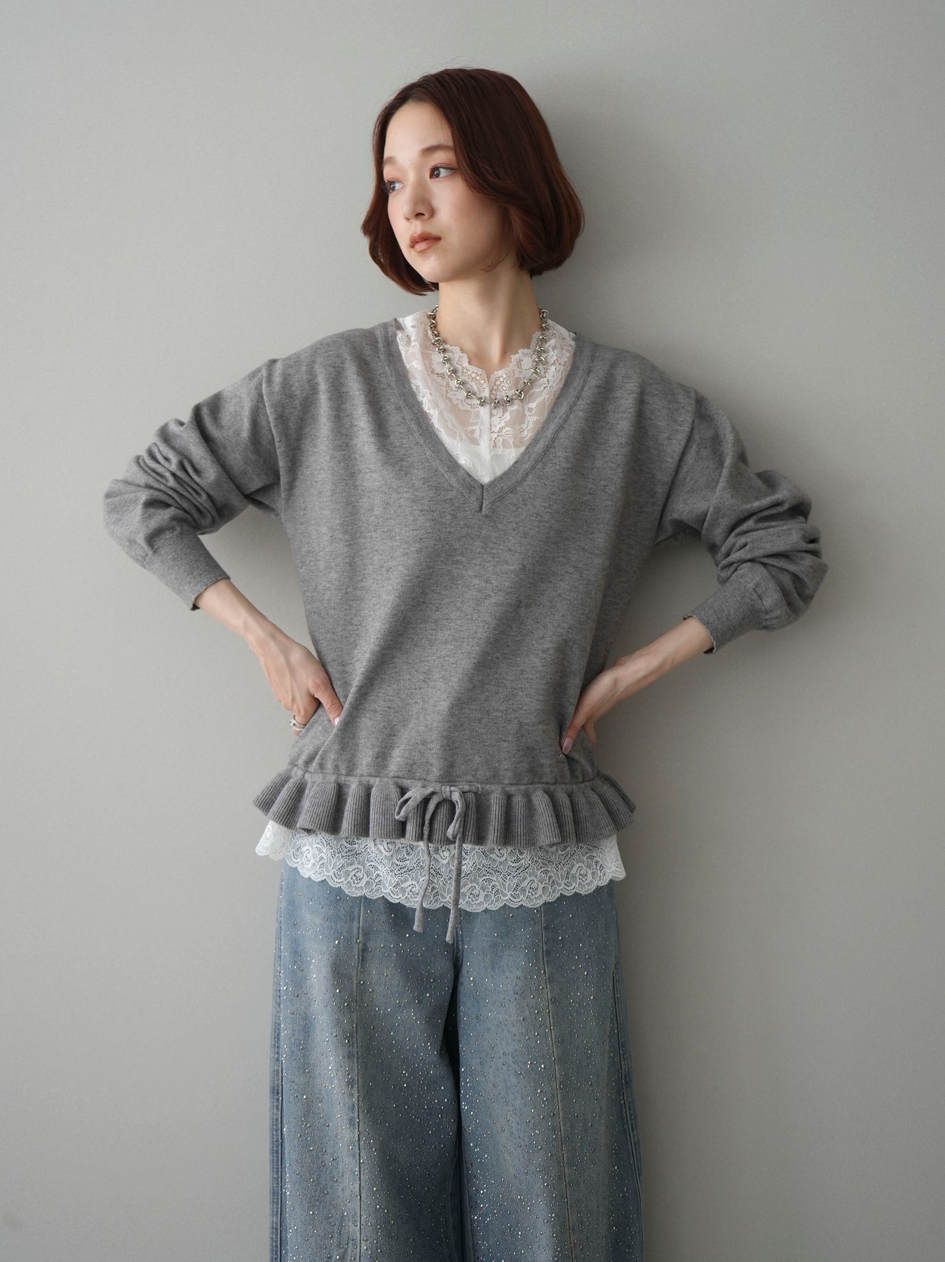 繊細なレースインナーとニットをレイヤードした、女性らしさが引き立つアンサンブル。深めのVネックから覗くレースが顔まわりを華やかに演出し、裾からさりげなく見えるレースデザインがスタイリングに奥行きをプラスします。ニットは程よくゆとりのあるシルエットで抜け感があり、単品使いでも着回しやすい一着。デニムでカジュアルに、スラックスやスカートで上品にと幅広いコーディネートが楽しめます。