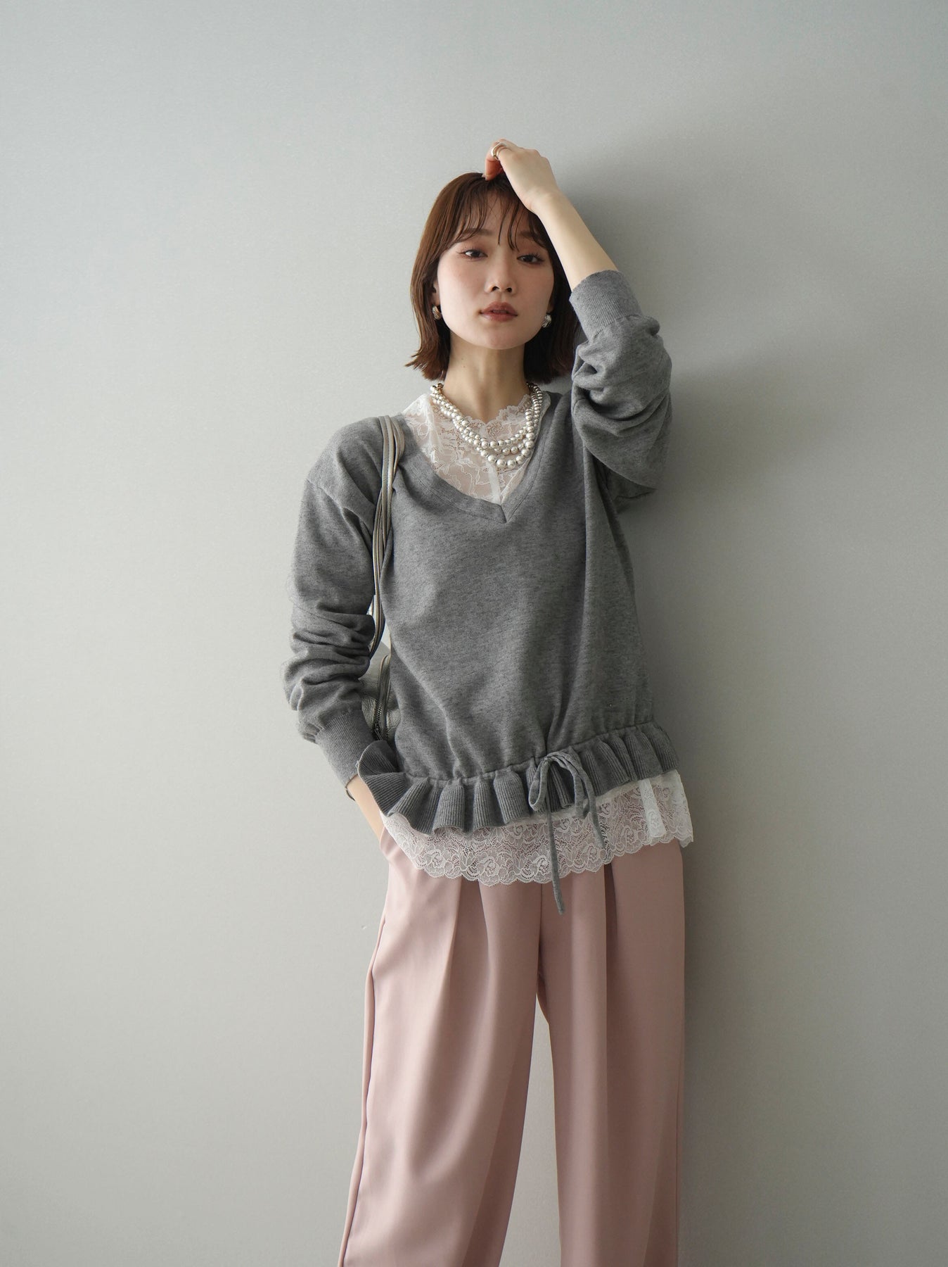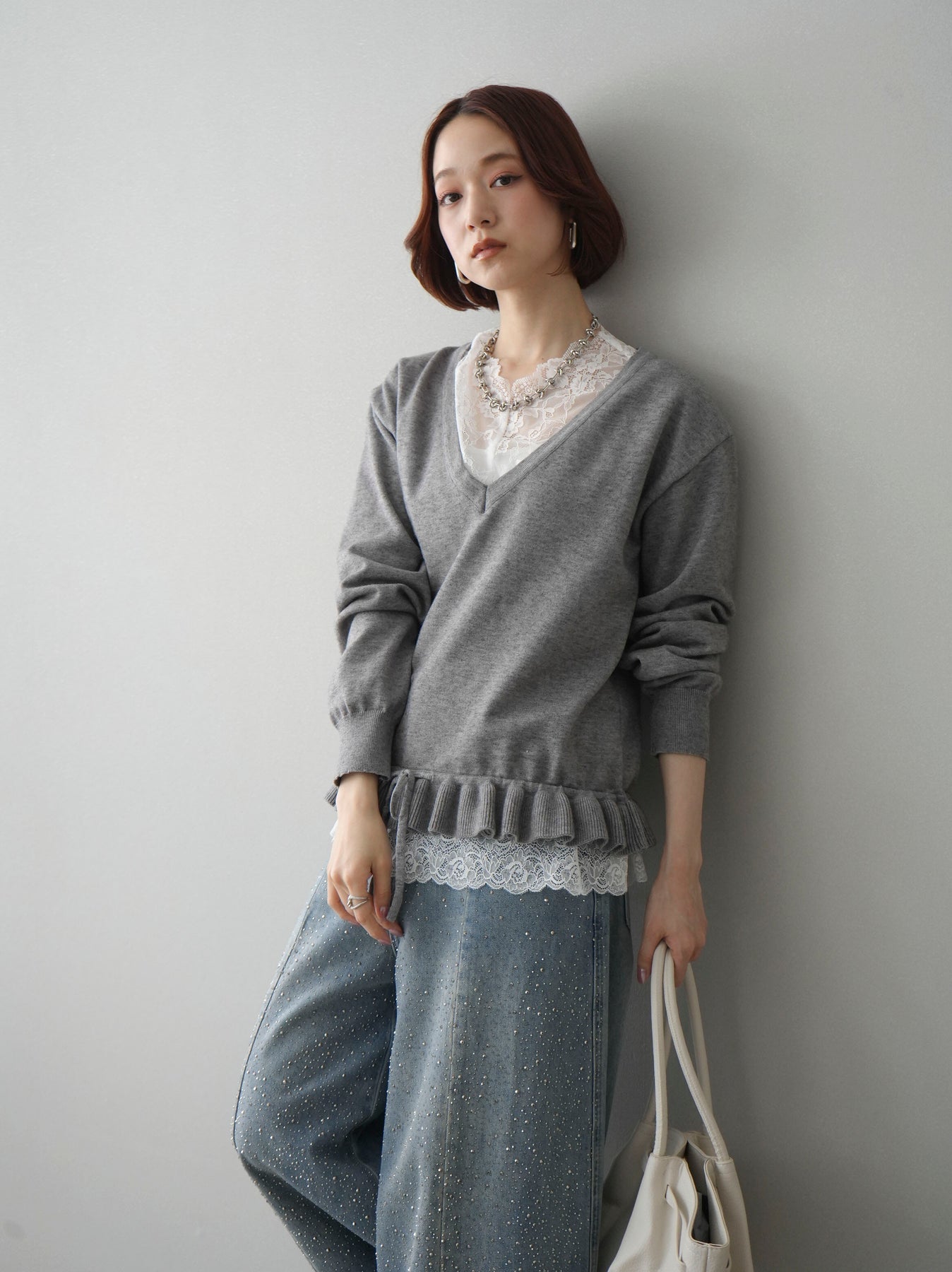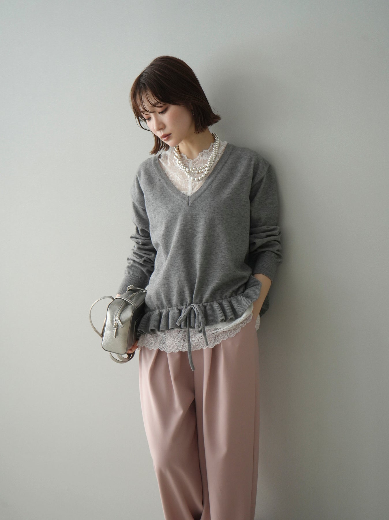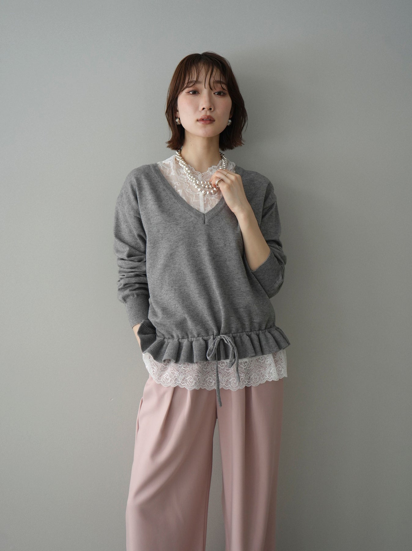 繊細なレースインナーとニットをレイヤードした、女性らしさが引き立つアンサンブル。深めのVネックから覗くレースが顔まわりを華やかに演出し、裾からさりげなく見えるレースデザインがスタイリングに奥行きをプラスします。ニットは程よくゆとりのあるシルエットで抜け感があり、単品使いでも着回しやすい一着。デニムでカジュアルに、スラックスやスカートで上品にと幅広いコーディネートが楽しめます。