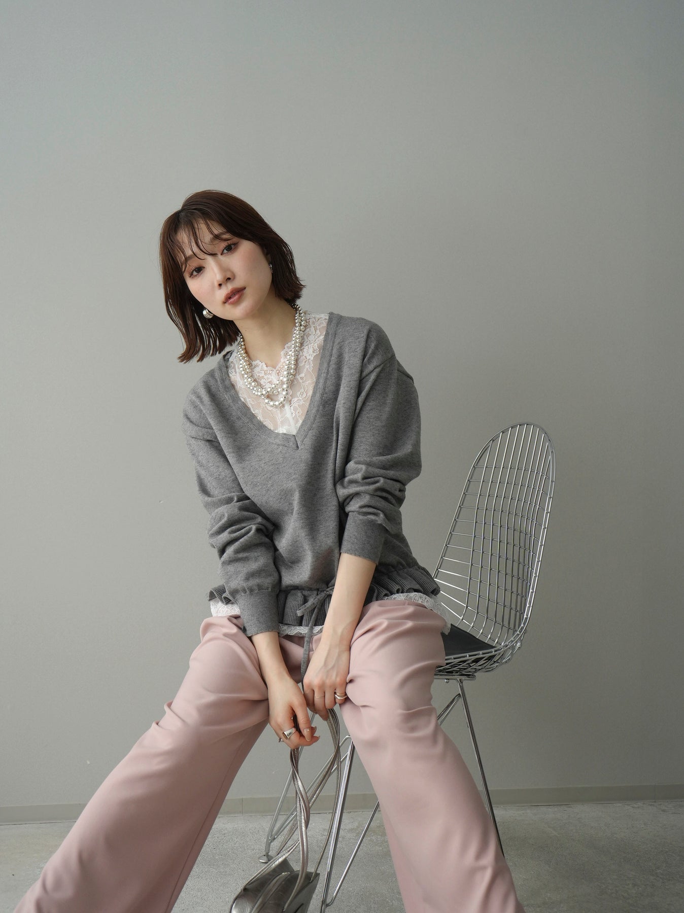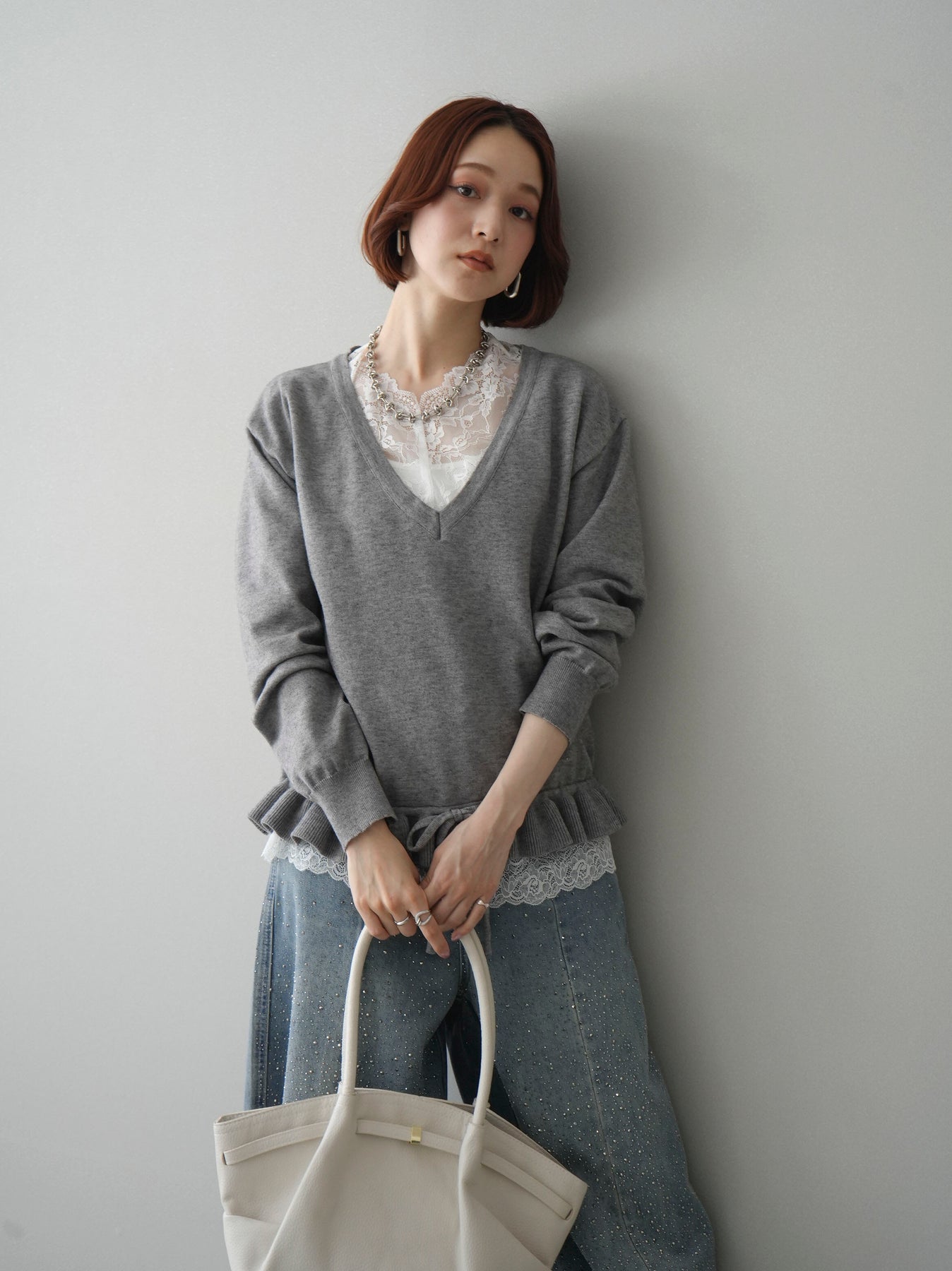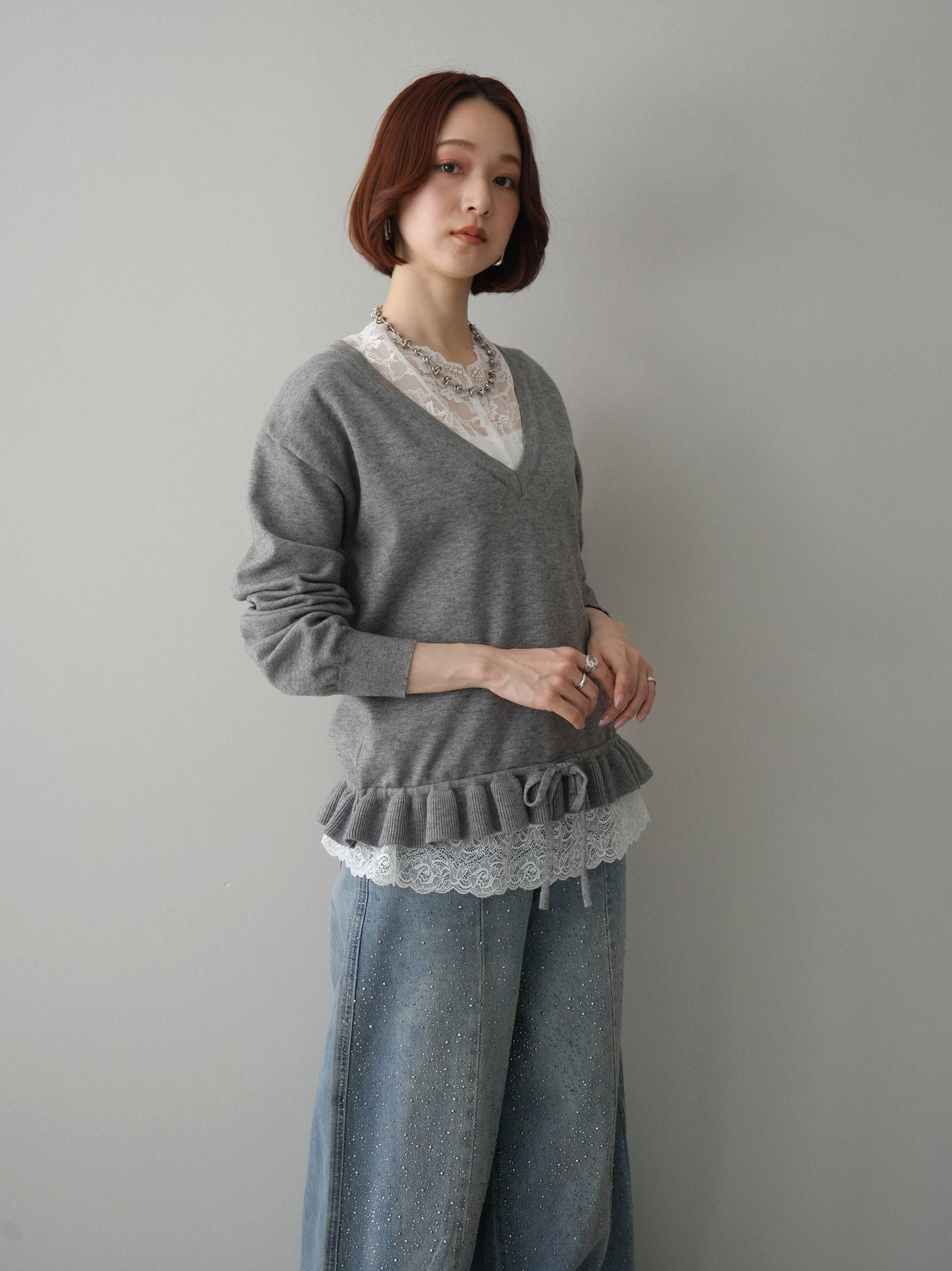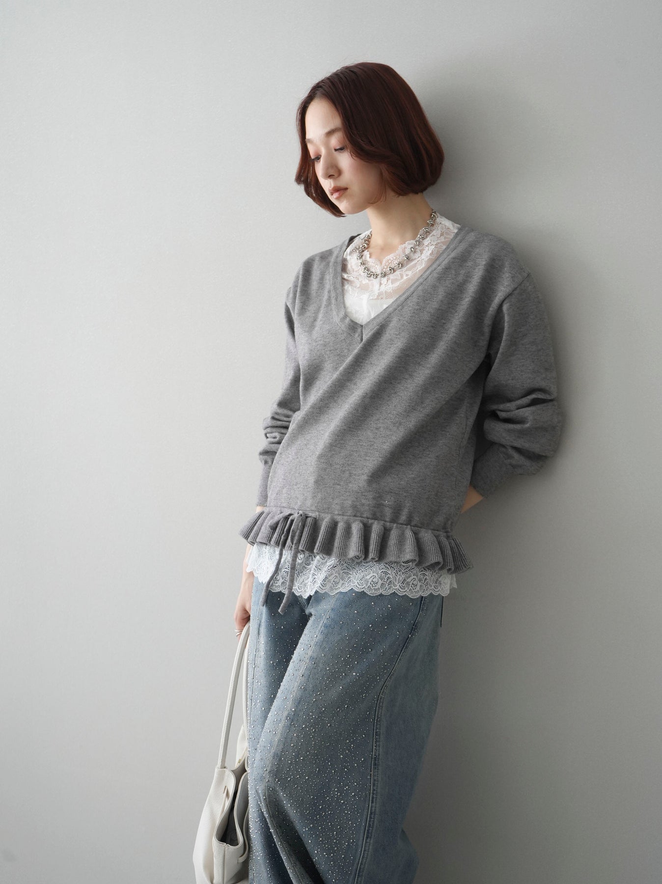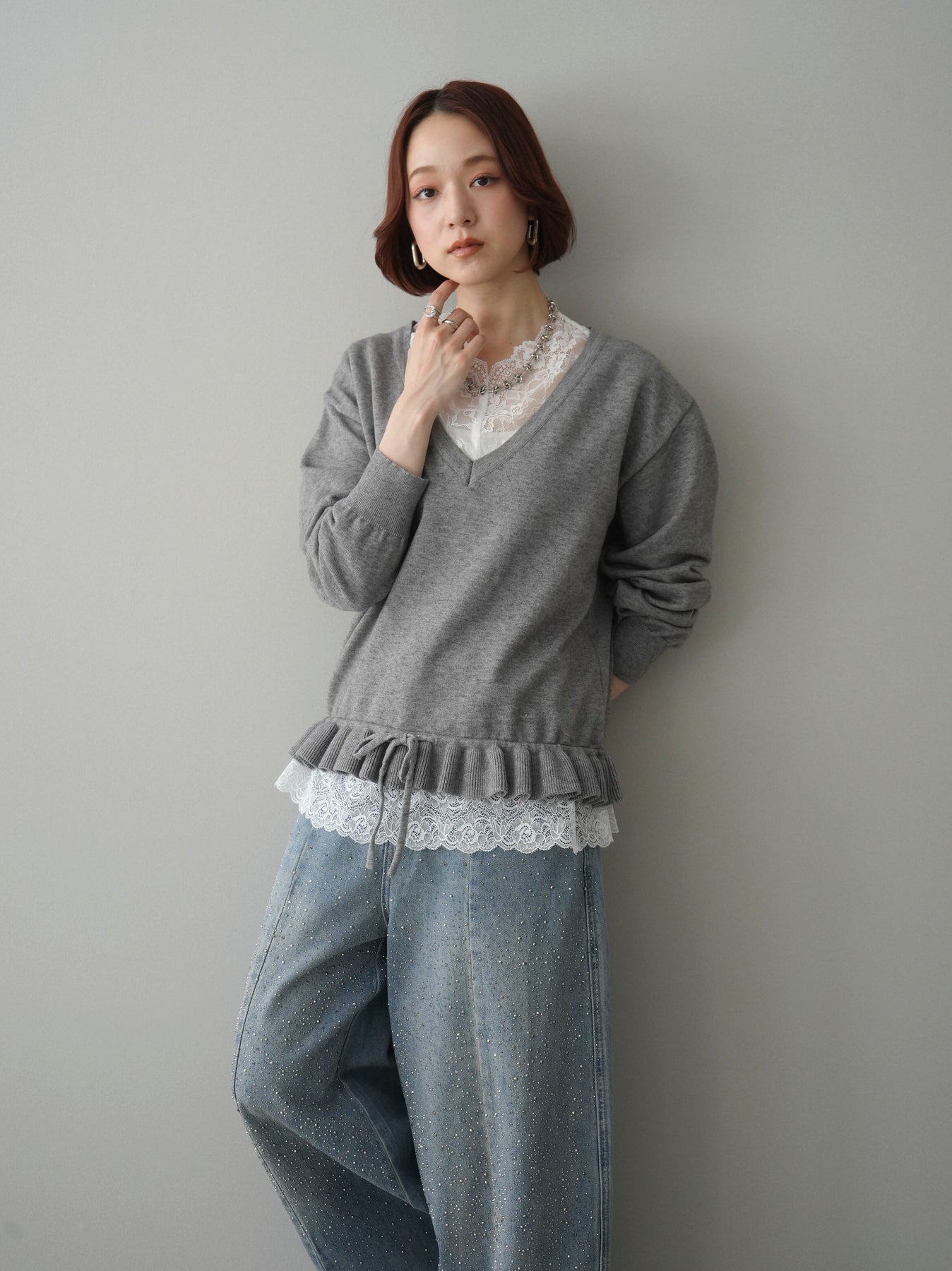 繊細なレースインナーとニットをレイヤードした、女性らしさが引き立つアンサンブル。深めのVネックから覗くレースが顔まわりを華やかに演出し、裾からさりげなく見えるレースデザインがスタイリングに奥行きをプラスします。ニットは程よくゆとりのあるシルエットで抜け感があり、単品使いでも着回しやすい一着。デニムでカジュアルに、スラックスやスカートで上品にと幅広いコーディネートが楽しめます。