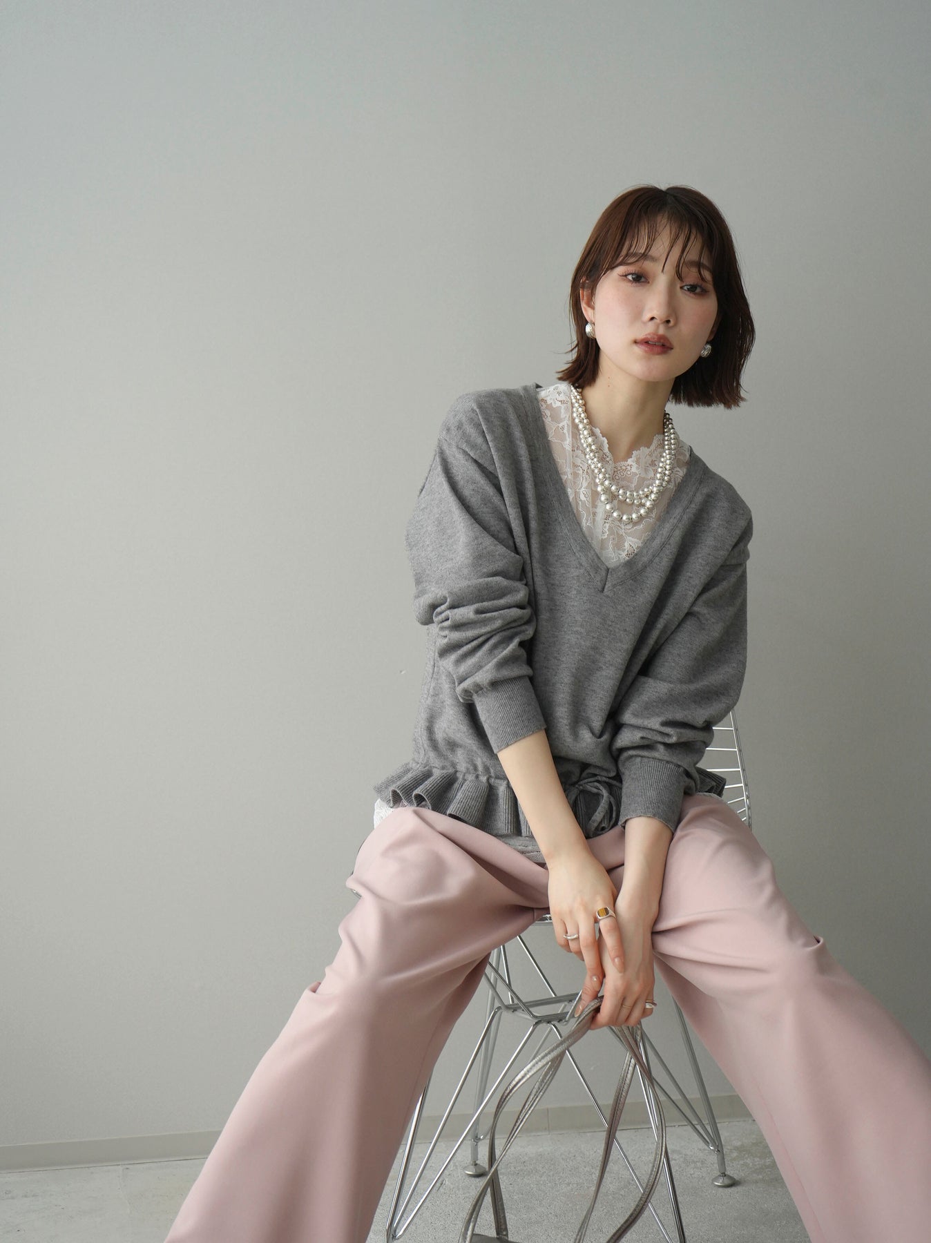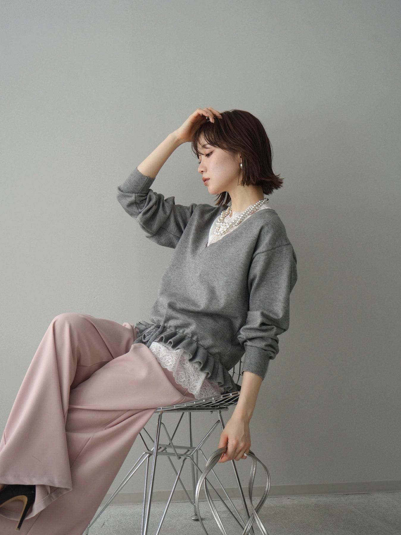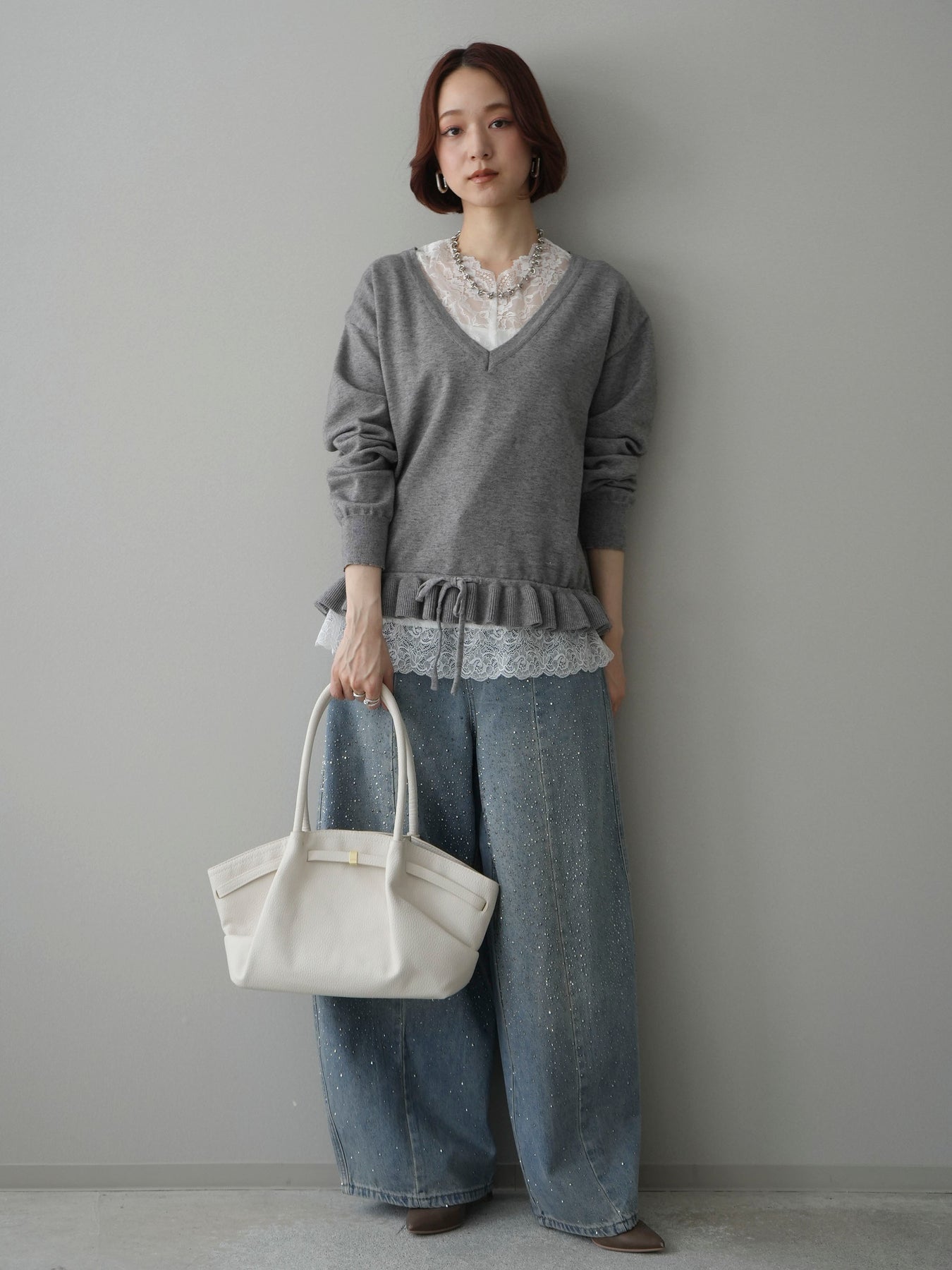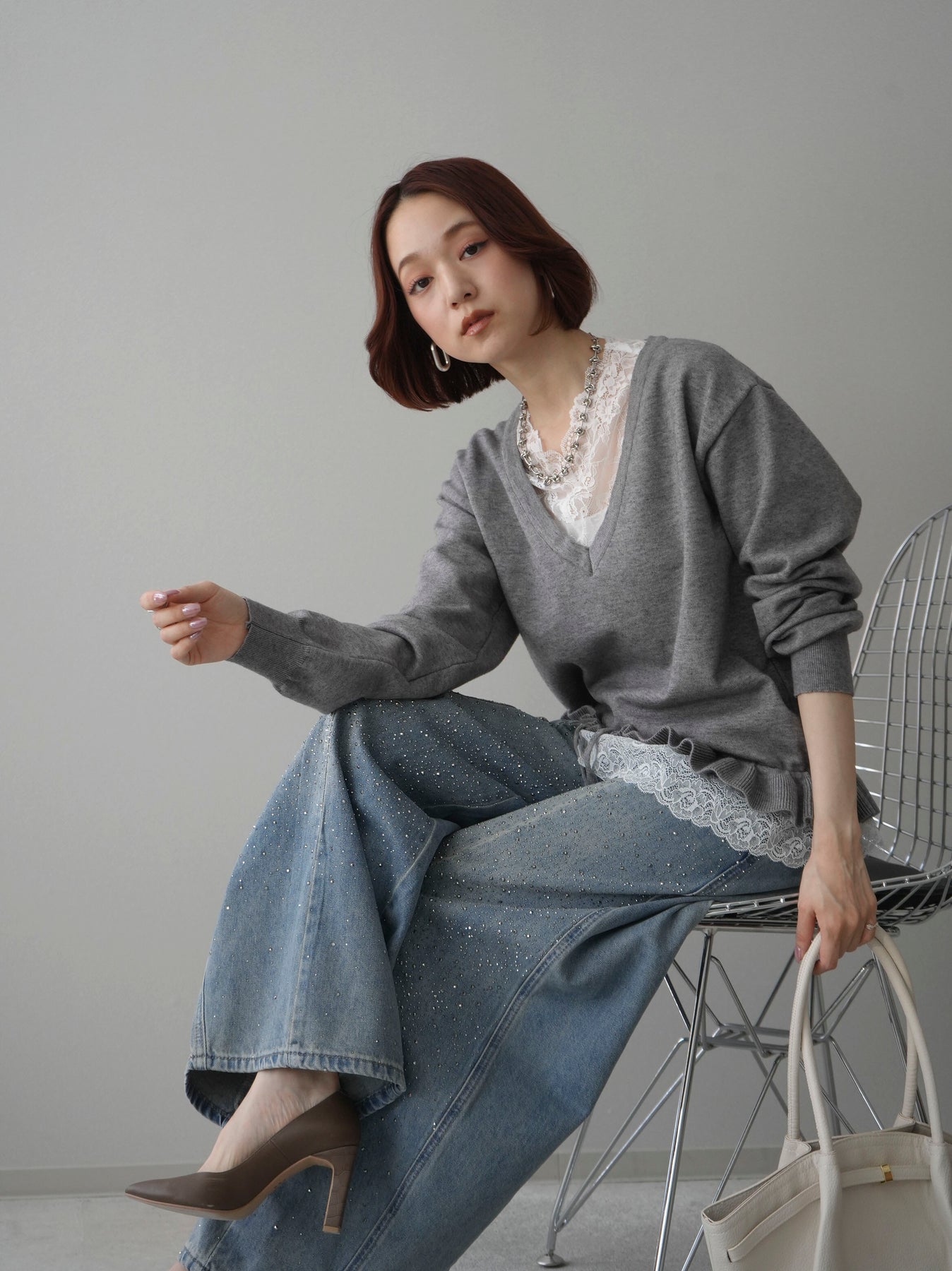 繊細なレースインナーとニットをレイヤードした、女性らしさが引き立つアンサンブル。深めのVネックから覗くレースが顔まわりを華やかに演出し、裾からさりげなく見えるレースデザインがスタイリングに奥行きをプラスします。ニットは程よくゆとりのあるシルエットで抜け感があり、単品使いでも着回しやすい一着。デニムでカジュアルに、スラックスやスカートで上品にと幅広いコーディネートが楽しめます。